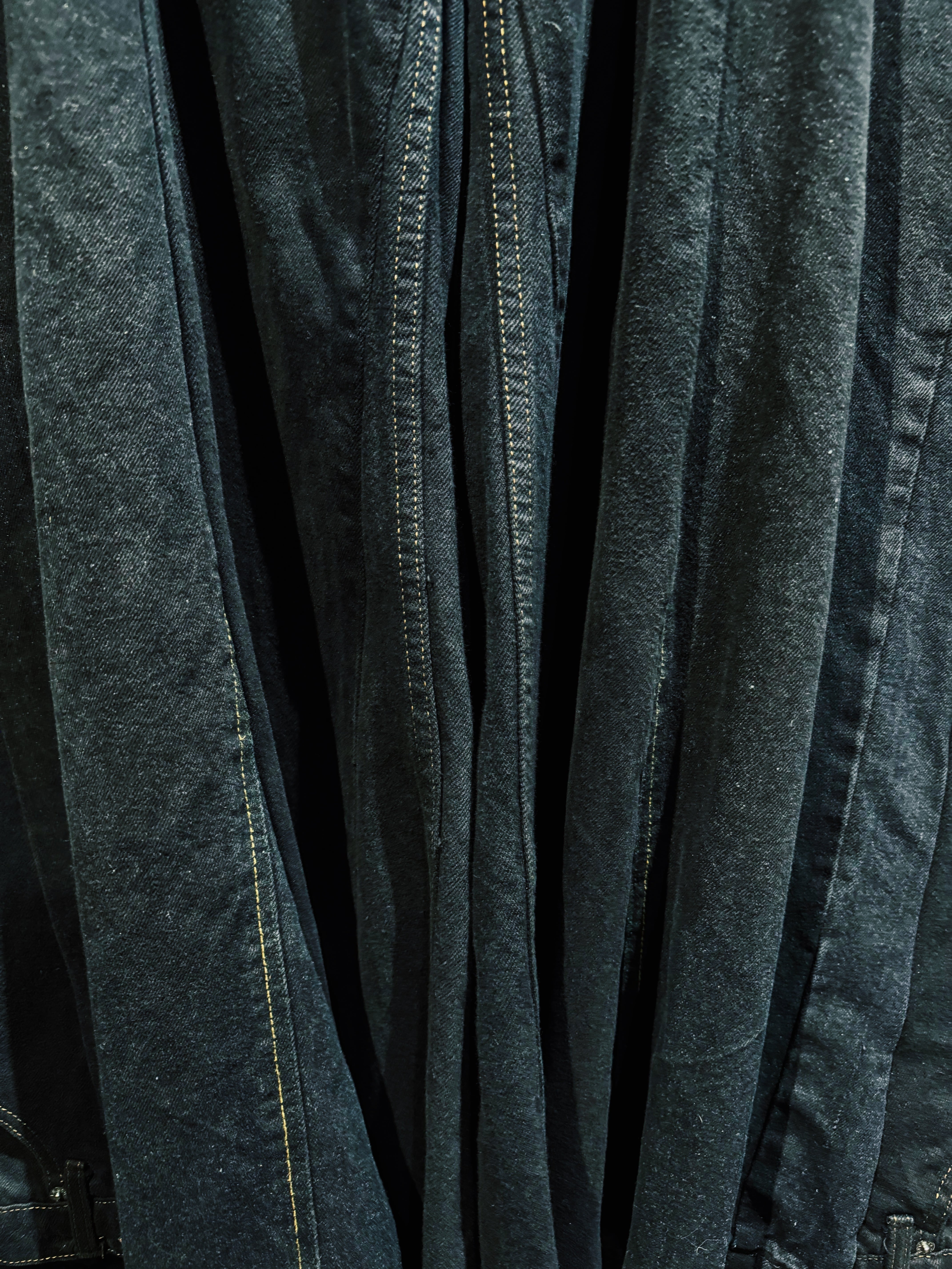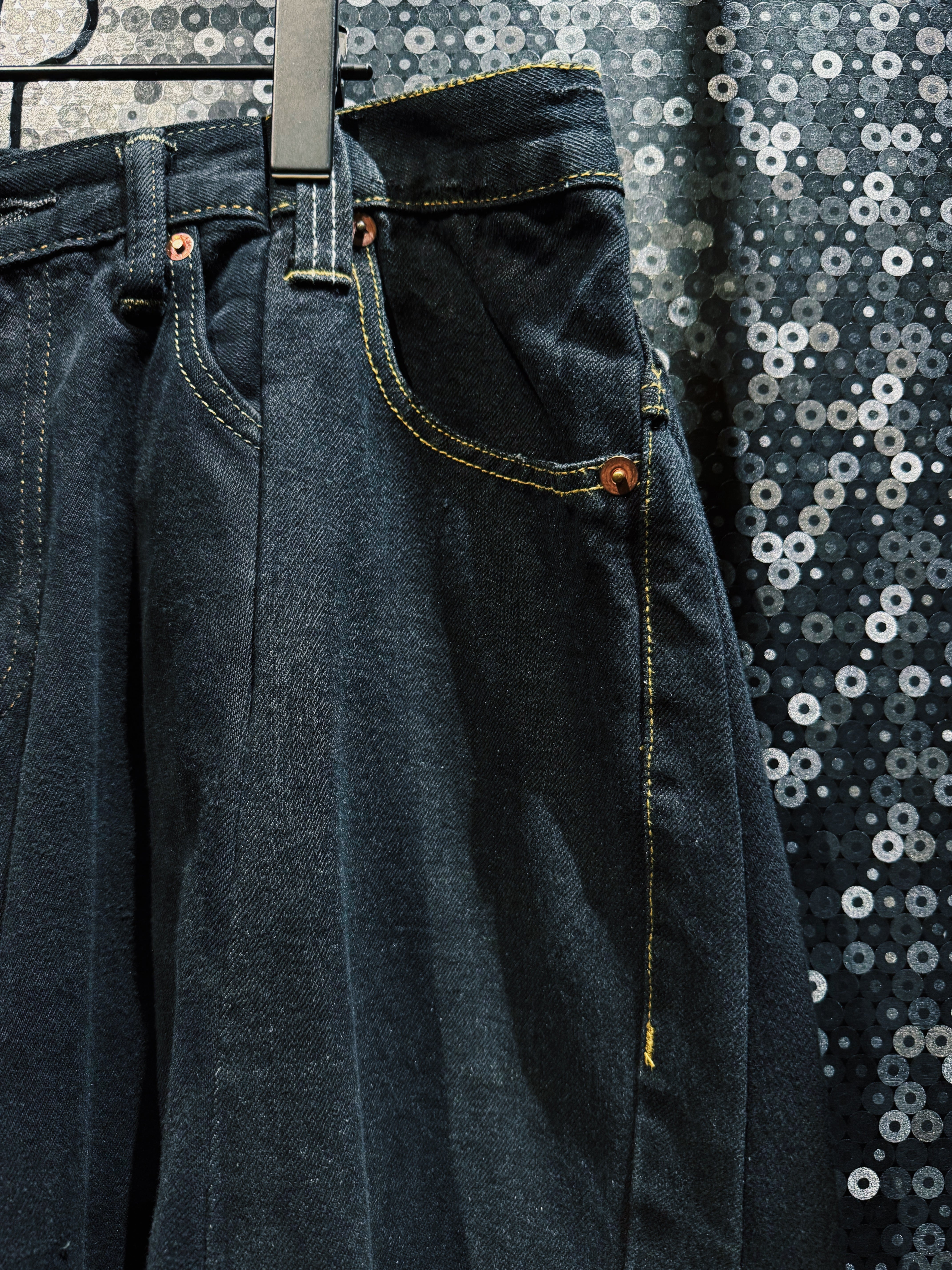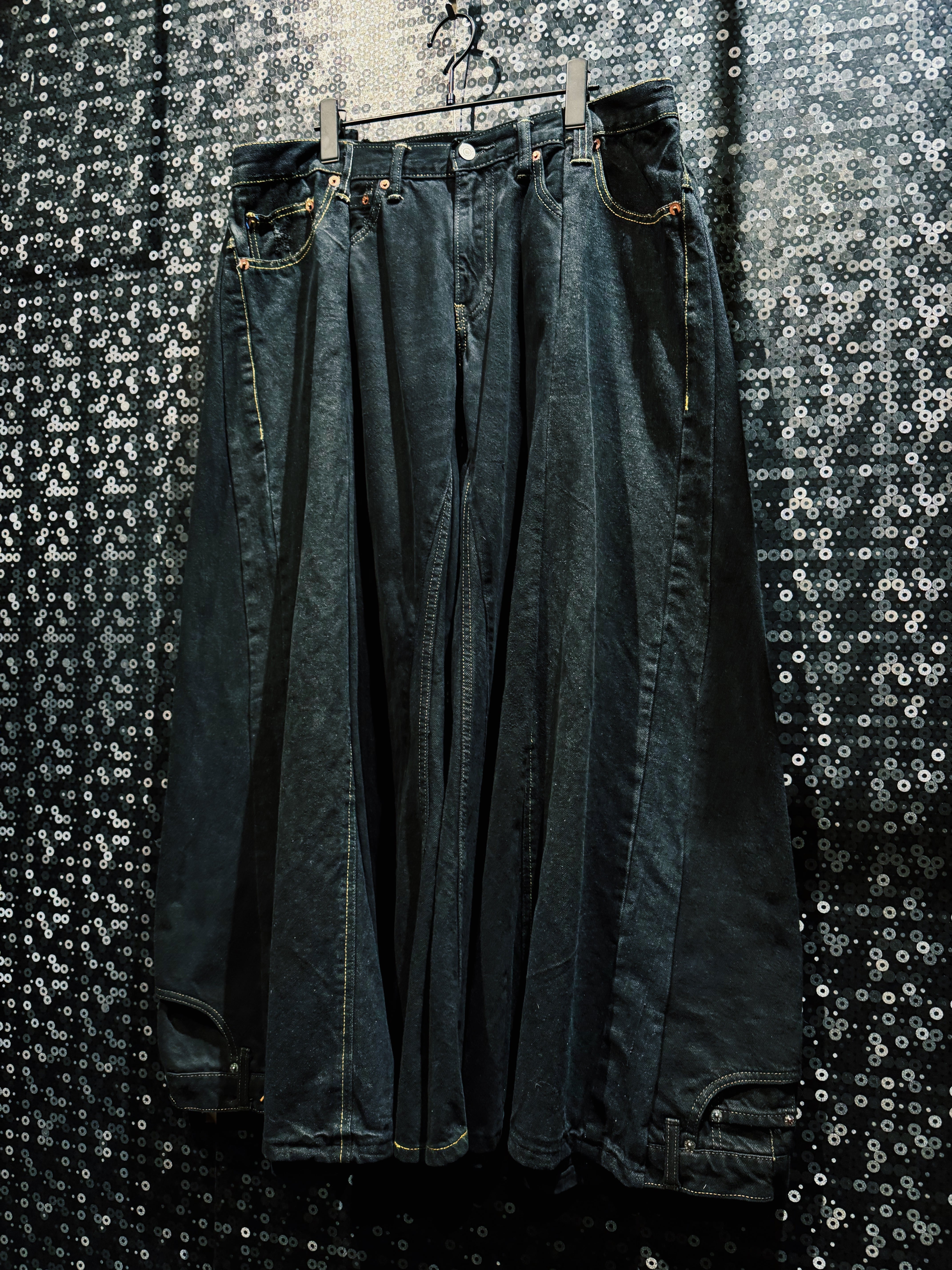 最大の特徴はフロント中央から広がる 深いプリーツ構造。このタックが生地のボリュームを極限まで拡張し、歩くたびに巨大な布のドレープが波のように揺れる。まるでスカートのような広がりを持ちながらも、デニムパンツとして成立しているバランスは非常に独特で、ストリートとモードの境界を曖昧にするBLANK ICONらしい構造美となっている。