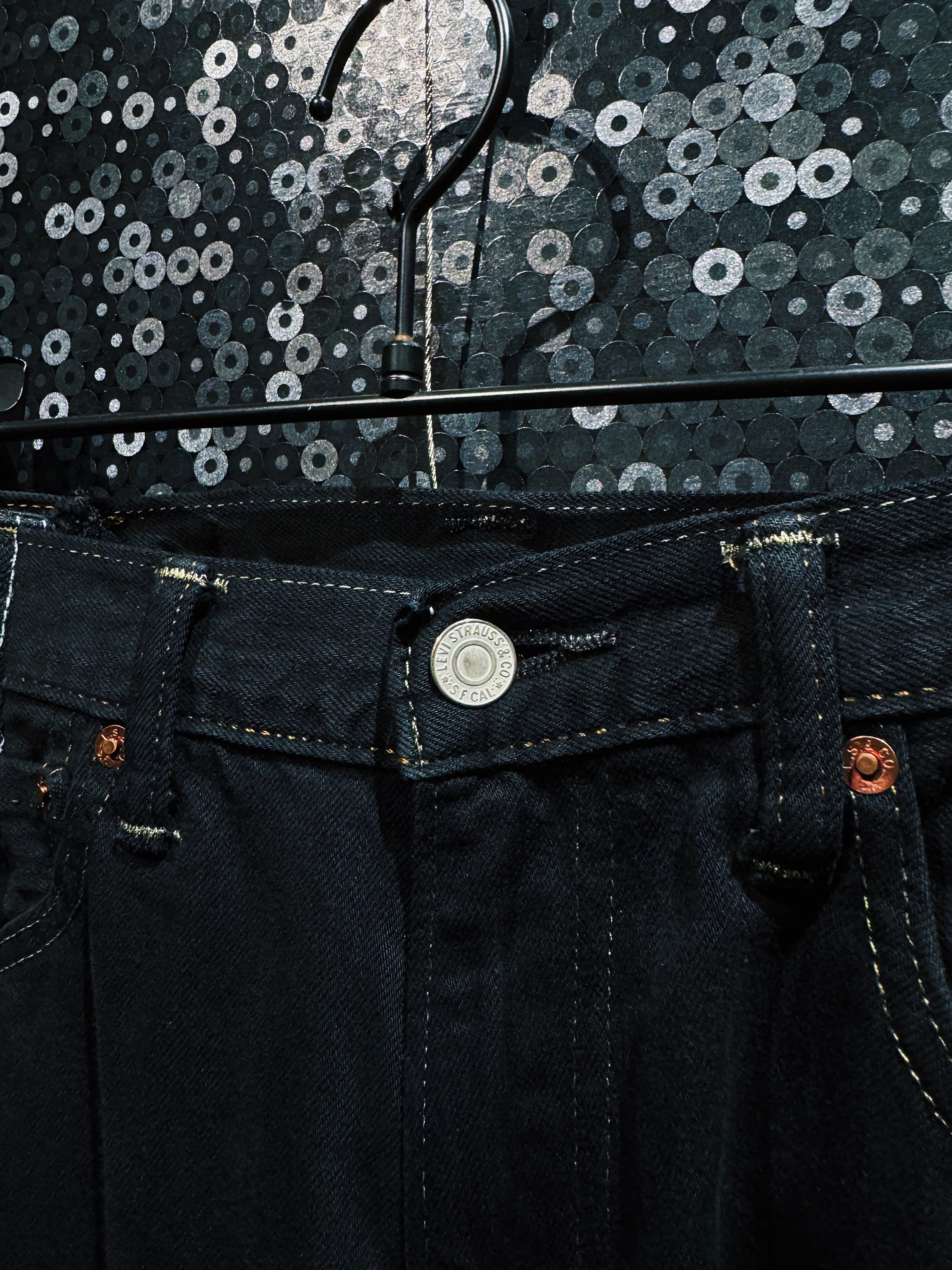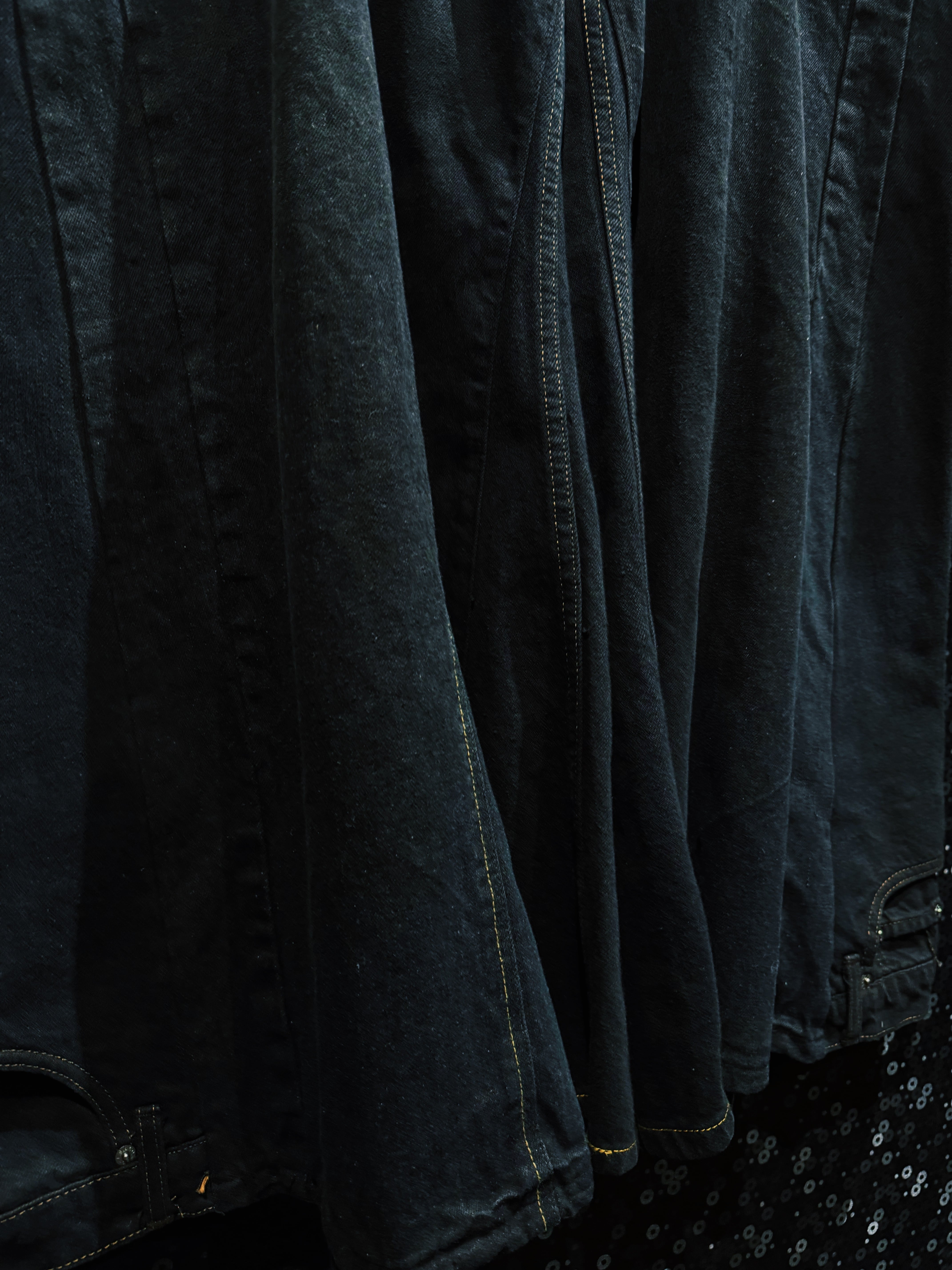 ブラックデニムに施されたゴールドステッチは、暗闇の中にわずかに浮かび上がる輪郭線のような存在。バックポケットにはブランドのシグネチャーとも言えるジグザグステッチが入り、極端なシルエットの中にさりげないアイコン性を持たせている。裾部分にはストラップディテールも配置され、ボリュームをコントロールできる実用性も兼ね備えている。