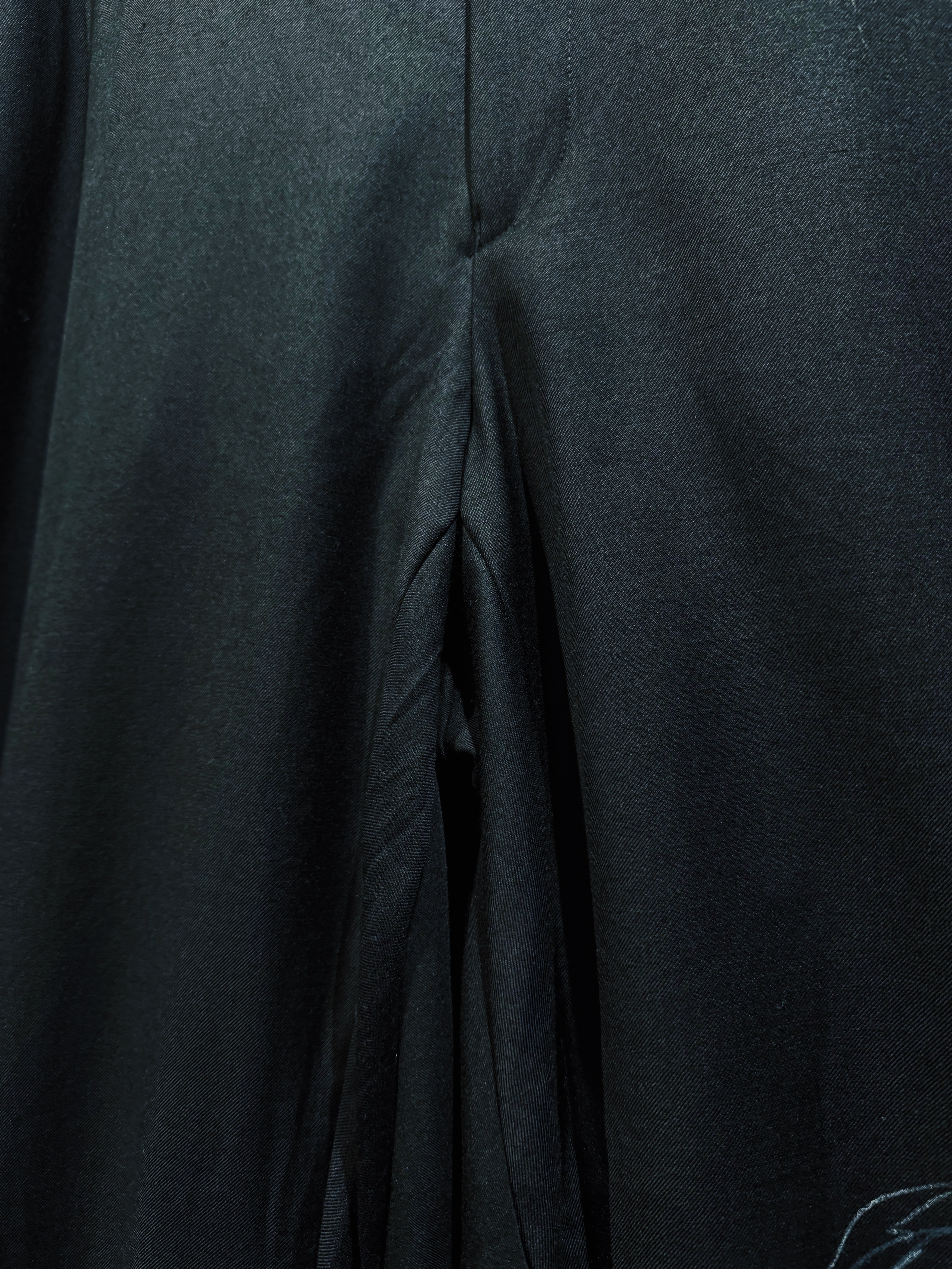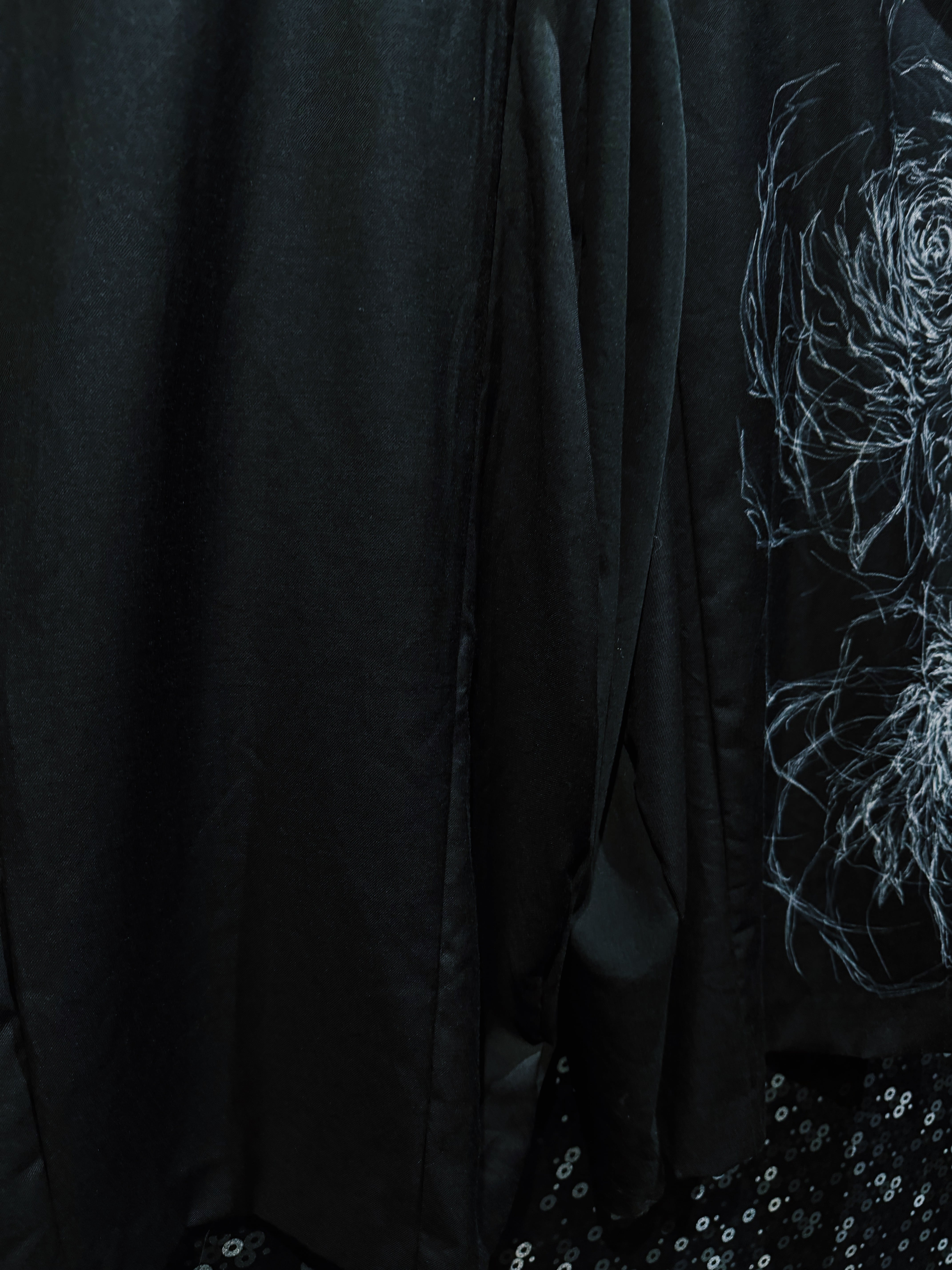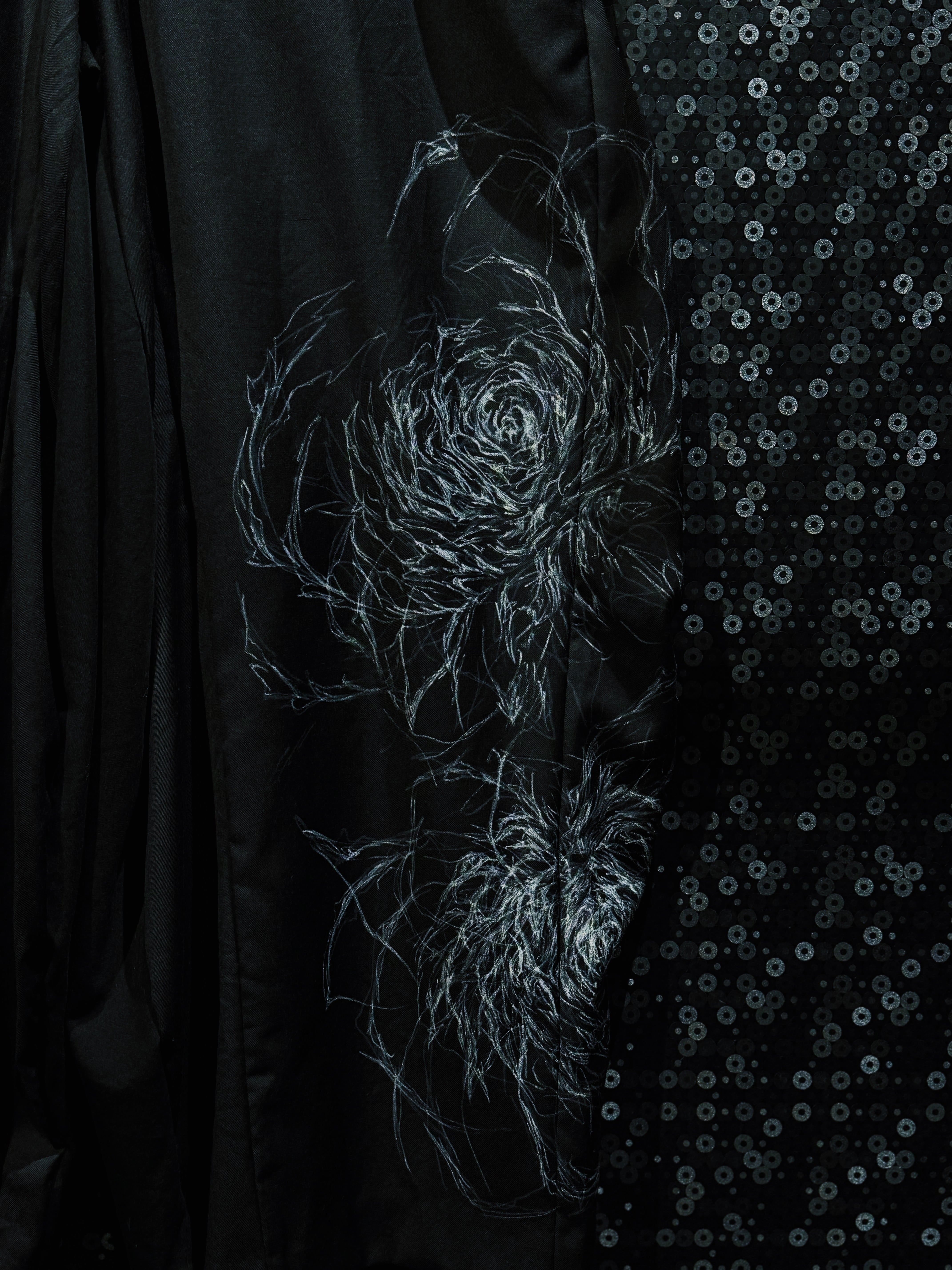 再倖築によって制作された、静かな迫力を纏う ハンドペイントワイドスラックス。ベースとなるのはドレープ感のあるブラックスラックス。そこへ手作業で描かれたホワイトのペイントが、まるで闇の中で浮かび上がる花のようなグラフィックを生み出し、ミニマルなパンツを一気にアートピースへと昇華させている。