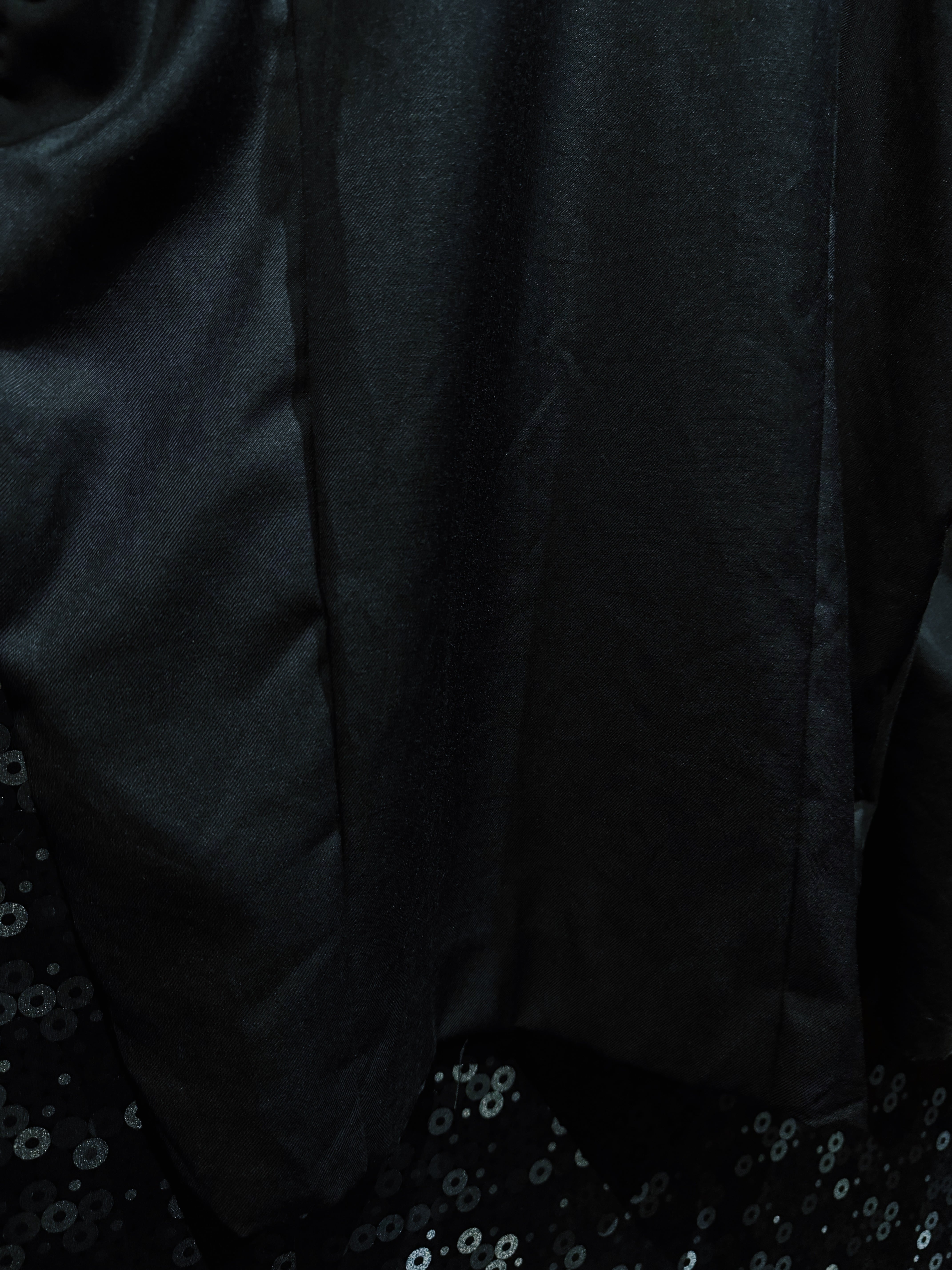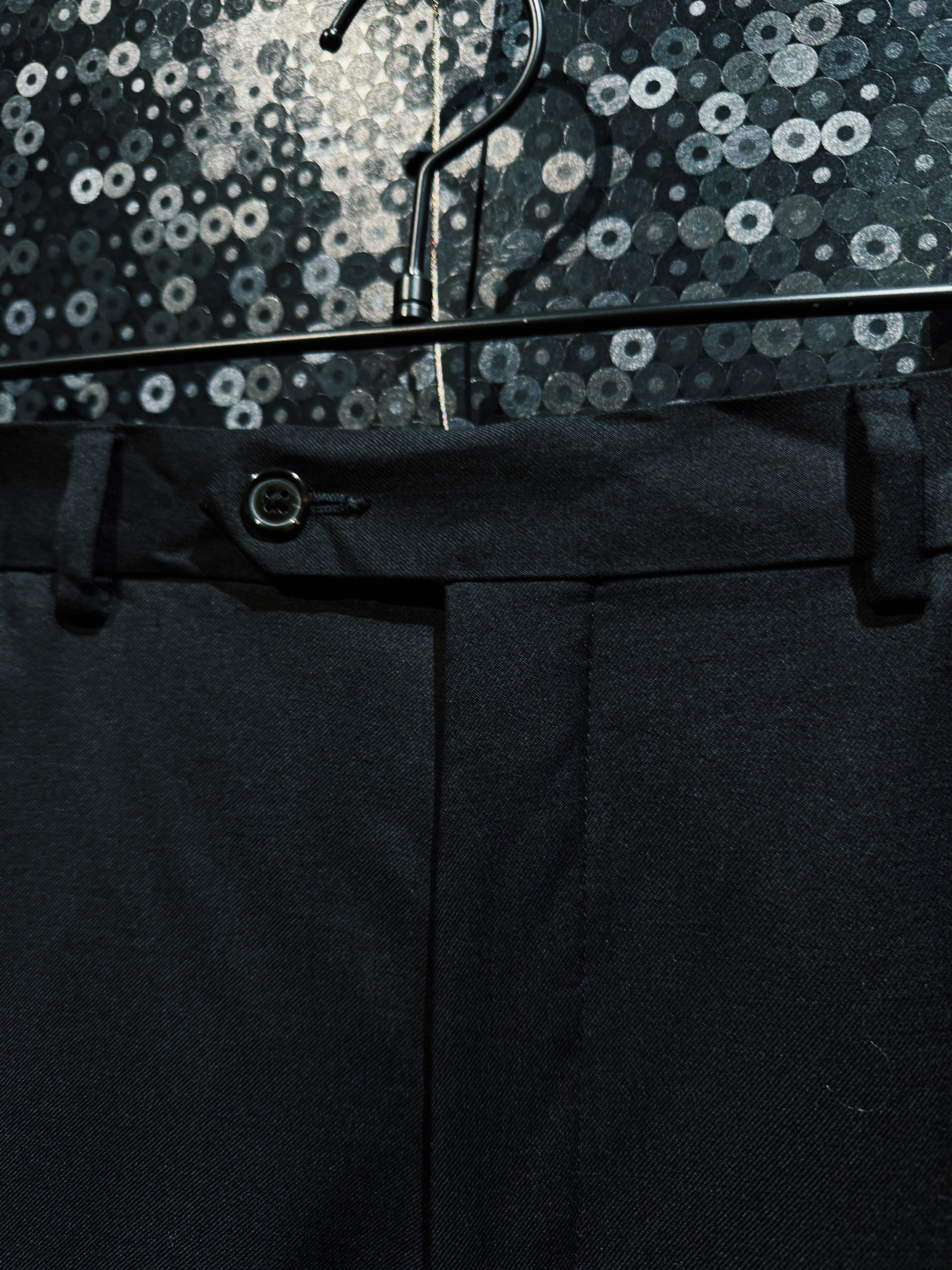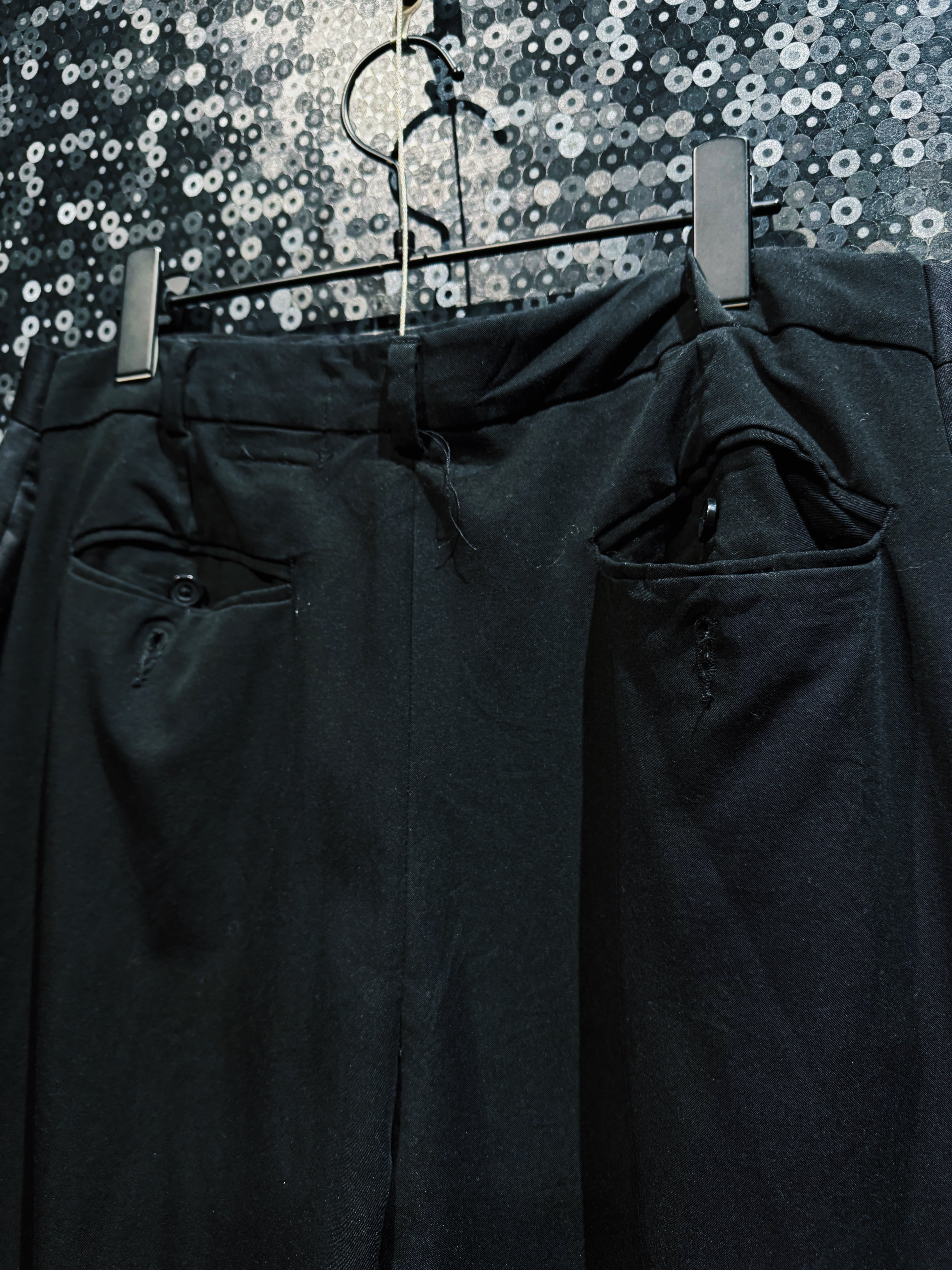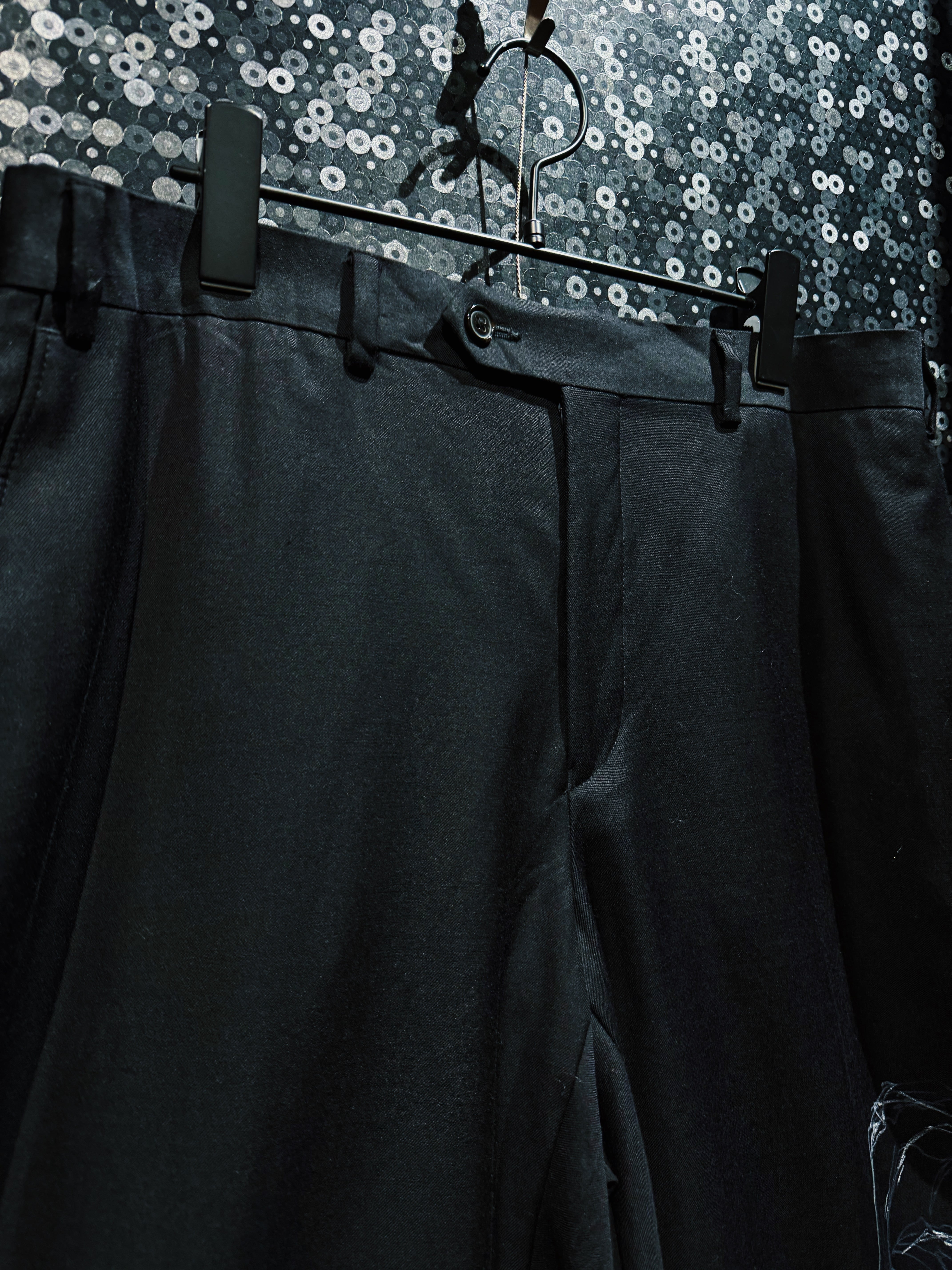 再倖築によって制作された、静かな迫力を纏う ハンドペイントワイドスラックス。ベースとなるのはドレープ感のあるブラックスラックス。そこへ手作業で描かれたホワイトのペイントが、まるで闇の中で浮かび上がる花のようなグラフィックを生み出し、ミニマルなパンツを一気にアートピースへと昇華させている。
