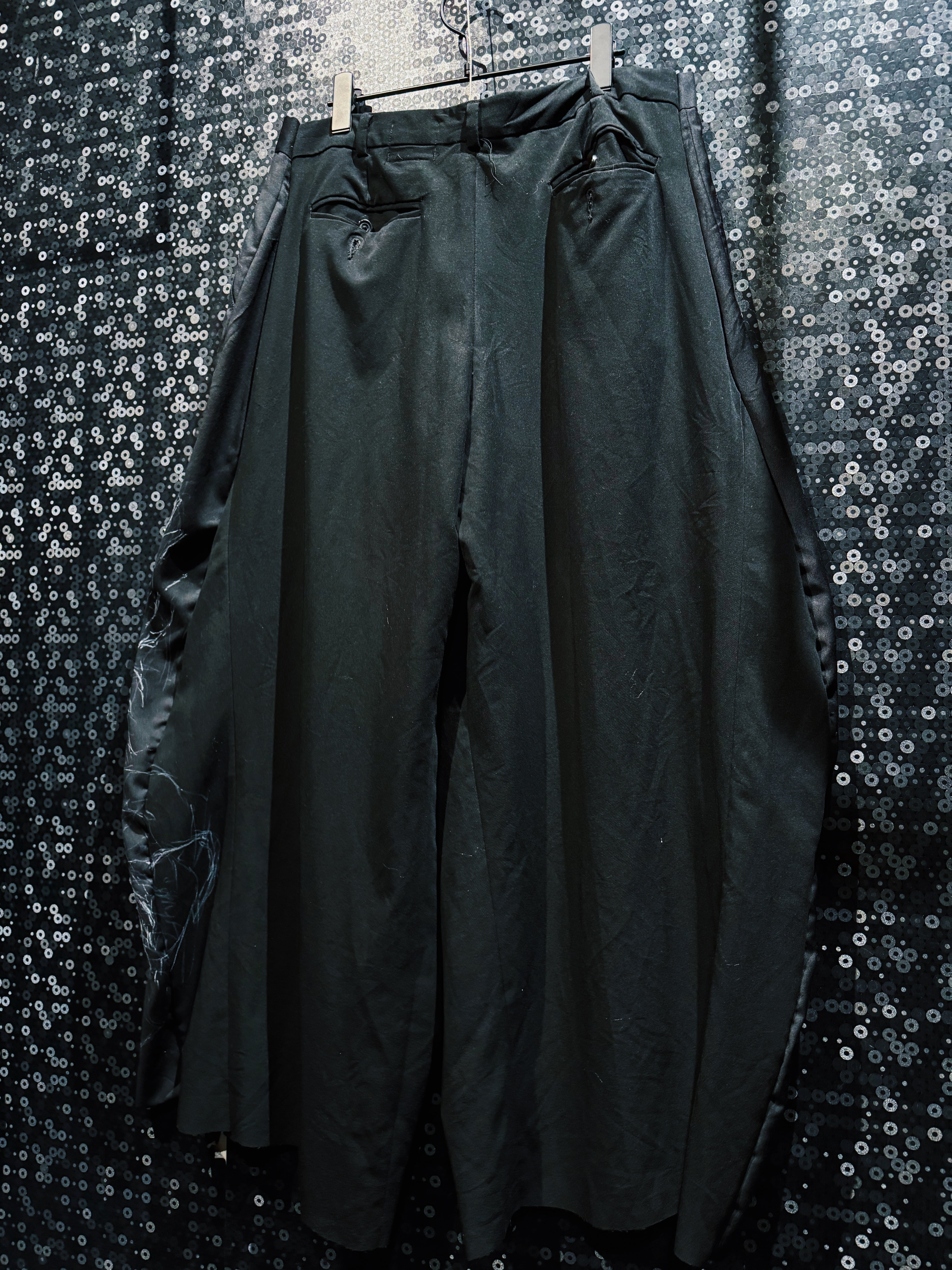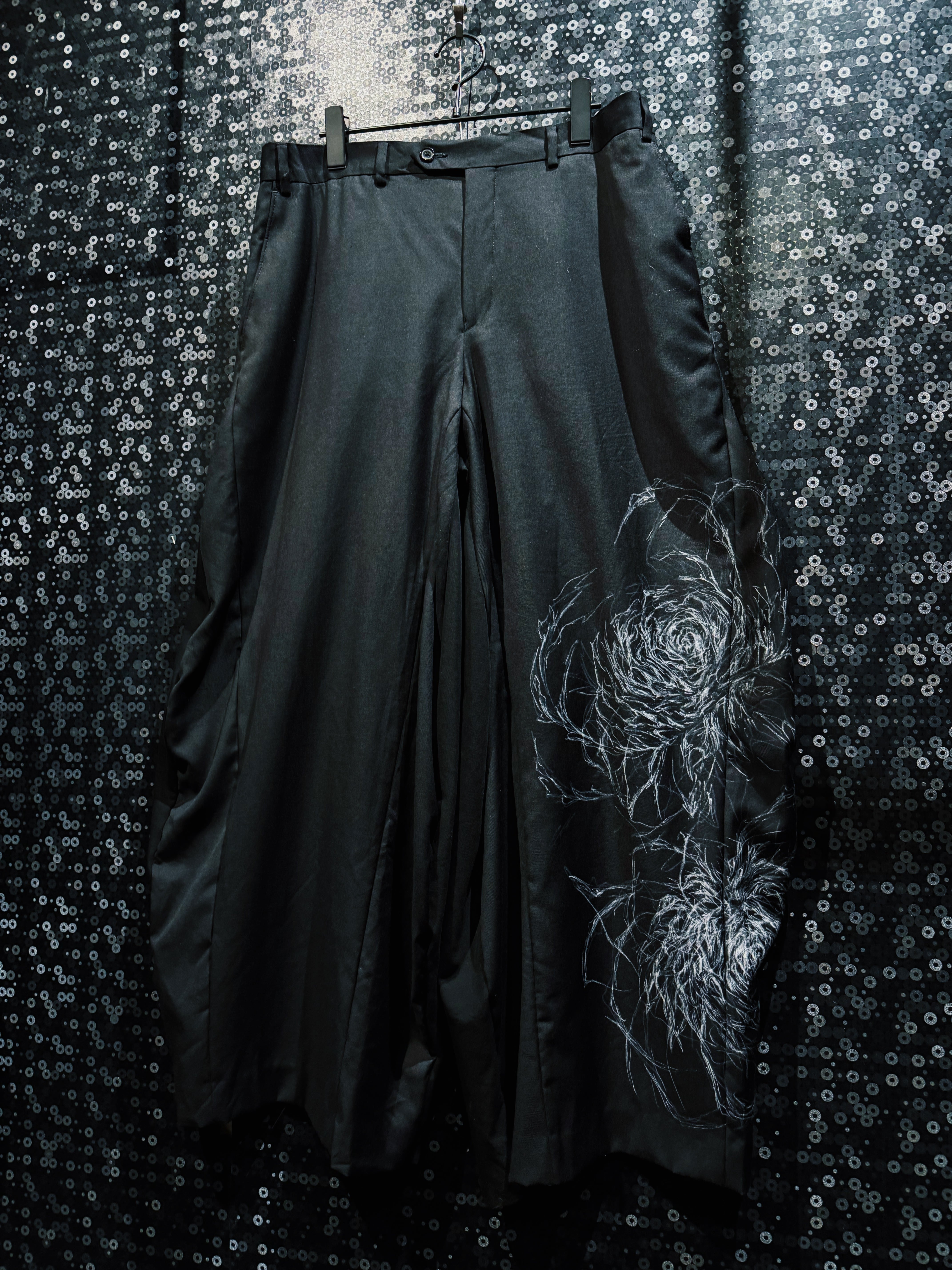 シルエットは再倖築特有の 極太ワイドシルエット。豊かなドレープが生まれることで、歩くたびに布の流れと共に花のペイントが揺れ、まるでグラフィックが動いているかのような視覚効果を生み出す。モードとストリートの境界を越える存在感を持つ一本。