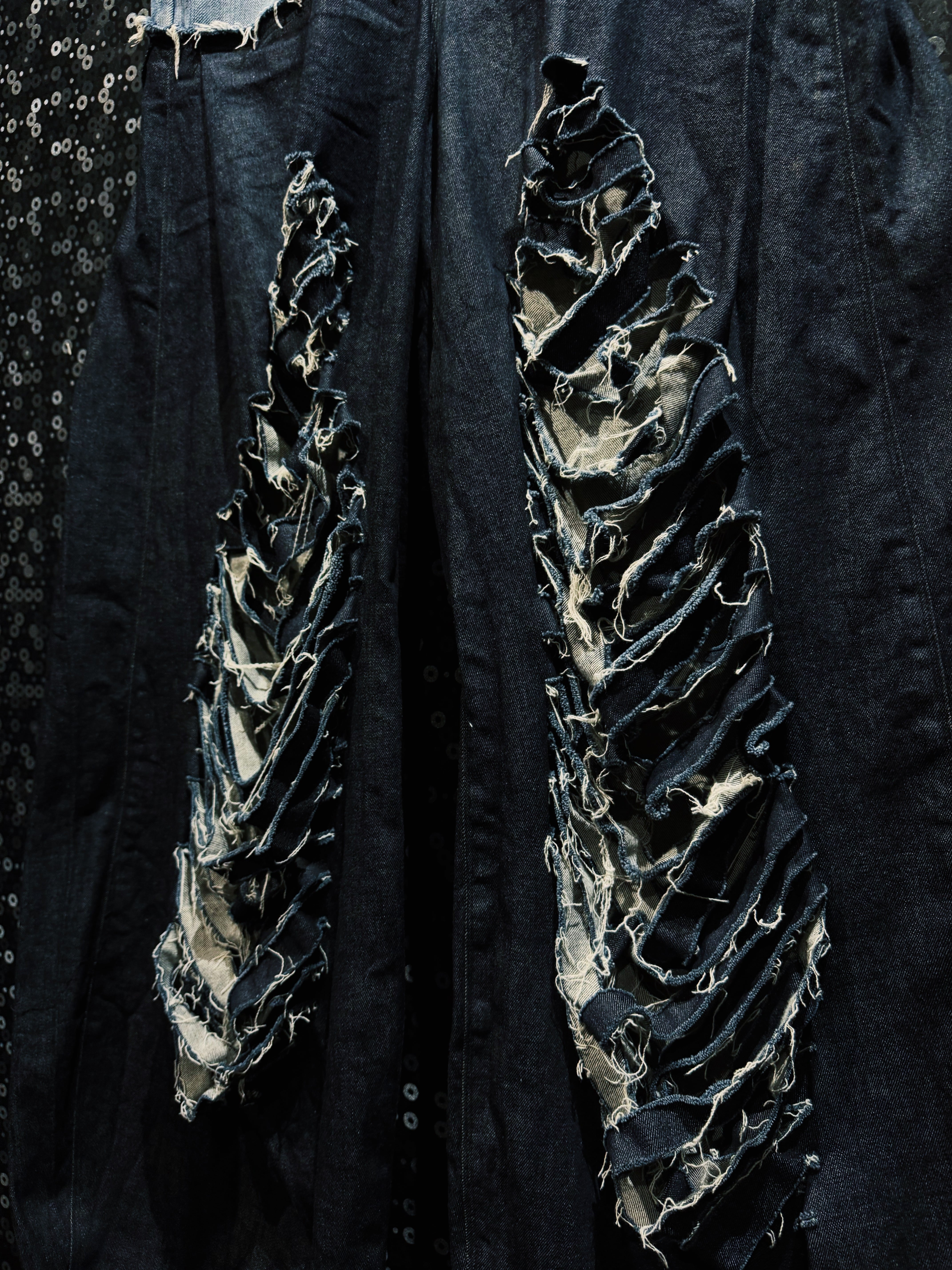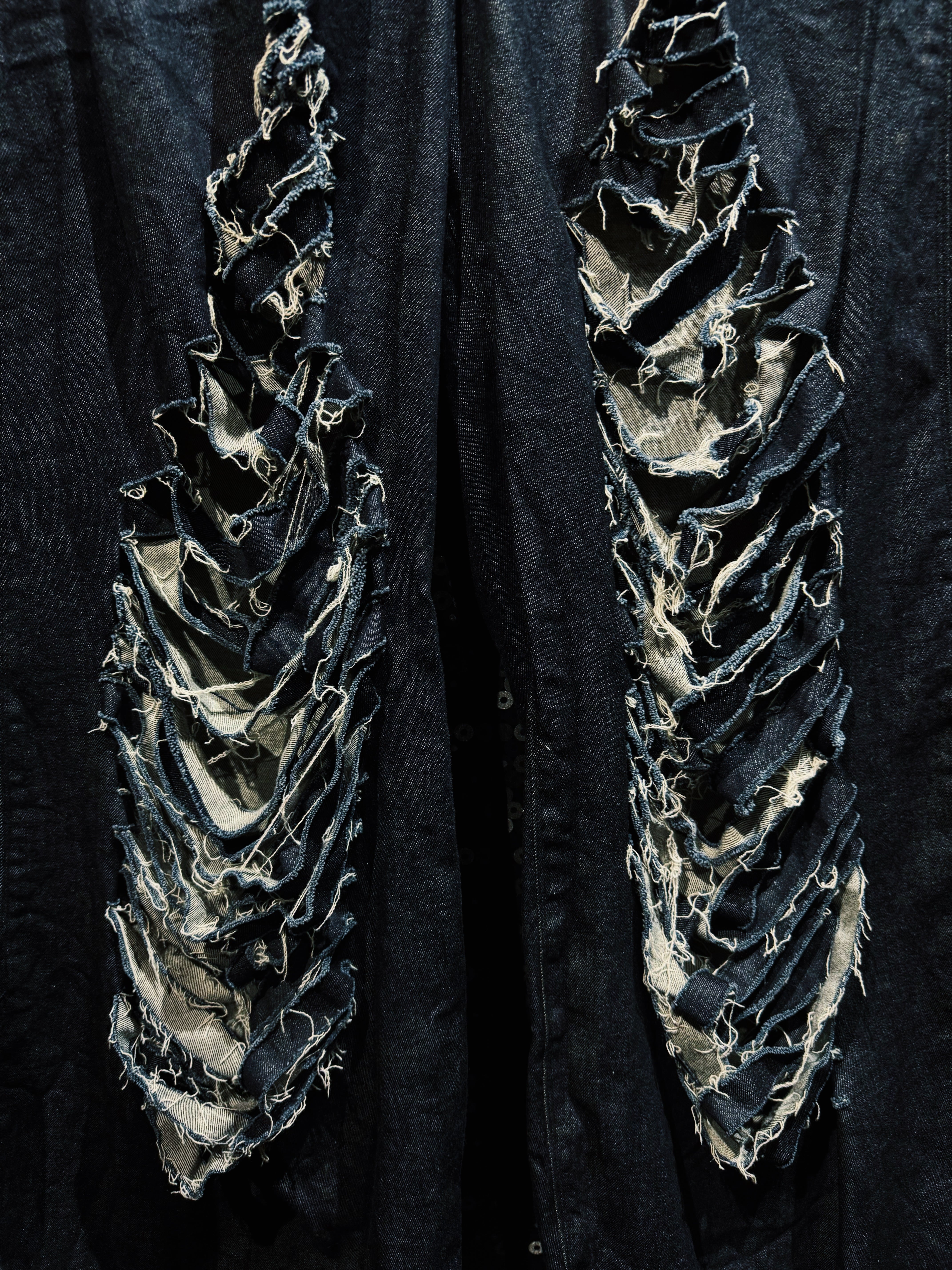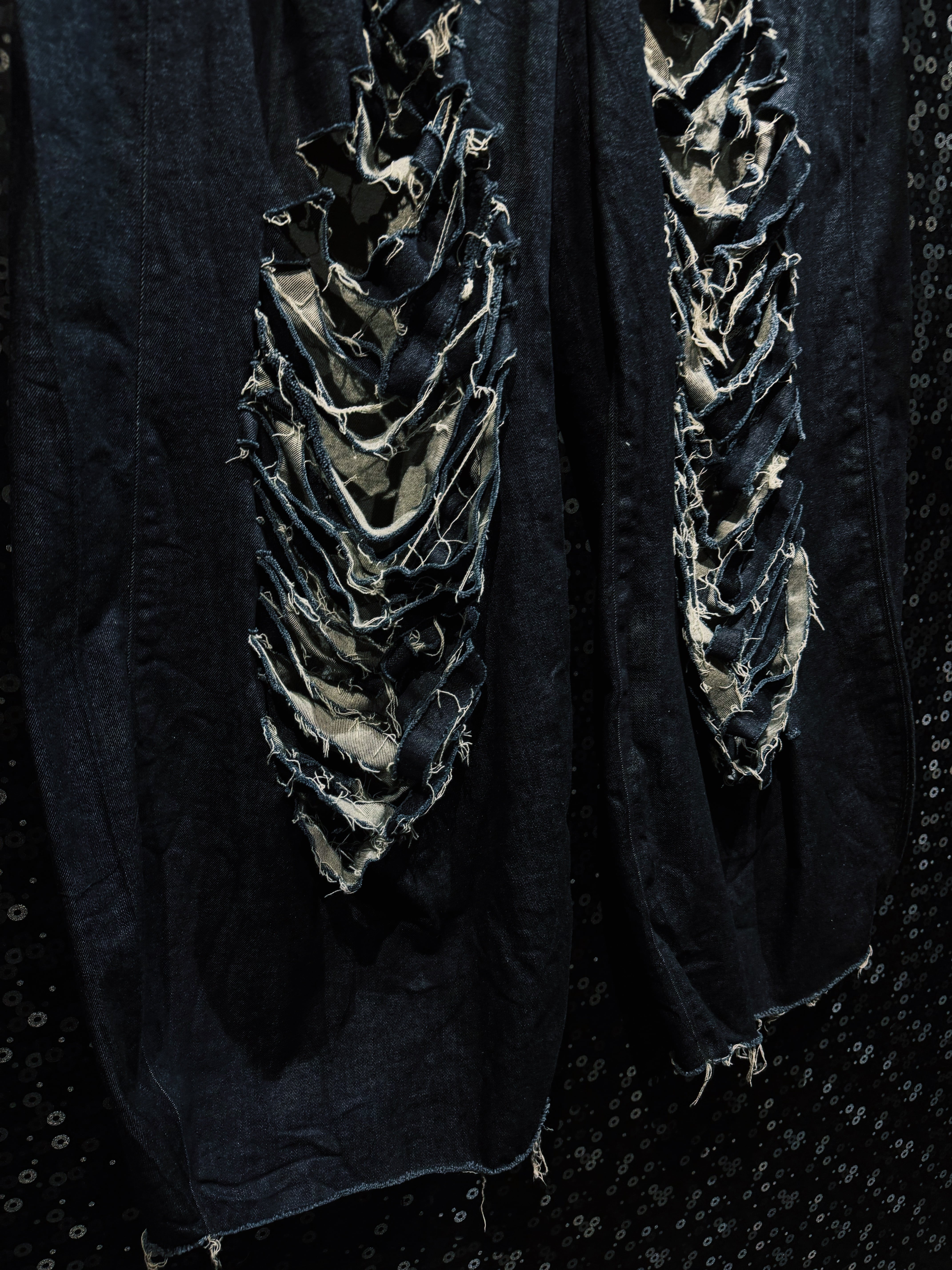 最大の特徴はフロント腿部分に施された 激しいクラッシュ&レイヤードダメージ。幾重にも裂かれたブラックデニムの奥からライトカラーのデニムが覗く構造となっており、単なるダメージ加工ではなく“層”を感じさせる立体的なクラッシュ表現となっている。糸がほつれたフリンジ状のエッジや、無造作に残された生地の断面が荒々しいクラフト感を生み出し、まるで長い年月を経て自然に崩壊していったかのようなリアルな表情を作り出している。