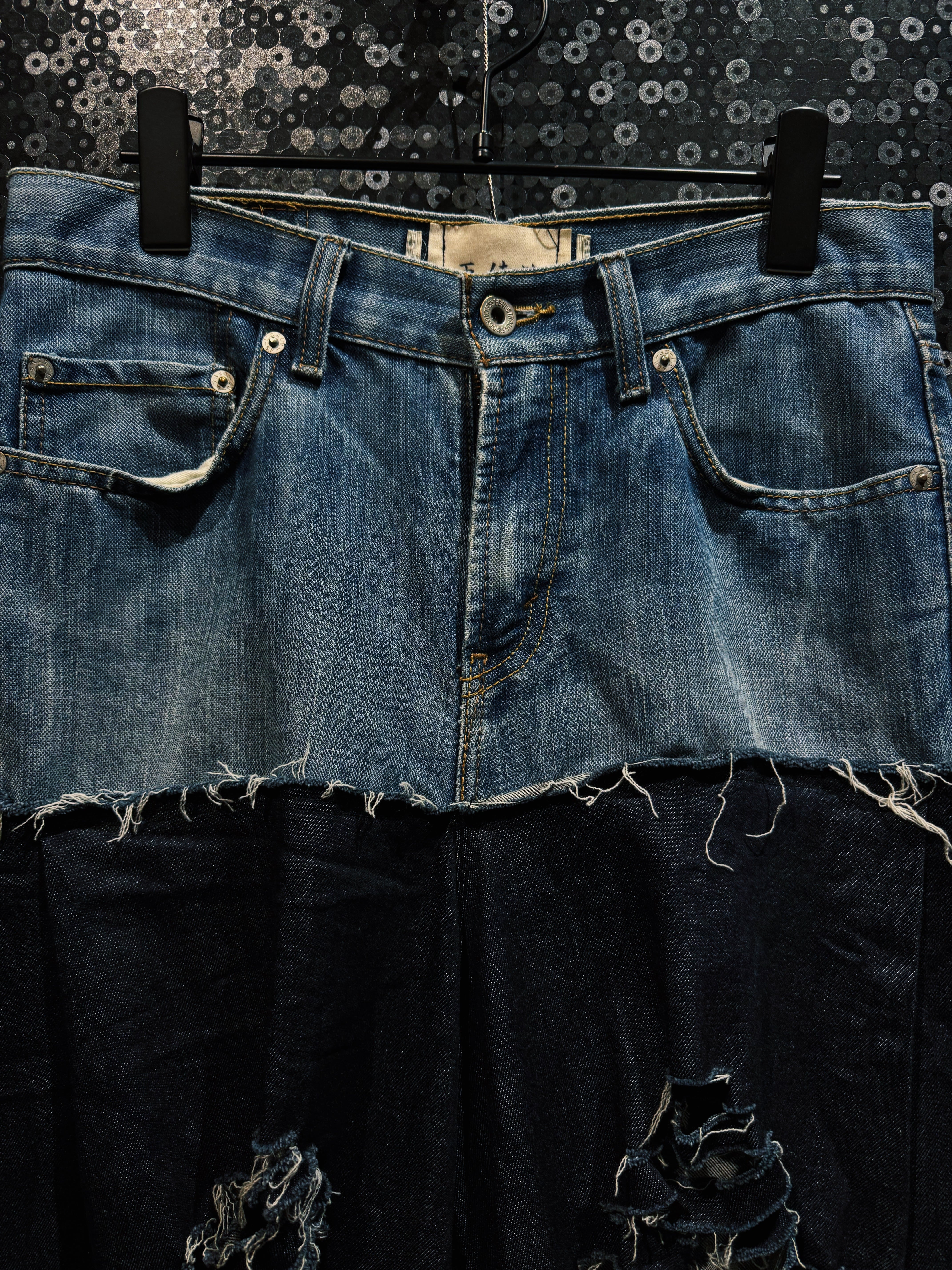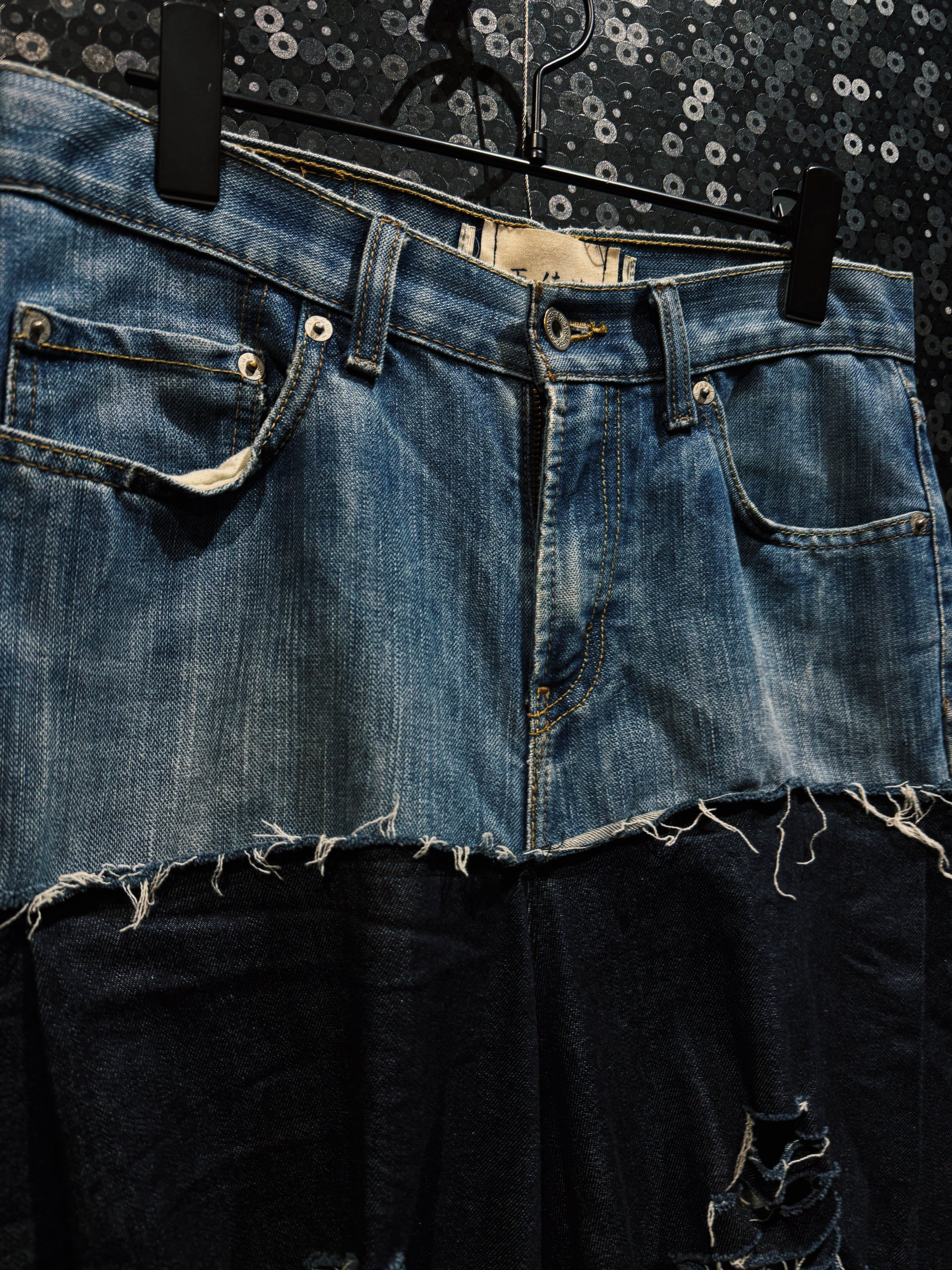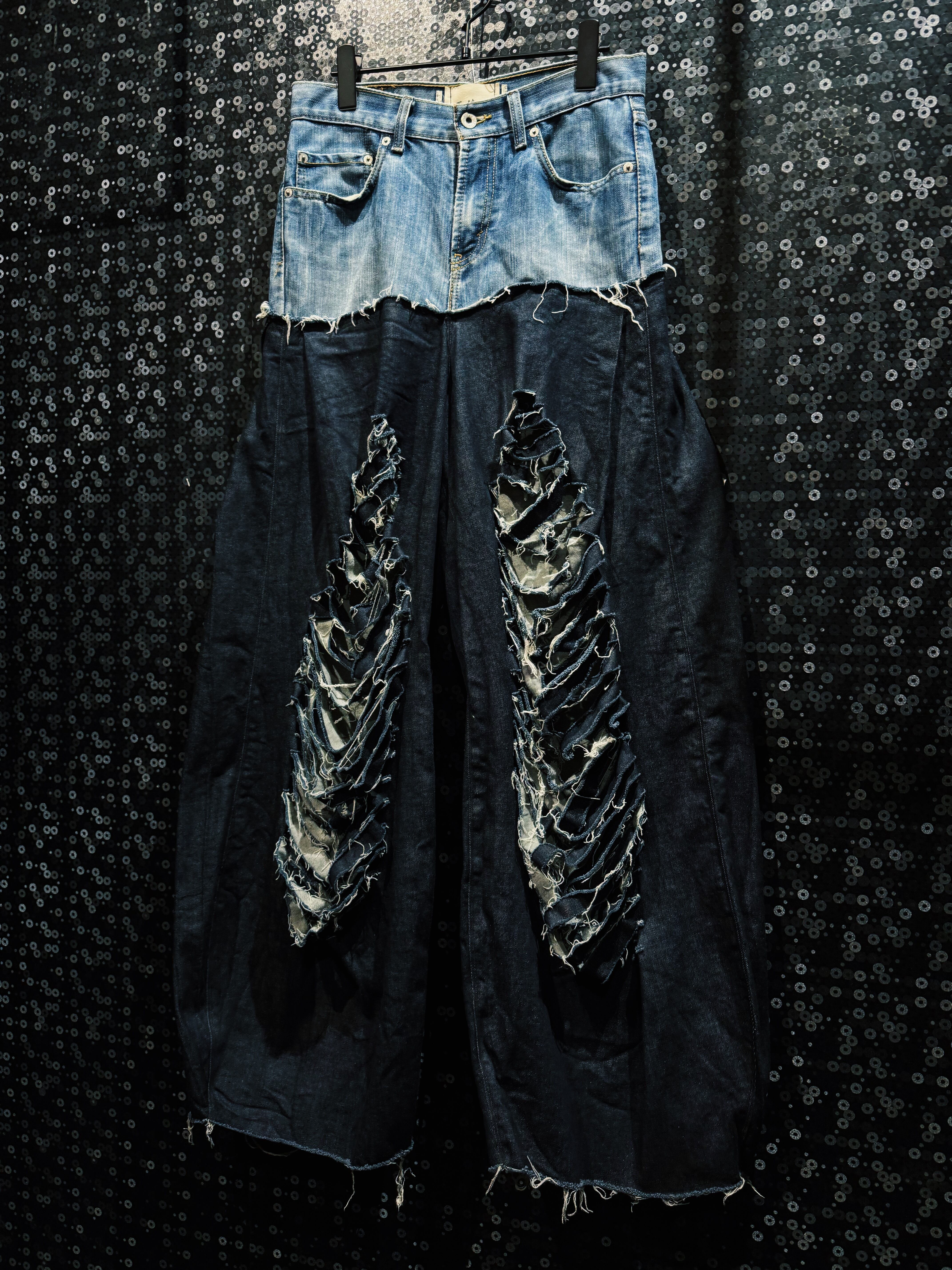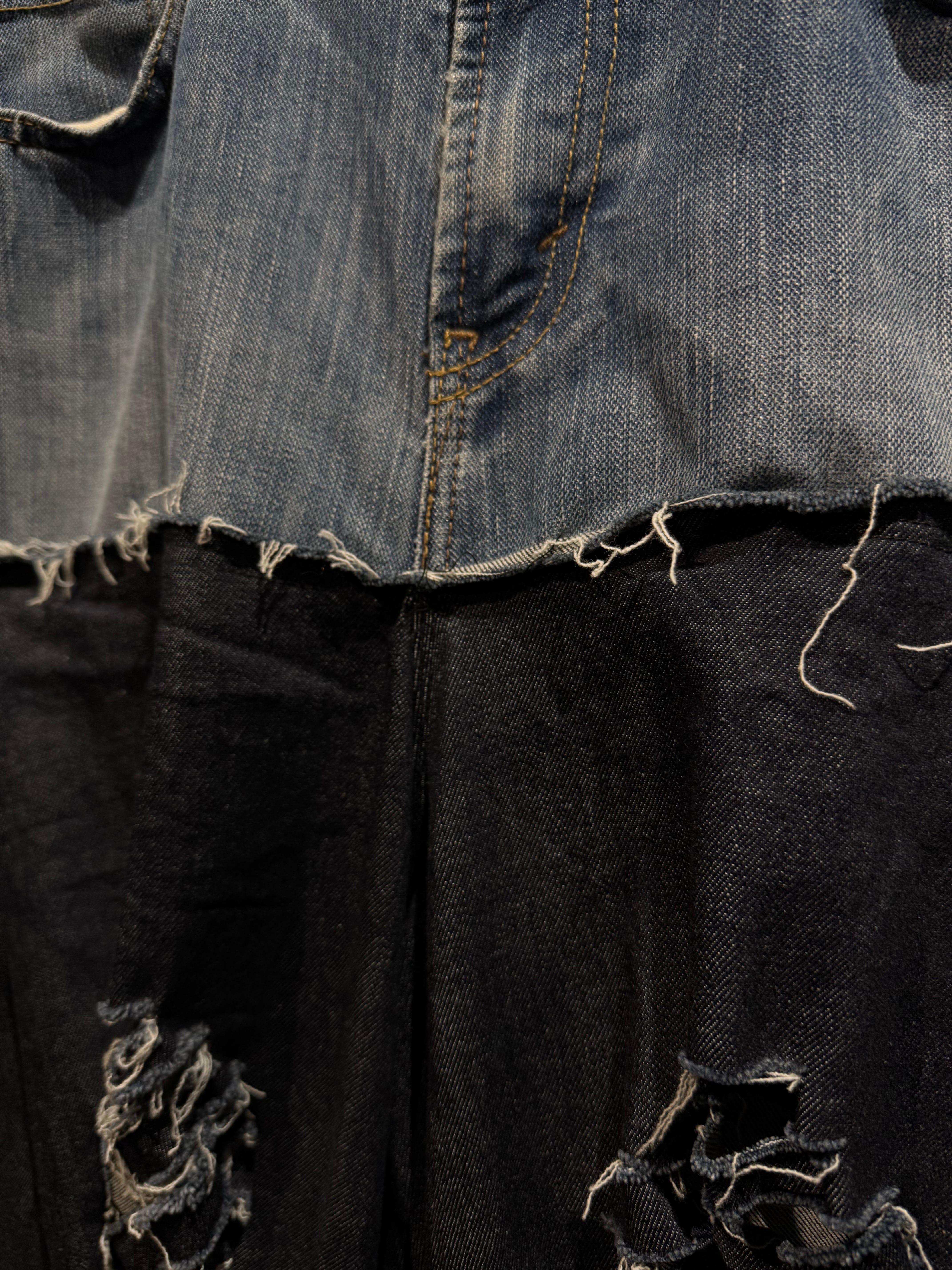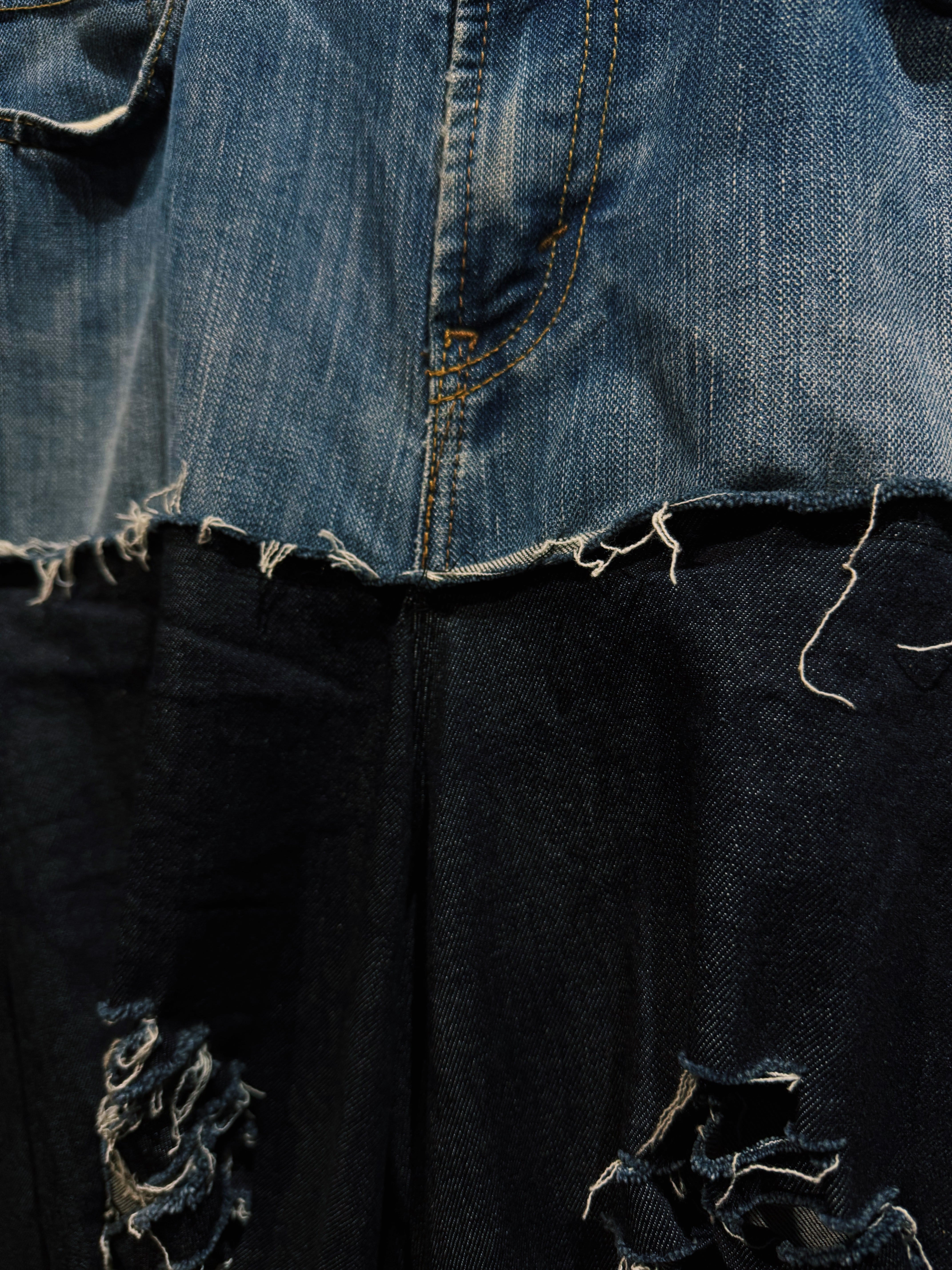 シルエットは再倖築ならではの 極太ワイドシルエット。上部のヴィンテージデニムのタイトな構造と、下部のボリュームあるブラックデニムのコントラストによって独特のドレープが生まれ、歩くたびに揺れるフォルムが強い存在感を放つ。