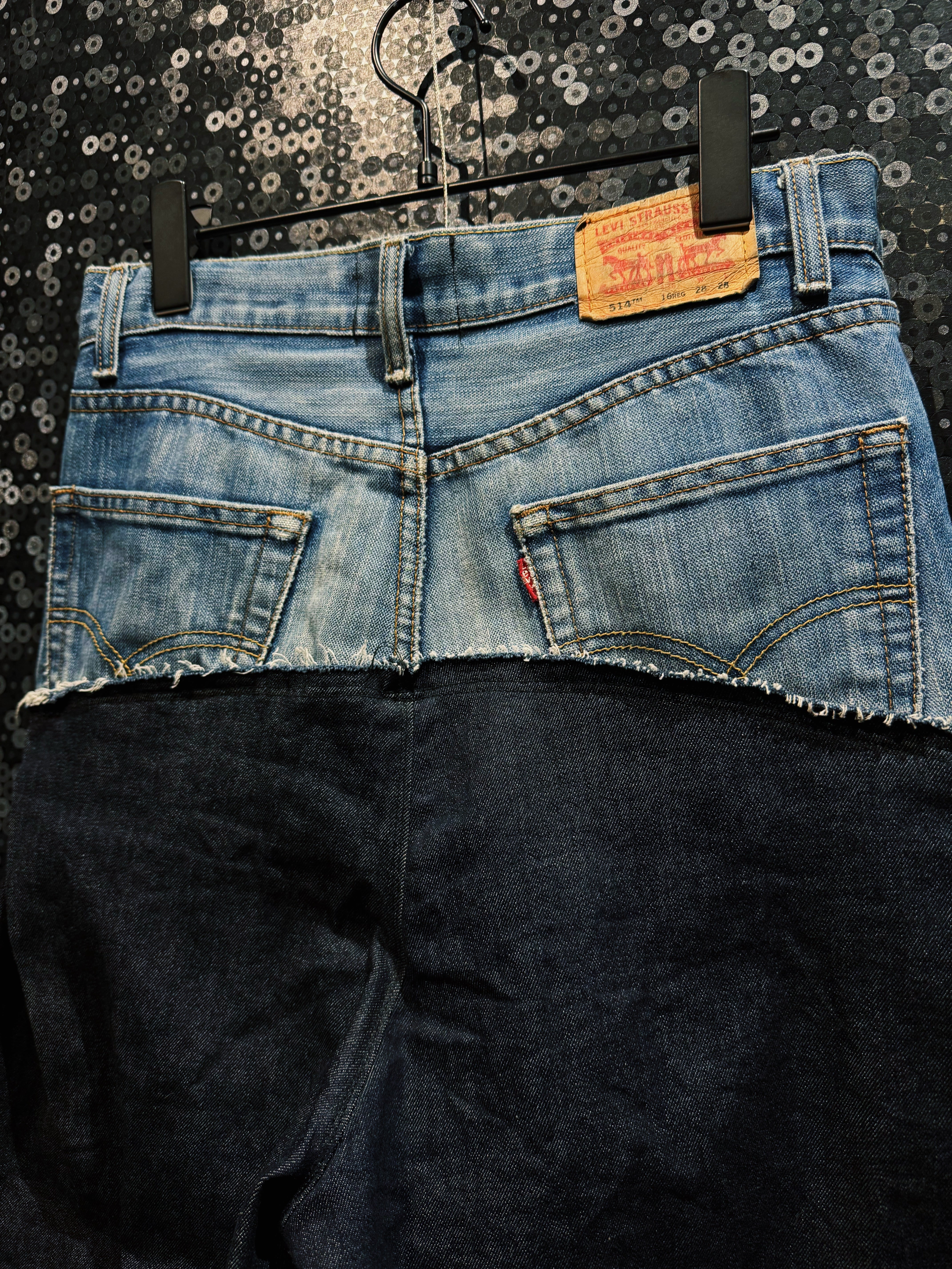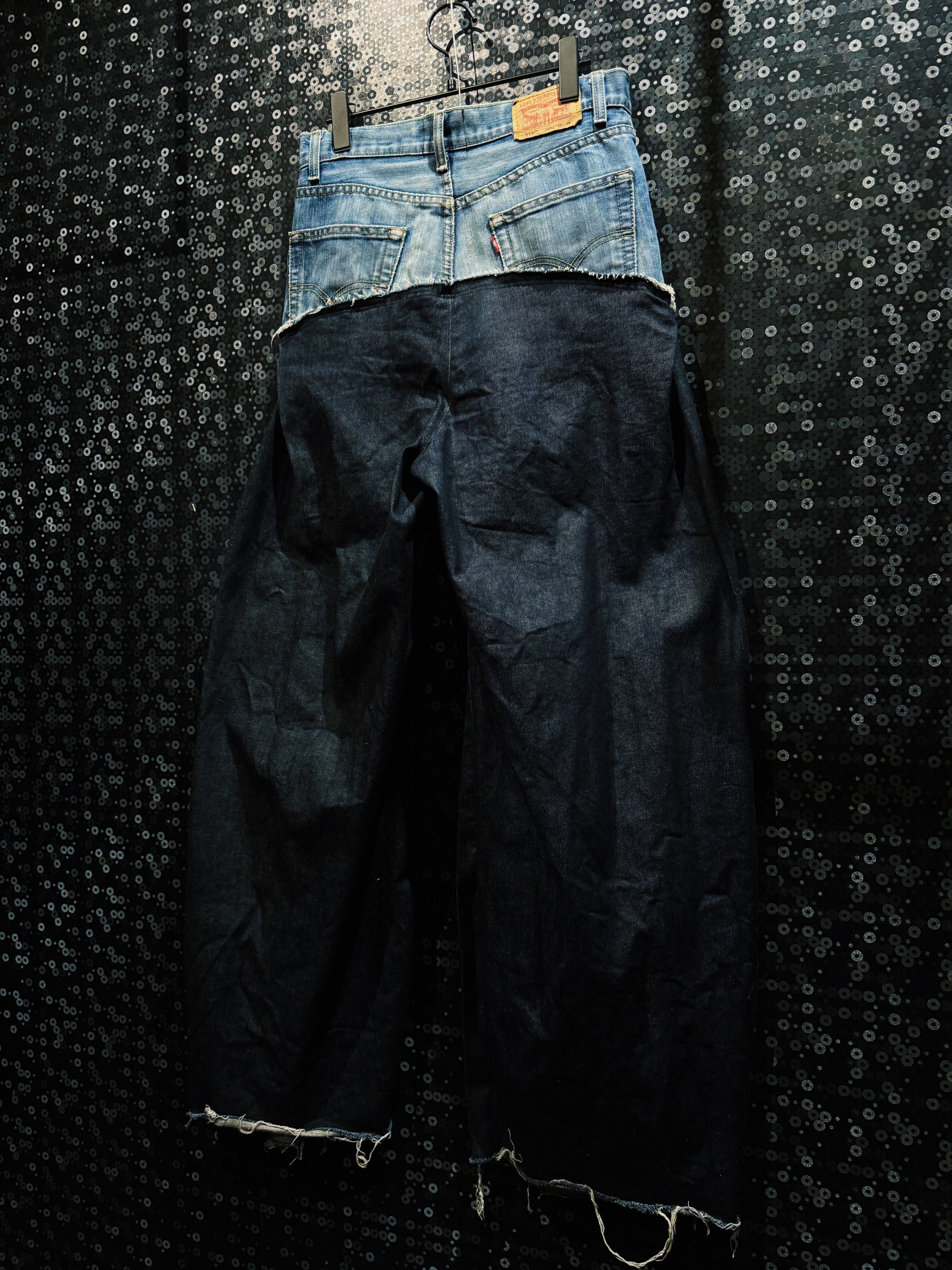 再倖築によって生み出された、ヴィンテージデニムを大胆に解体・再構築した ドッキングワイドデニムパンツ。ベースとなるのはクラシックな Levi’sデニム。そのウエストからヒップ部分を残しつつ大胆にカットし、下部にはブラックデニムをドッキングすることで、まるで二つのパンツが融合したような再構築デザインを完成させている。