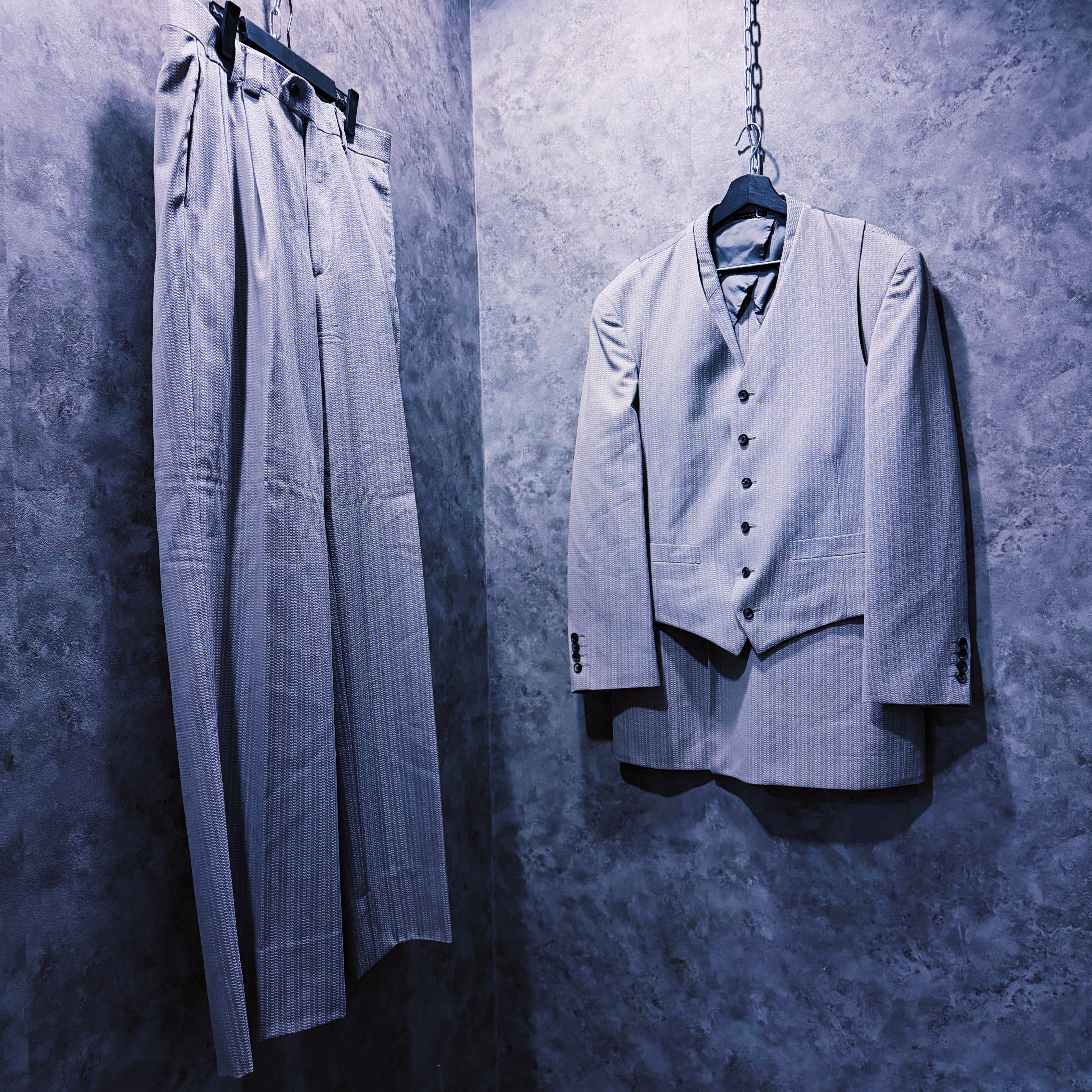 光沢のかかったグレーカラーのセットアップ。上品ながら、柔らかさも見える特徴的な極上カラー。