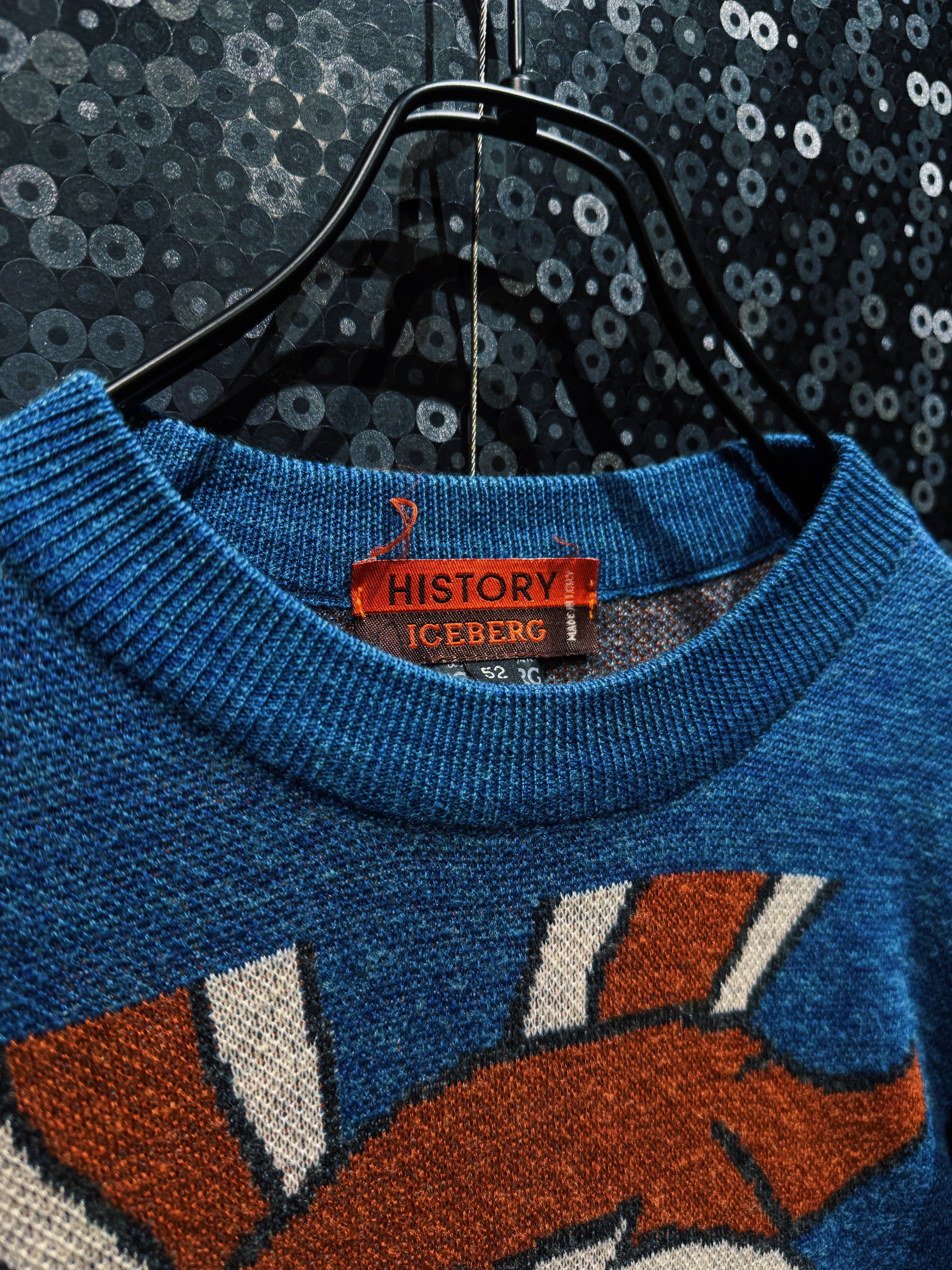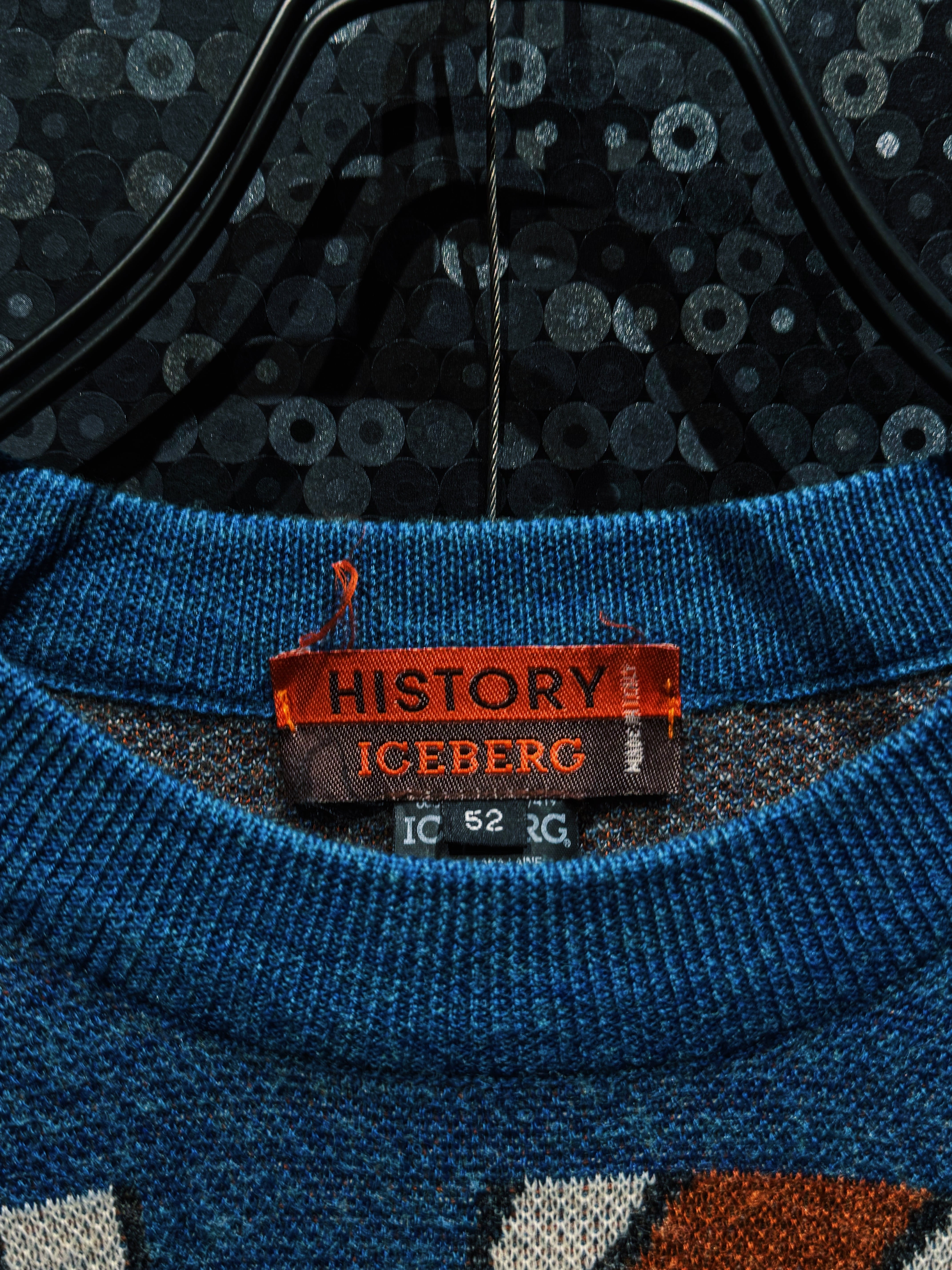 タグは“HISTORY ICEBERG”のオレンジタグ、サイズ表記52のイタリア企画。しっかりとしたコットン×ウール系の肉厚ボディで、ハイゲージ寄りながら重厚感のある編み。
