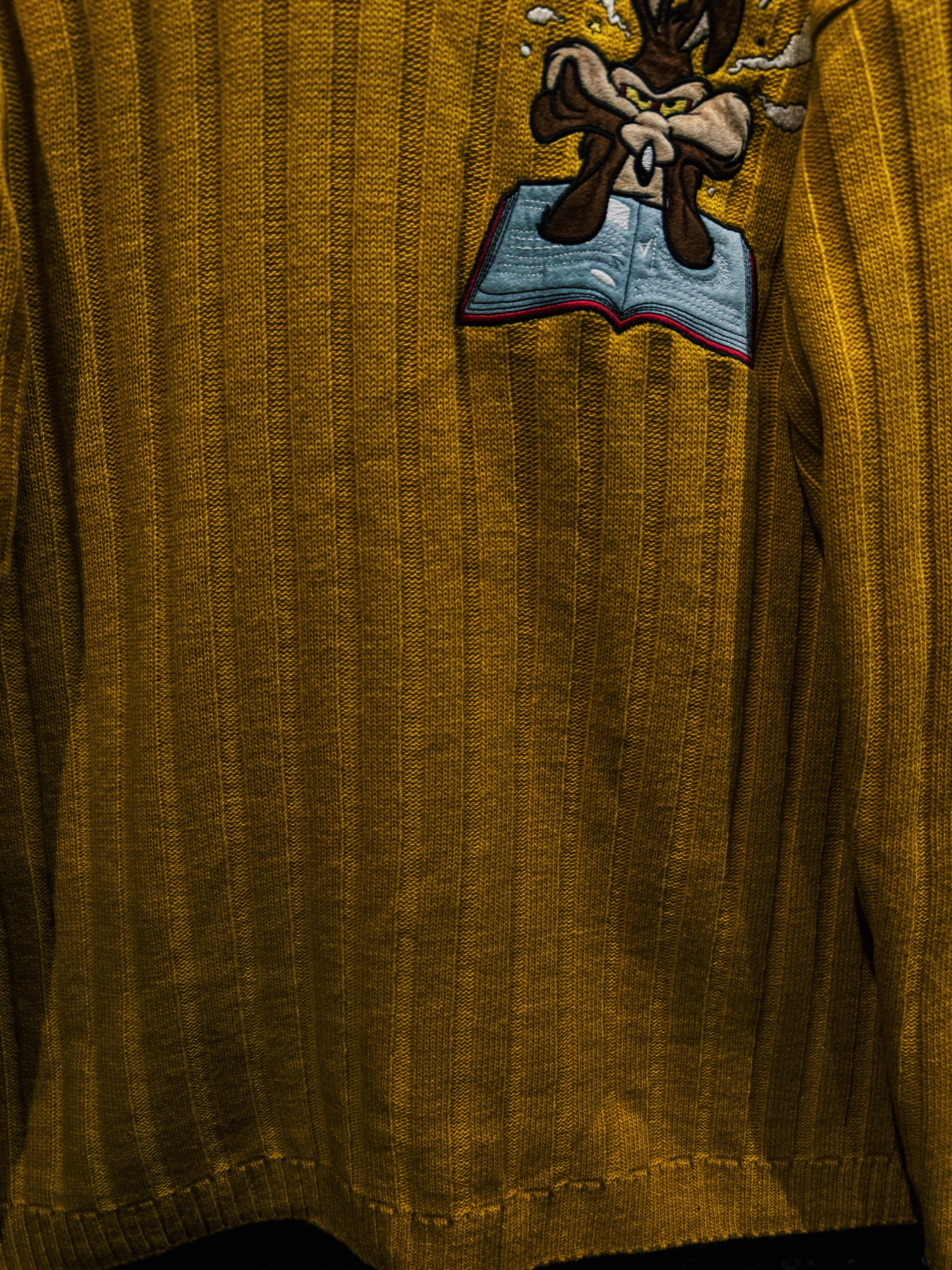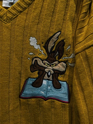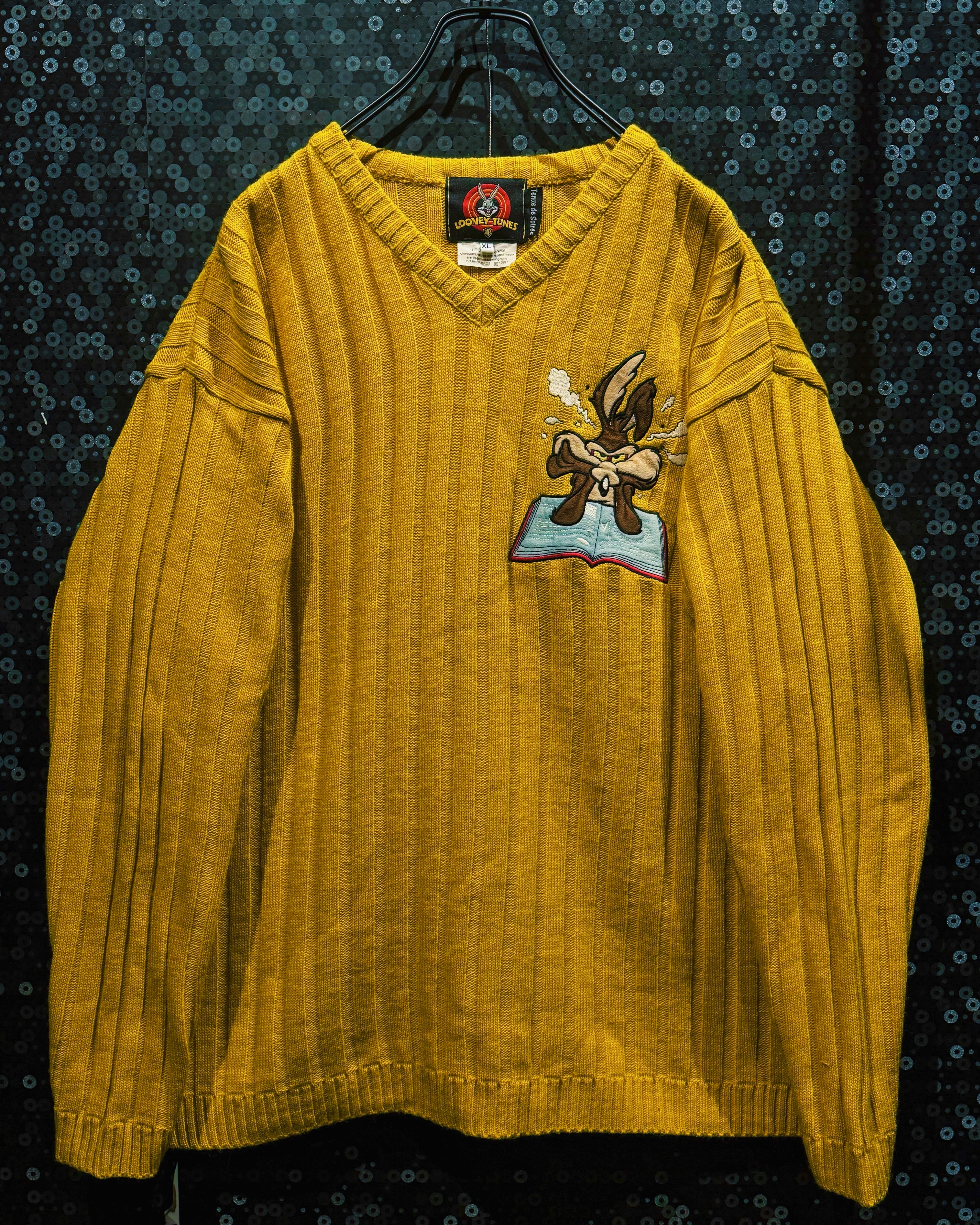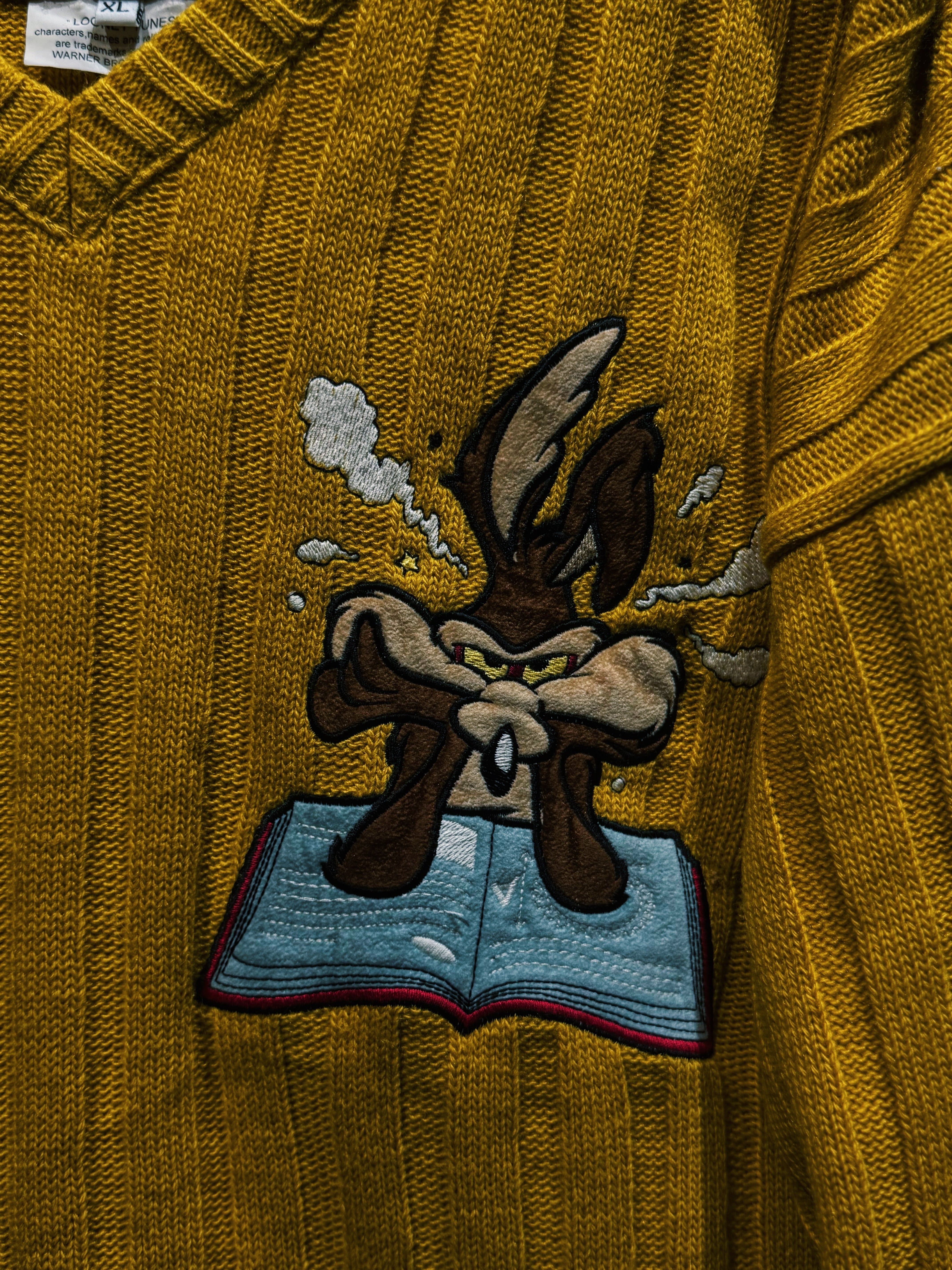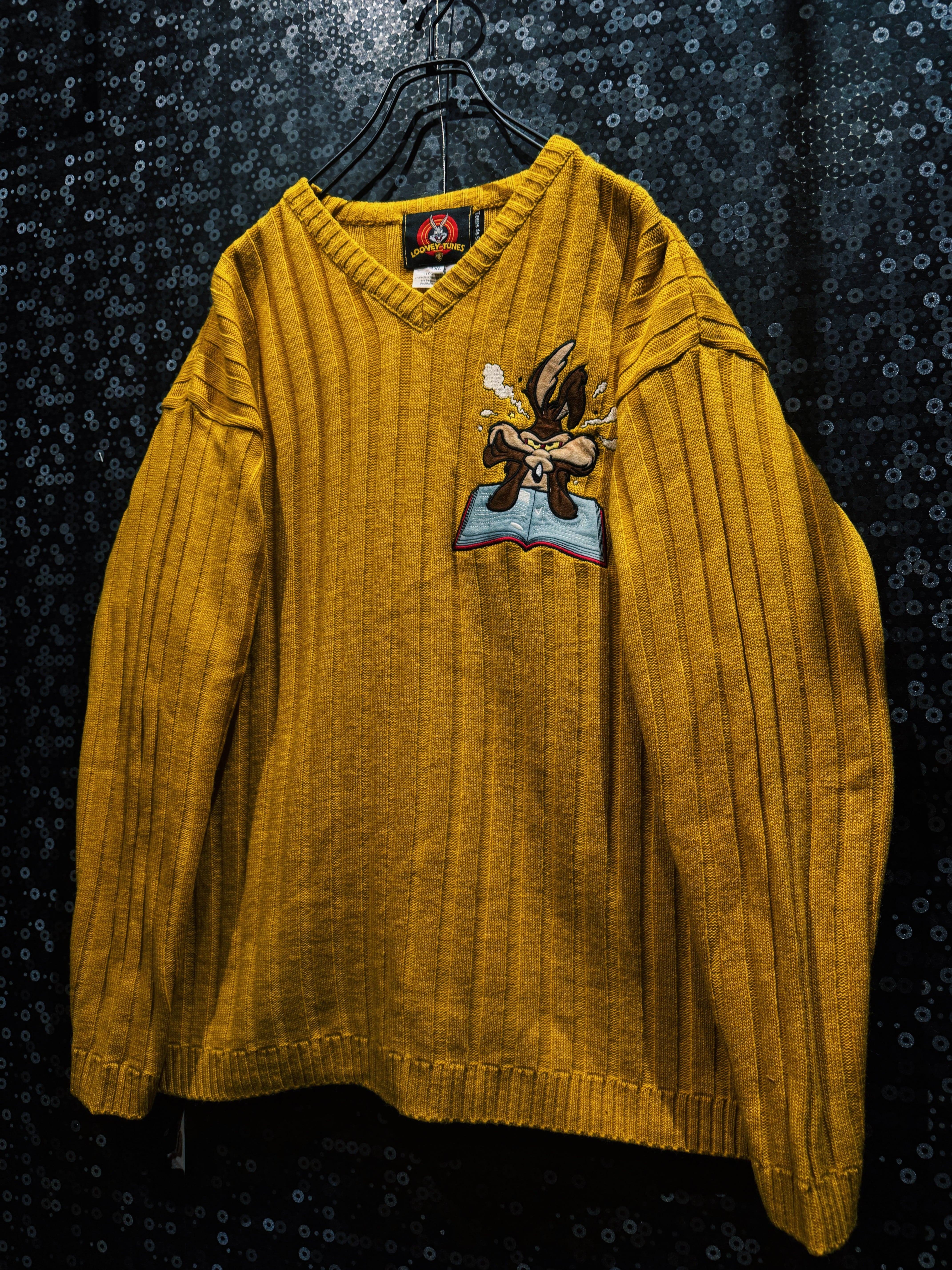 ルーニー・テューンズの名キャラ、ワイリー・コヨーテを“刺繍”で落とし込んだ異色のキャラクターニット。編みで表現されることが多い中、この個体はワッフル編みボディに立体感のある刺繍で配置された、かなり珍しい仕様。