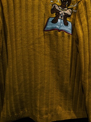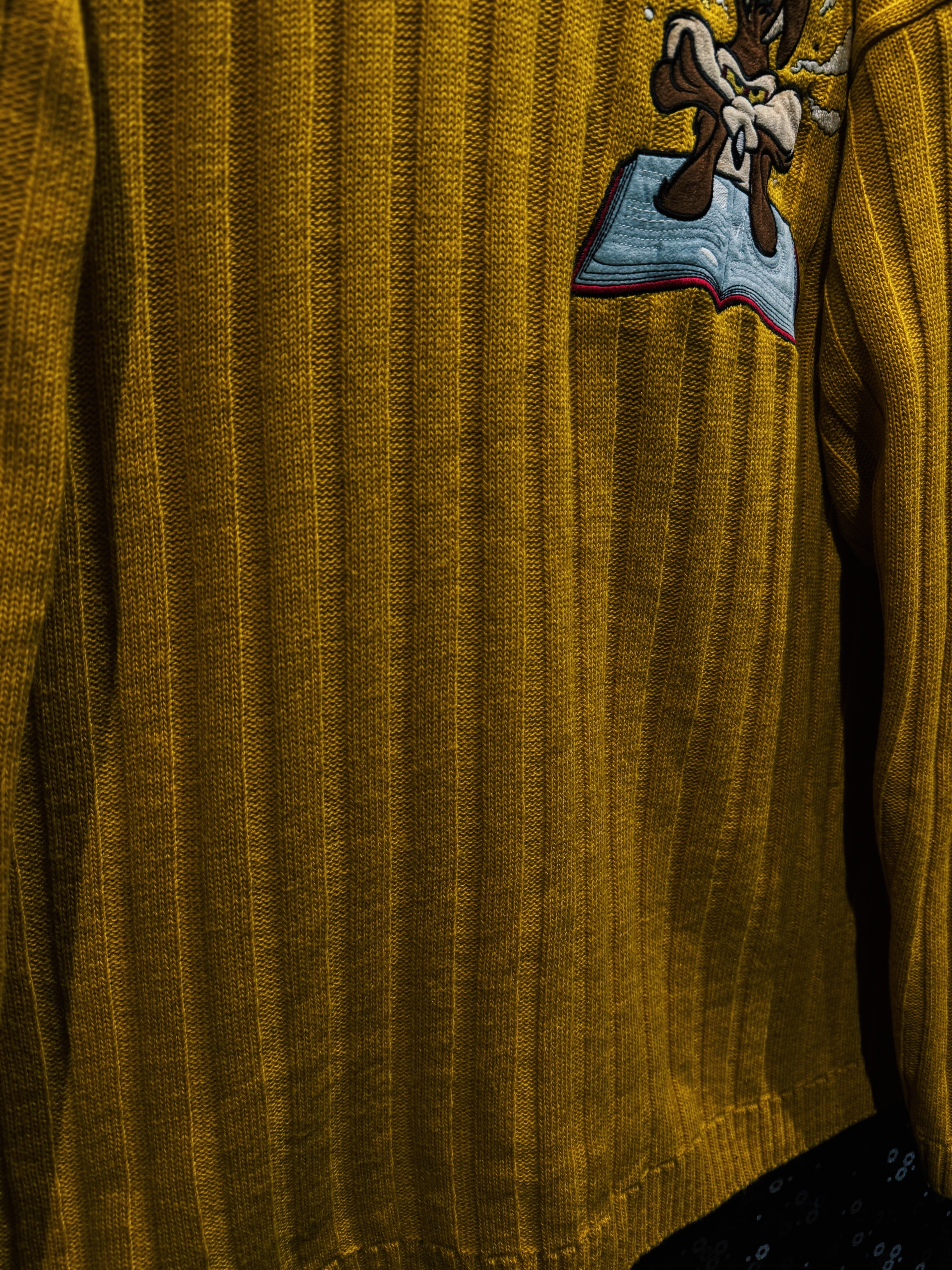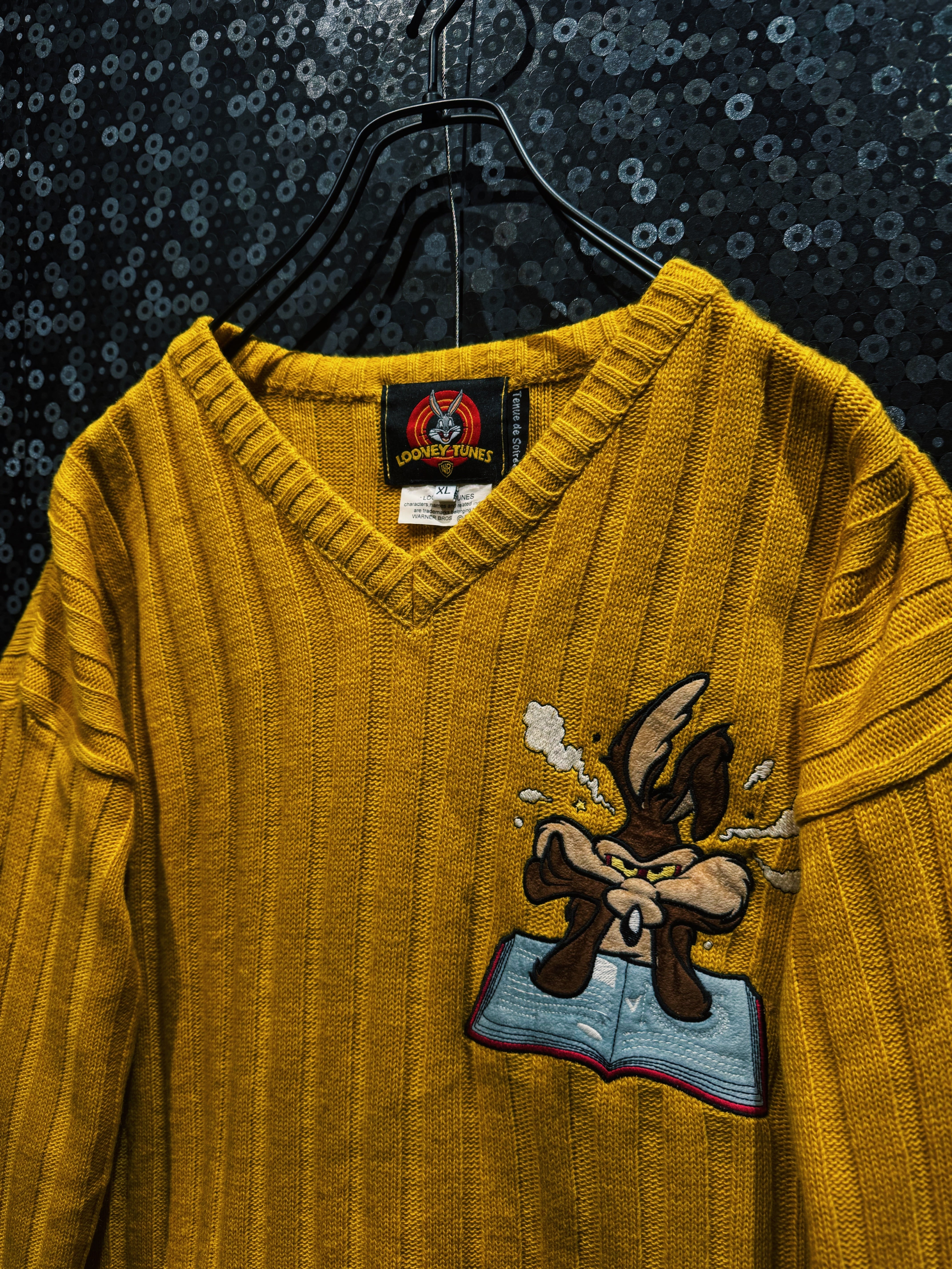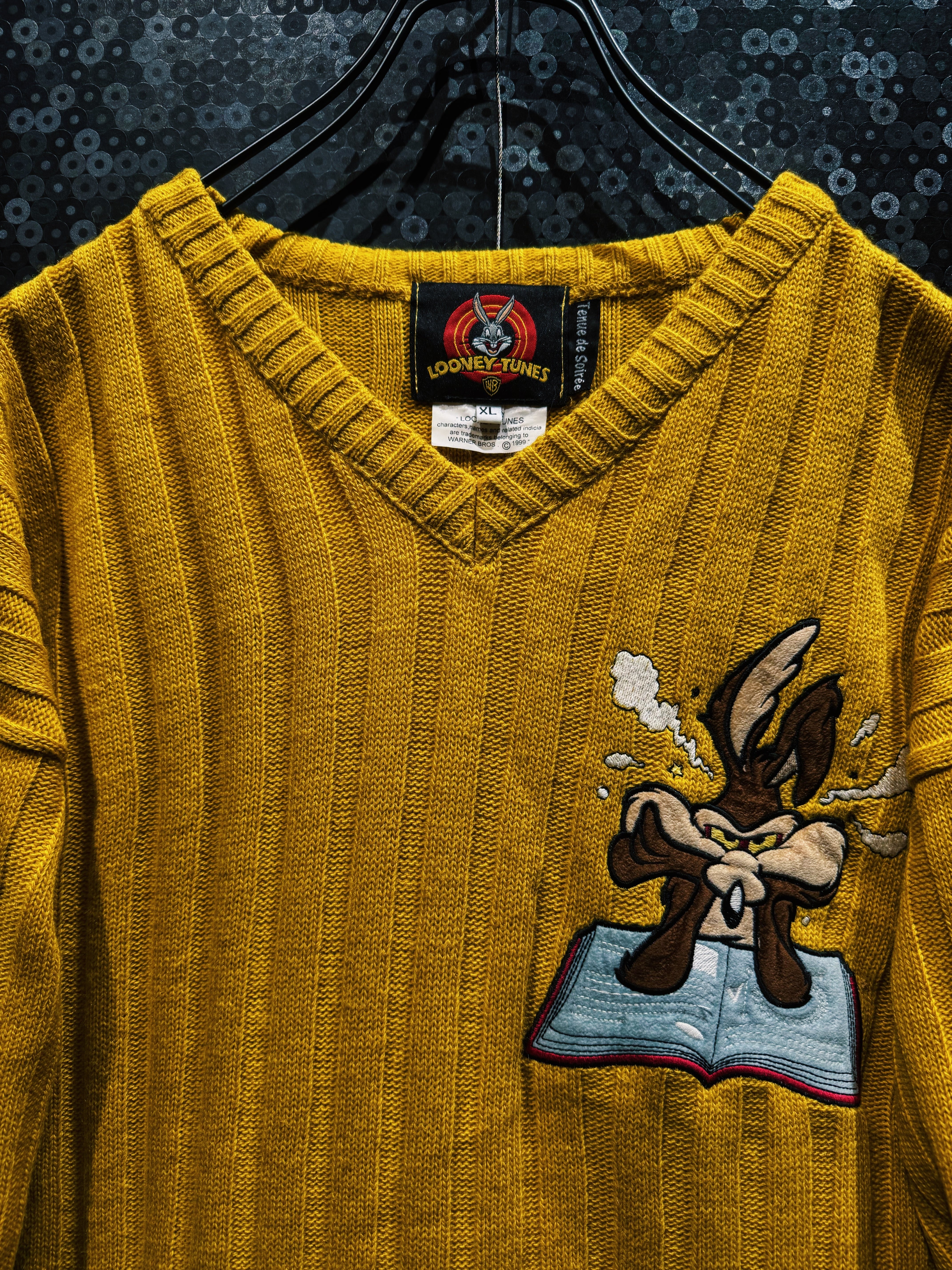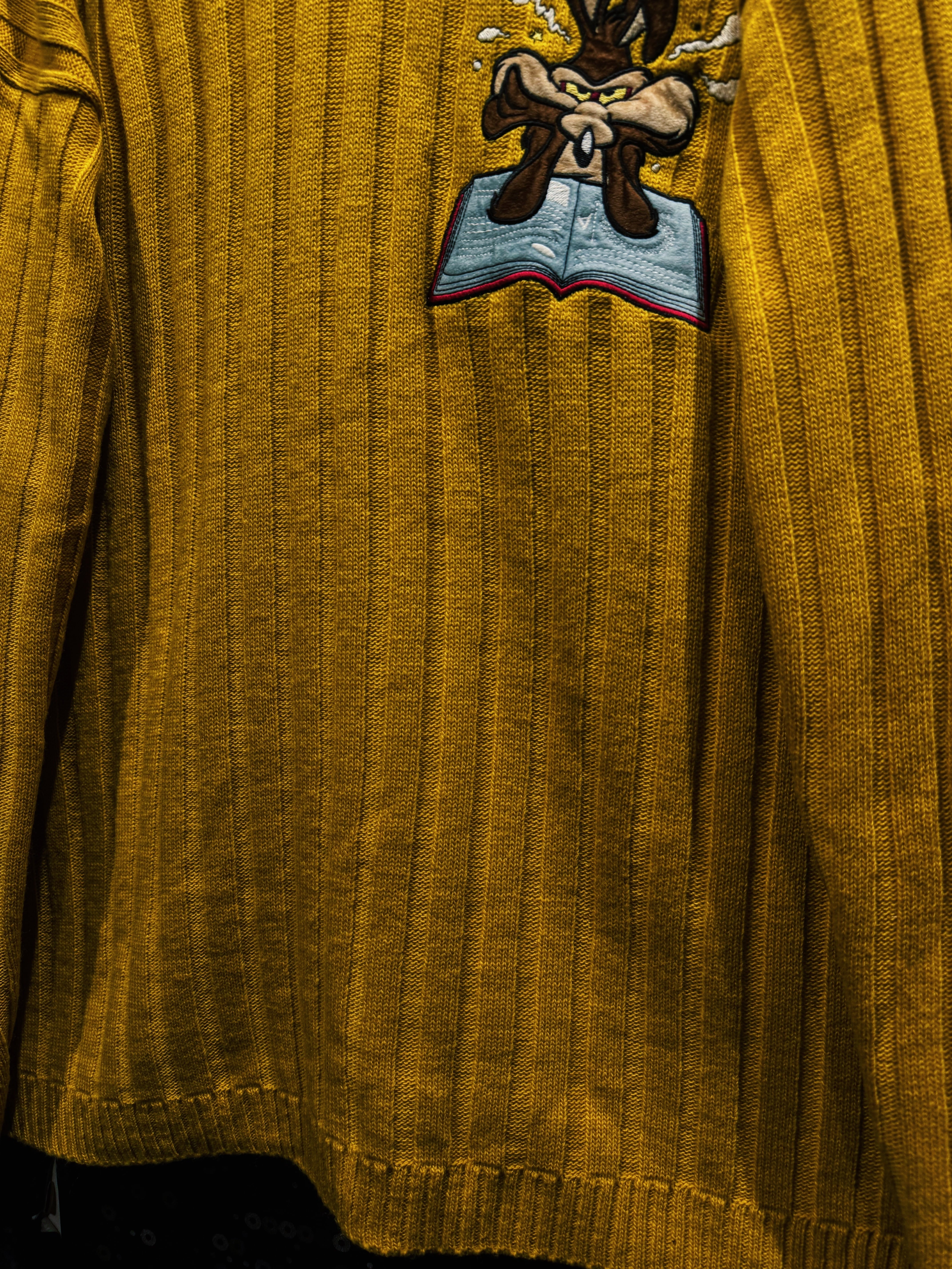 ルーニー・テューンズの名キャラ、ワイリー・コヨーテを“刺繍”で落とし込んだ異色のキャラクターニット。編みで表現されることが多い中、この個体はワッフル編みボディに立体感のある刺繍で配置された、かなり珍しい仕様。