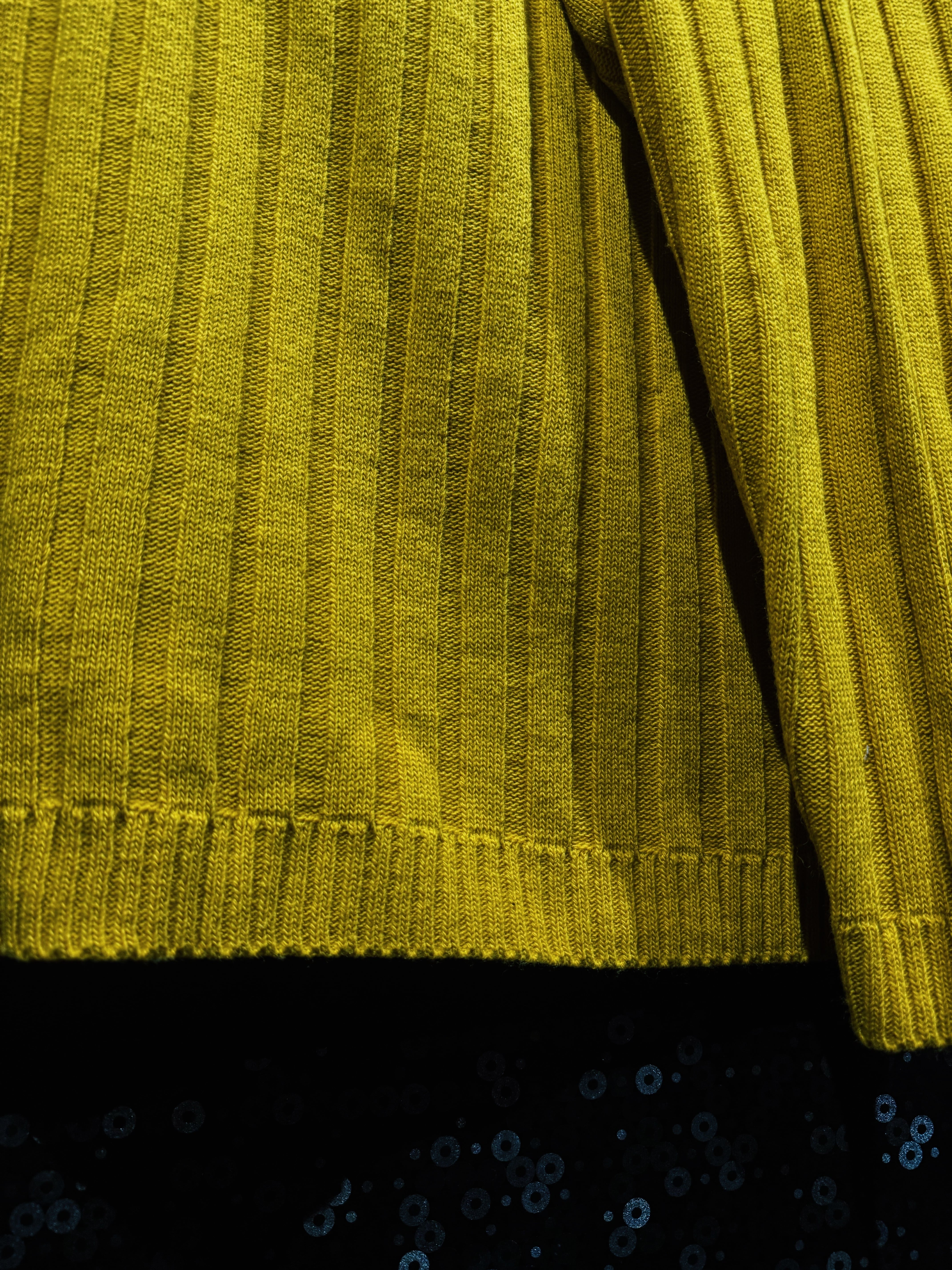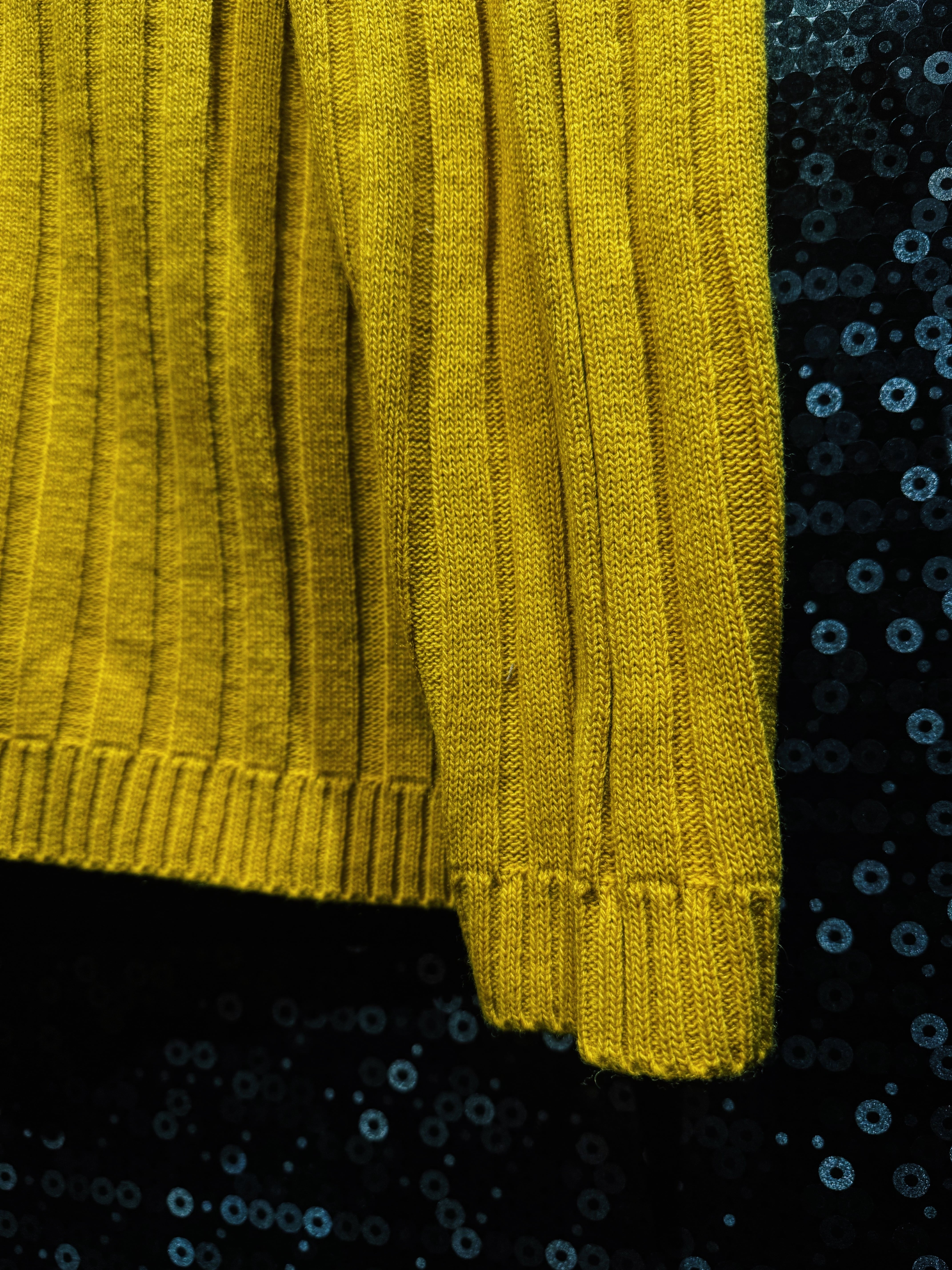 ボディはマスタードカラーのワッフル(リブ編み)仕様で、凹凸のある表情と伸縮性の高さが特徴。無地ベースでも成立するデザインに、胸ワンポイントでコヨーテが乗ることで、派手すぎずしっかり主張する絶妙なバランス。