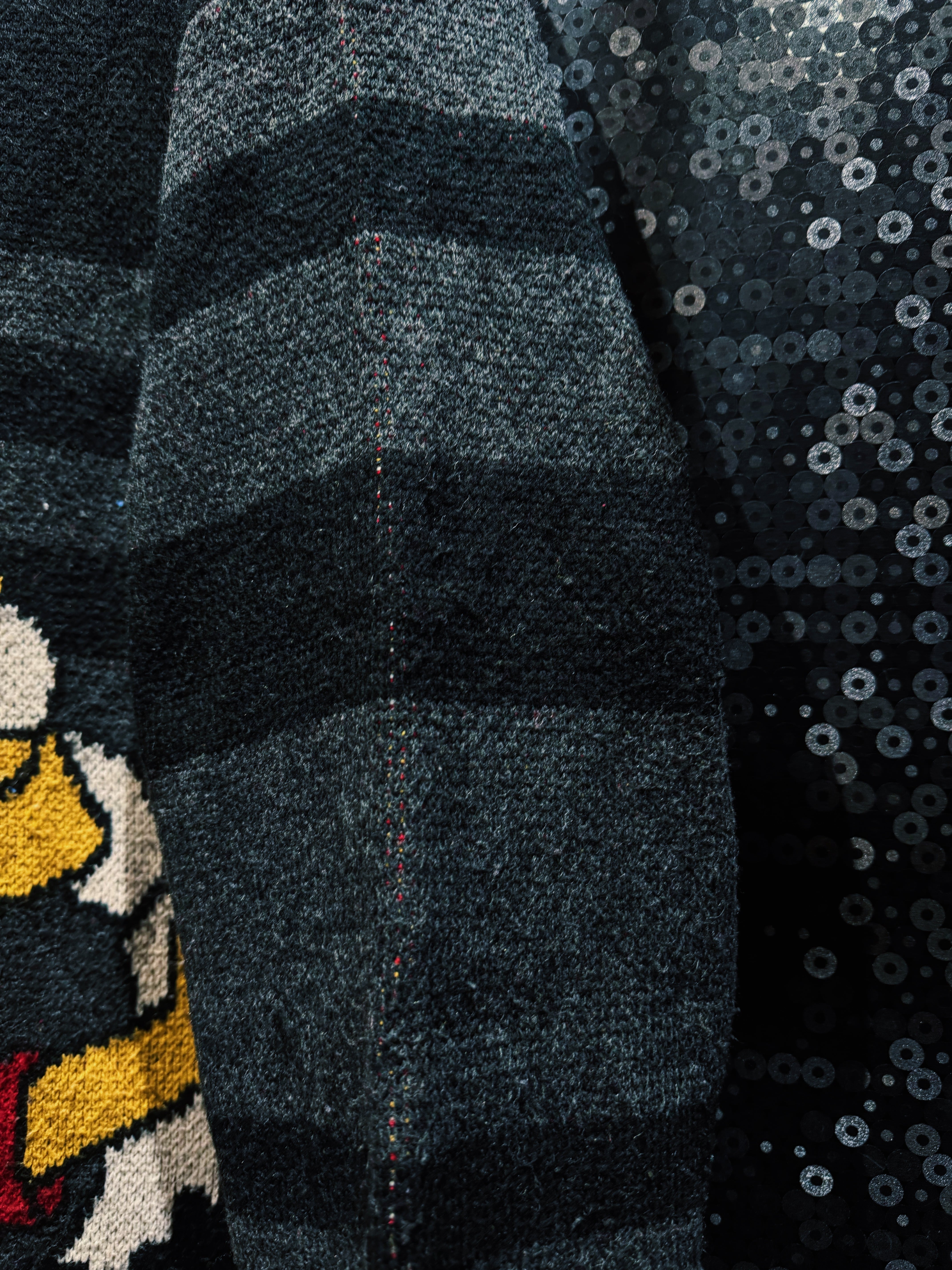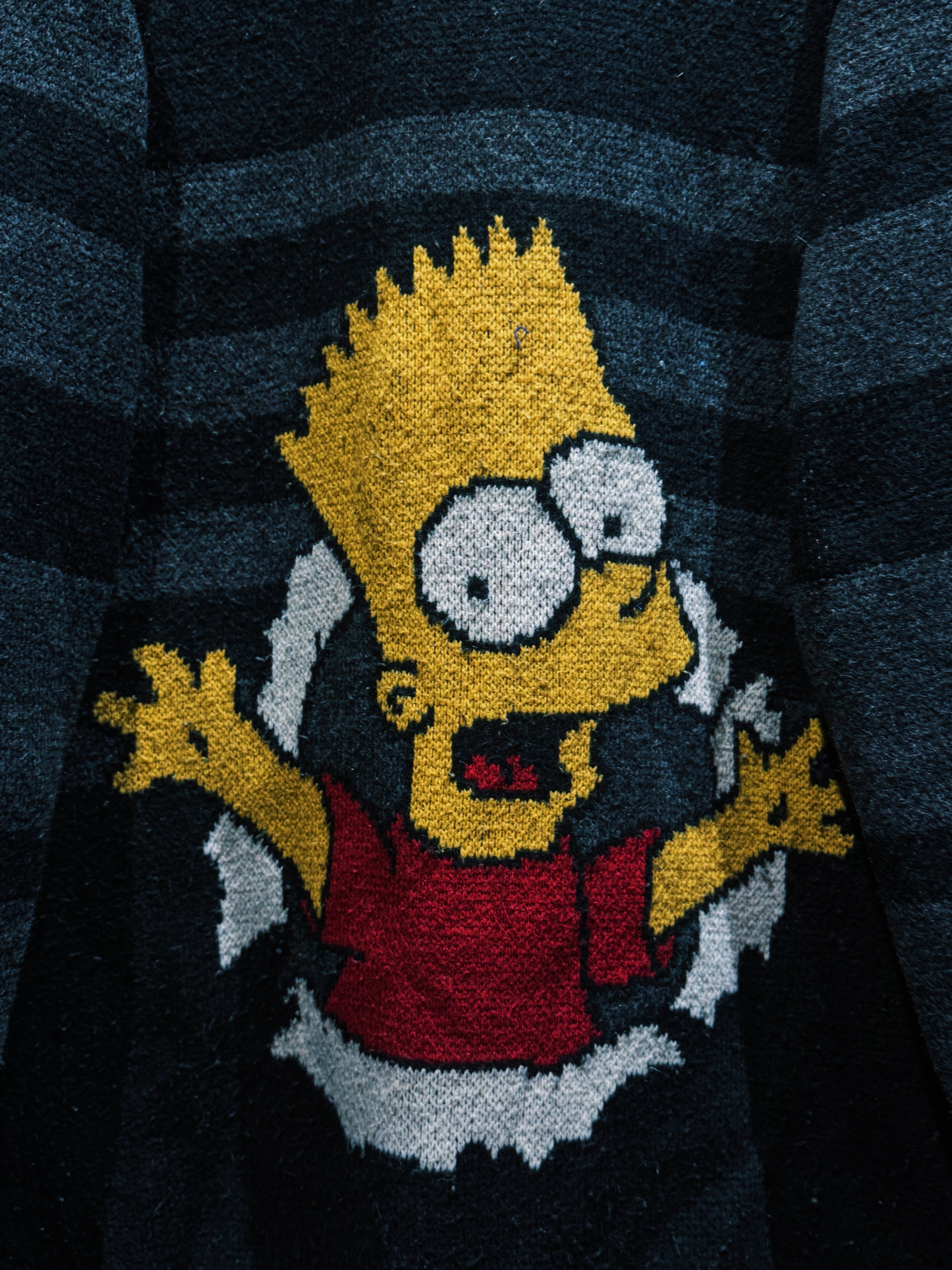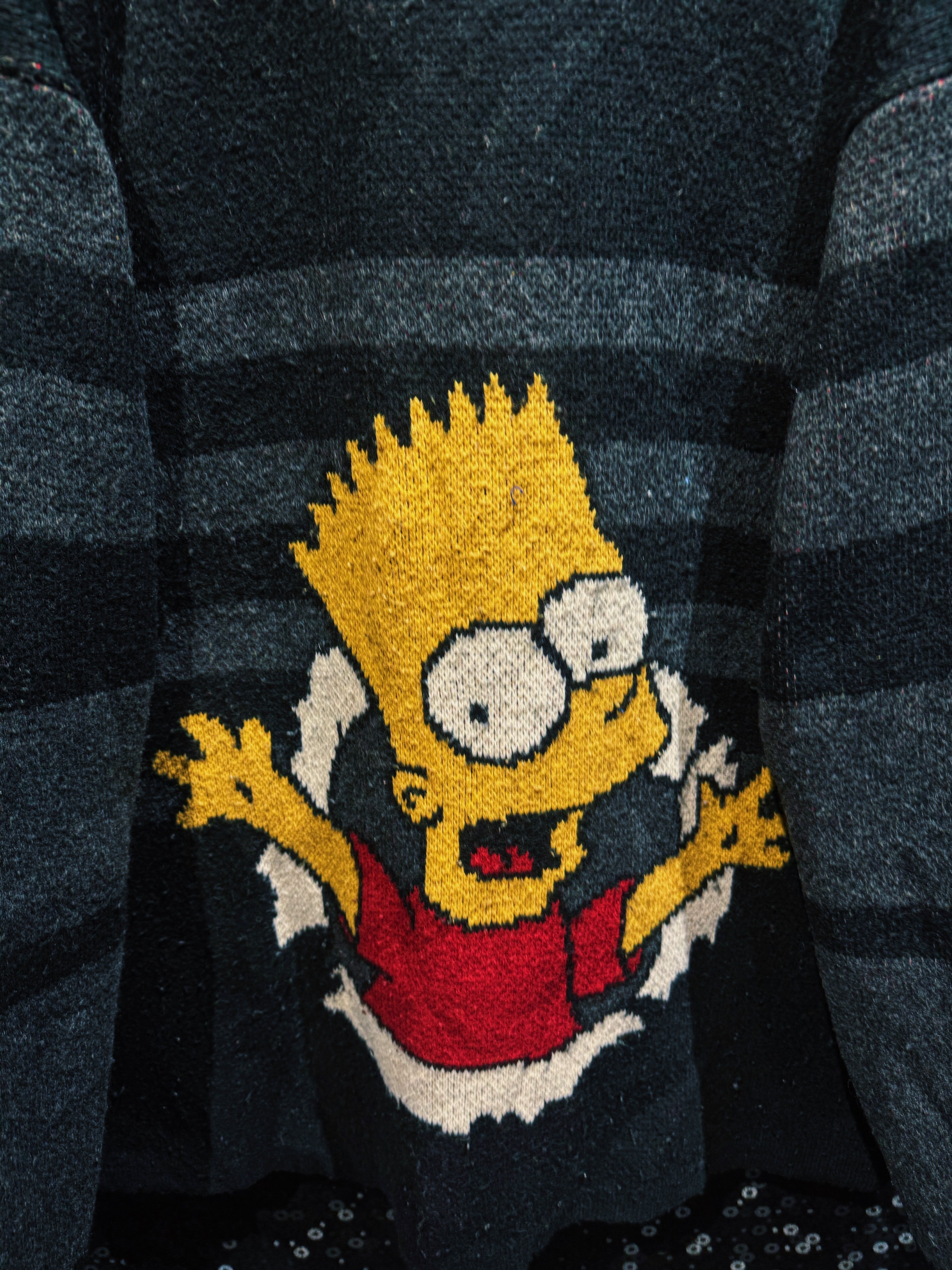 シンプソンズの問題児、バート・シンプソンが“壁ぶち抜き”で飛び出してくる瞬間をそのまま編みで表現した、90sキャラニットらしいノリ全開の一着。フロント中央に大判で配置されたクラッシュモチーフは、静止画なのに動きを感じる完成度の高さ。