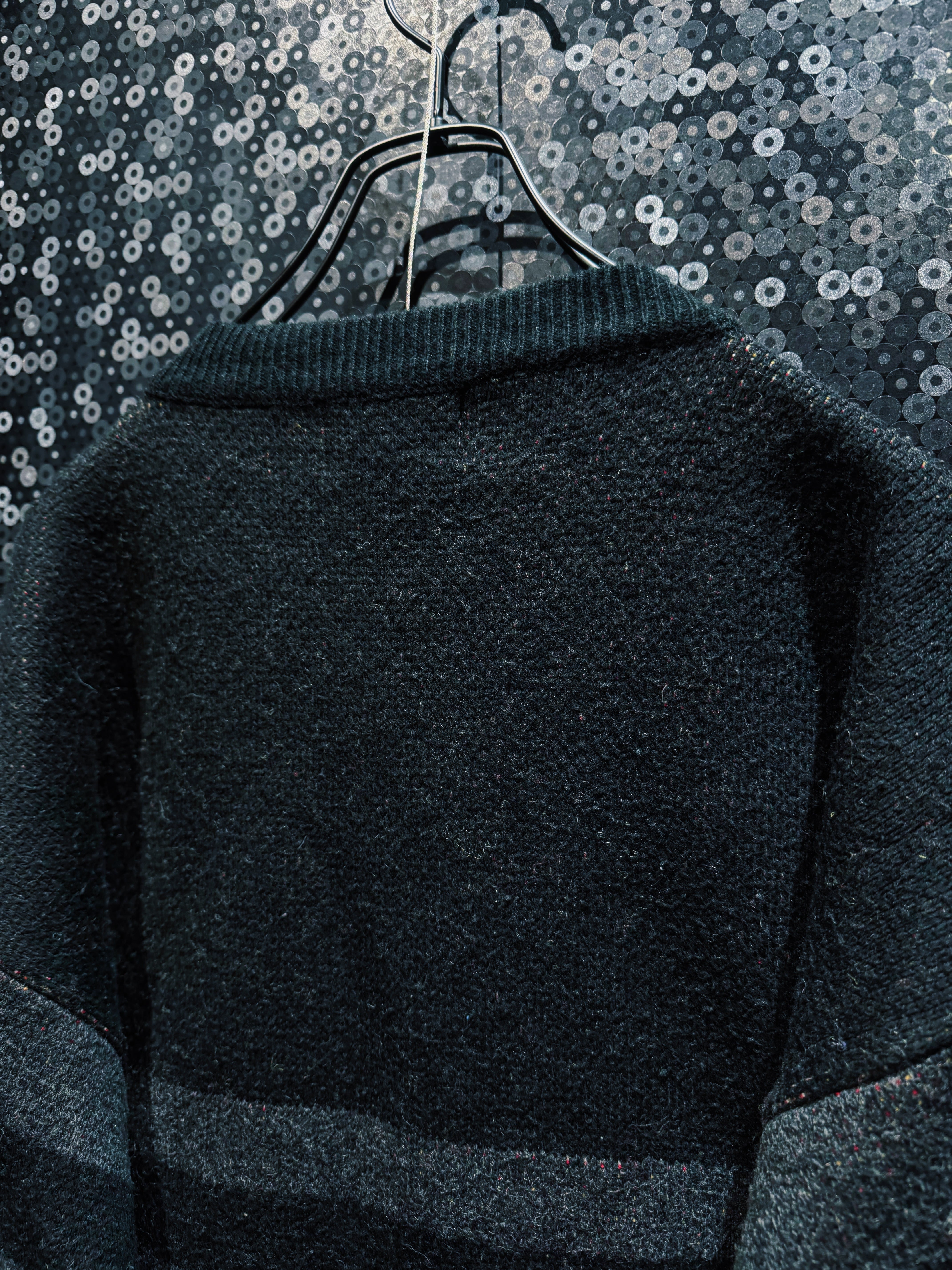 素材はアクリル主体で、軽さと着やすさをキープしつつ、しっかりとした編み地で型崩れしにくい仕様。ネック裏の多色編みの補強も、当時のしっかりした作りを感じるディテール。