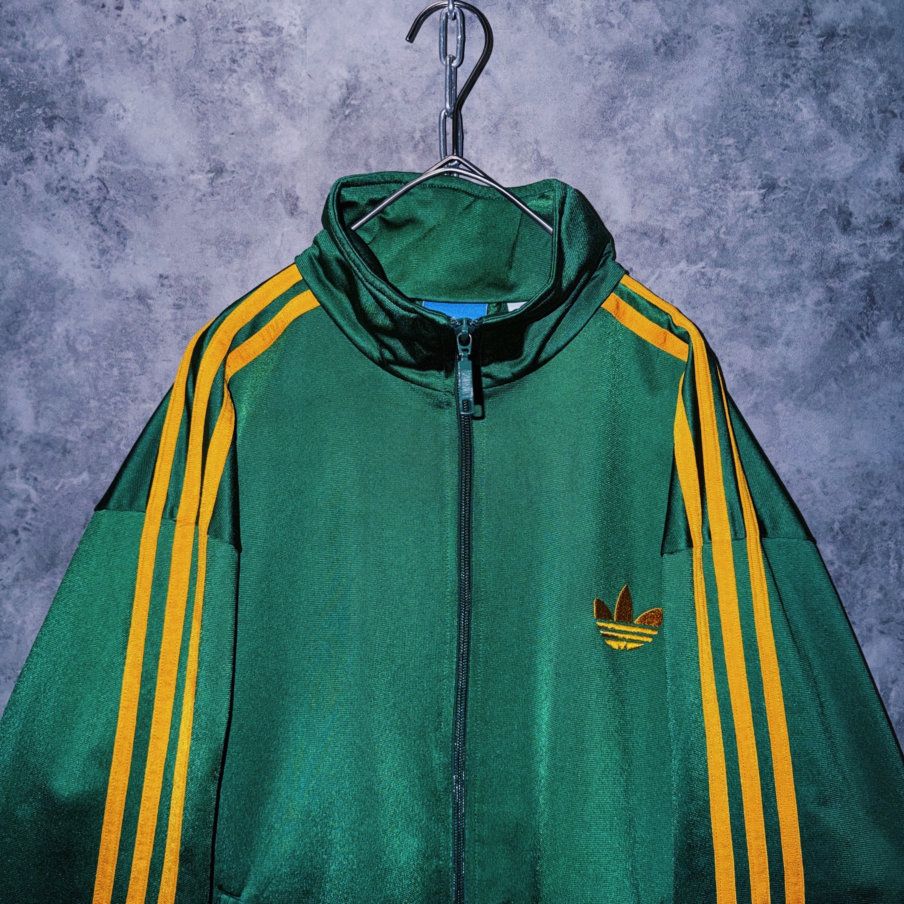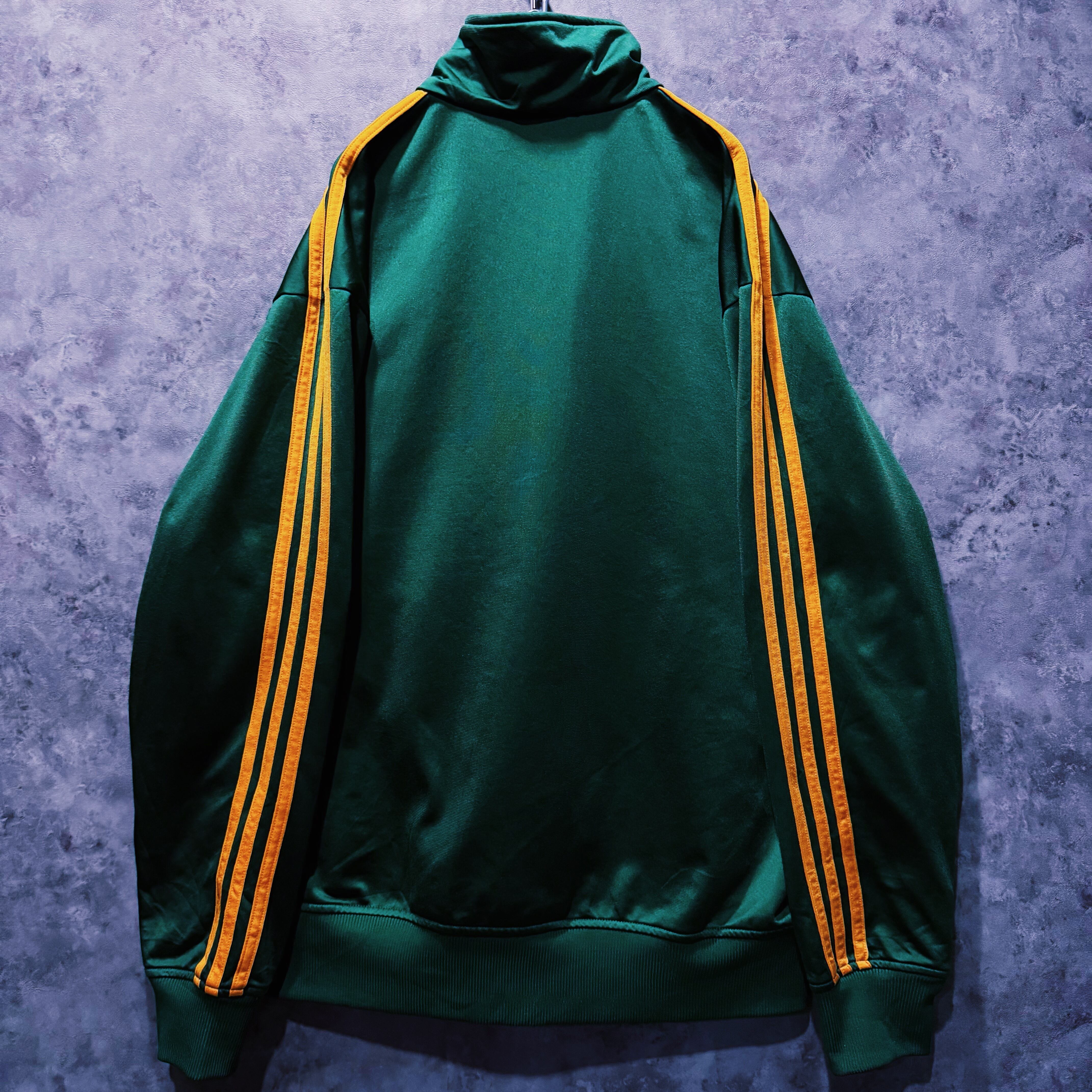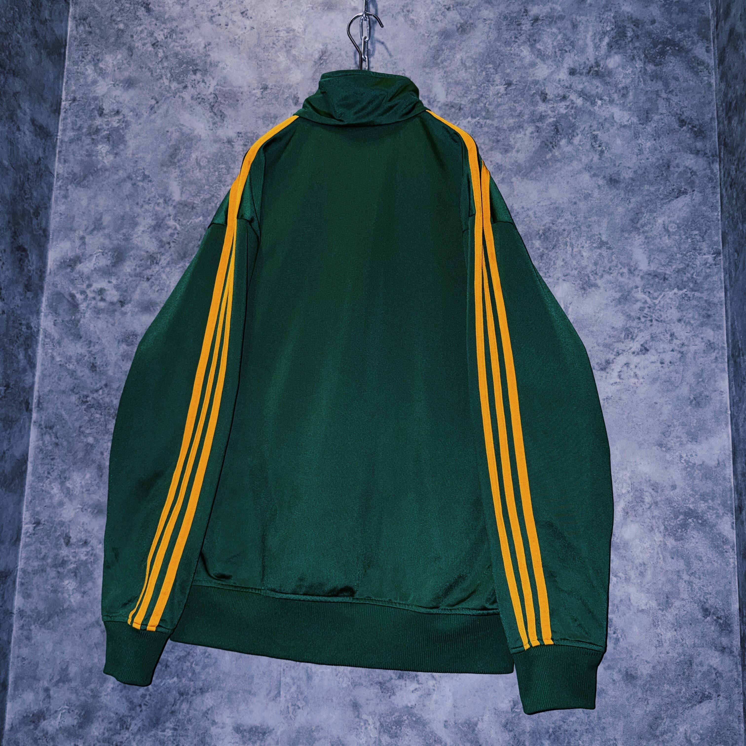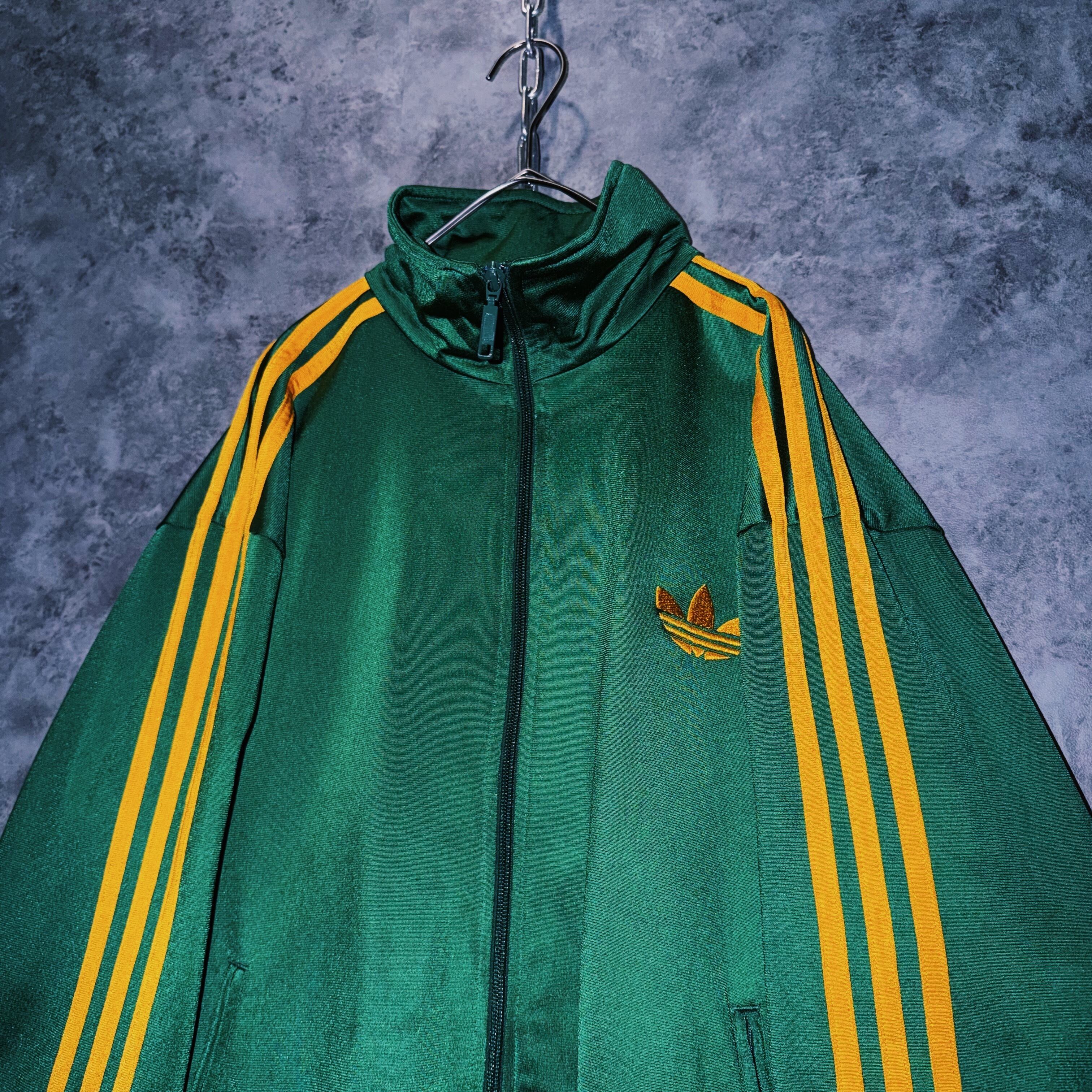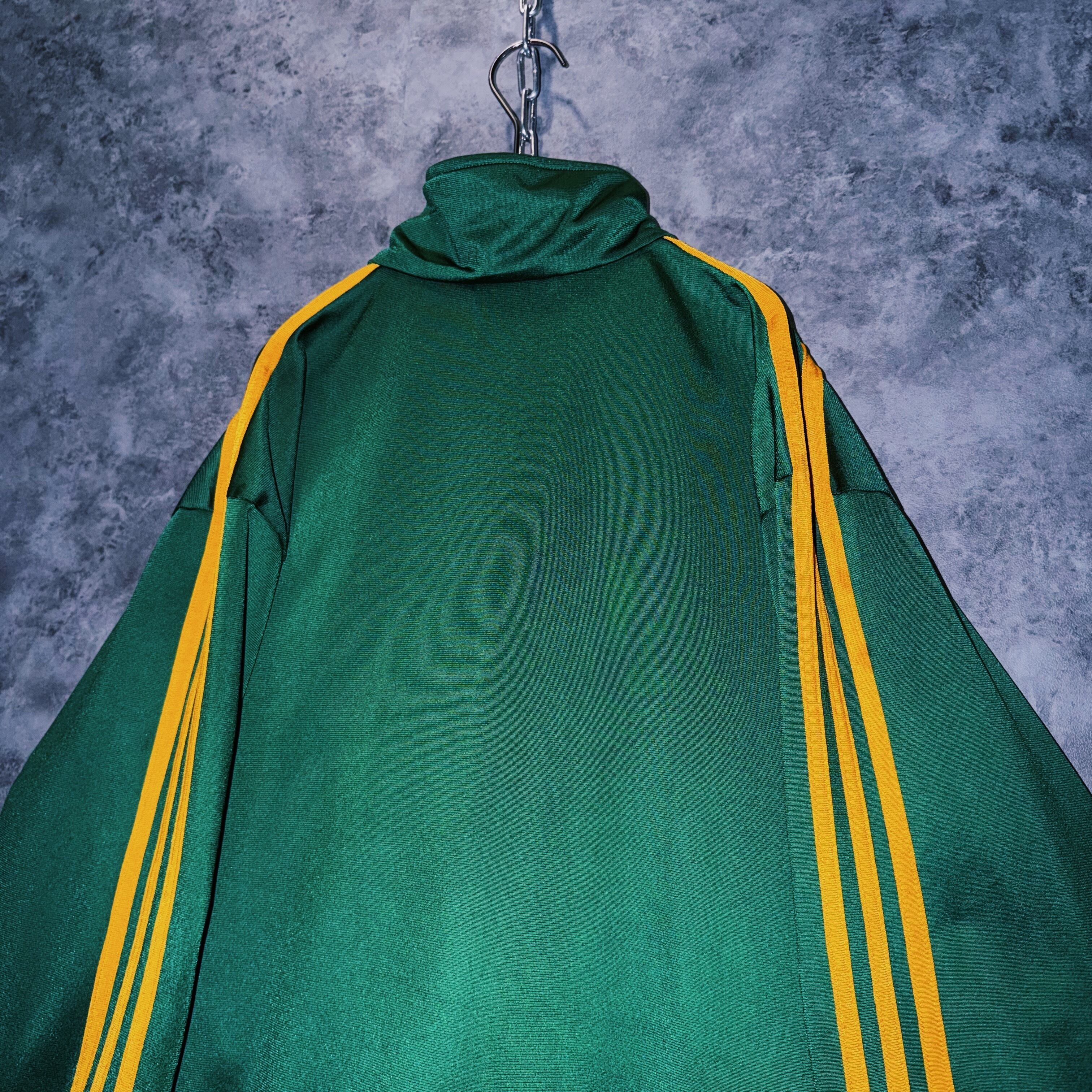 光沢あるハンターグリーンカラーの生地に、イエローカラーでスリーストライプとトレフォイルロゴを施した一枚。