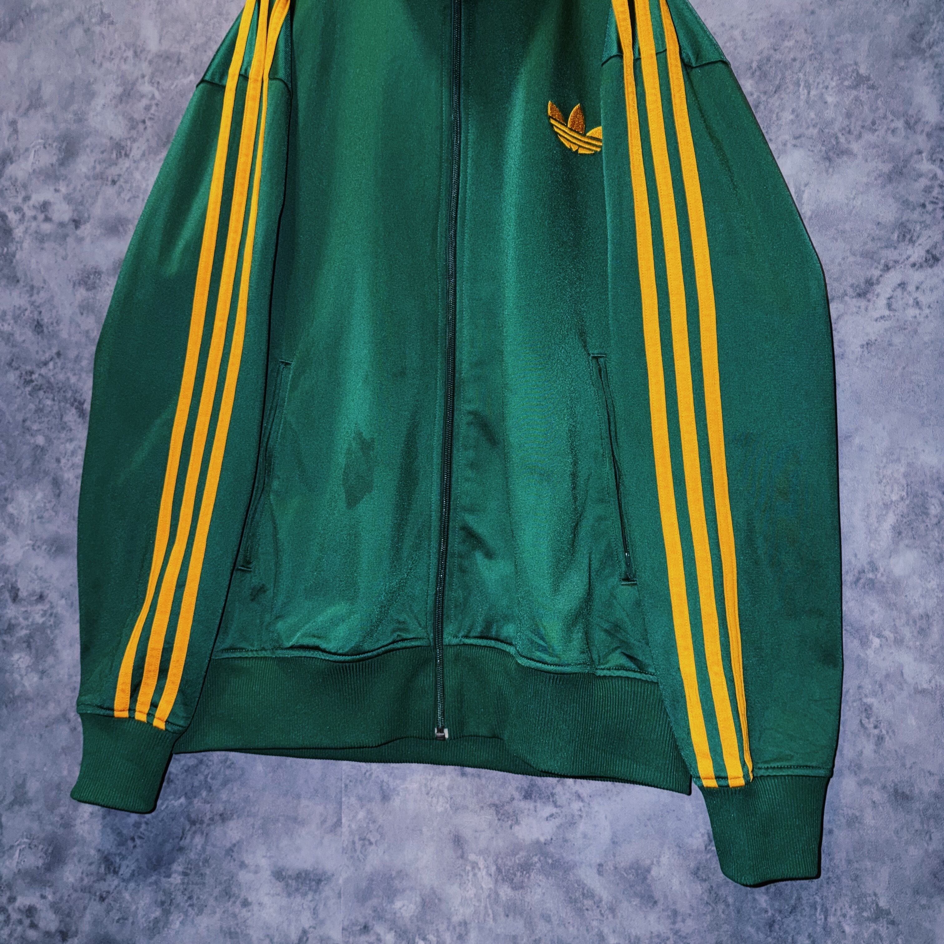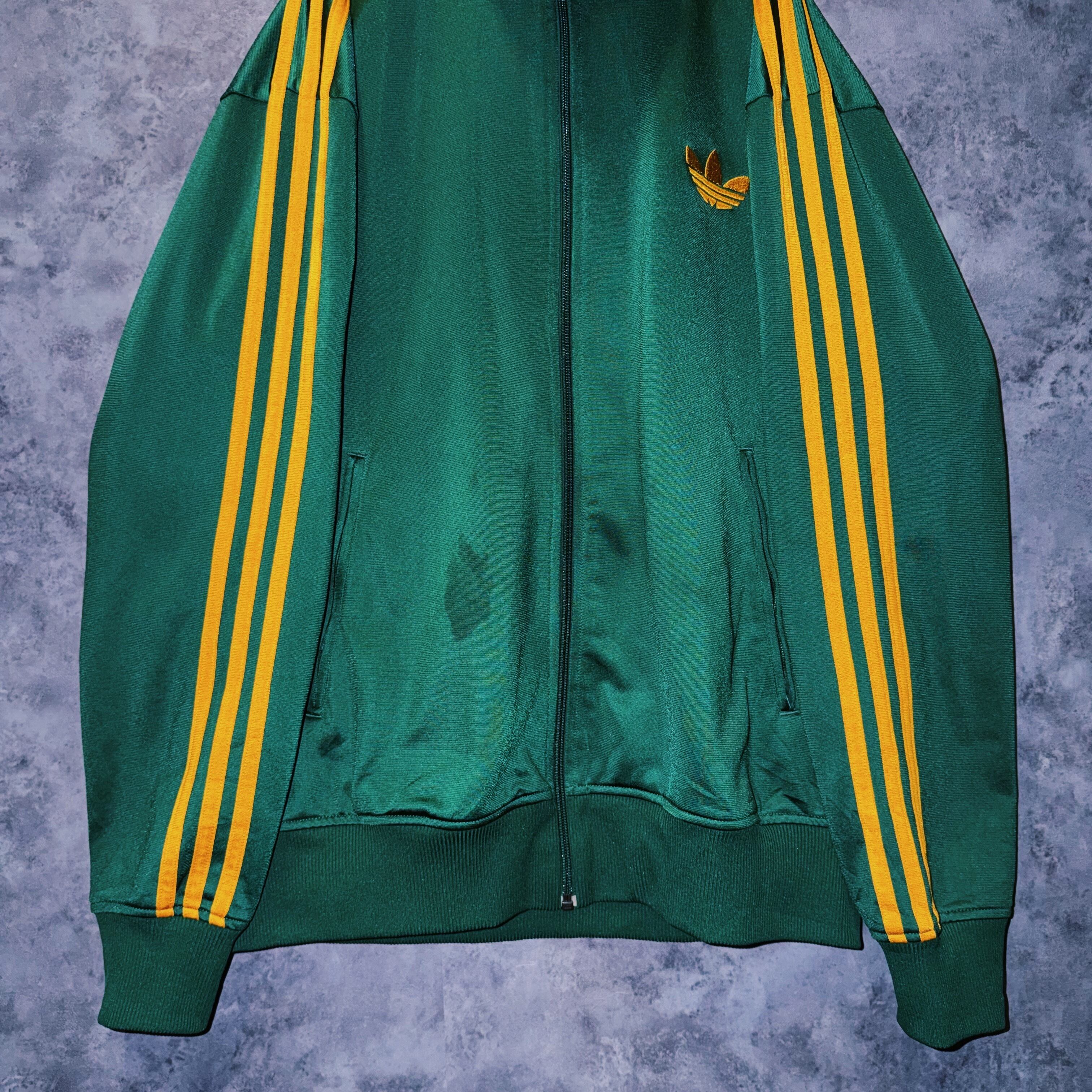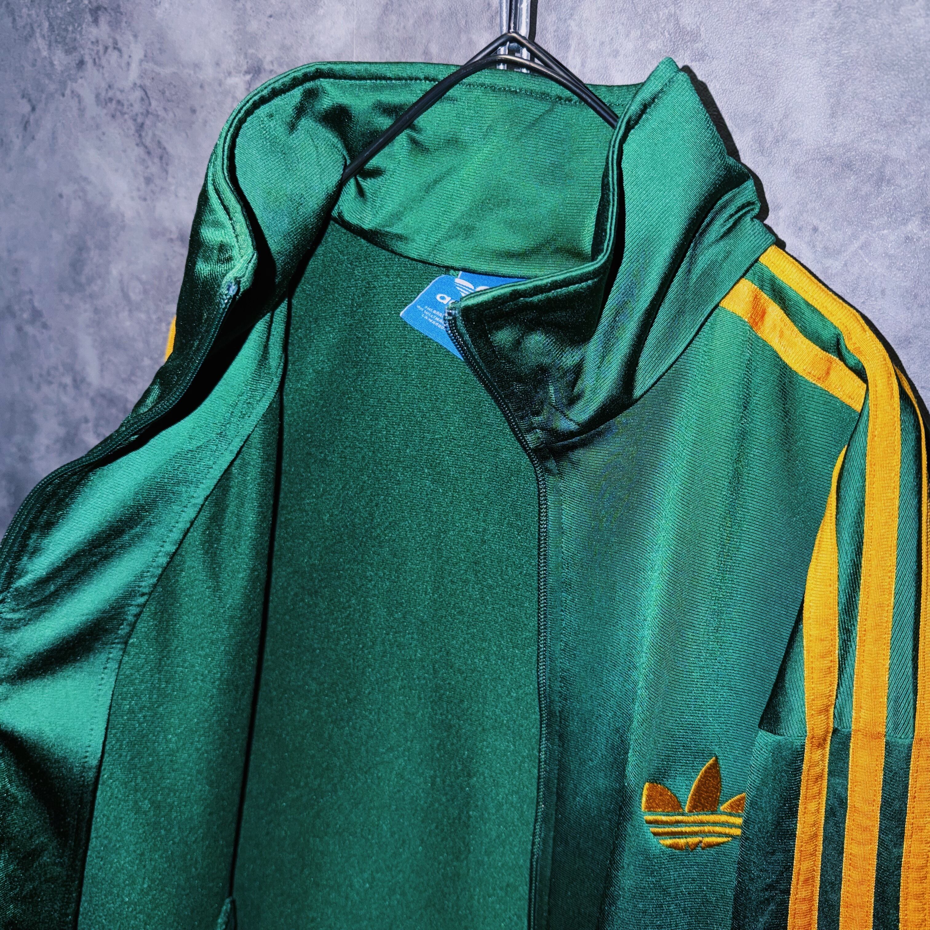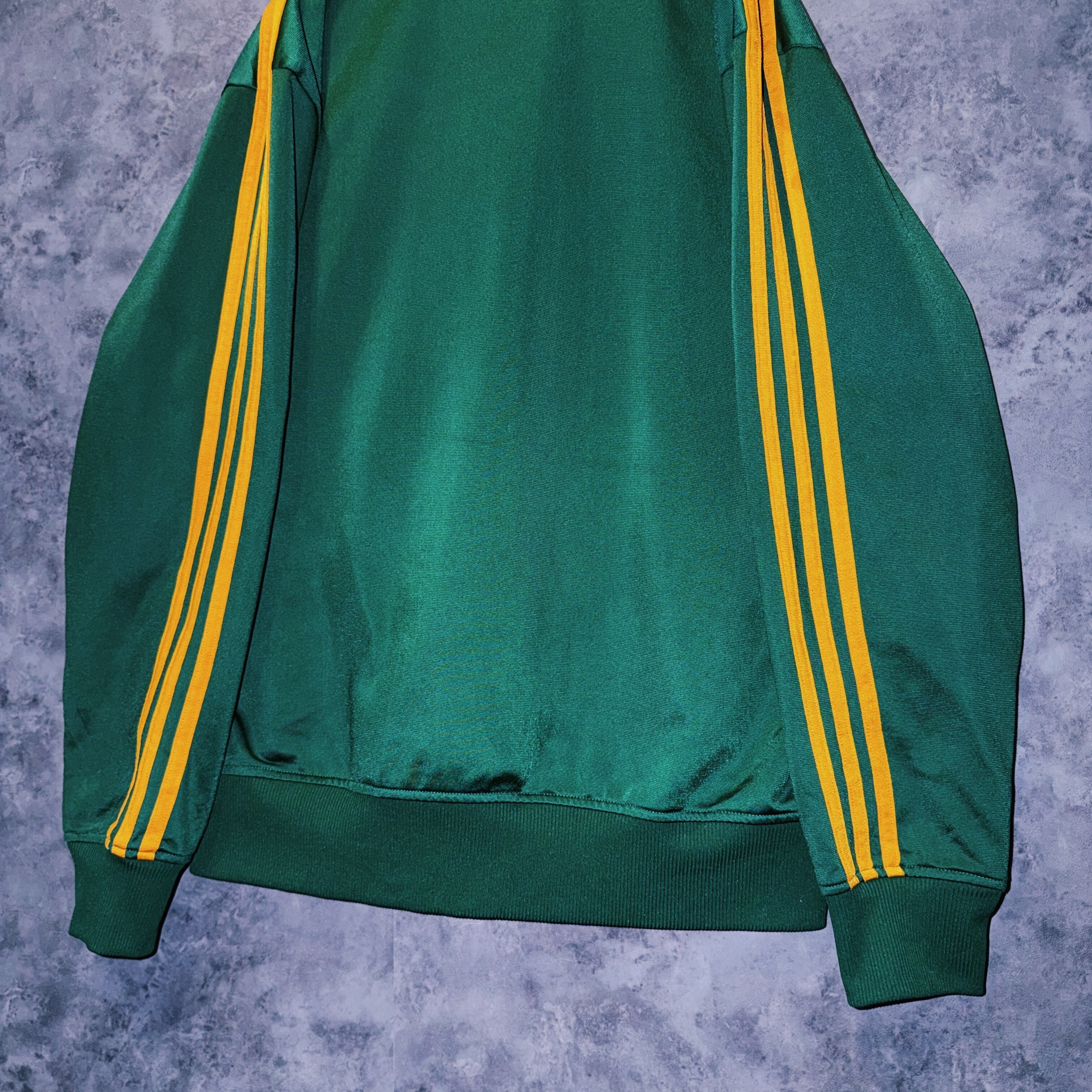 光沢あるハンターグリーンカラーの生地に、イエローカラーでスリーストライプとトレフォイルロゴを施した一枚。