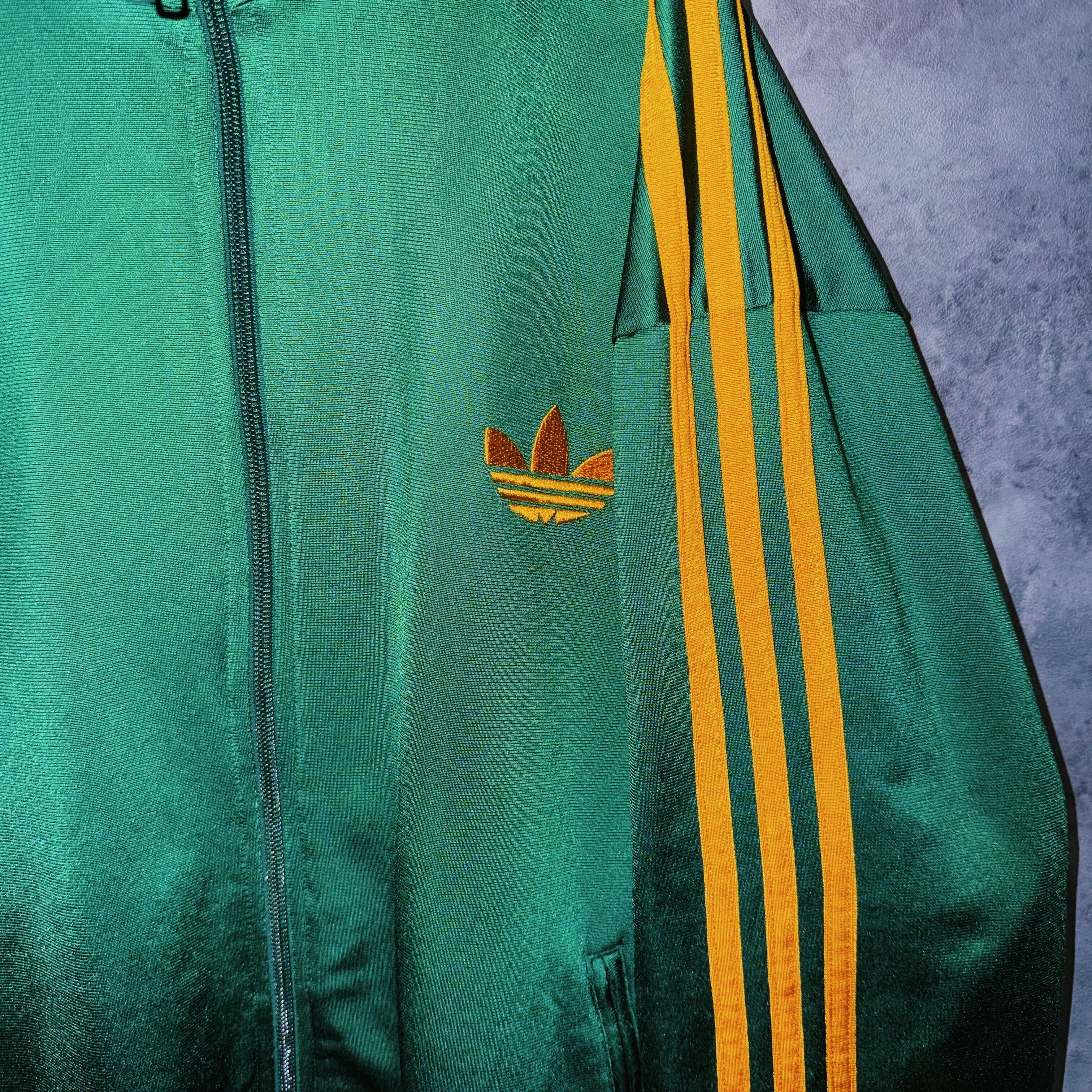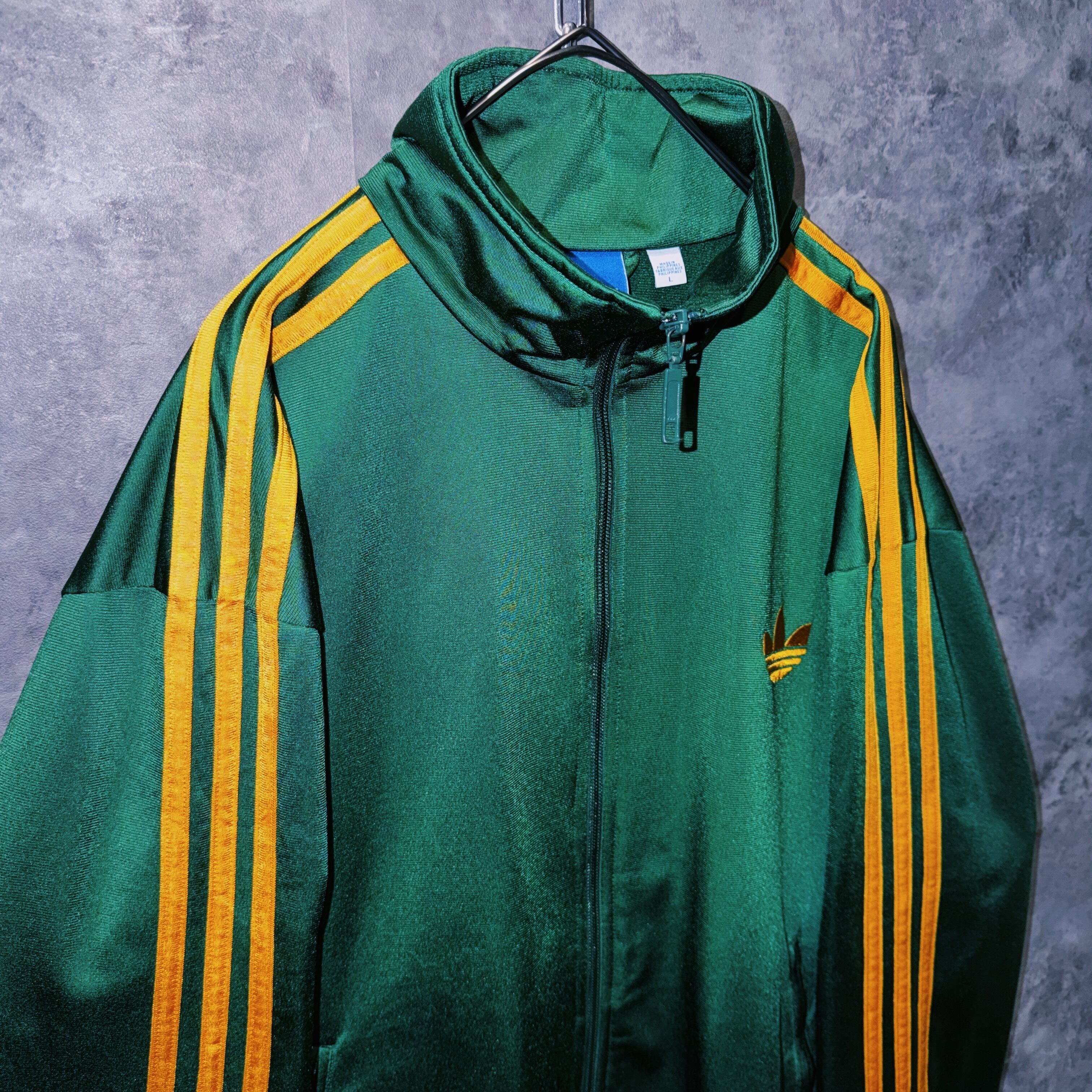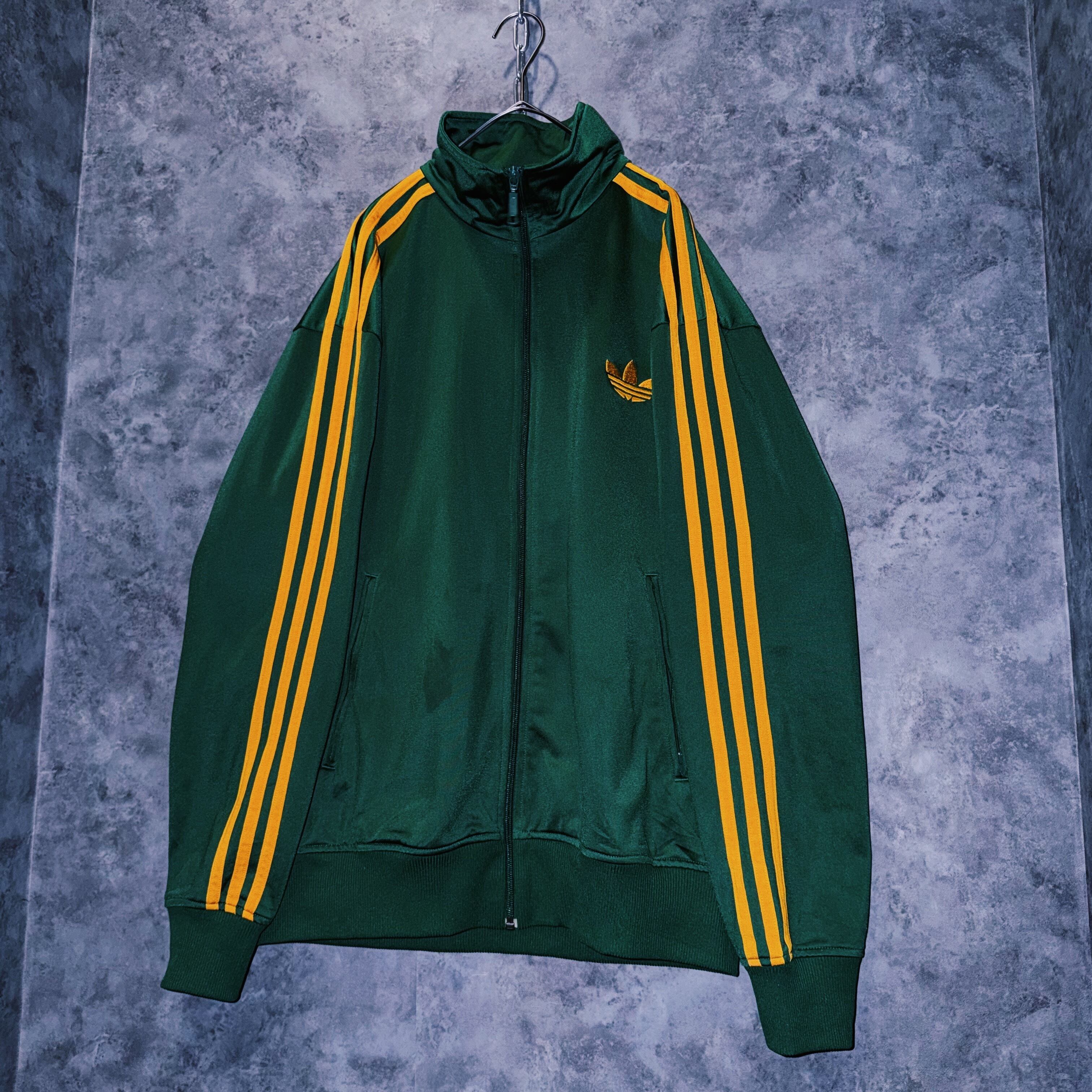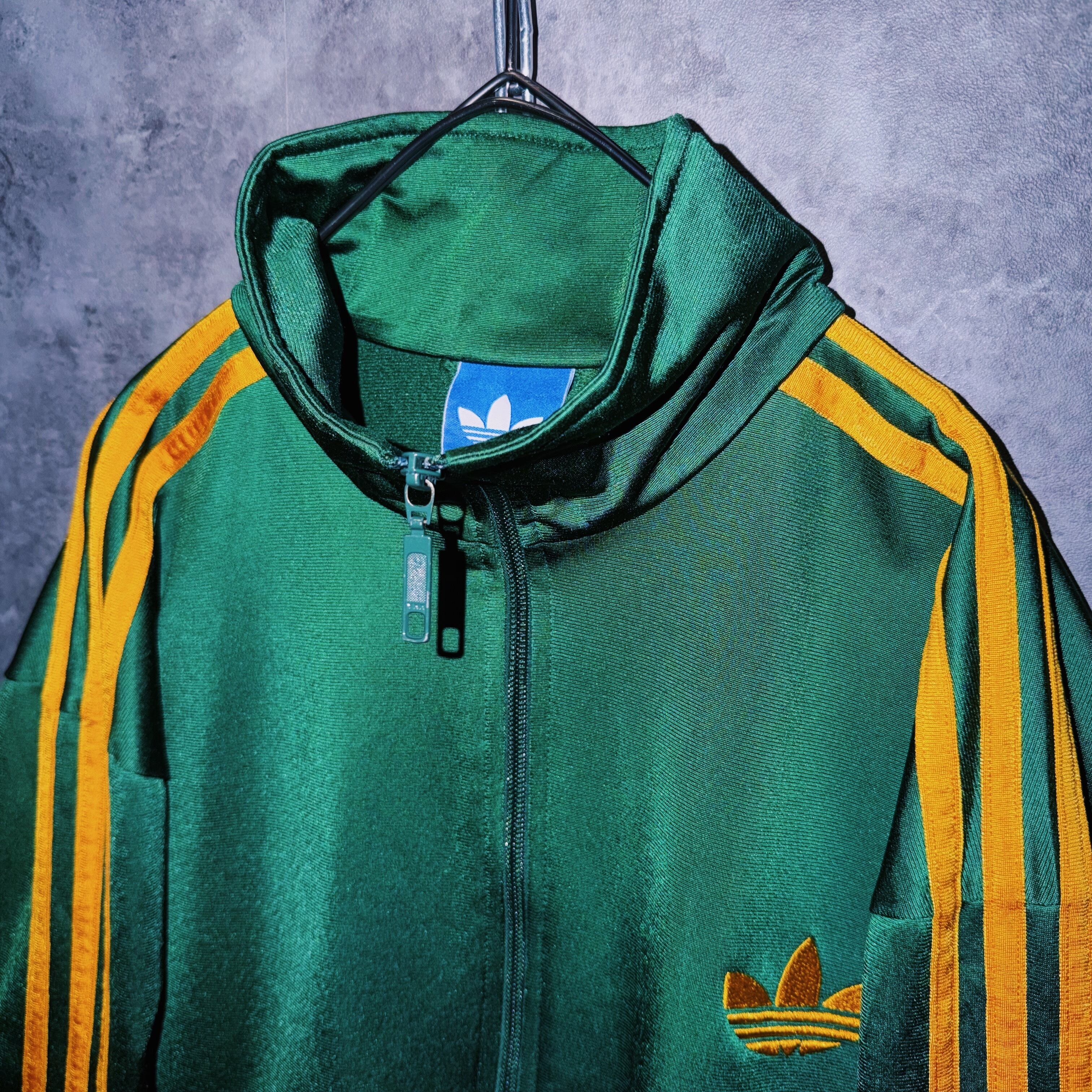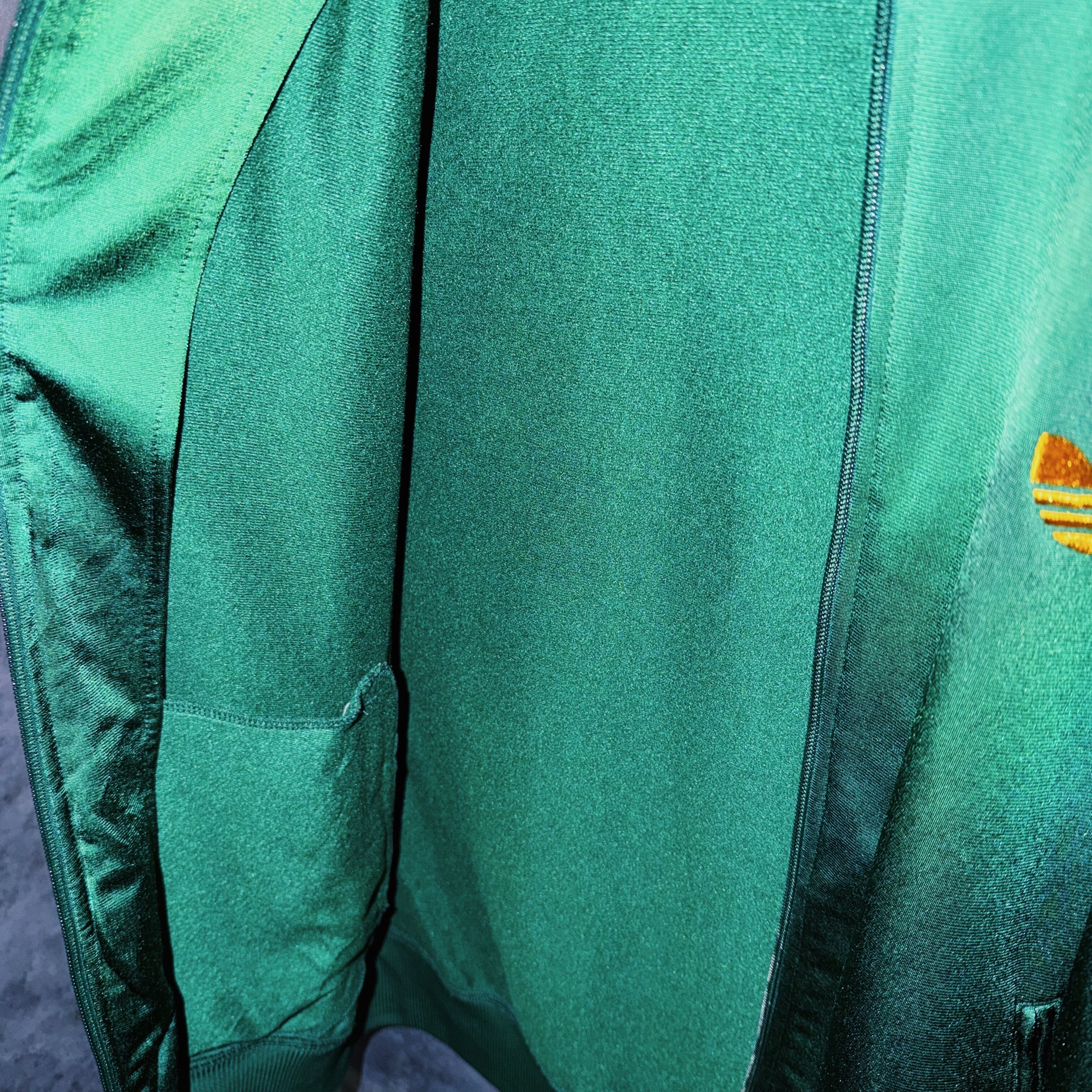 光沢あるハンターグリーンカラーの生地に、イエローカラーでスリーストライプとトレフォイルロゴを施した一枚。