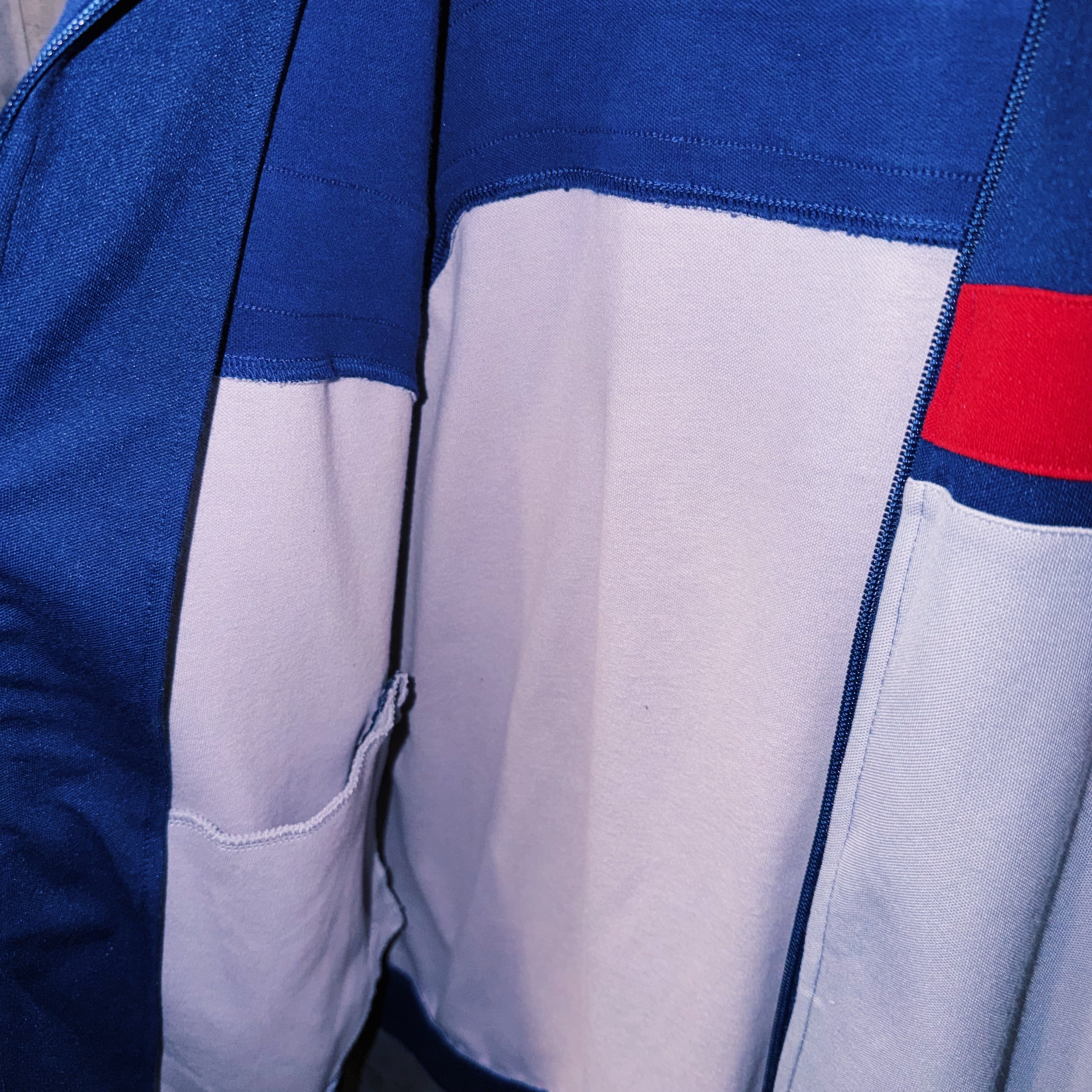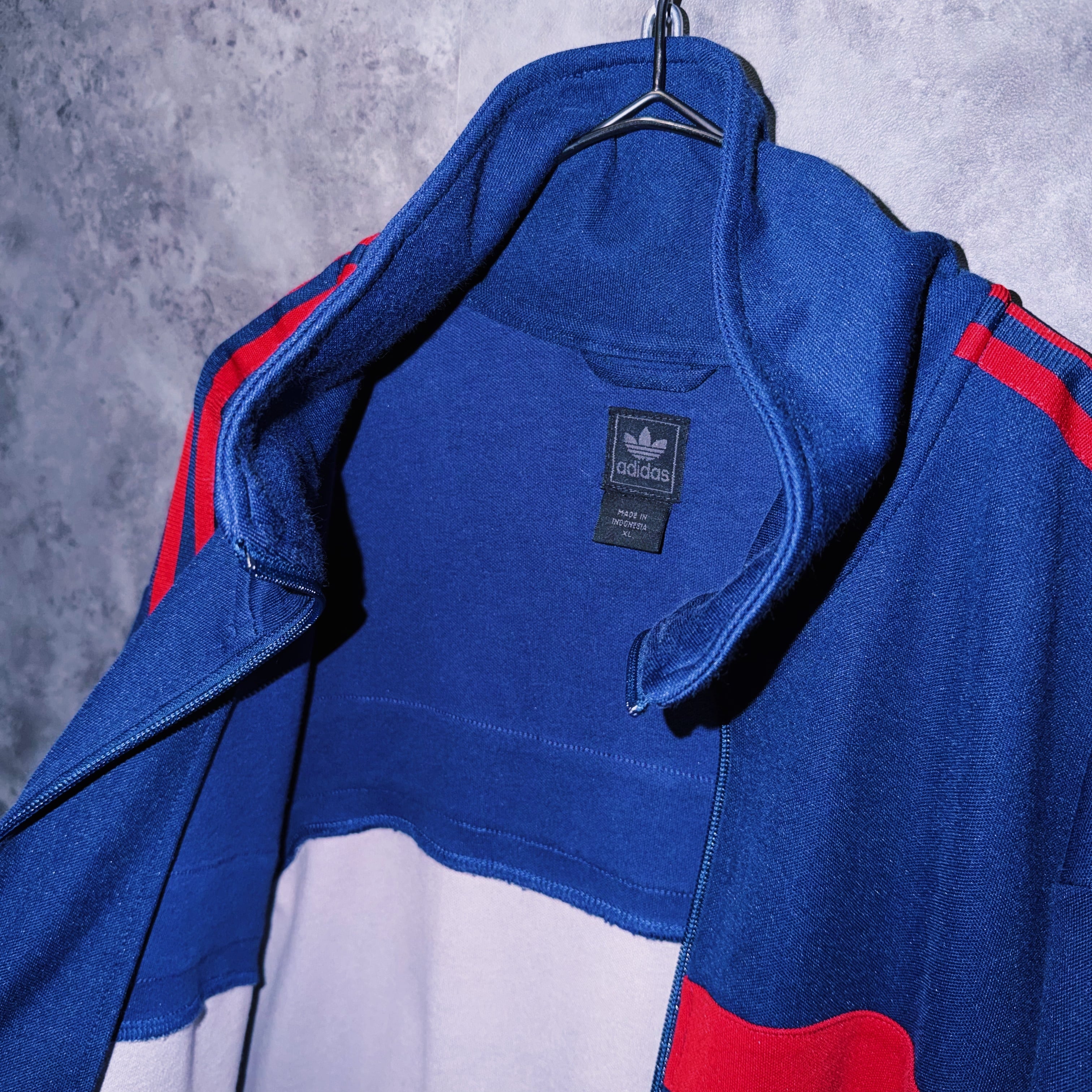 深いネイビーカラーの生地に、クロムレッドカラーでスリーストライプとトレフォイルロゴを施した一枚。