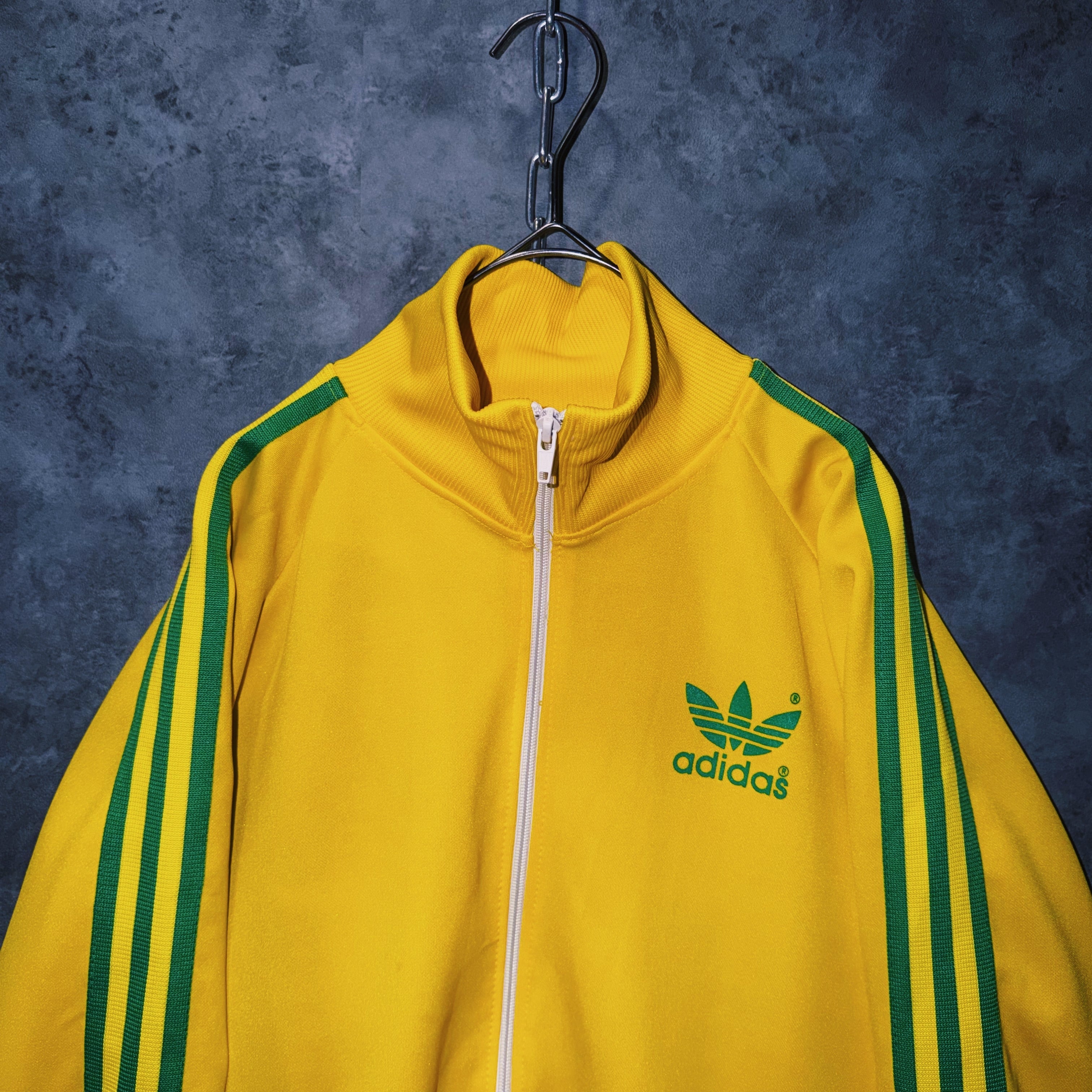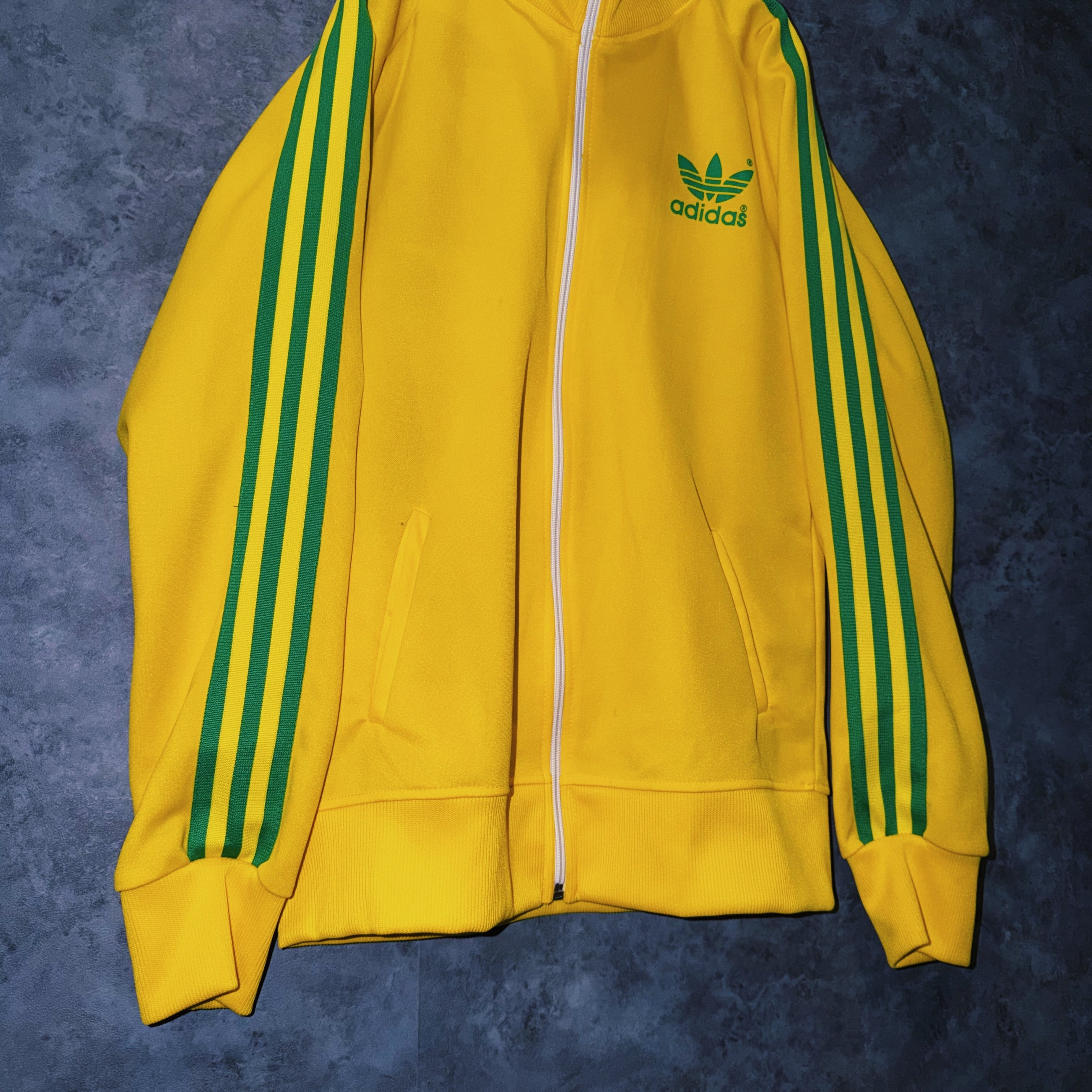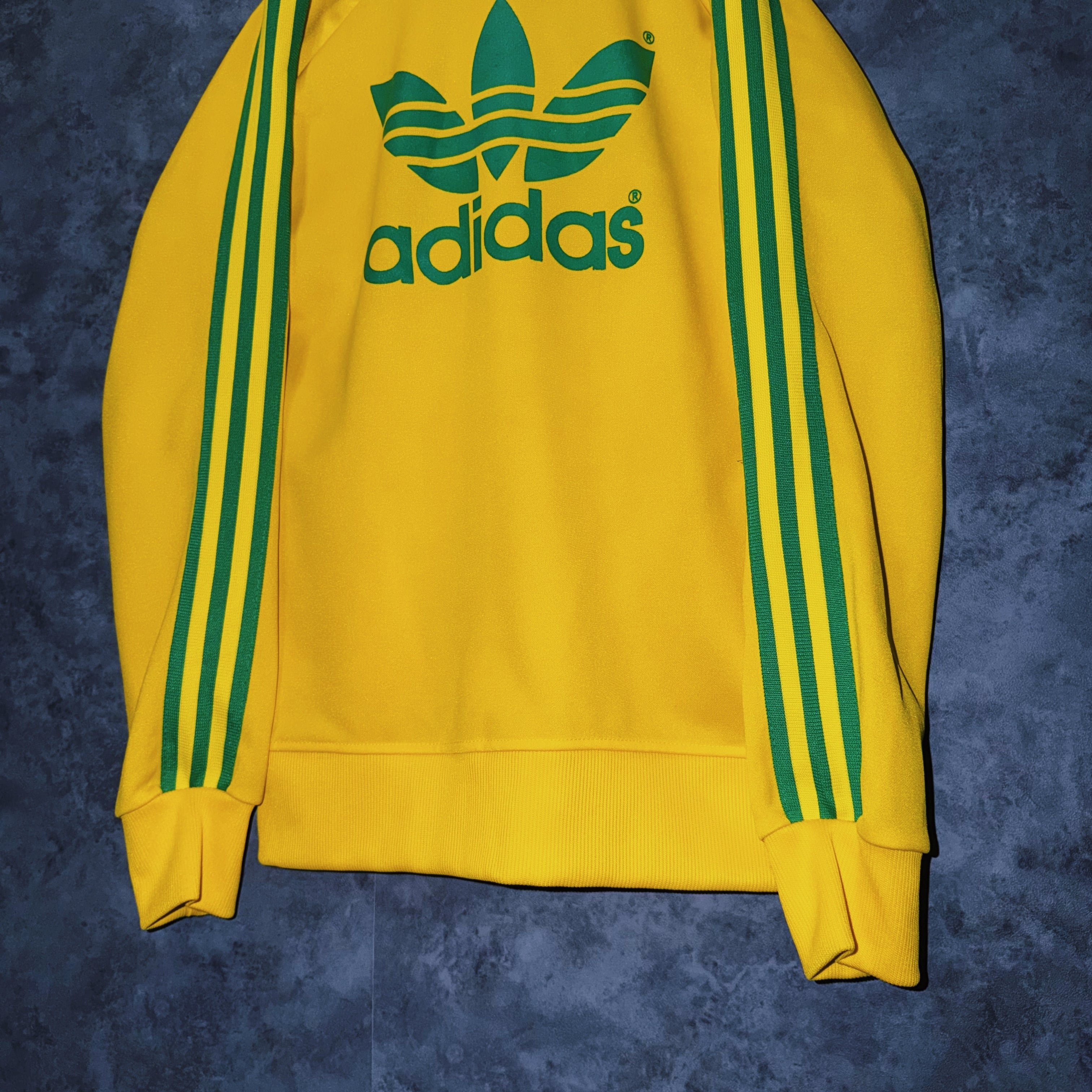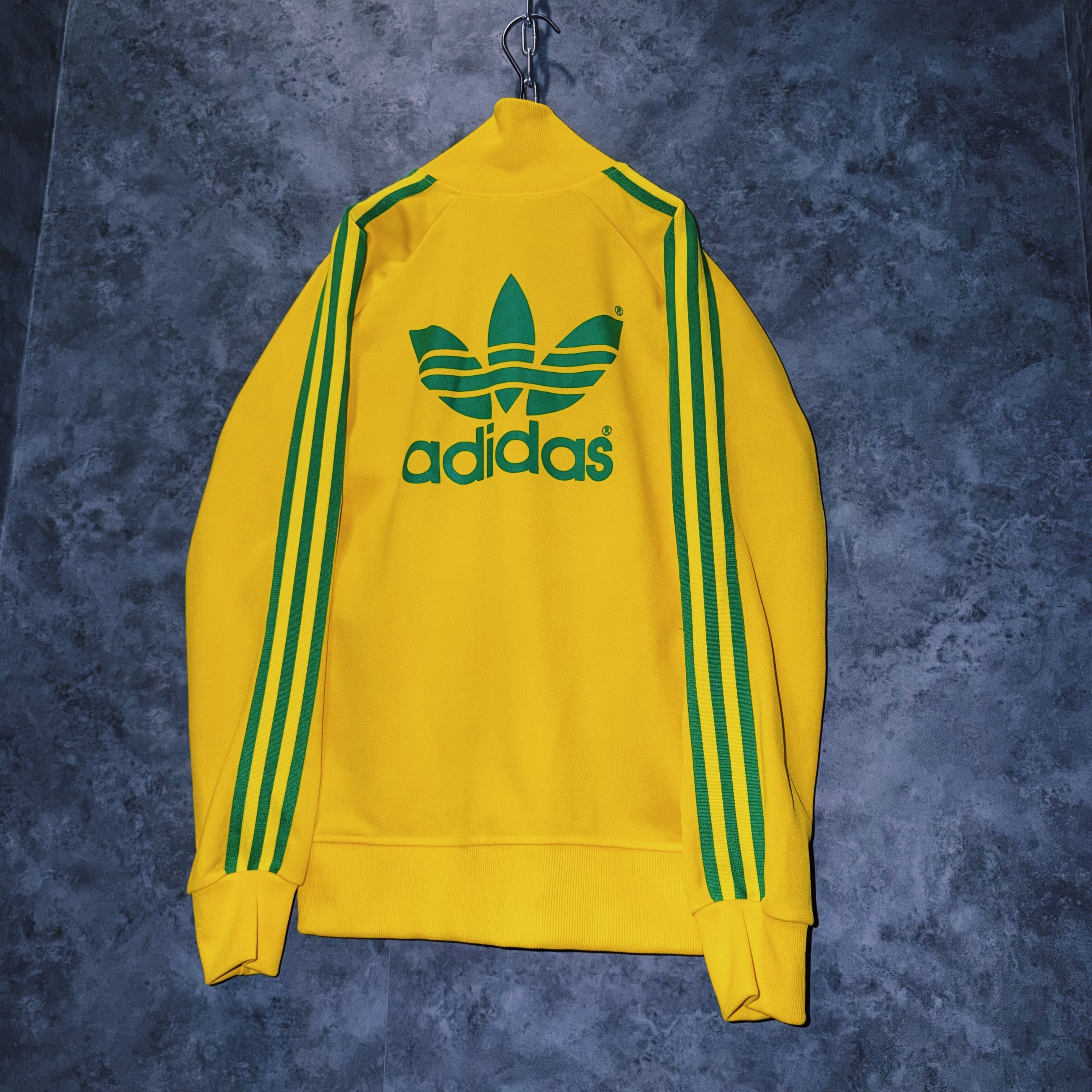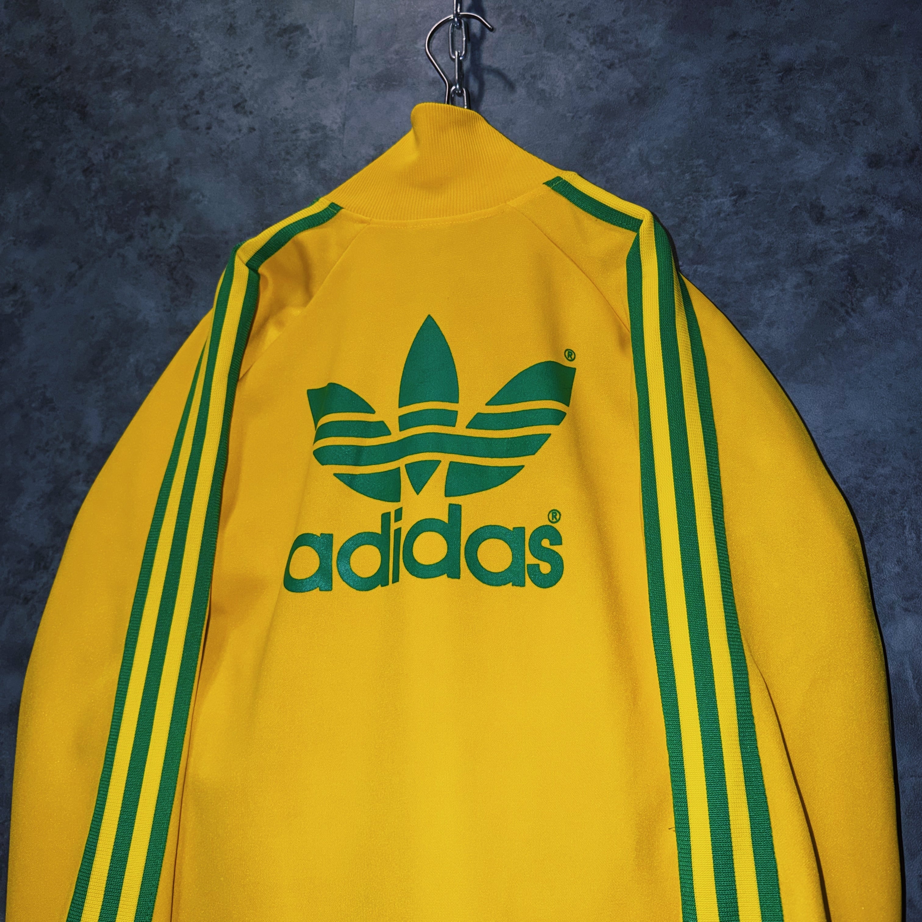 鮮やかなイエローカラーの生地に、グリーンカラーでスリーストライプとトレフォイルロゴを施した一枚。