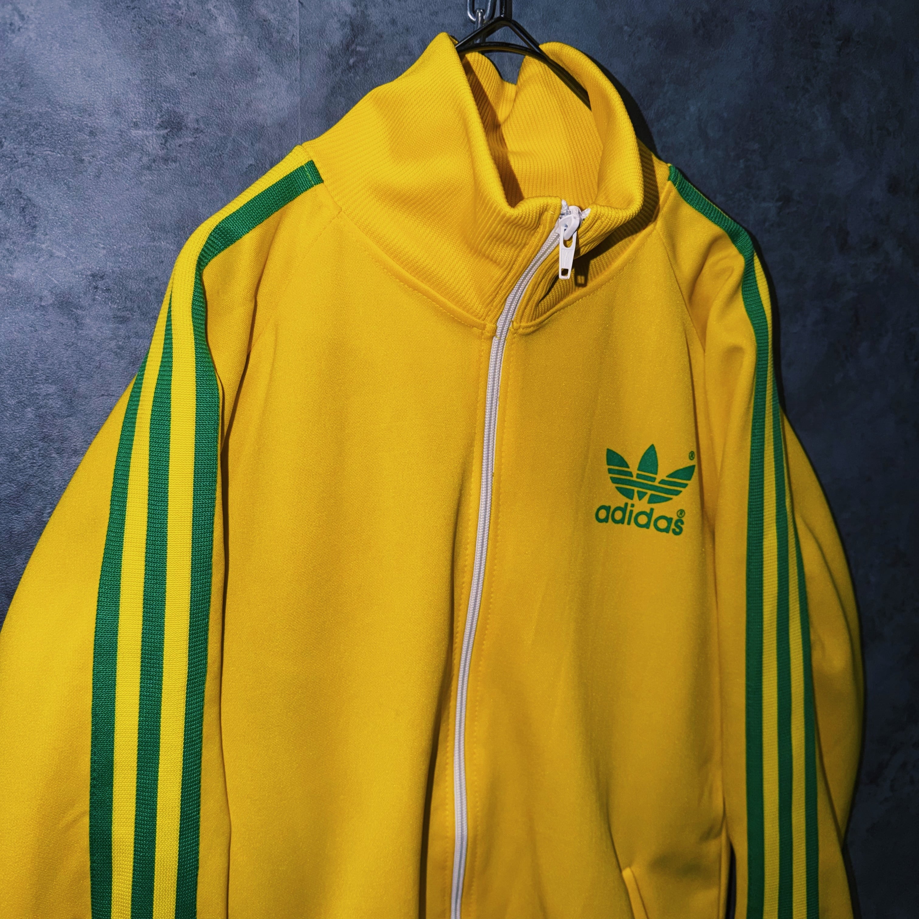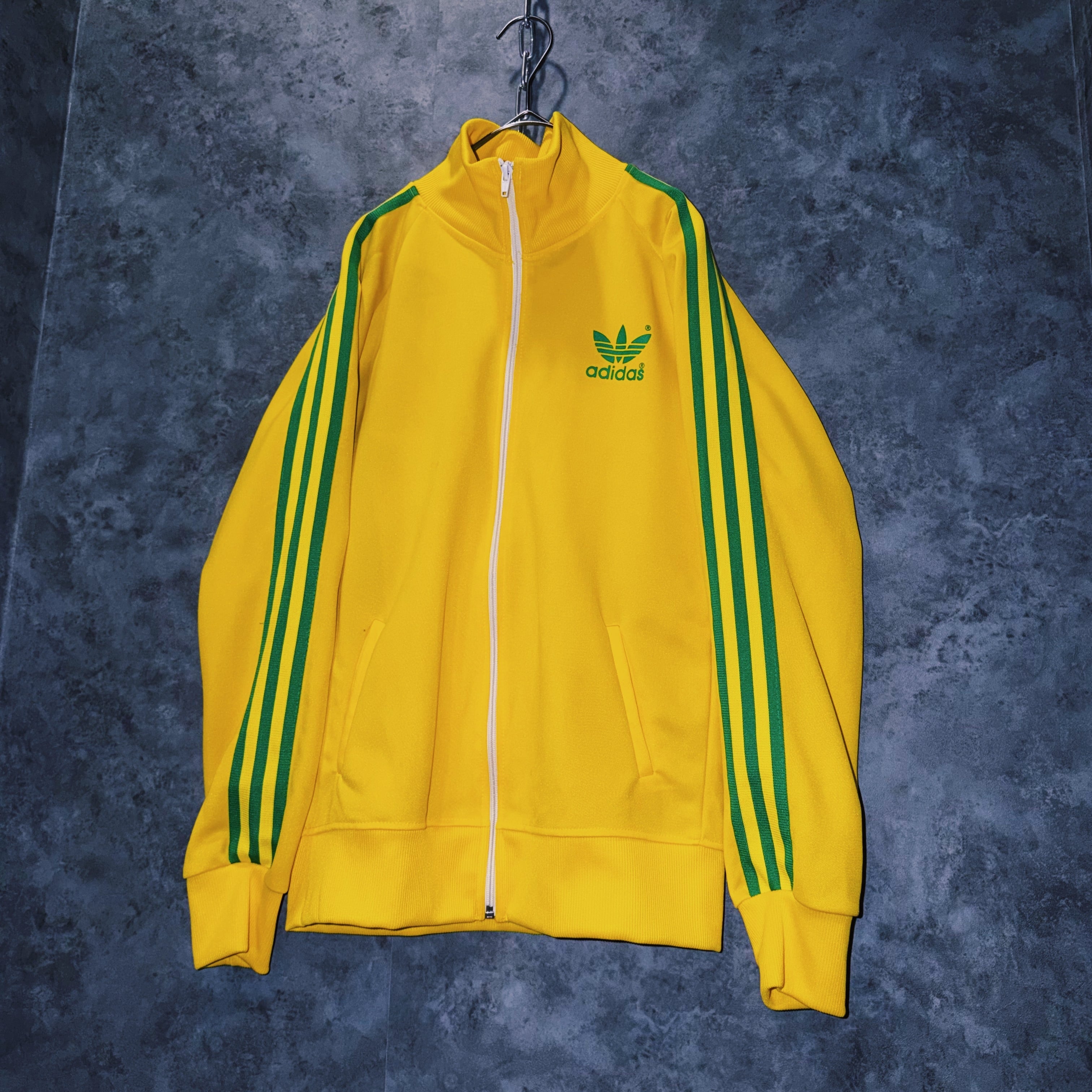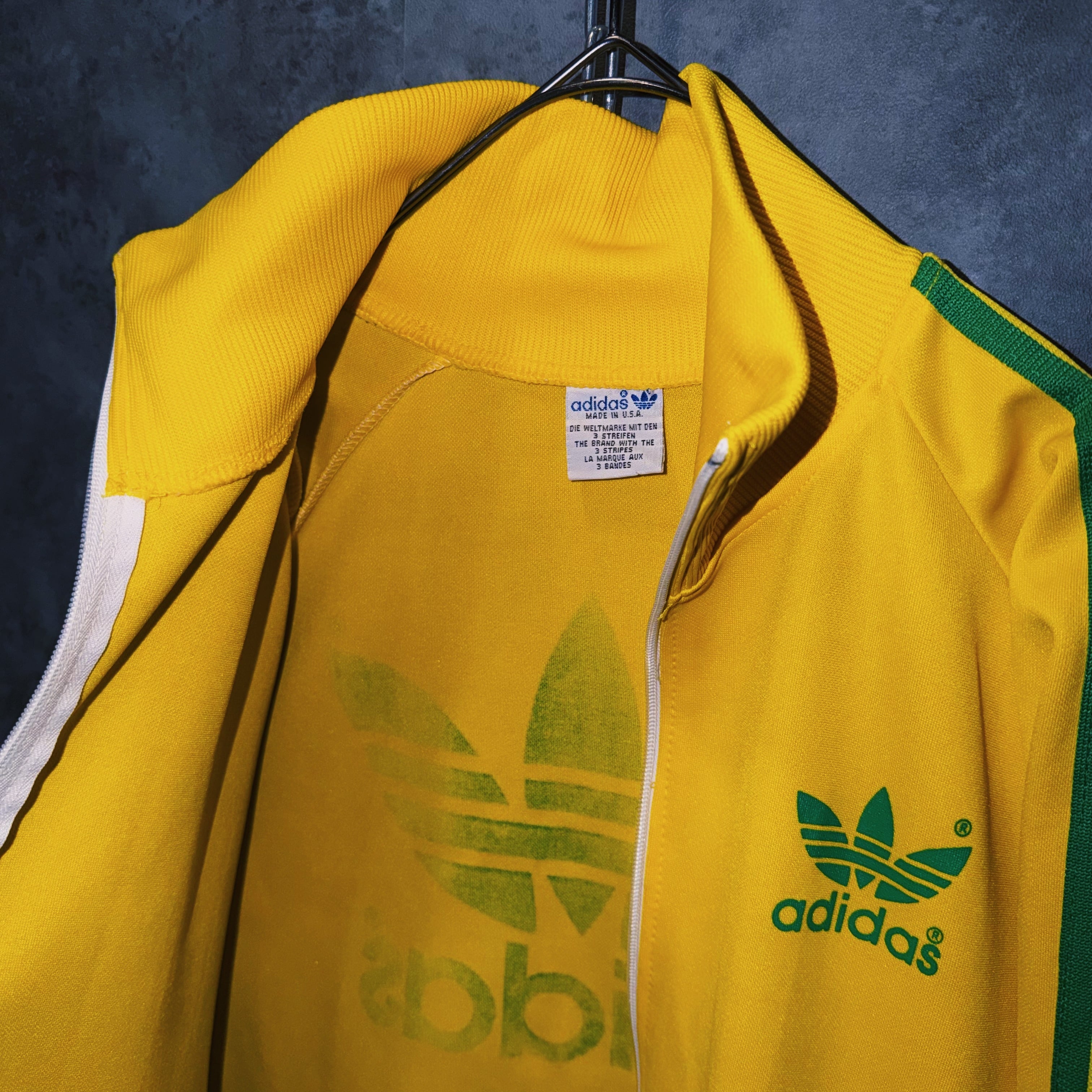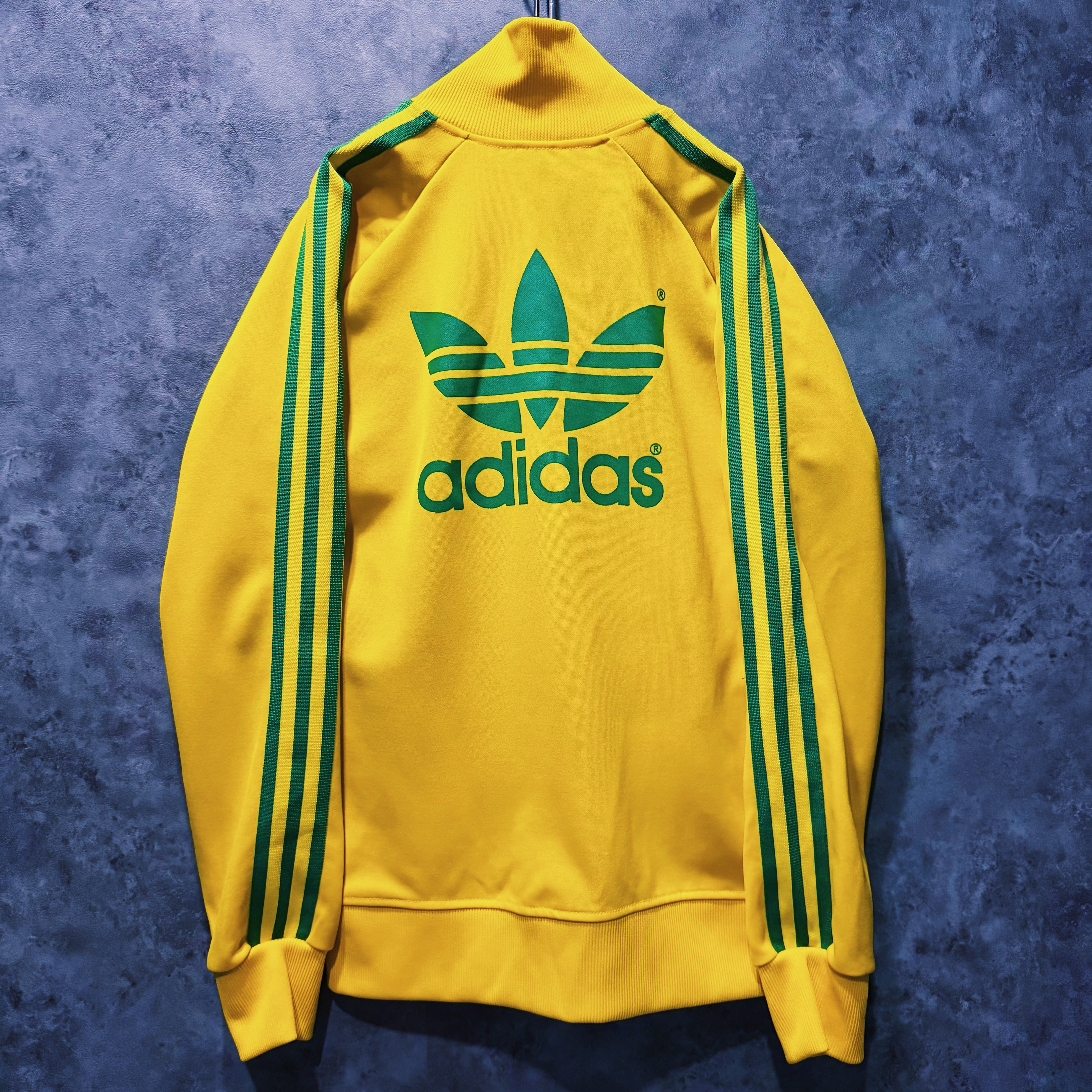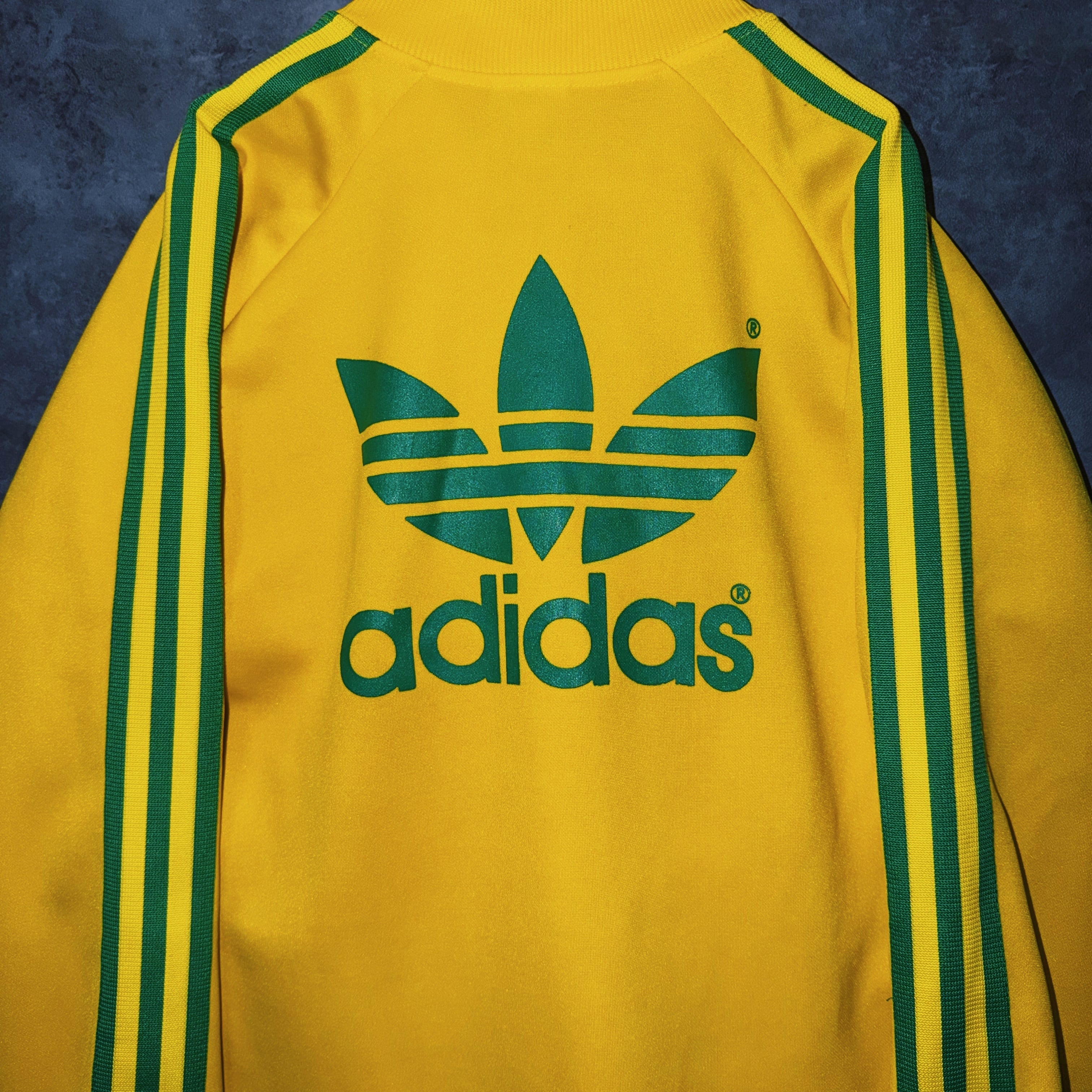 鮮やかなイエローカラーの生地に、グリーンカラーでスリーストライプとトレフォイルロゴを施した一枚。