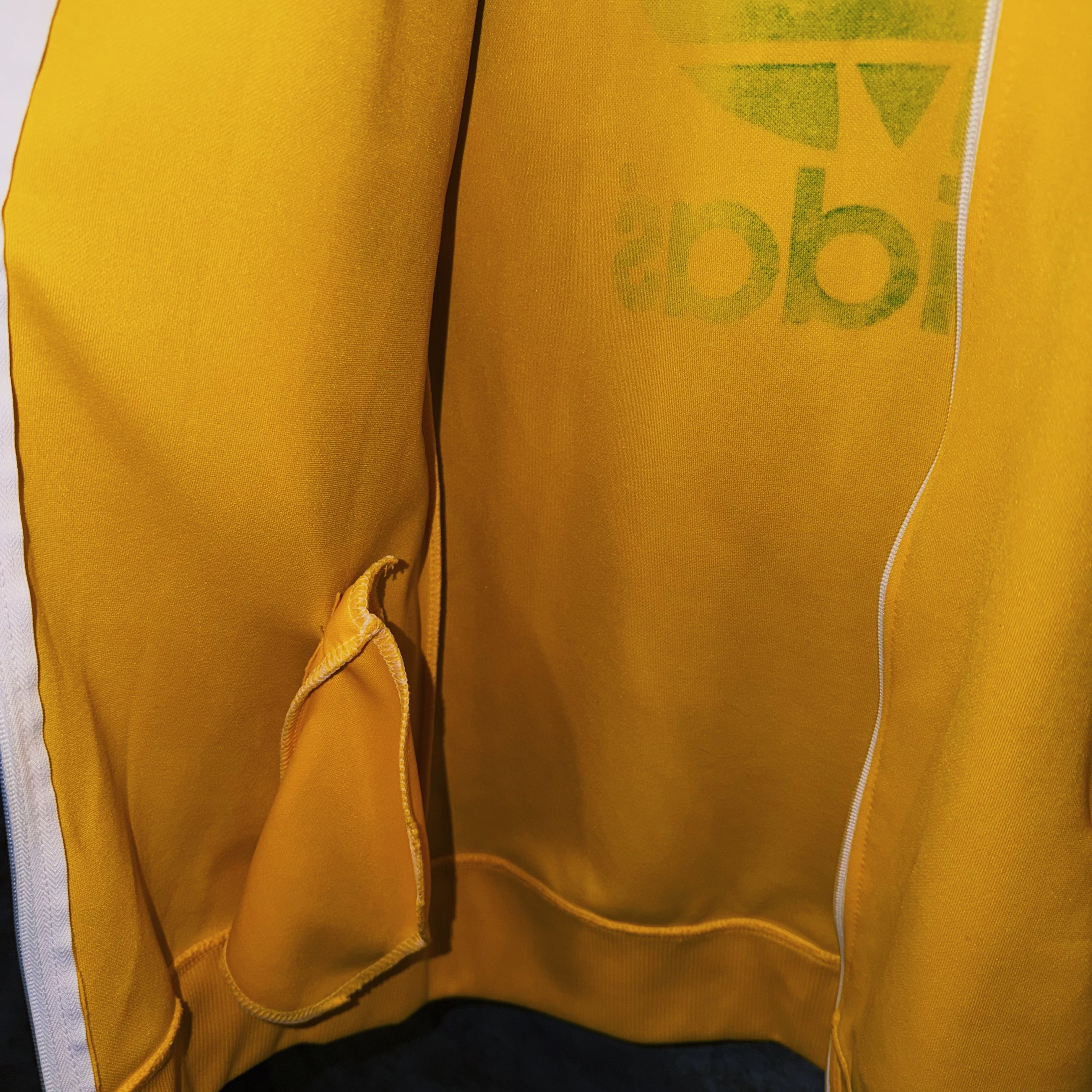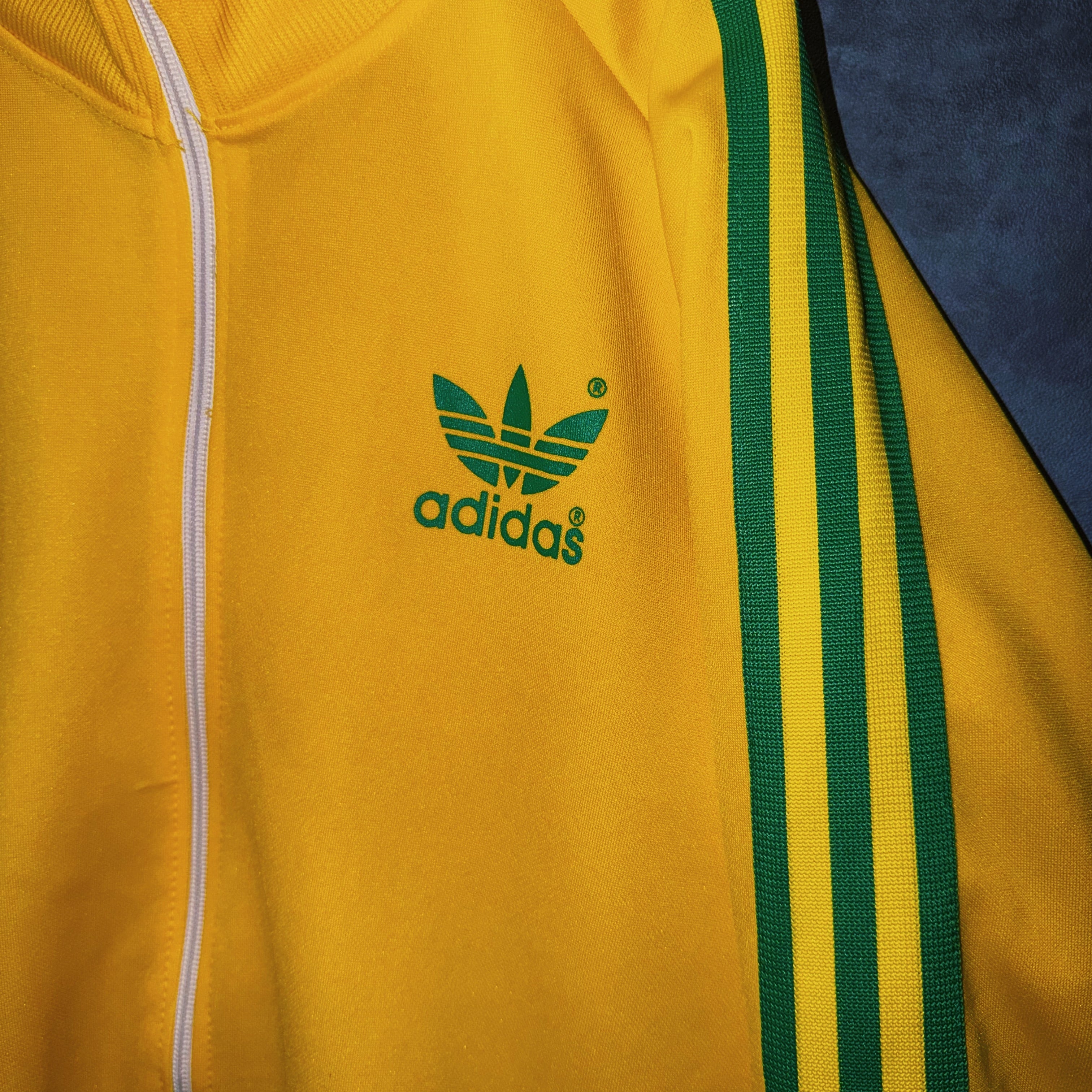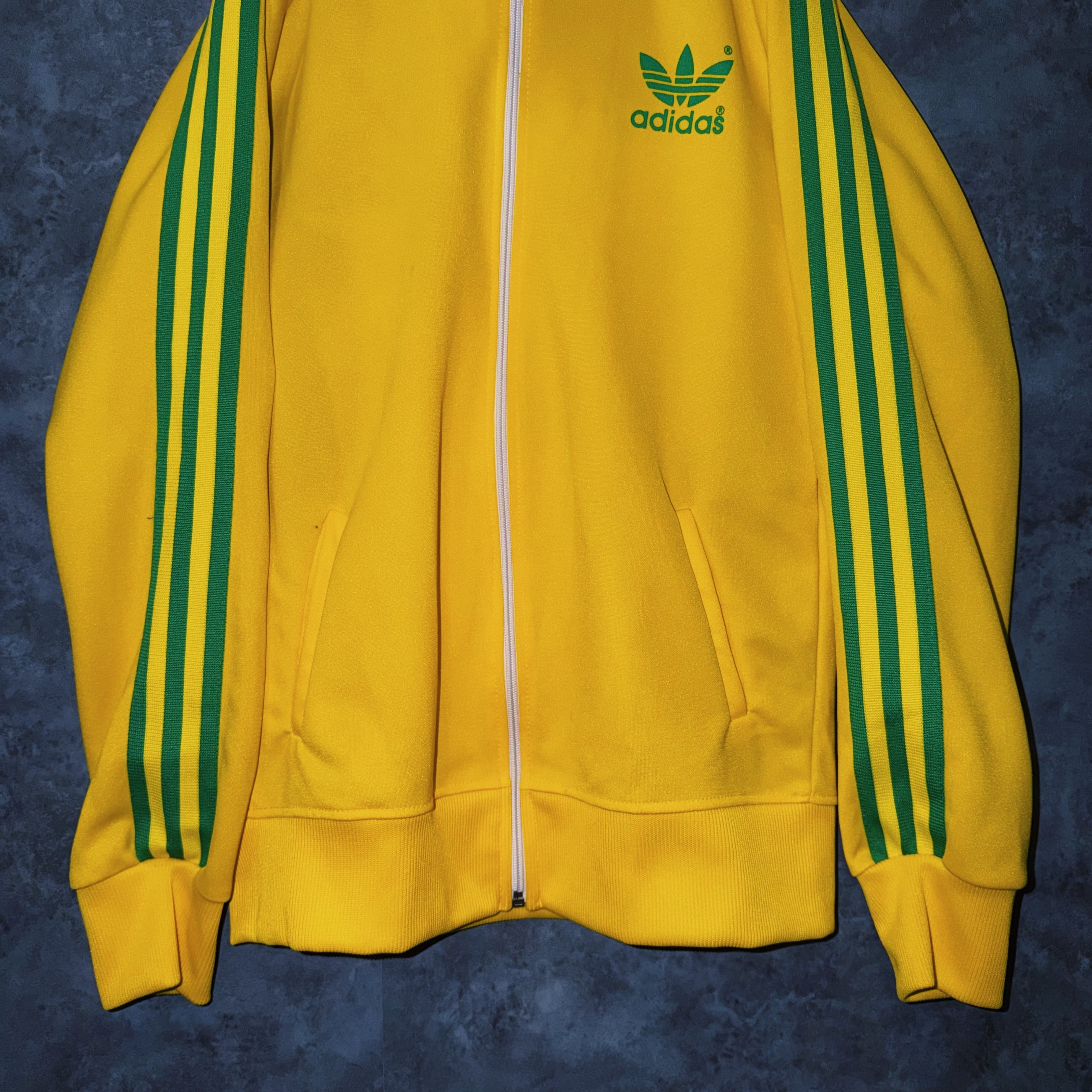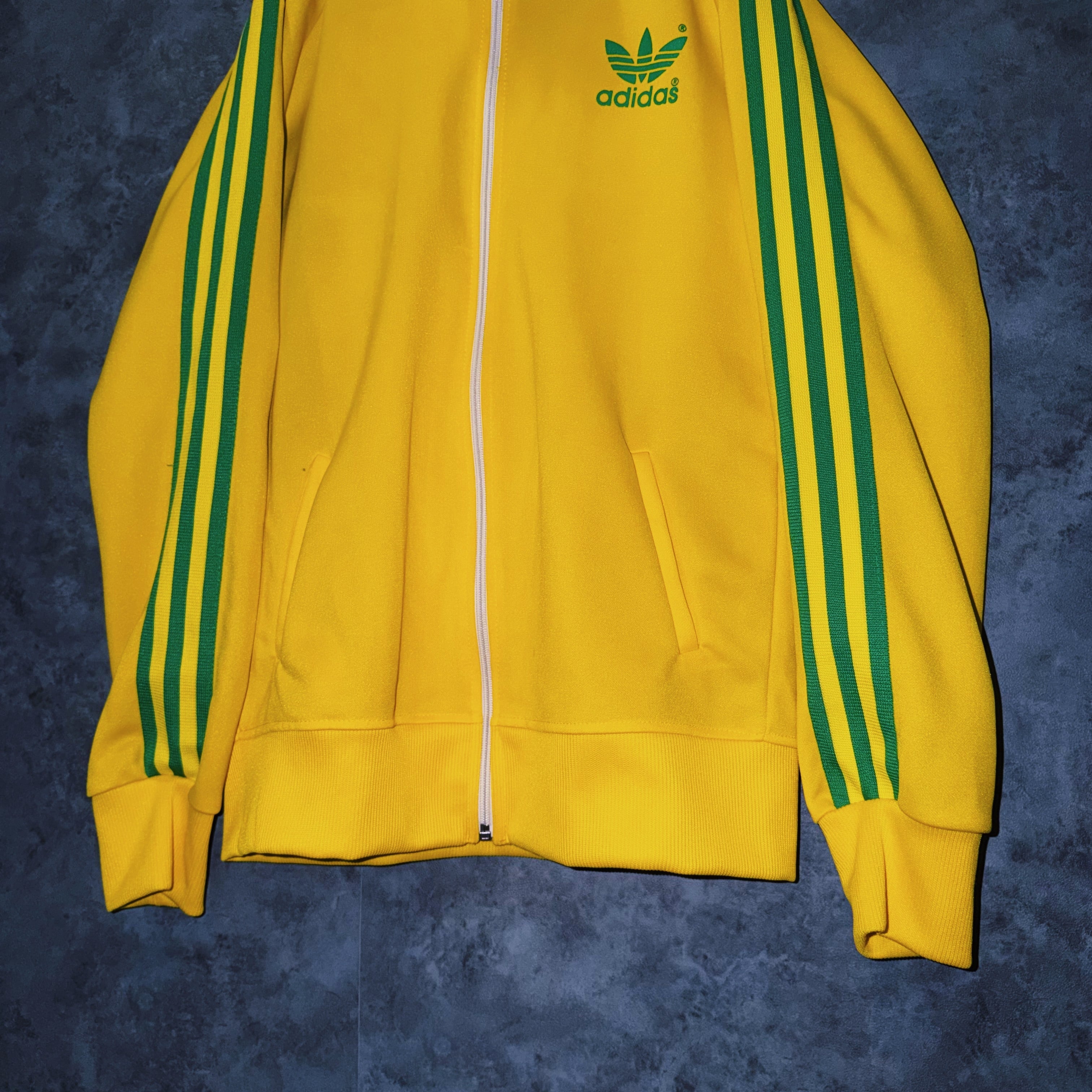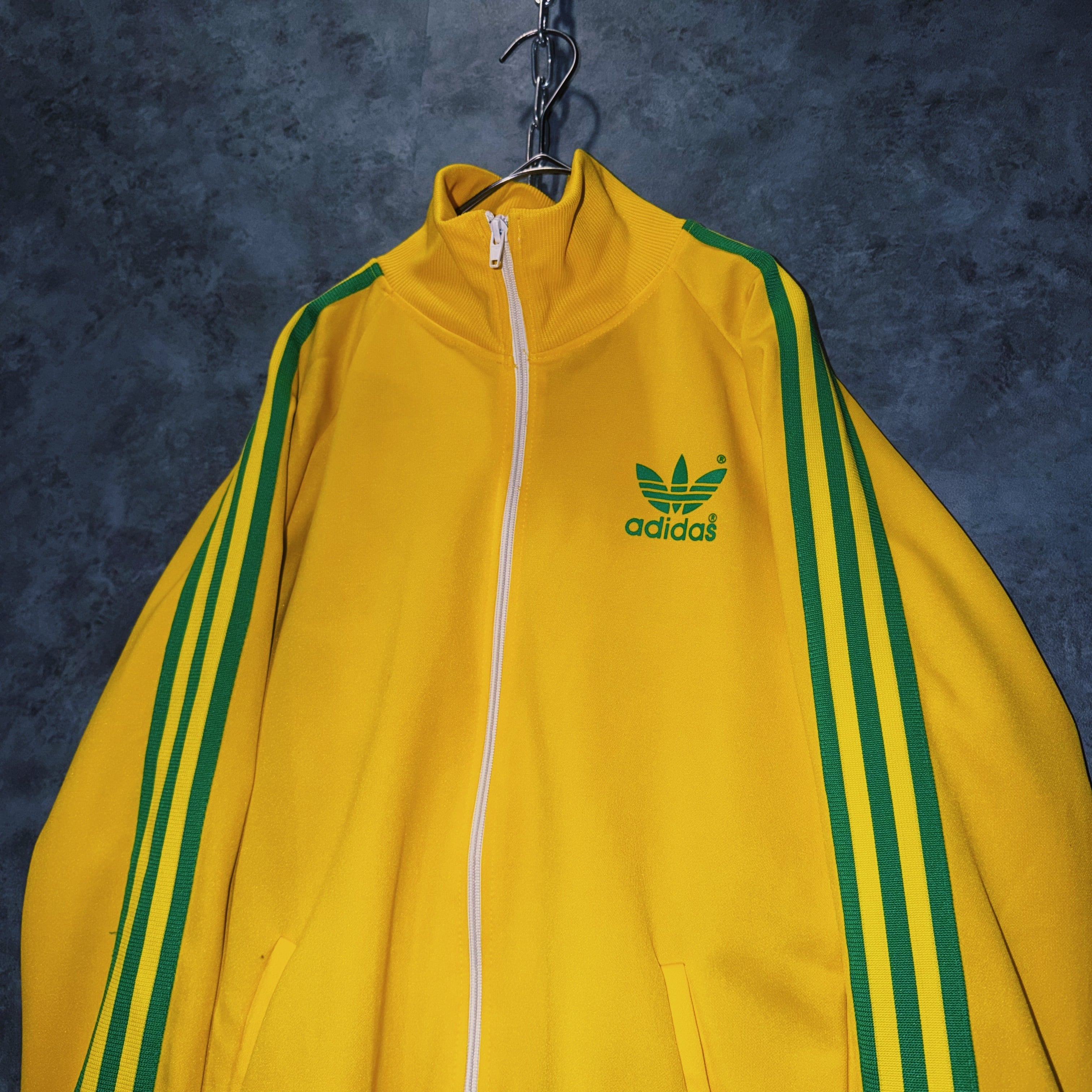 鮮やかなイエローカラーの生地に、グリーンカラーでスリーストライプとトレフォイルロゴを施した一枚。