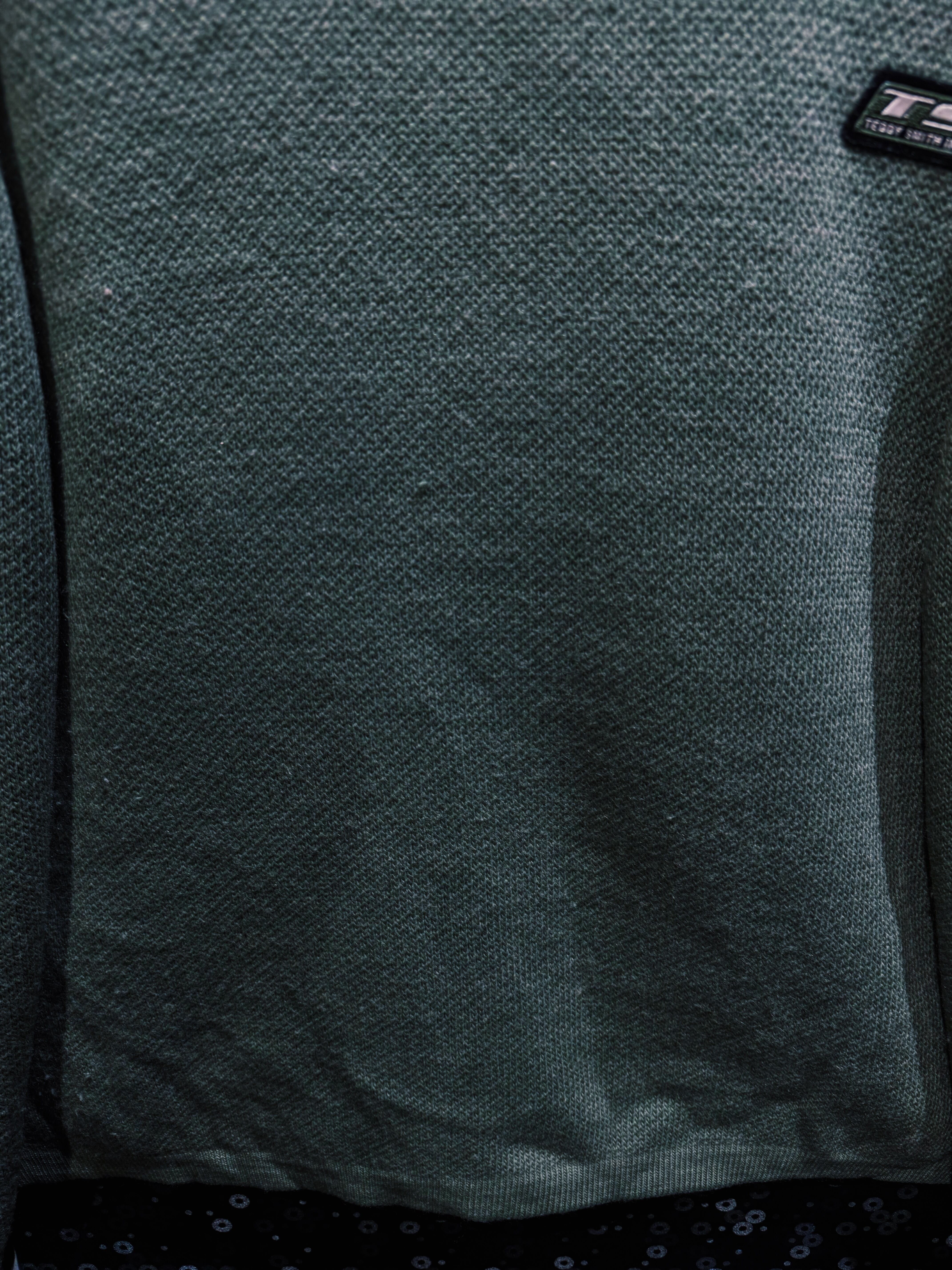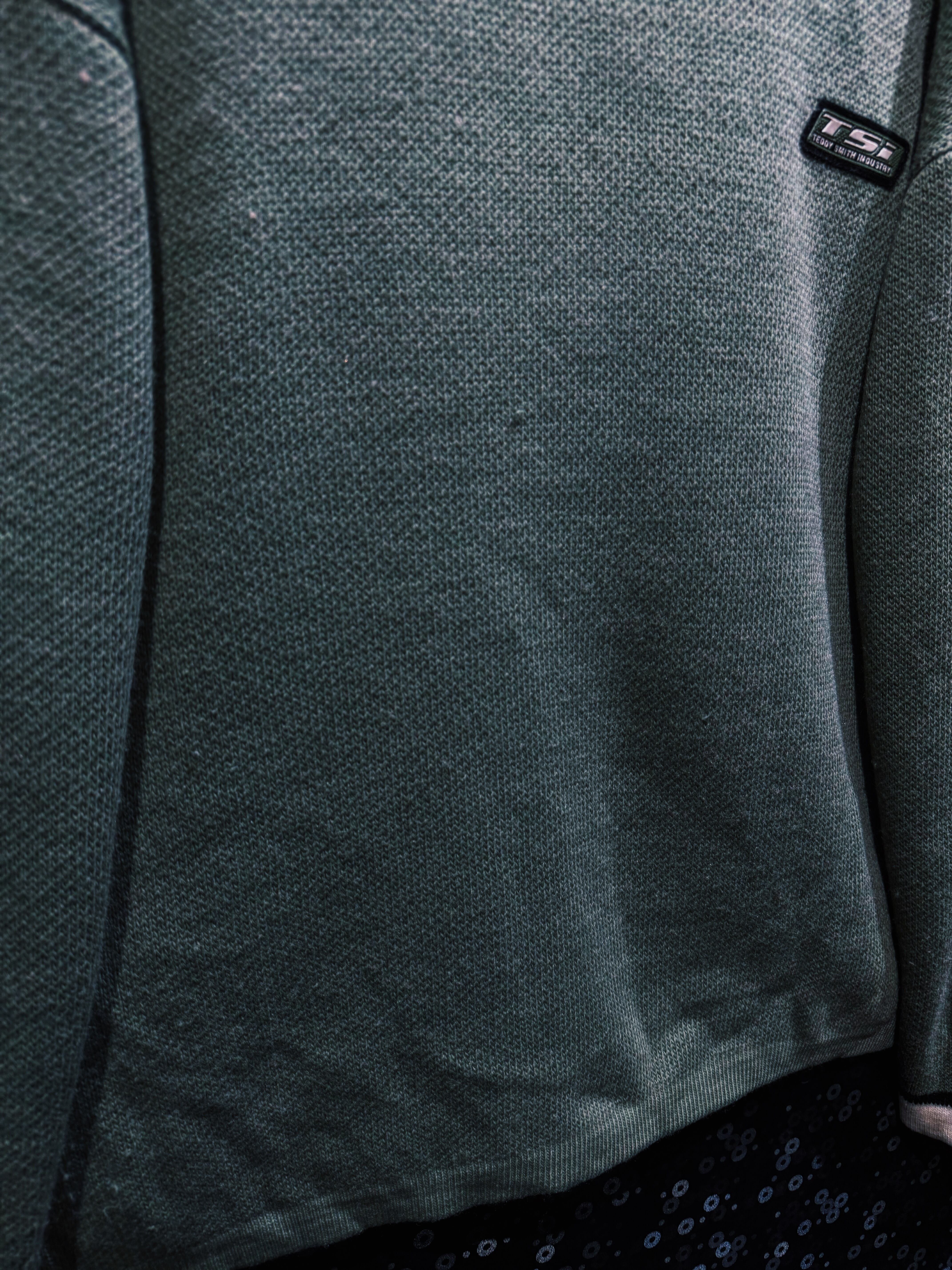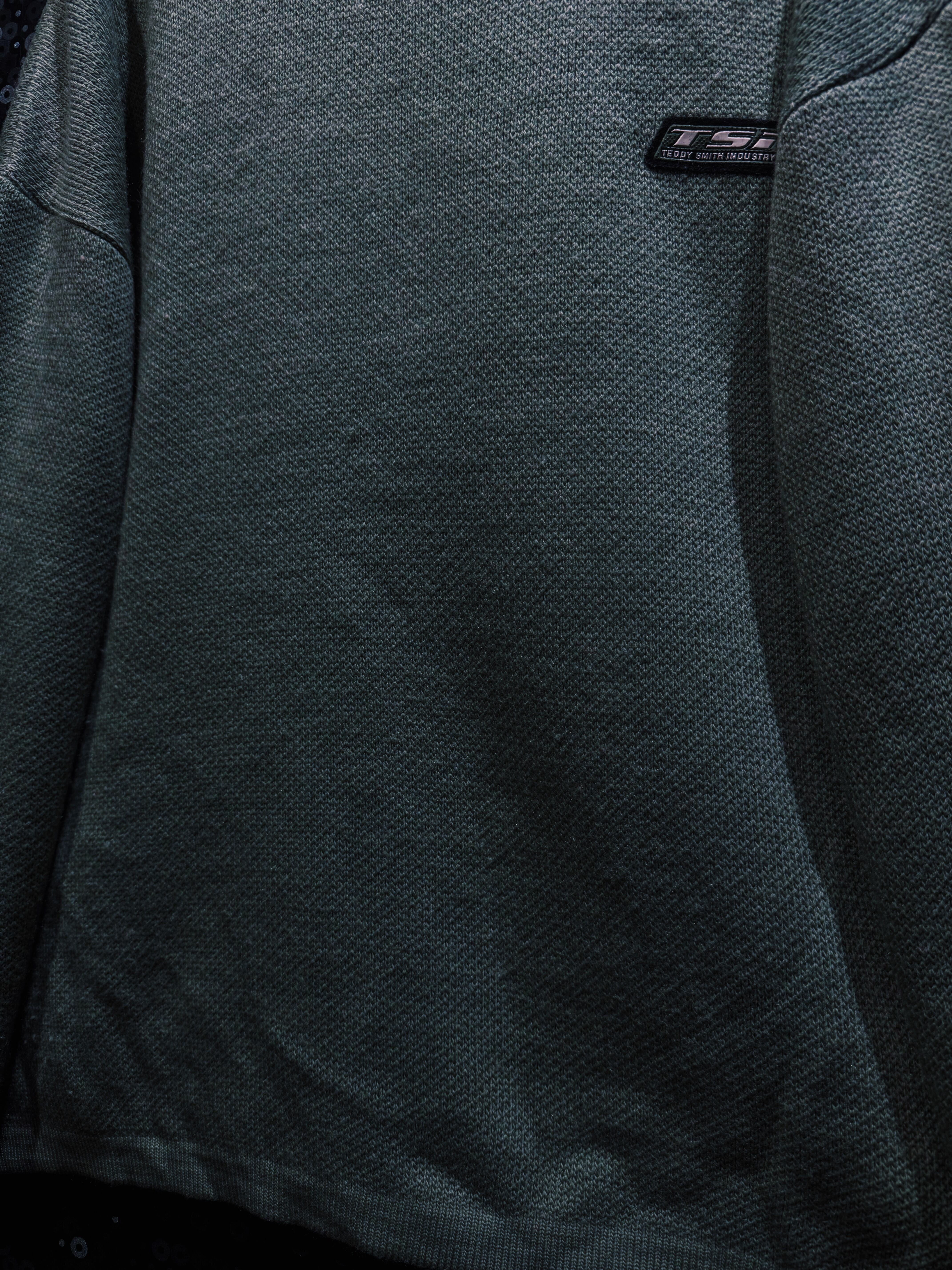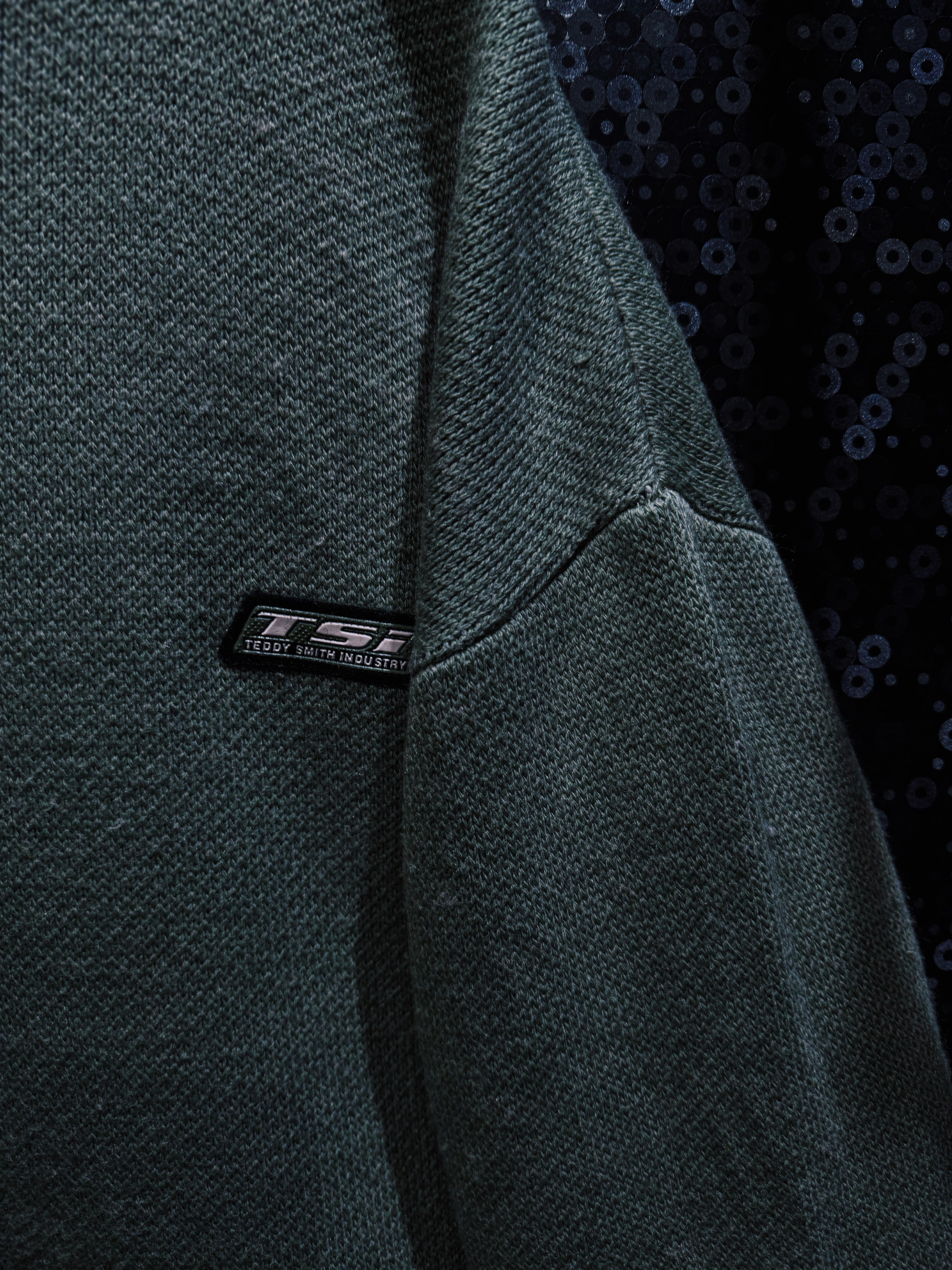 落ち着いたオリーブグリーンのボディに、無駄を削ぎ落としたミニマルな構成が光る一着。フロントはほぼ無地ながら、胸元にさりげなく配置された“T.S.I”ロゴが程よいアクセントとして効いている。