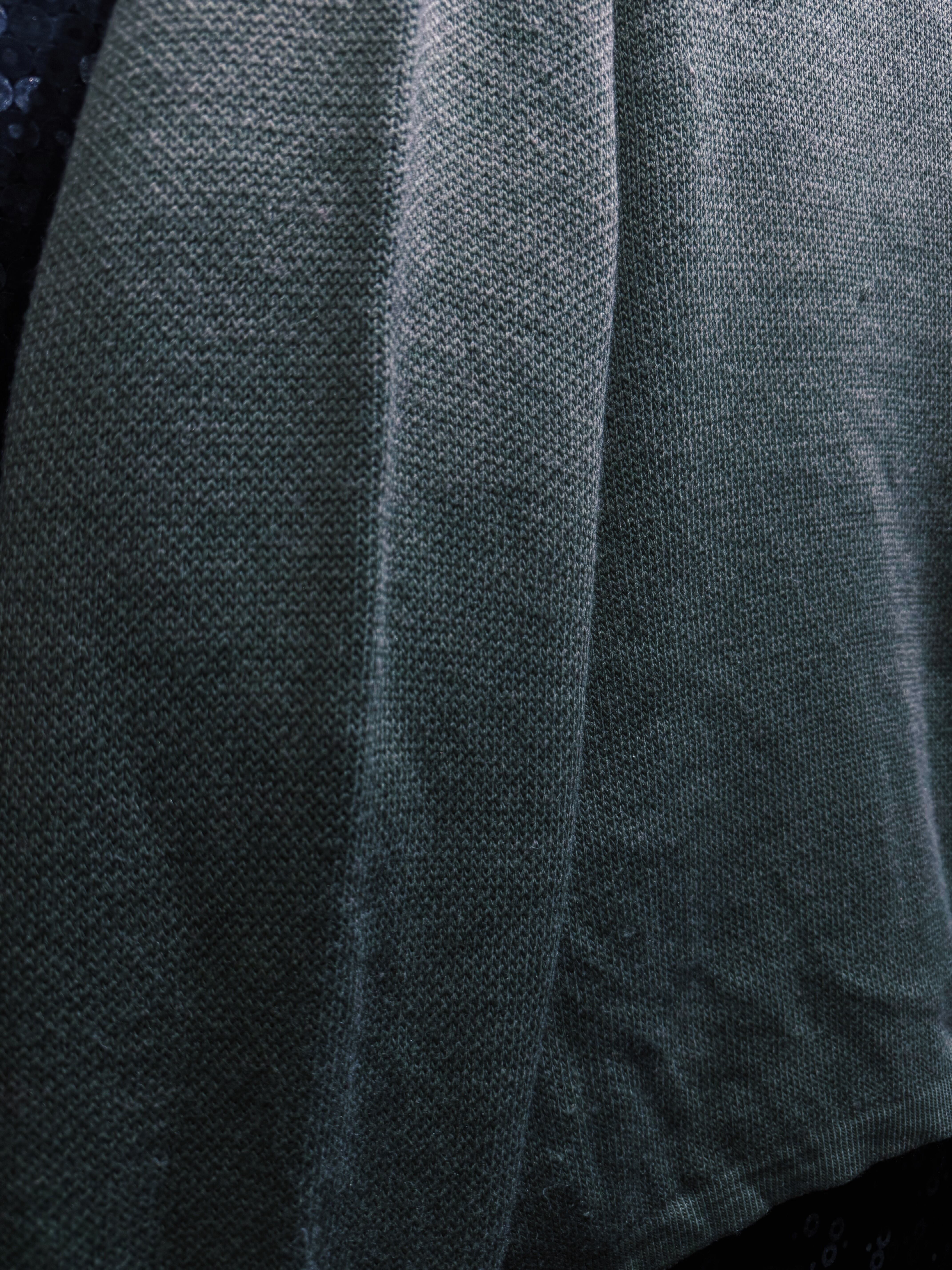 首元はアイボリー×ブラックラインのリブ仕様で、シンプルな中にしっかりとコントラストを持たせたデザイン。ボディは細かく編まれたニットで、柔らかさと軽さを兼ね備えつつ、しっかりとしたシルエットを保つ絶妙なバランスに仕上がっている。