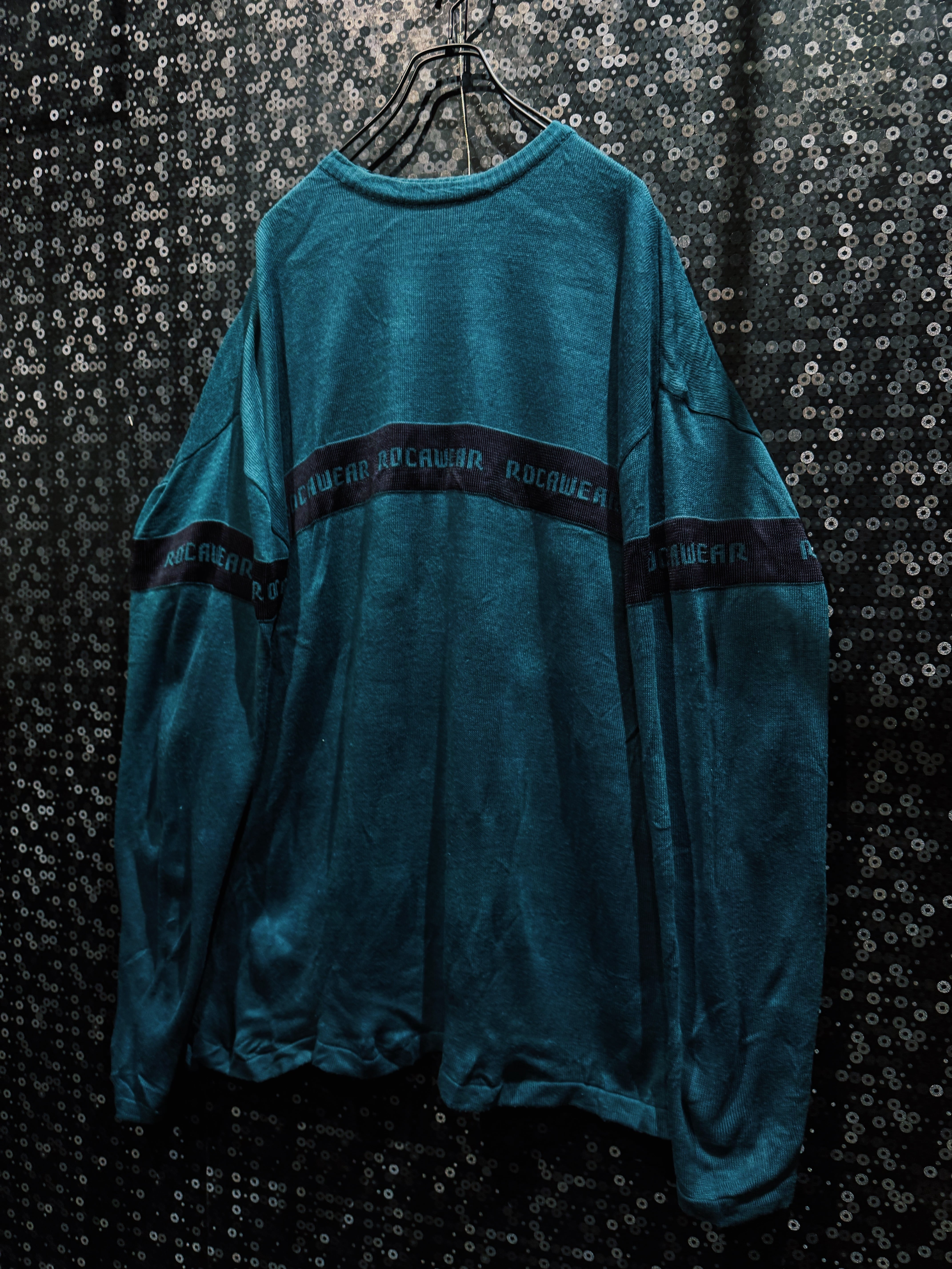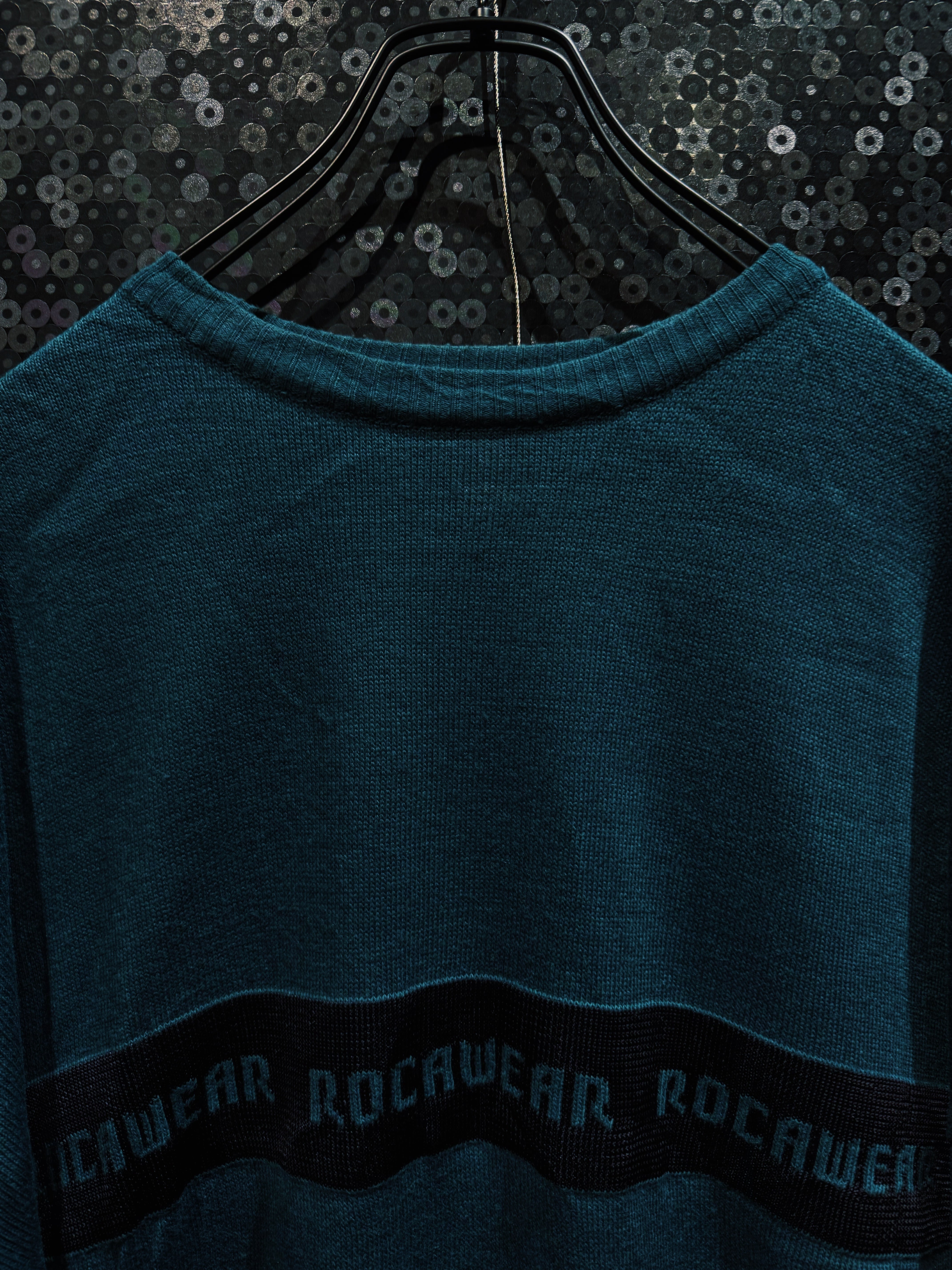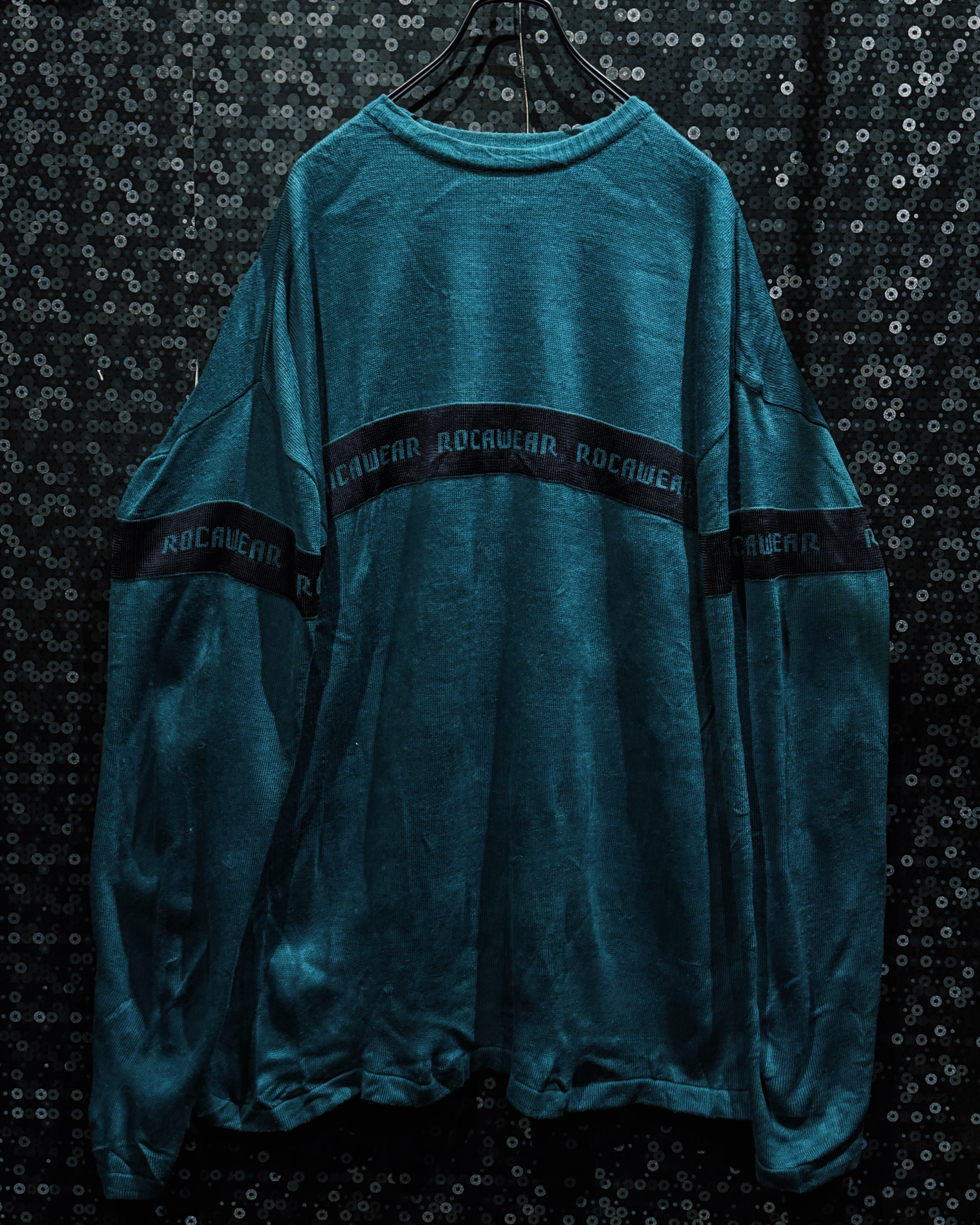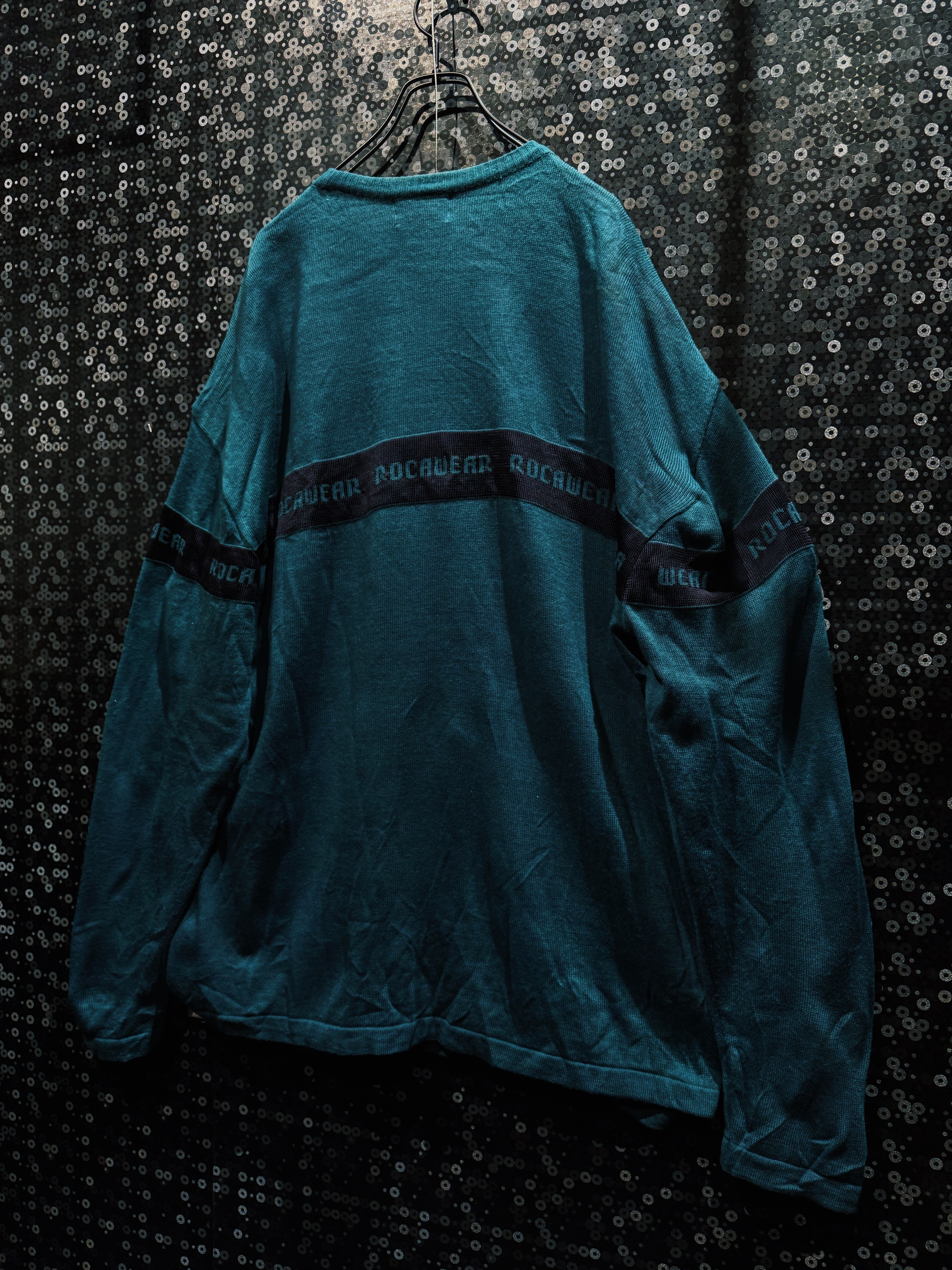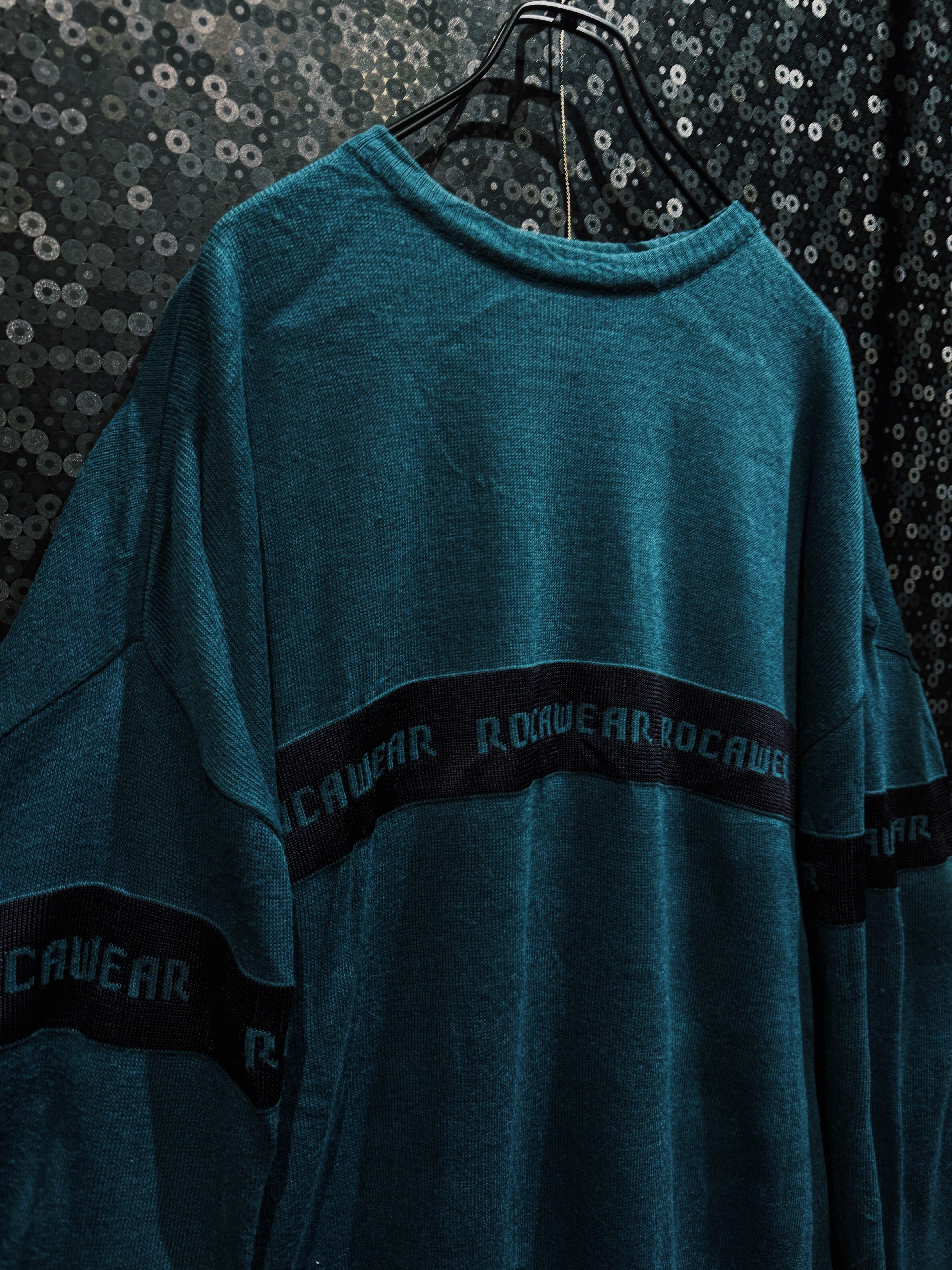 深みのあるグリーンボディに、横一線で走る“ROCAWEAR”ロゴラインが印象的な一着。フロントから袖までぐるりと一周するこのラインが、シンプルなニットに強烈なストリート感を与えている。