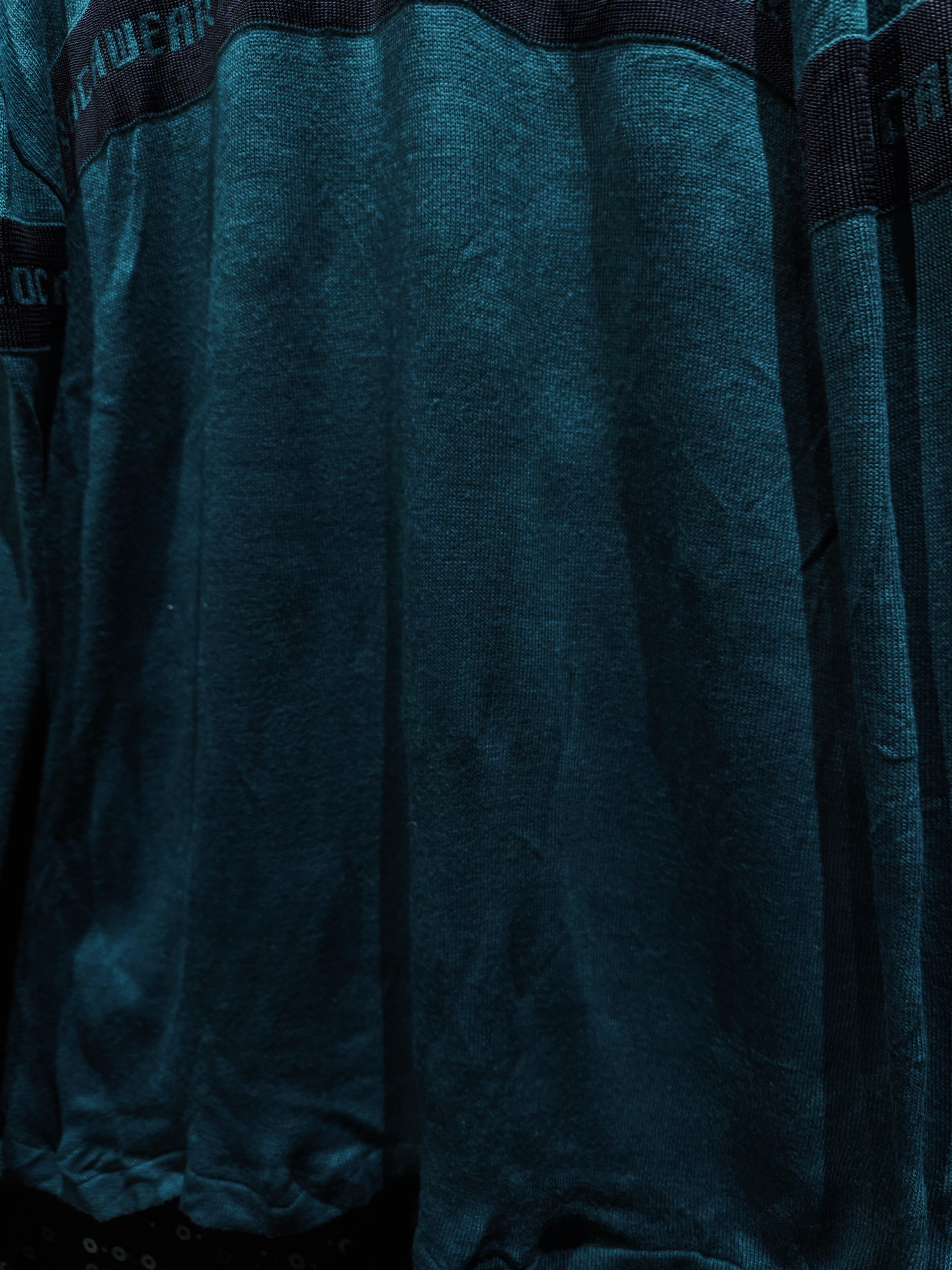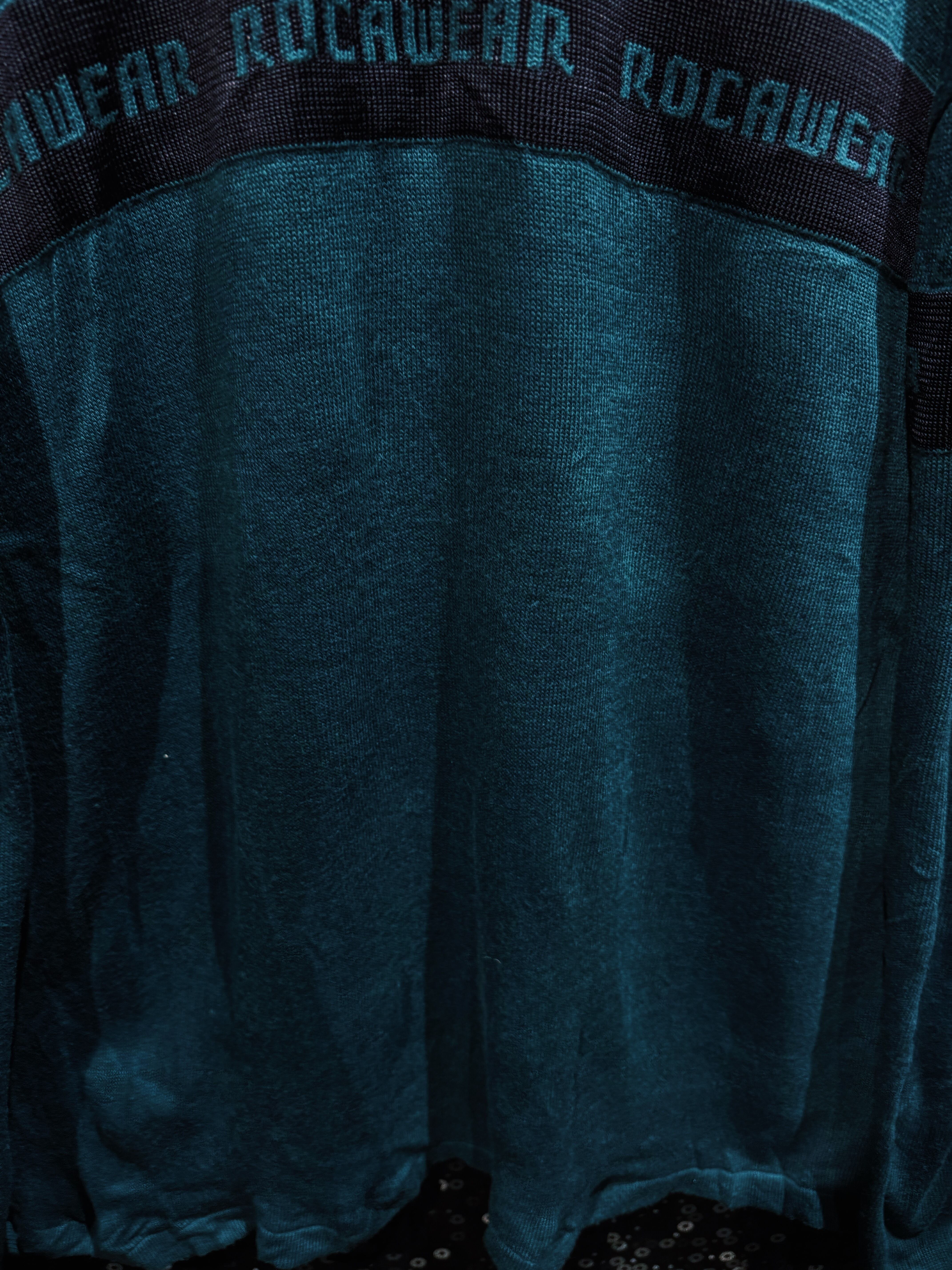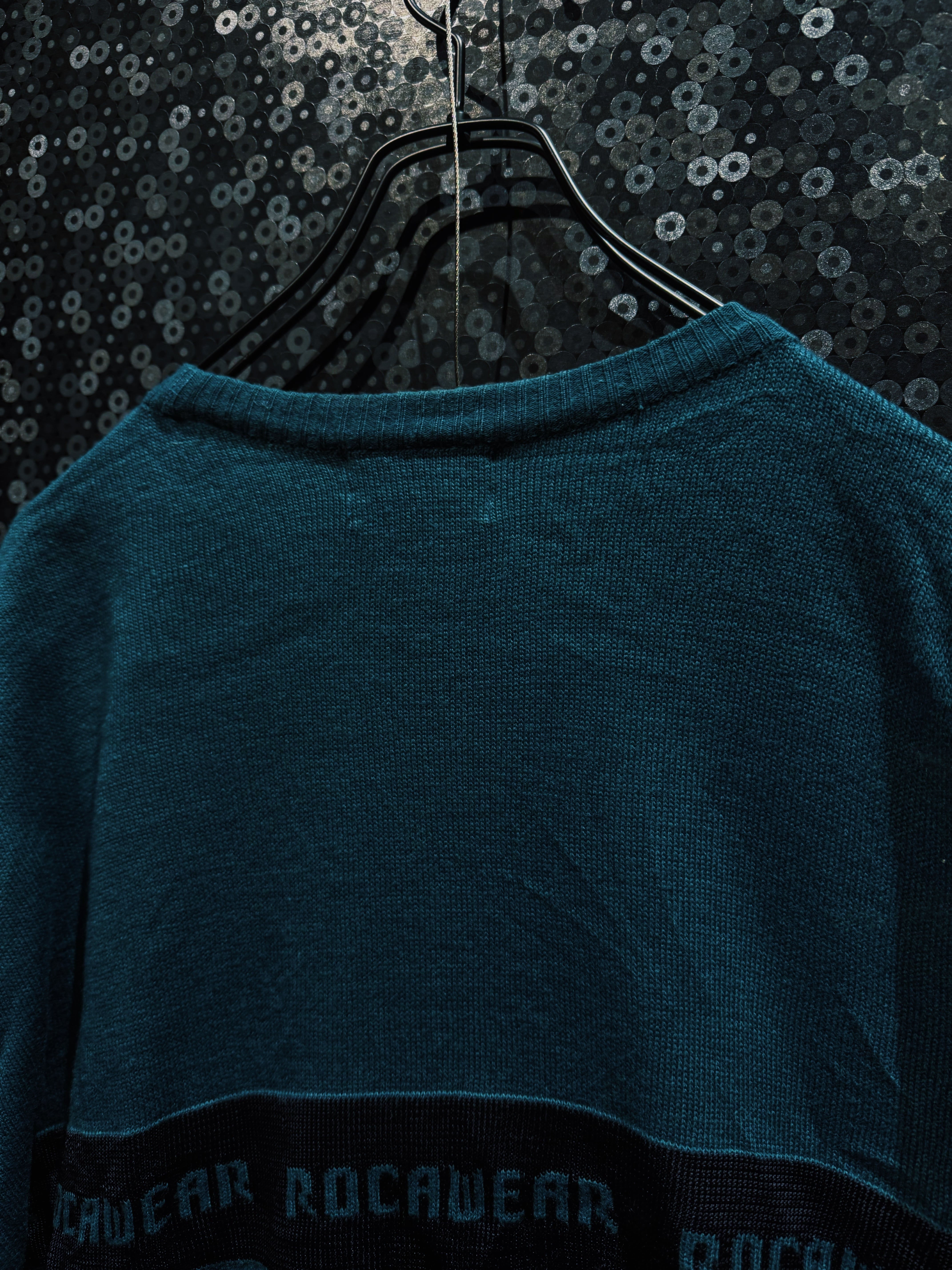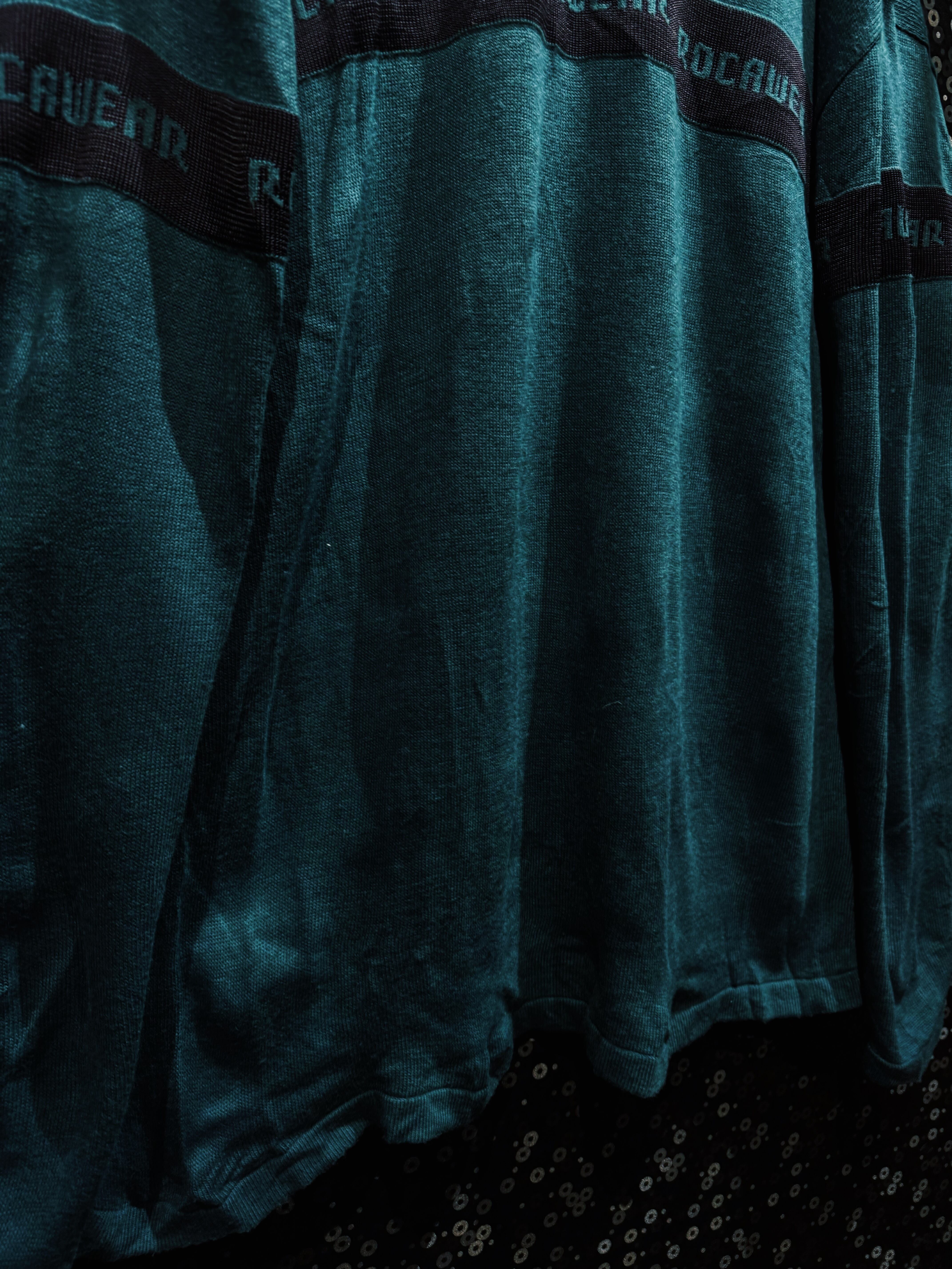 深みのあるグリーンボディに、横一線で走る“ROCAWEAR”ロゴラインが印象的な一着。フロントから袖までぐるりと一周するこのラインが、シンプルなニットに強烈なストリート感を与えている。
