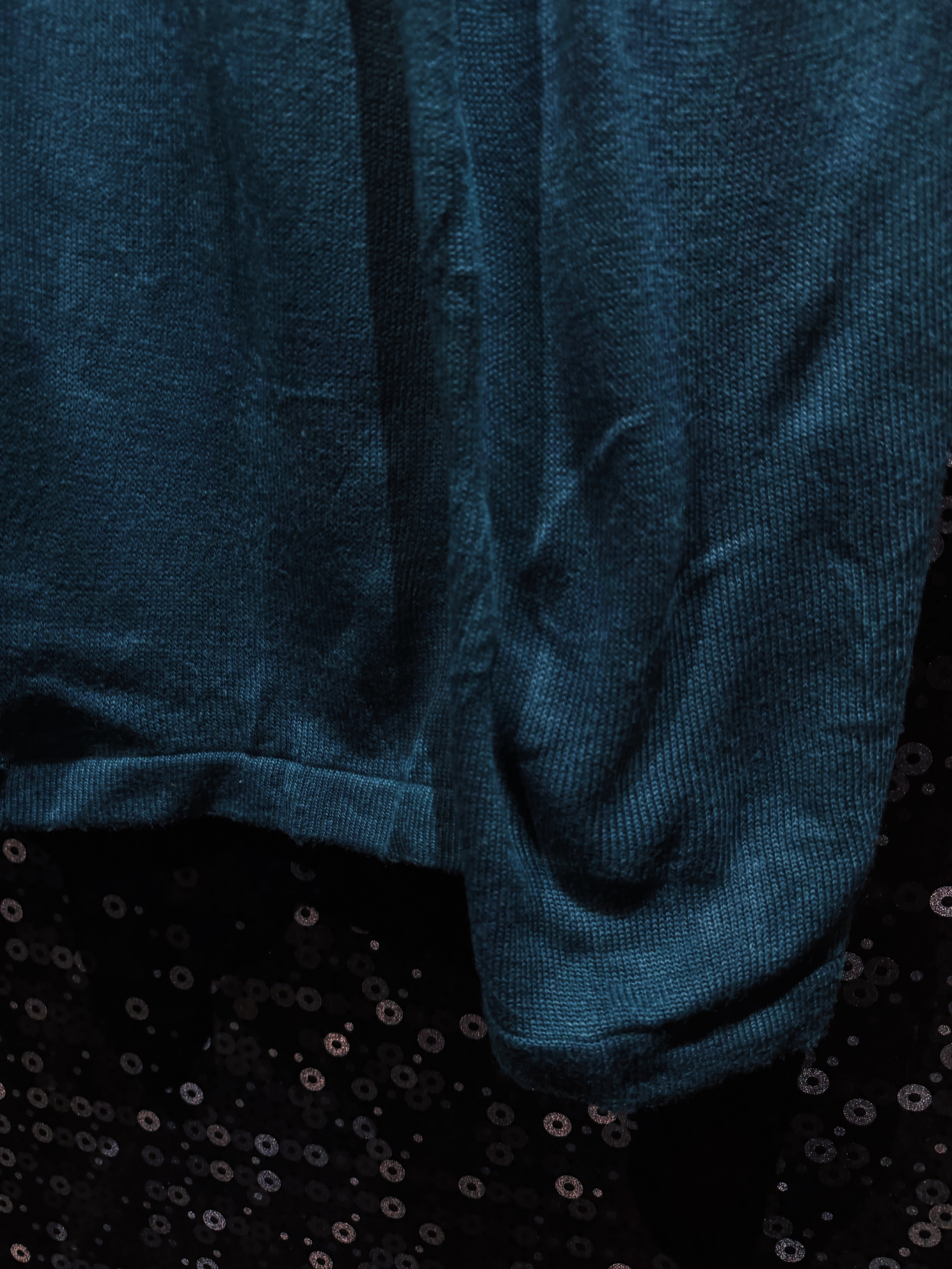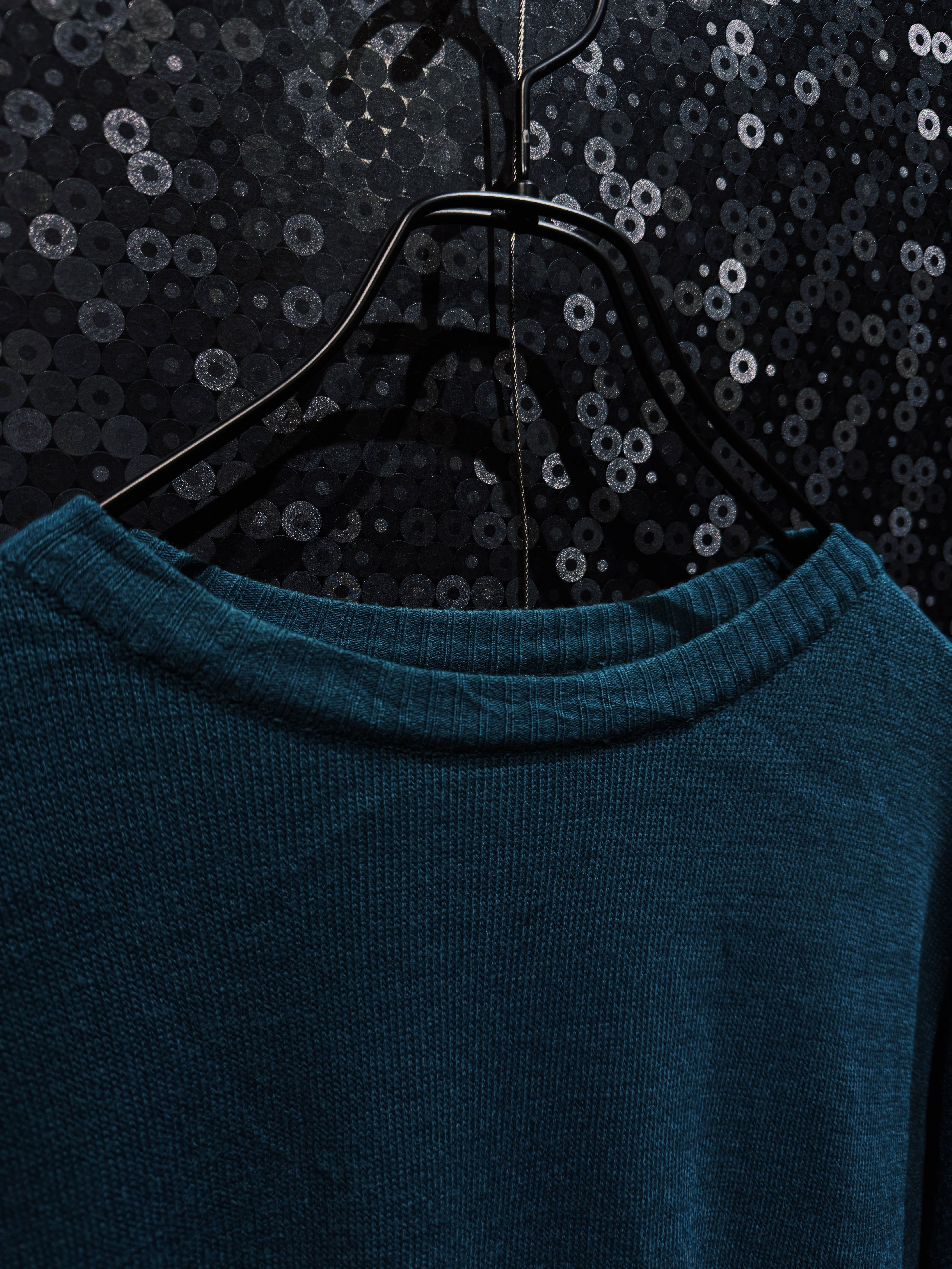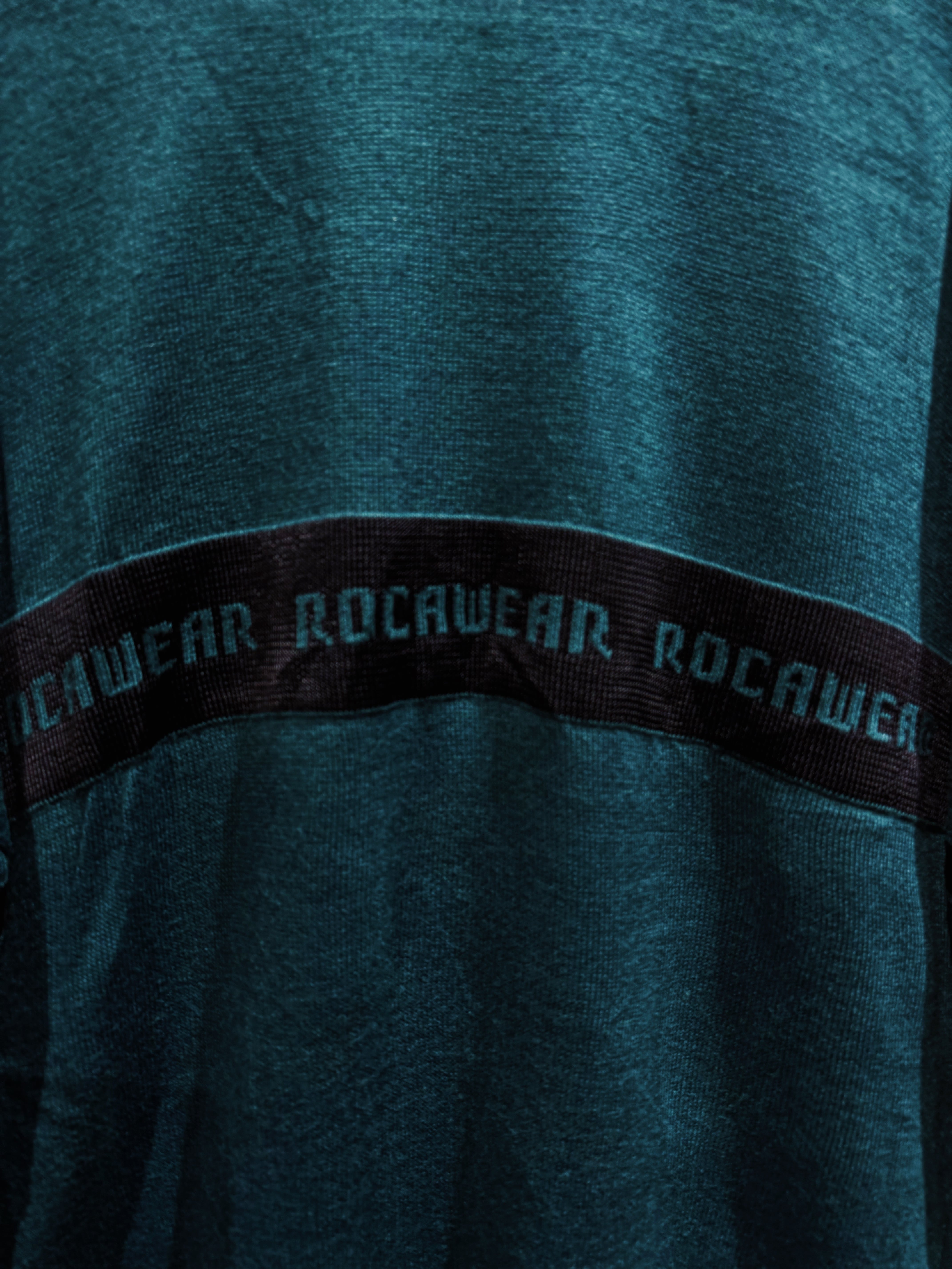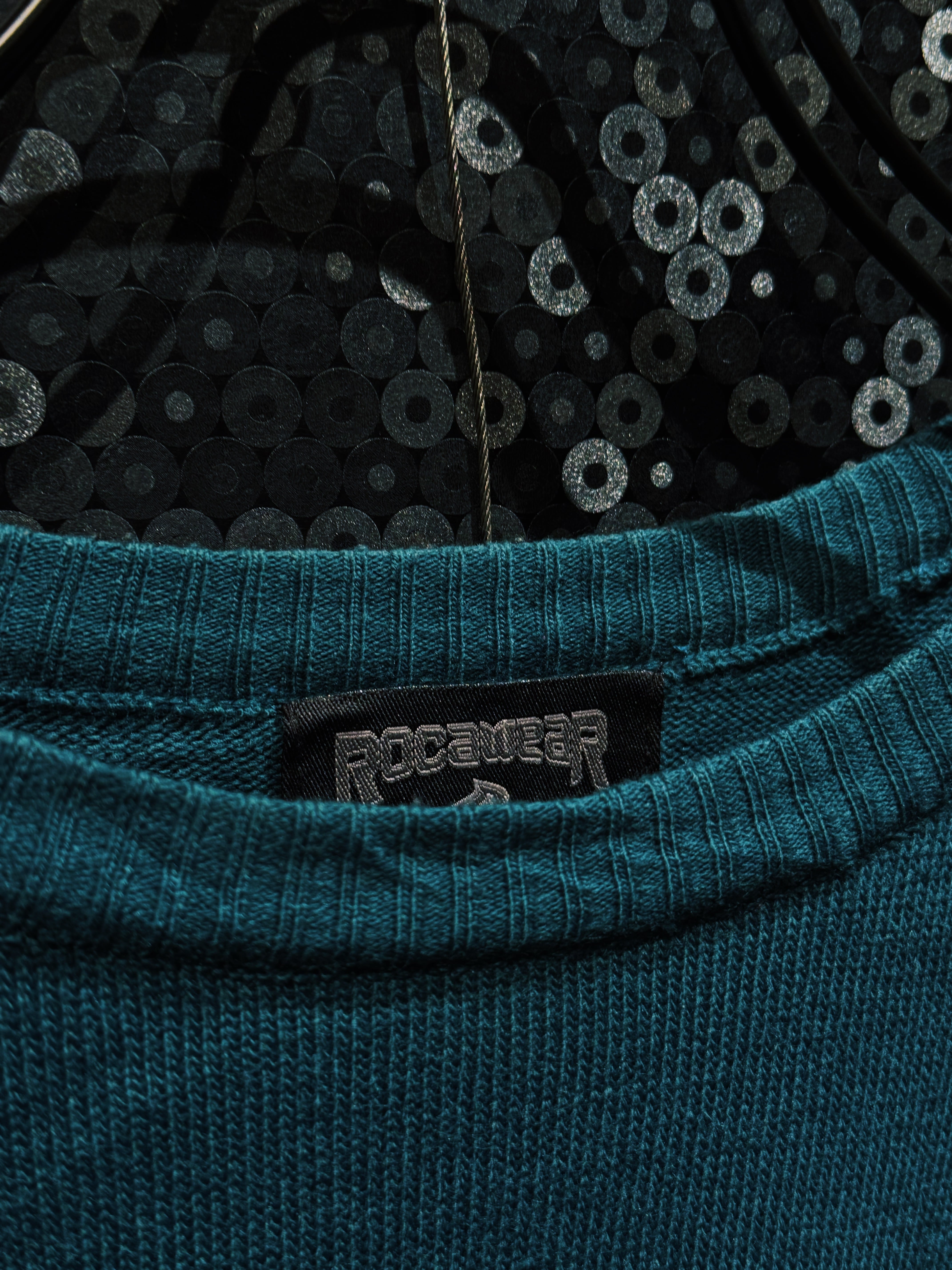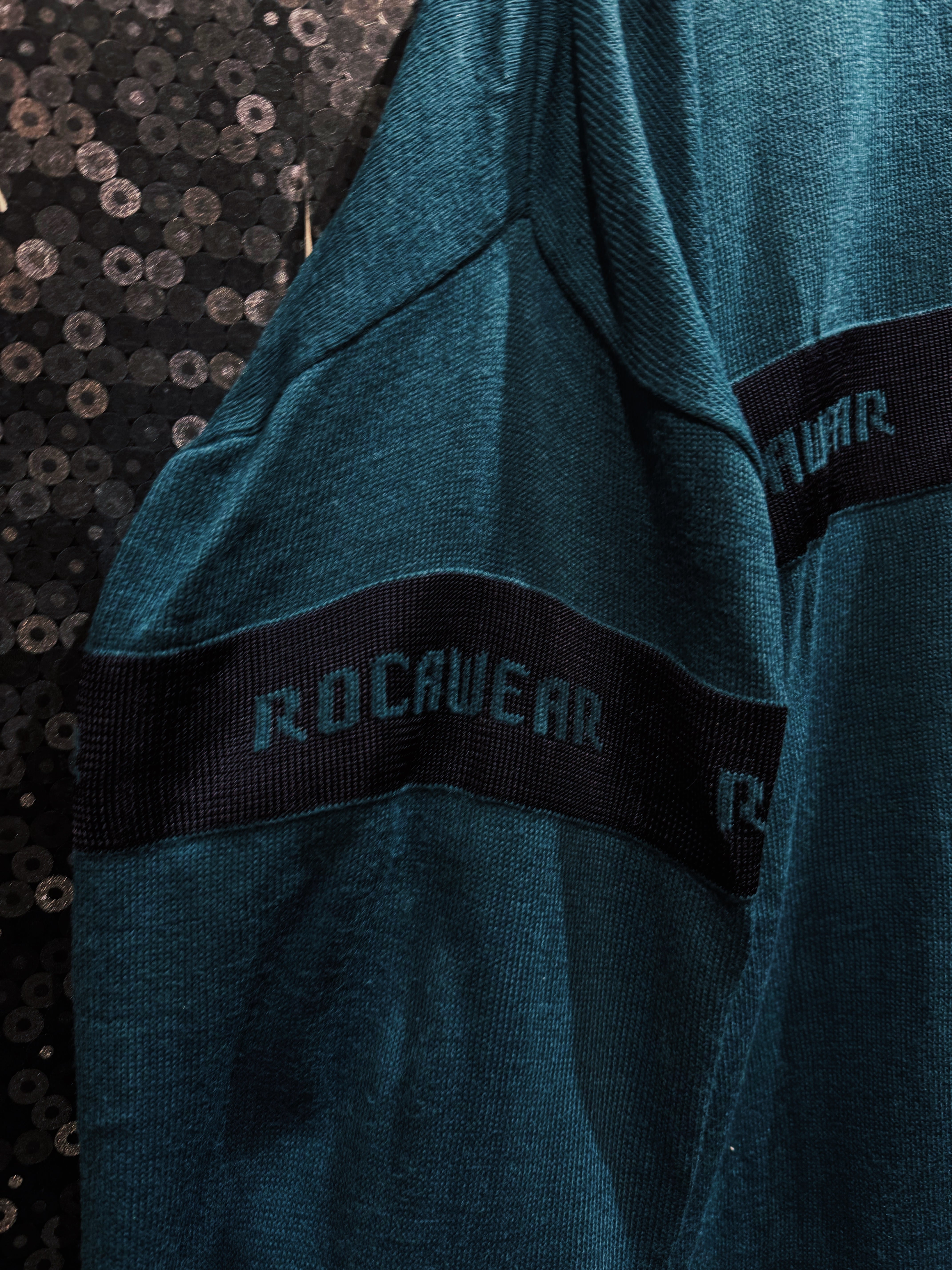 深みのあるグリーンボディに、横一線で走る“ROCAWEAR”ロゴラインが印象的な一着。フロントから袖までぐるりと一周するこのラインが、シンプルなニットに強烈なストリート感を与えている。