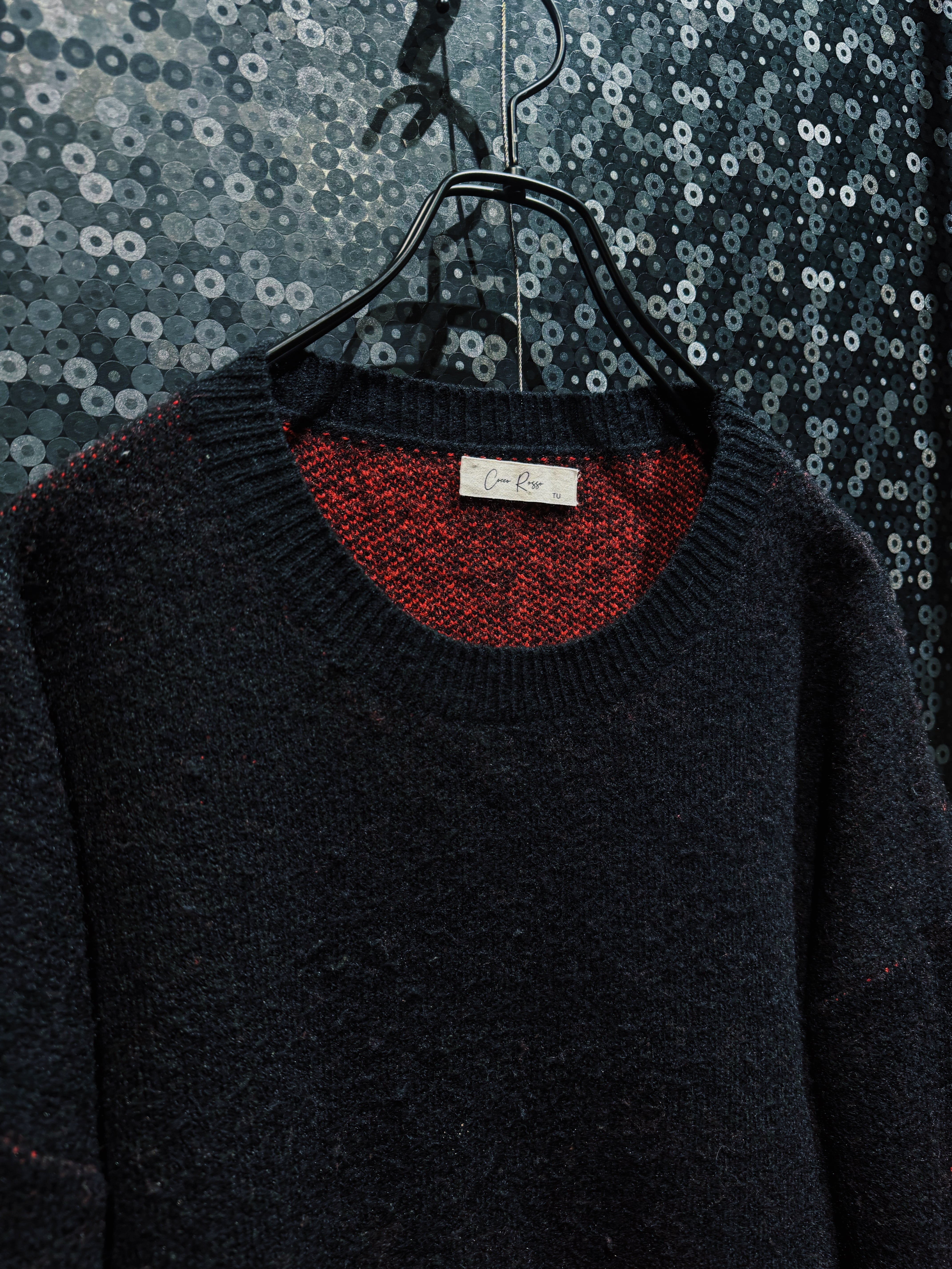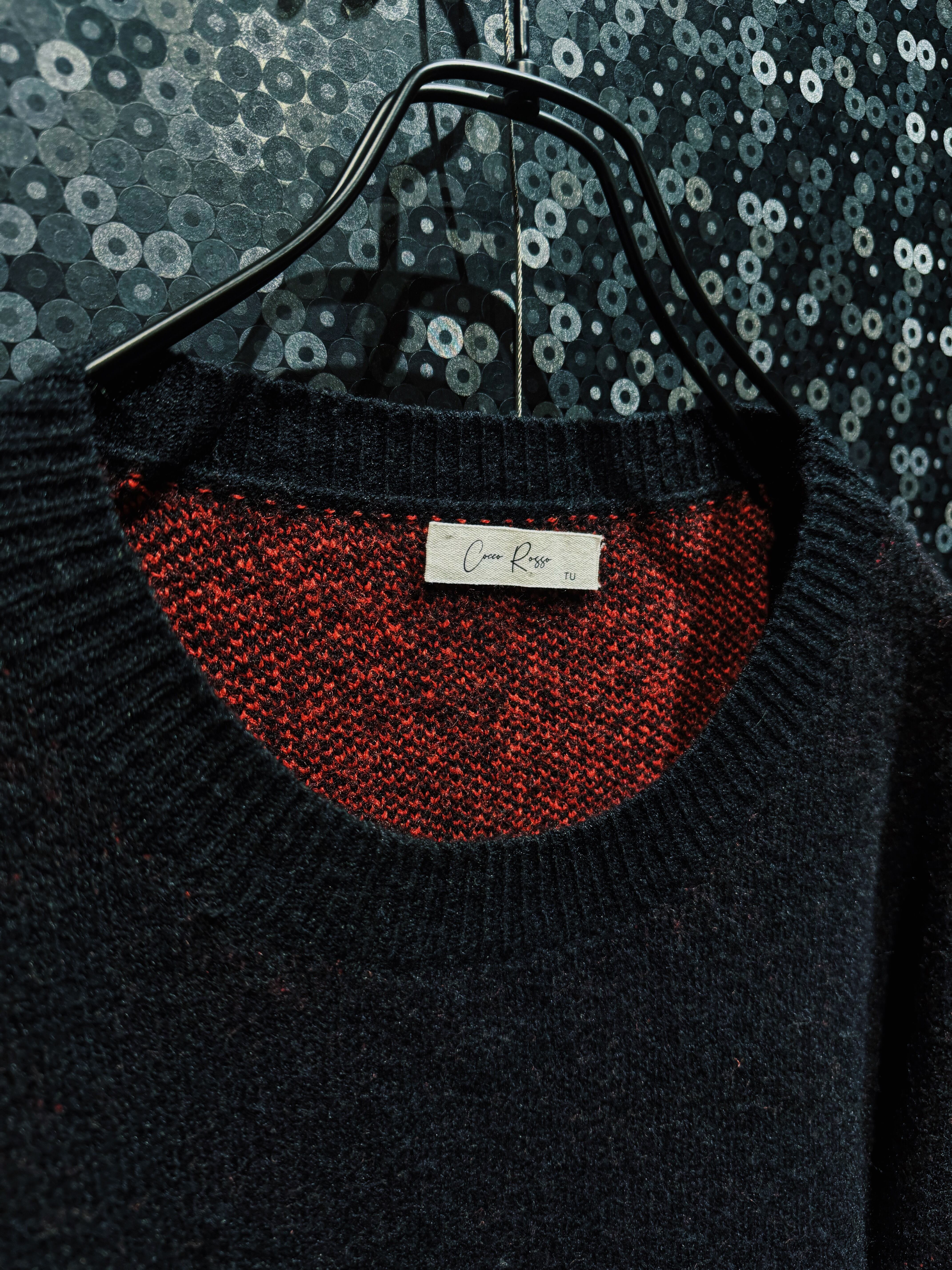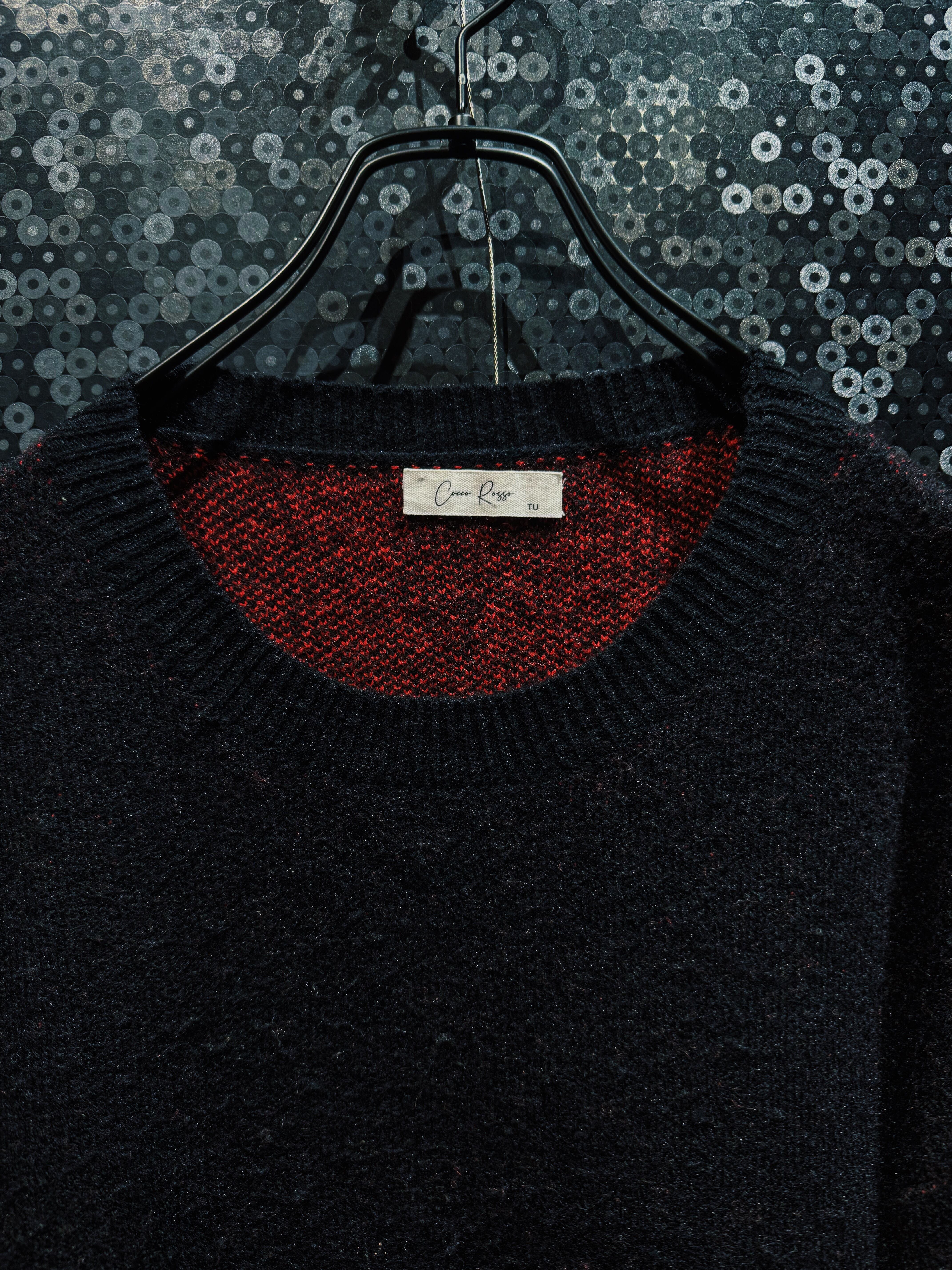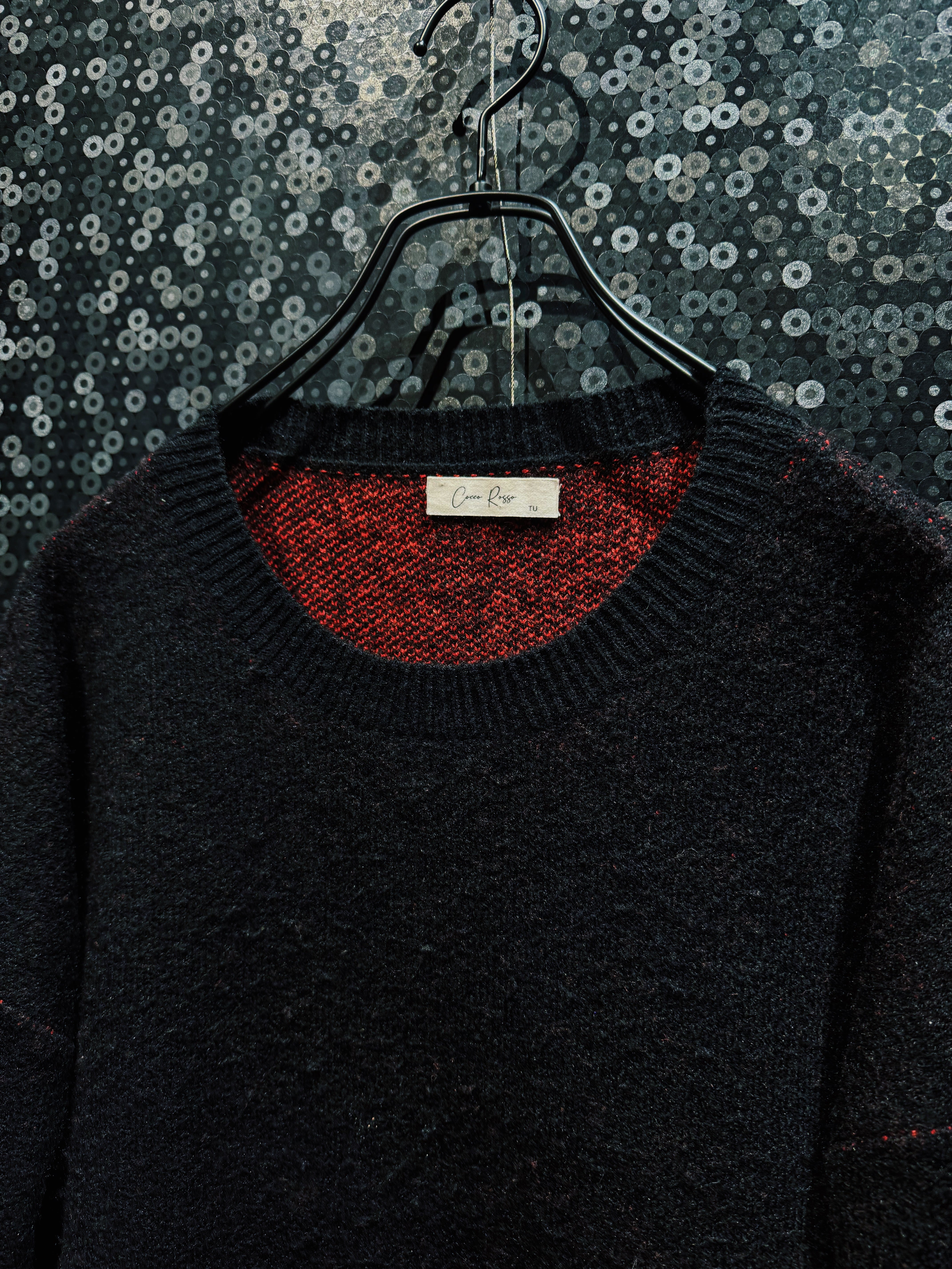 ボディは柔らかく毛足のあるニットで、見た目以上に軽やかで着心地の良さも兼ね備えている。内側のレッドが透けるような編み地になっており、奥行きのあるカラーリングが単なる配色ではない立体感を演出。