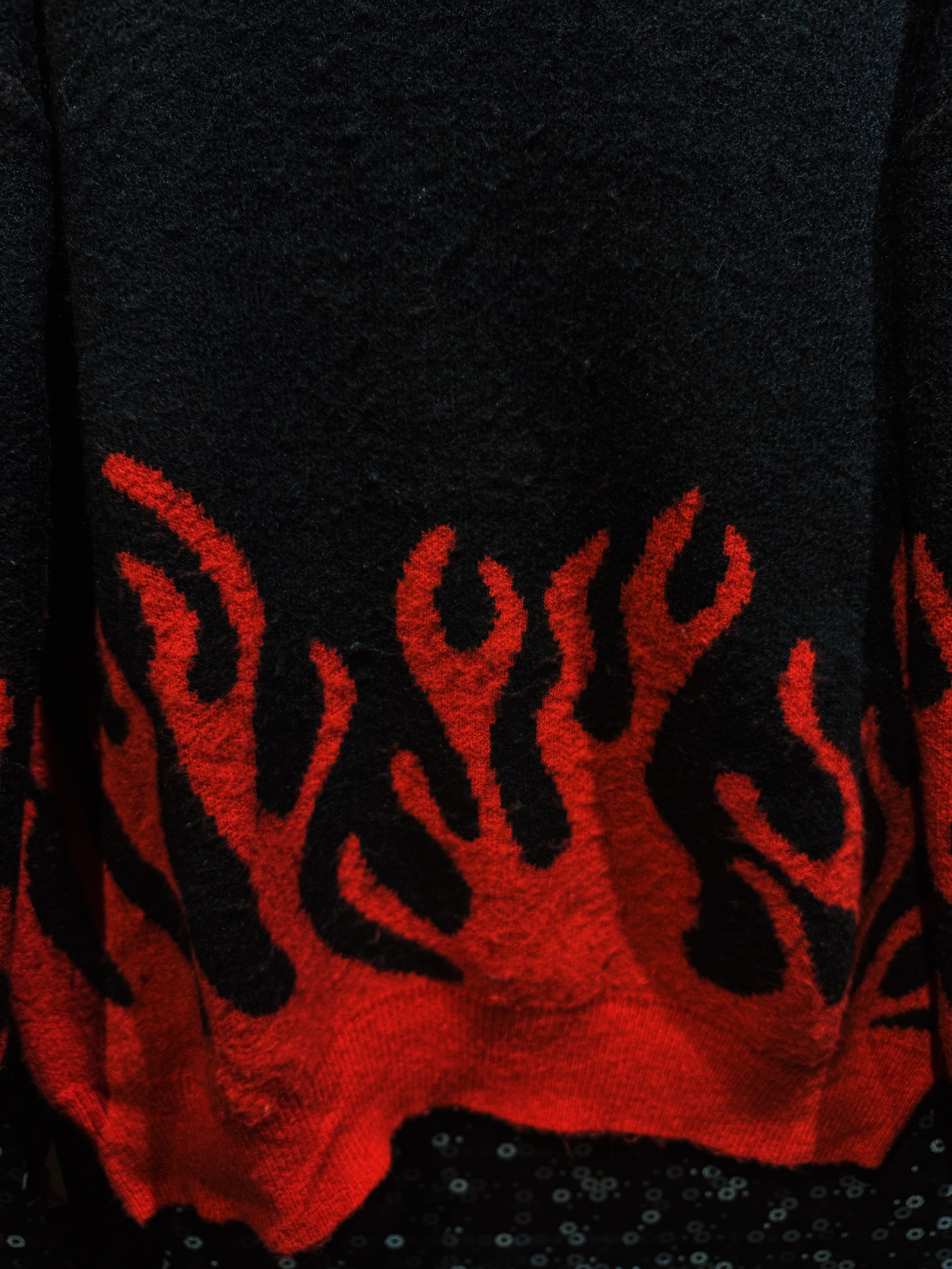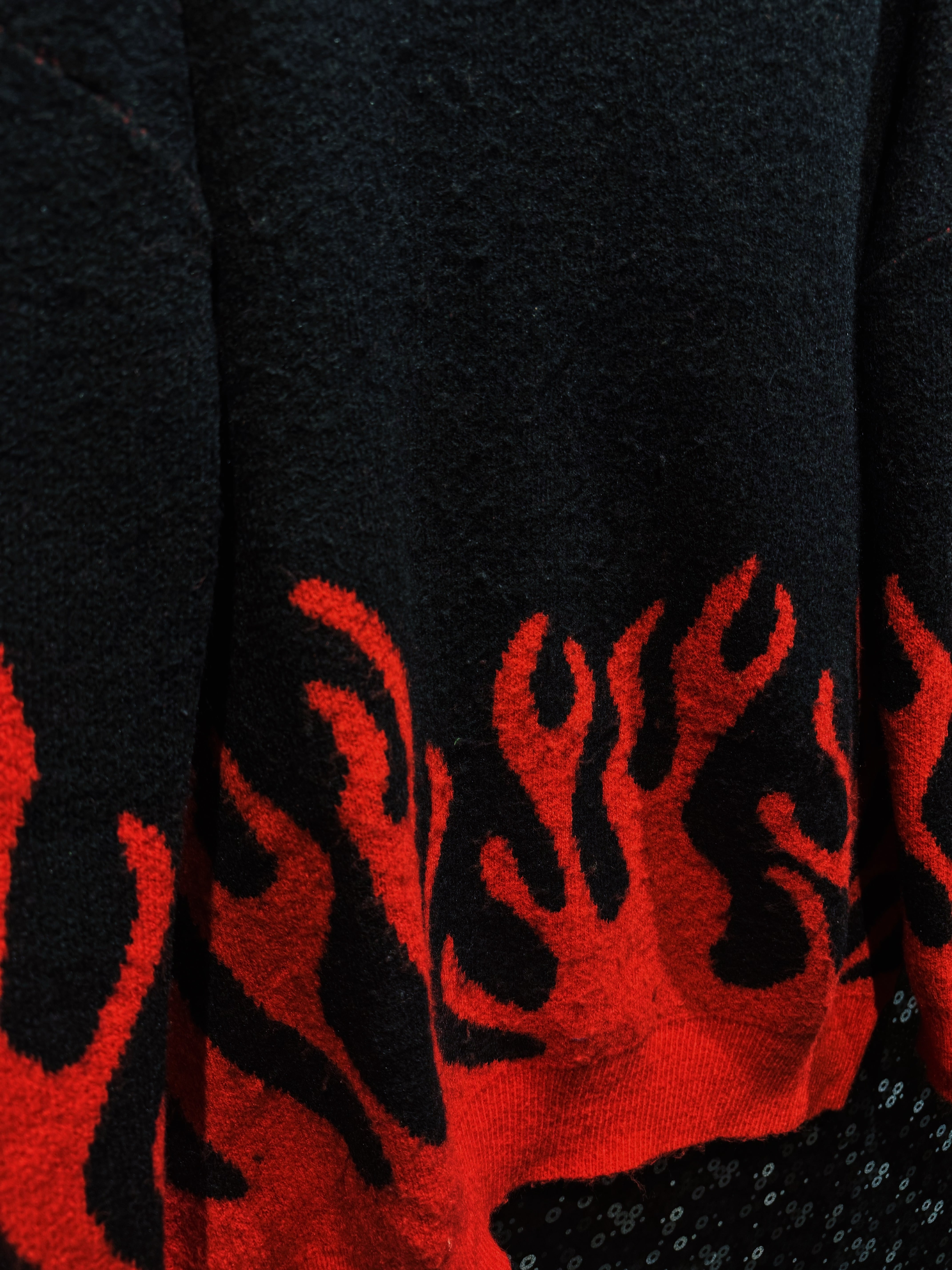 ブラックからレッドへと燃え上がるように切り替わるファイヤーパターンが全面に走る、視覚的インパクトの強い一着。裾から立ち上がる炎のデザインがリアルに表現されており、シンプルな構成ながらも圧倒的な主役感を放つ仕上がり。