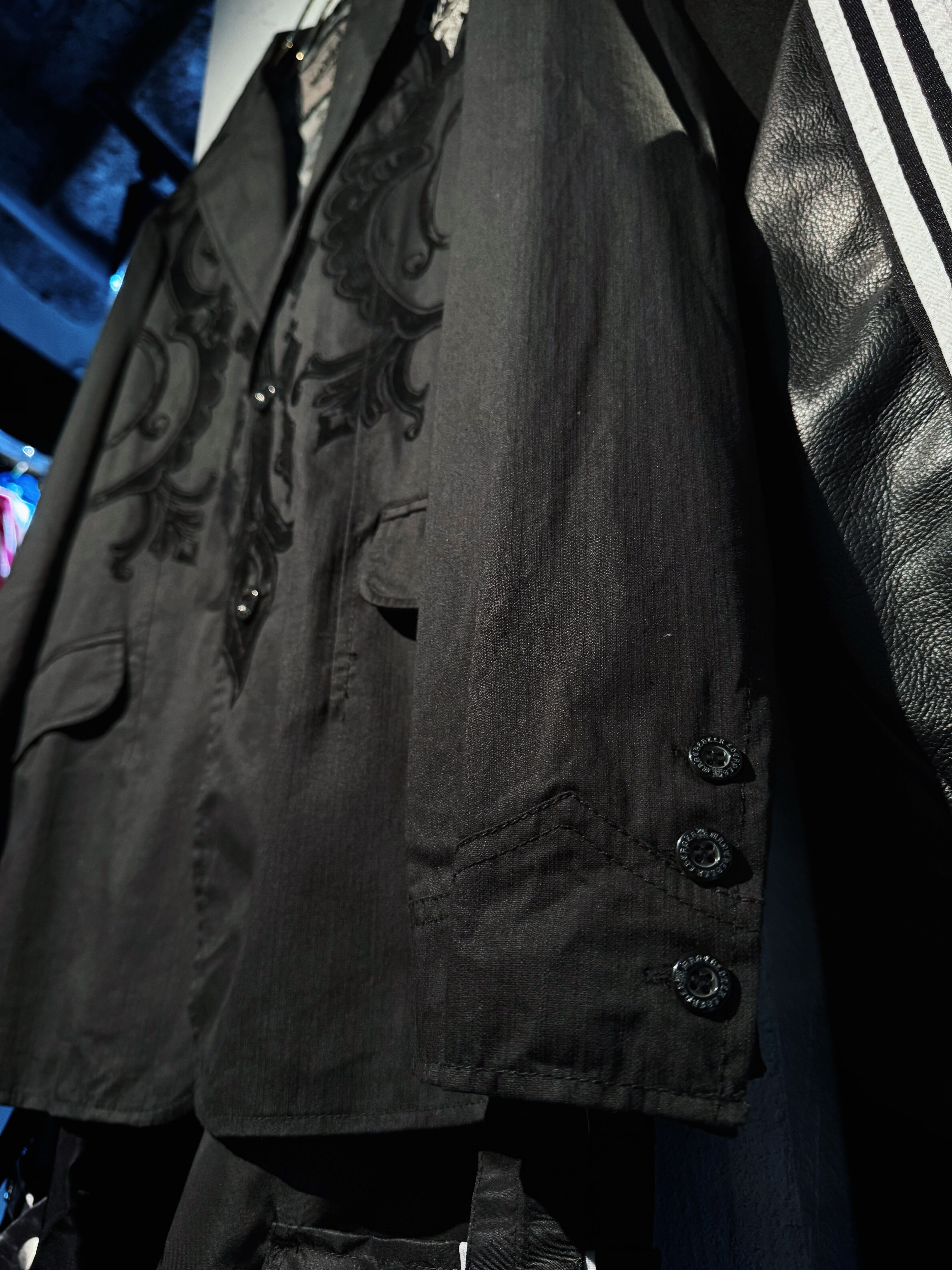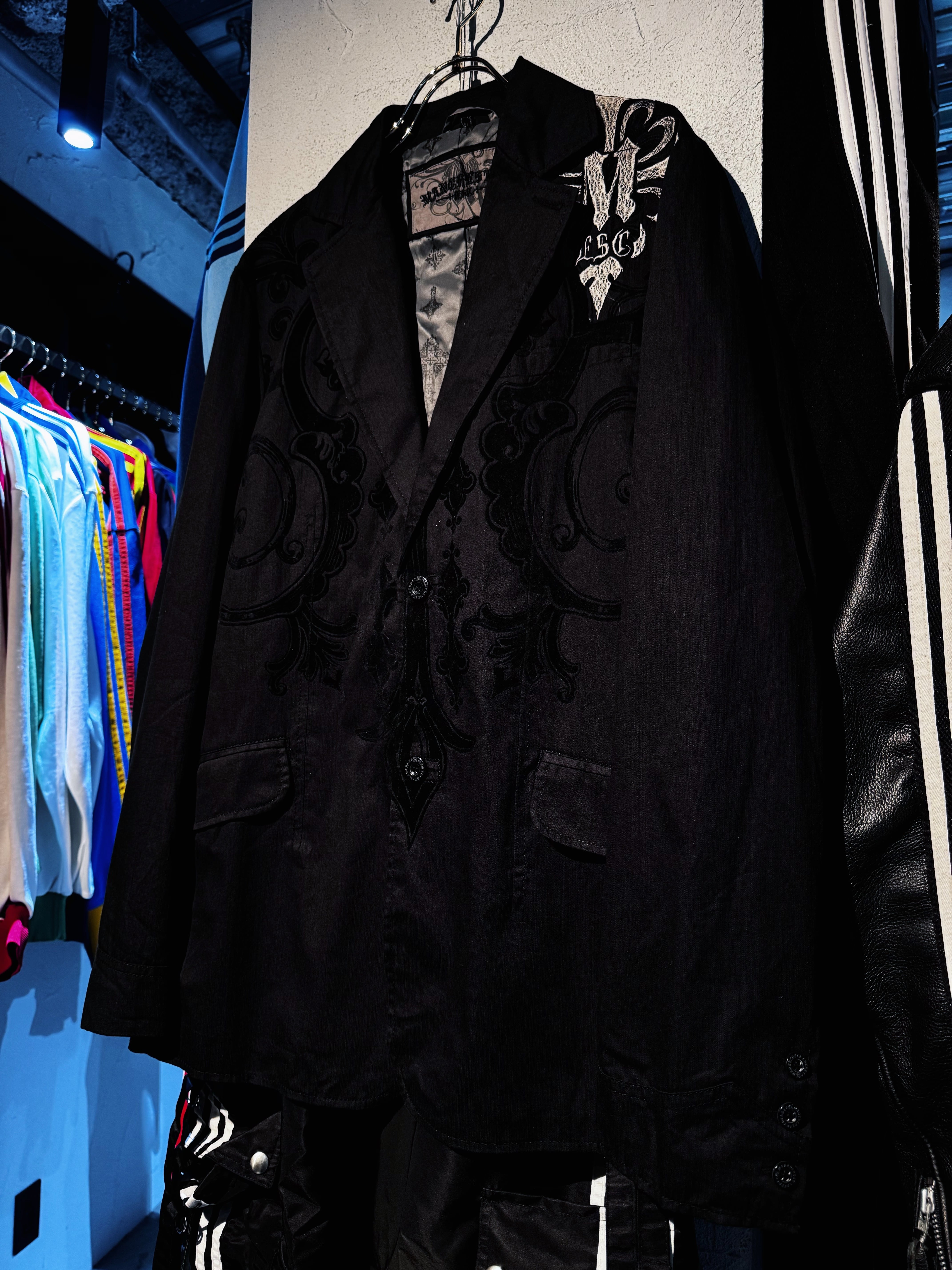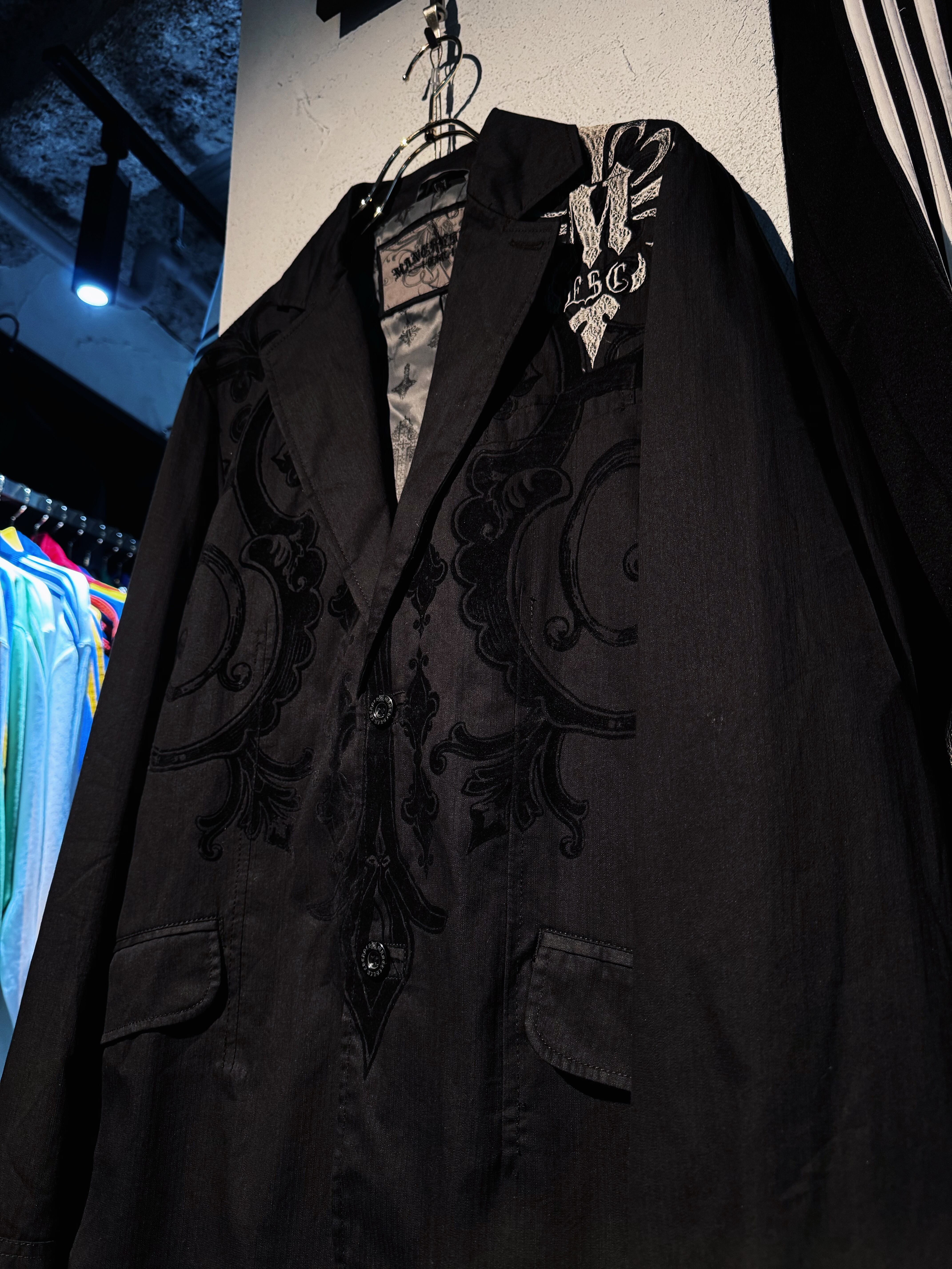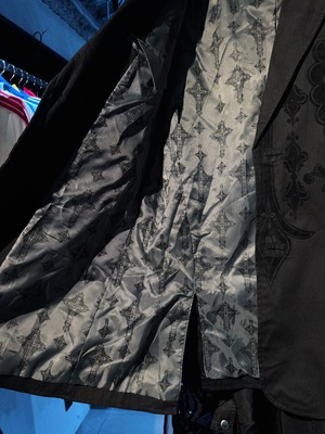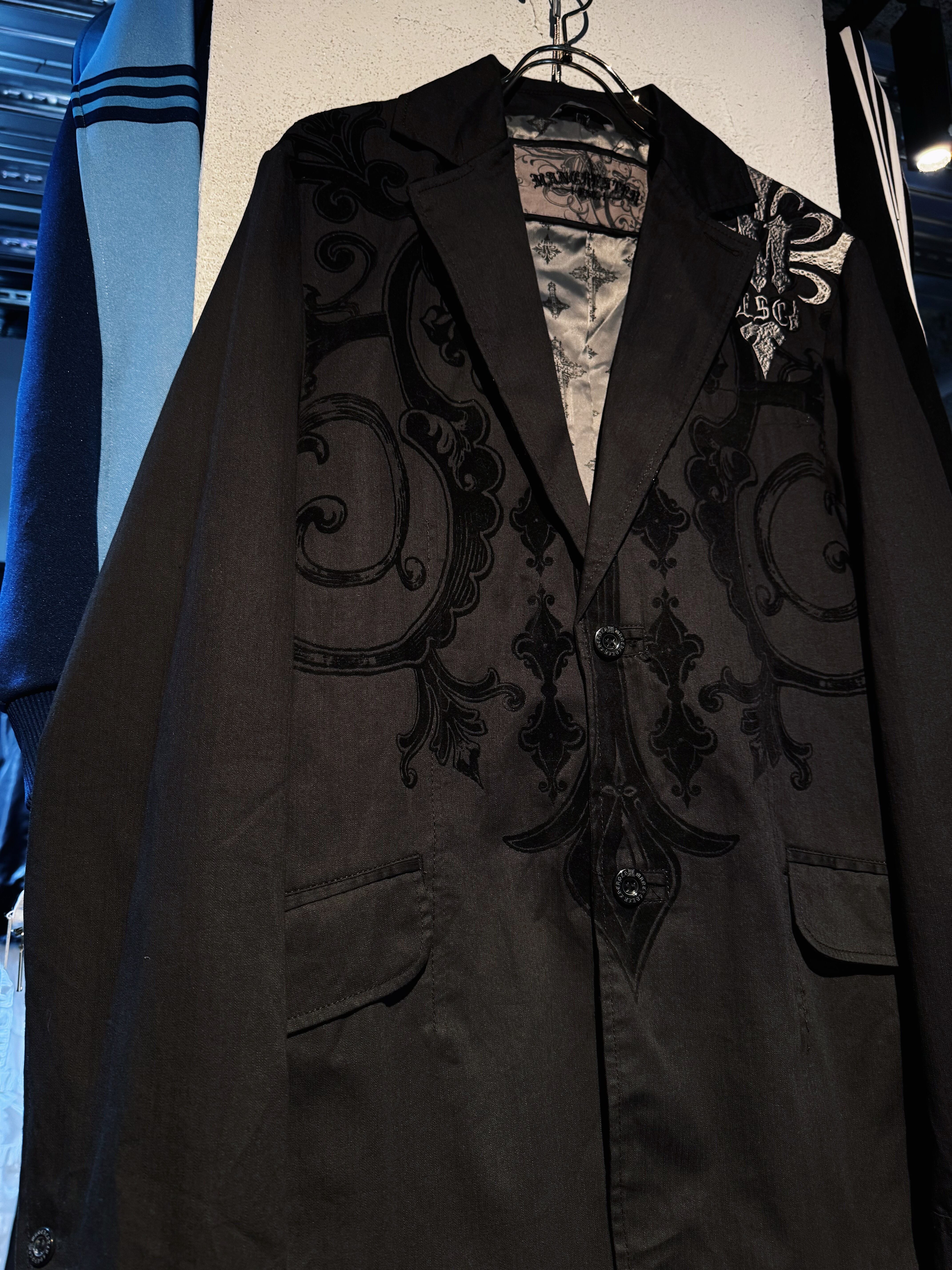 今回はシングルブレストのテーラードジャケットにオーナメント柄やトライバルデザインを載せたゴシック調のテーラードジャケット。プリントではなく浮かび上がるような刺繍デザインというのも魅力的です。