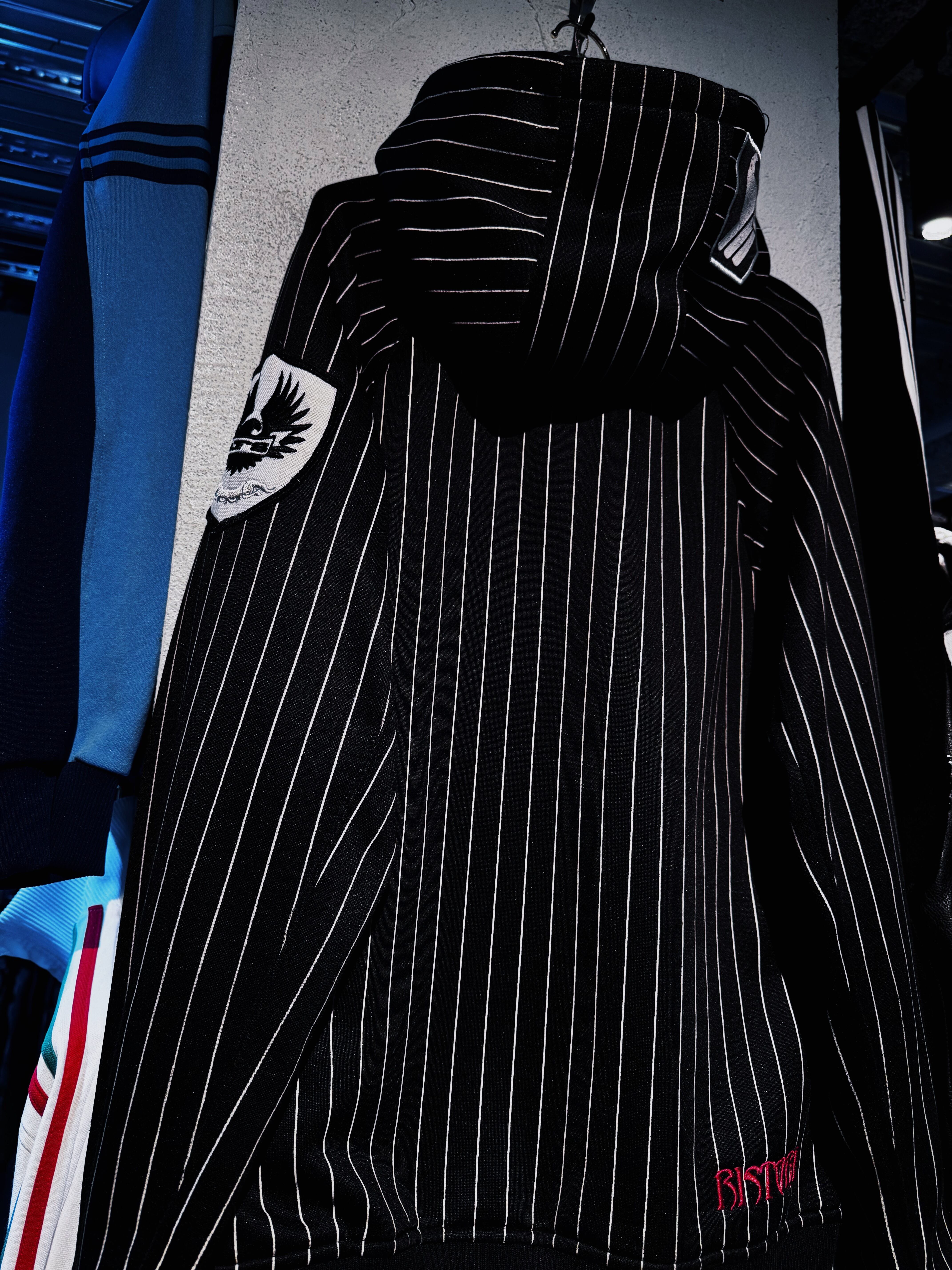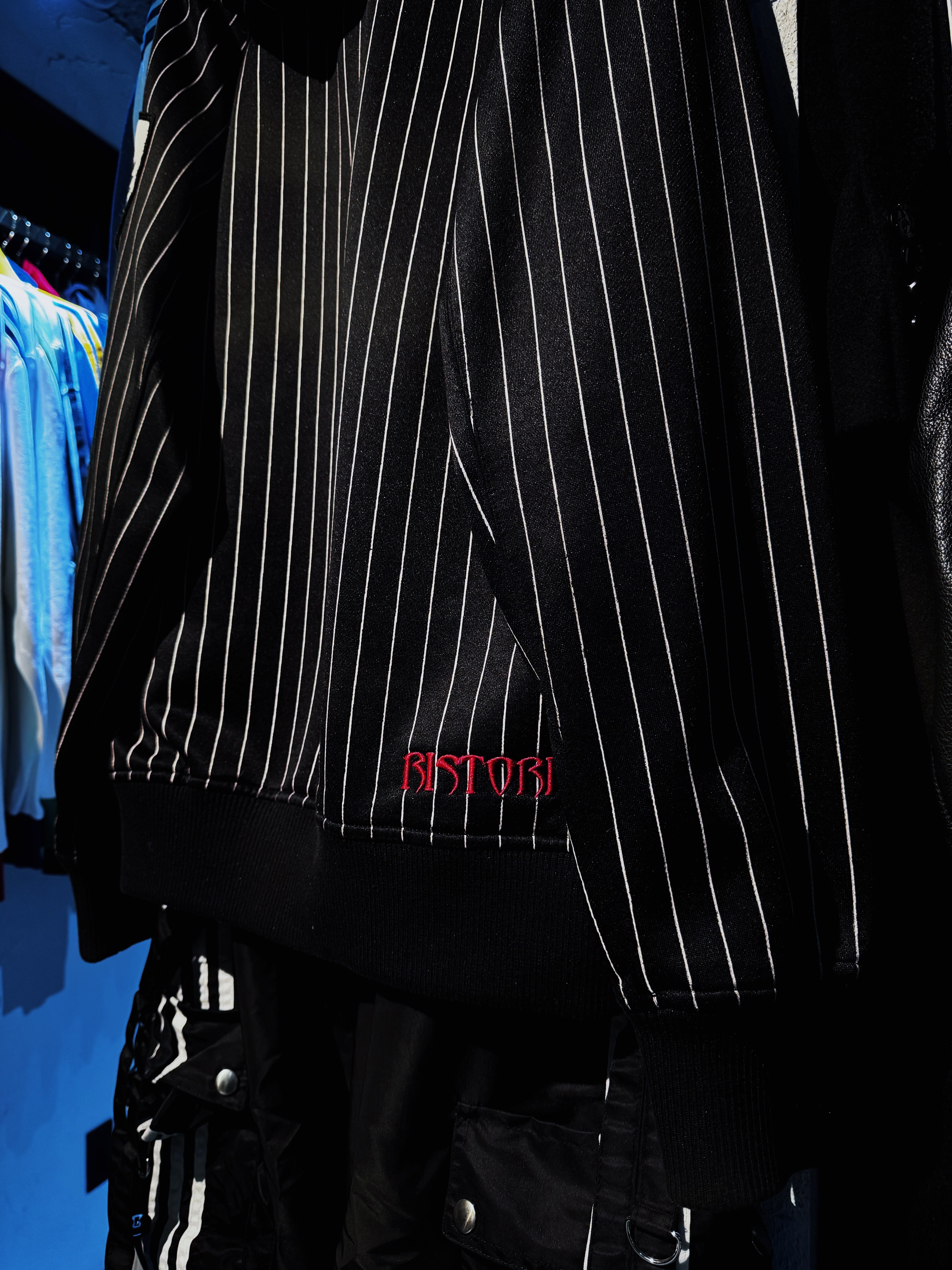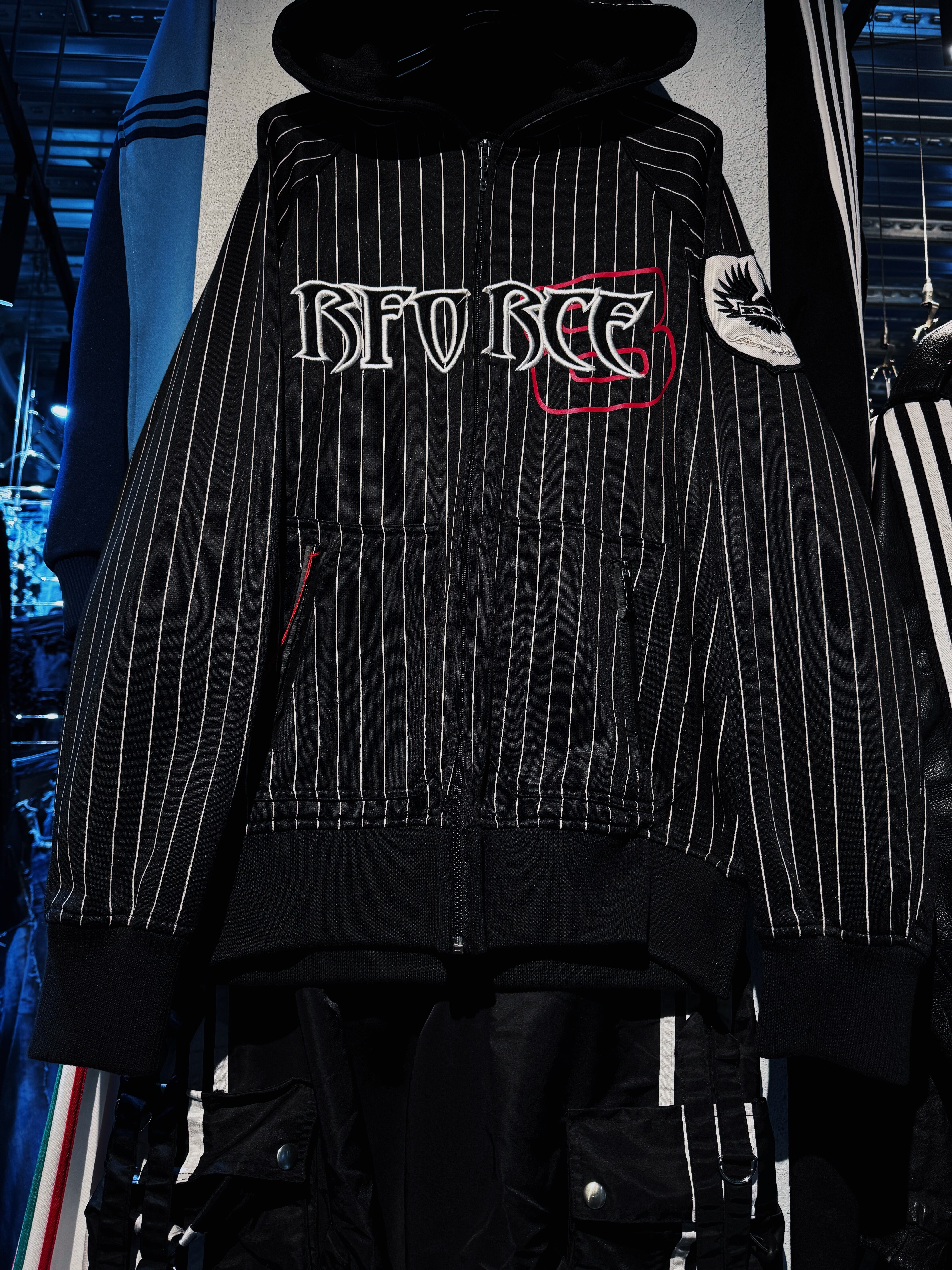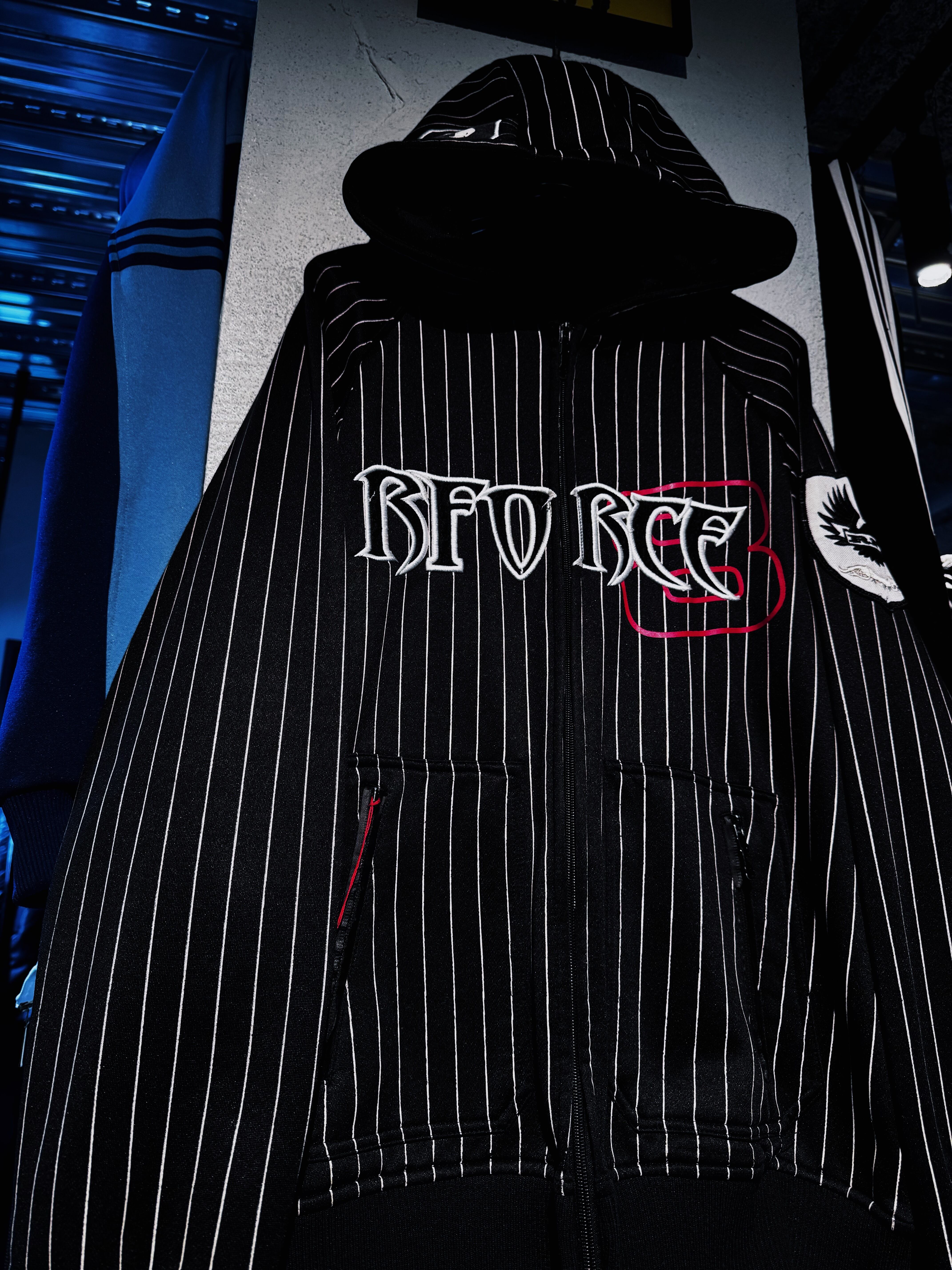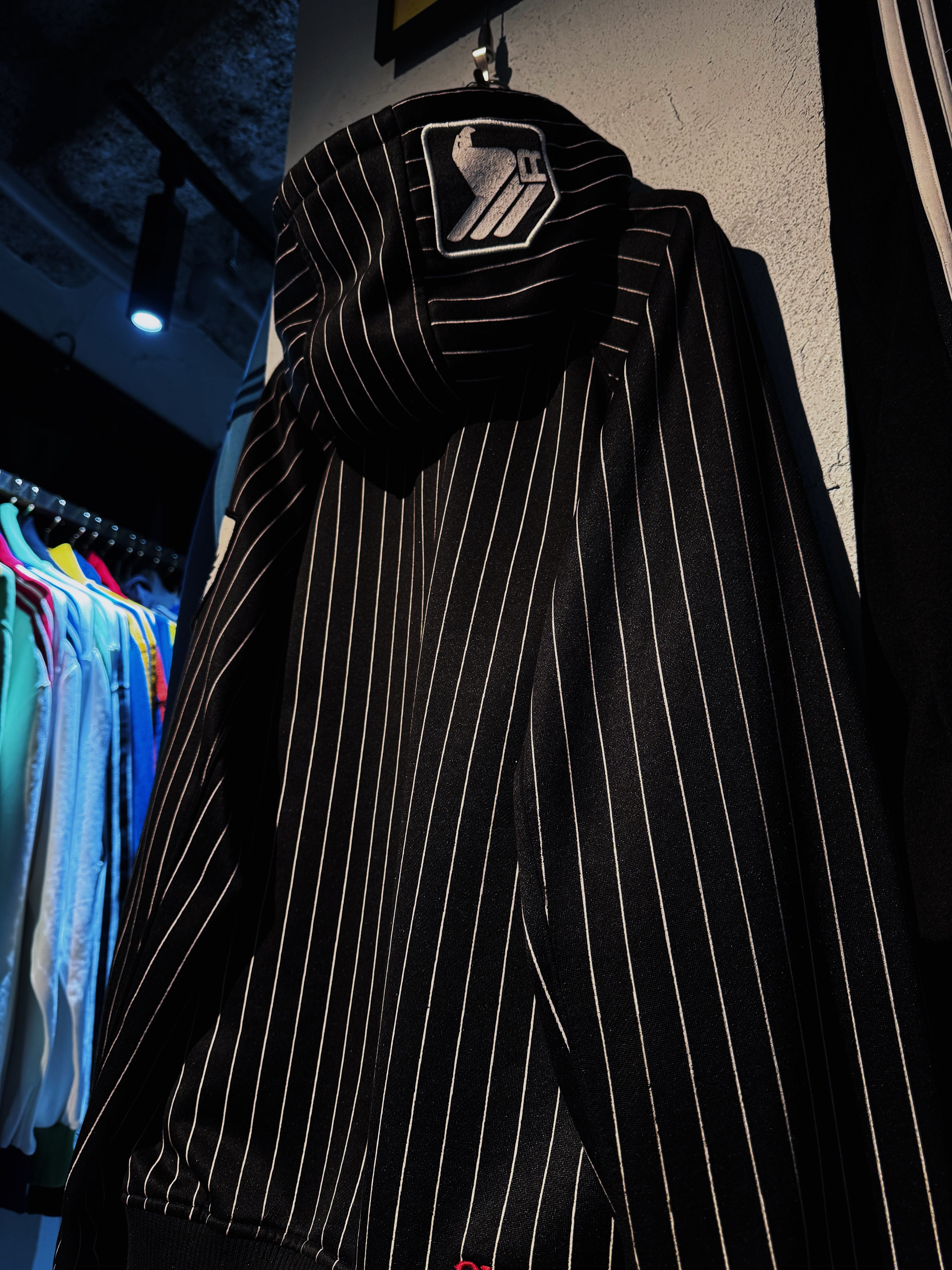 ストライプのパターンを載せたフルジップフーディーに、フロントにはブランドロゴを載せたアイコニックな1着。