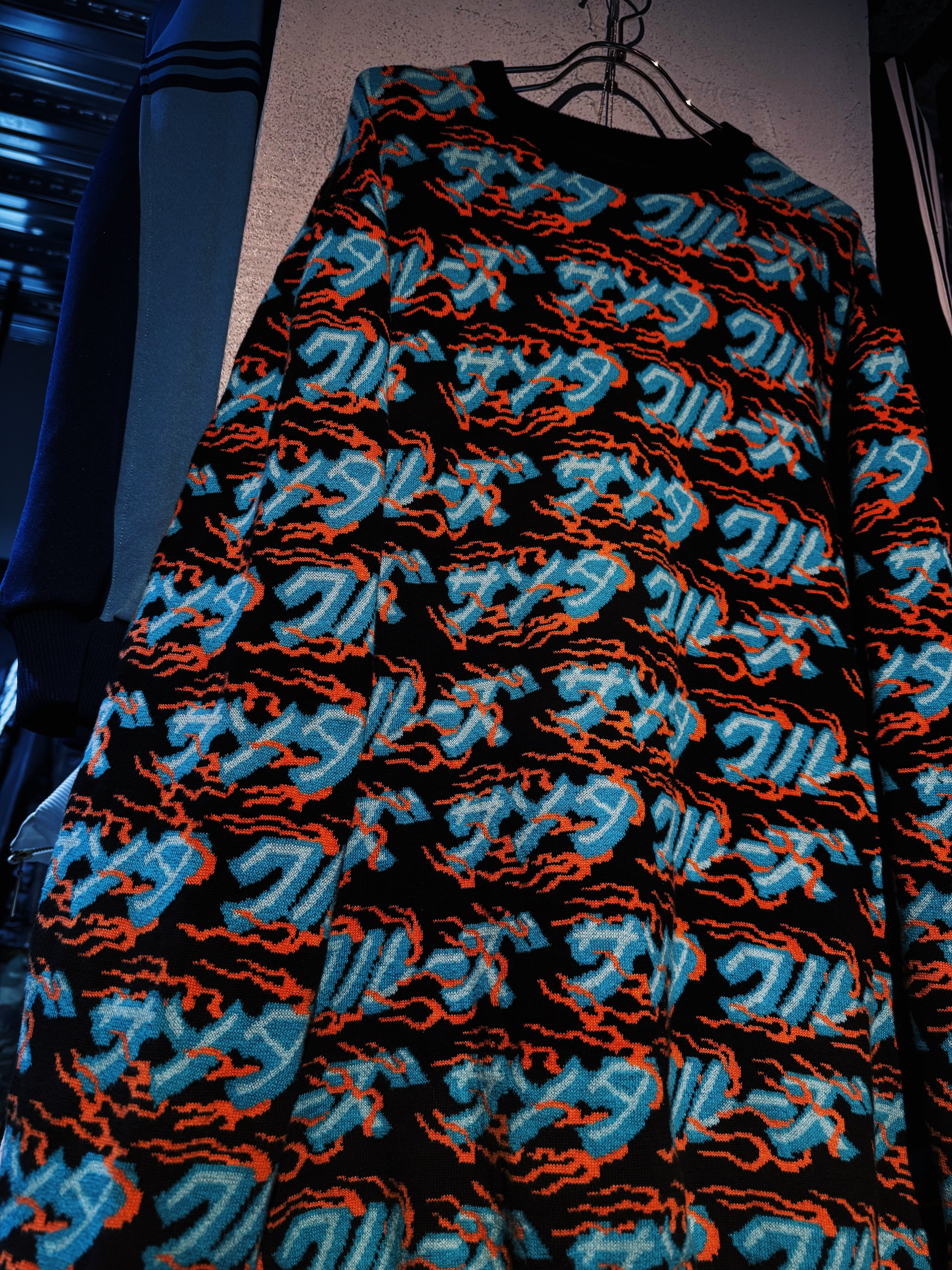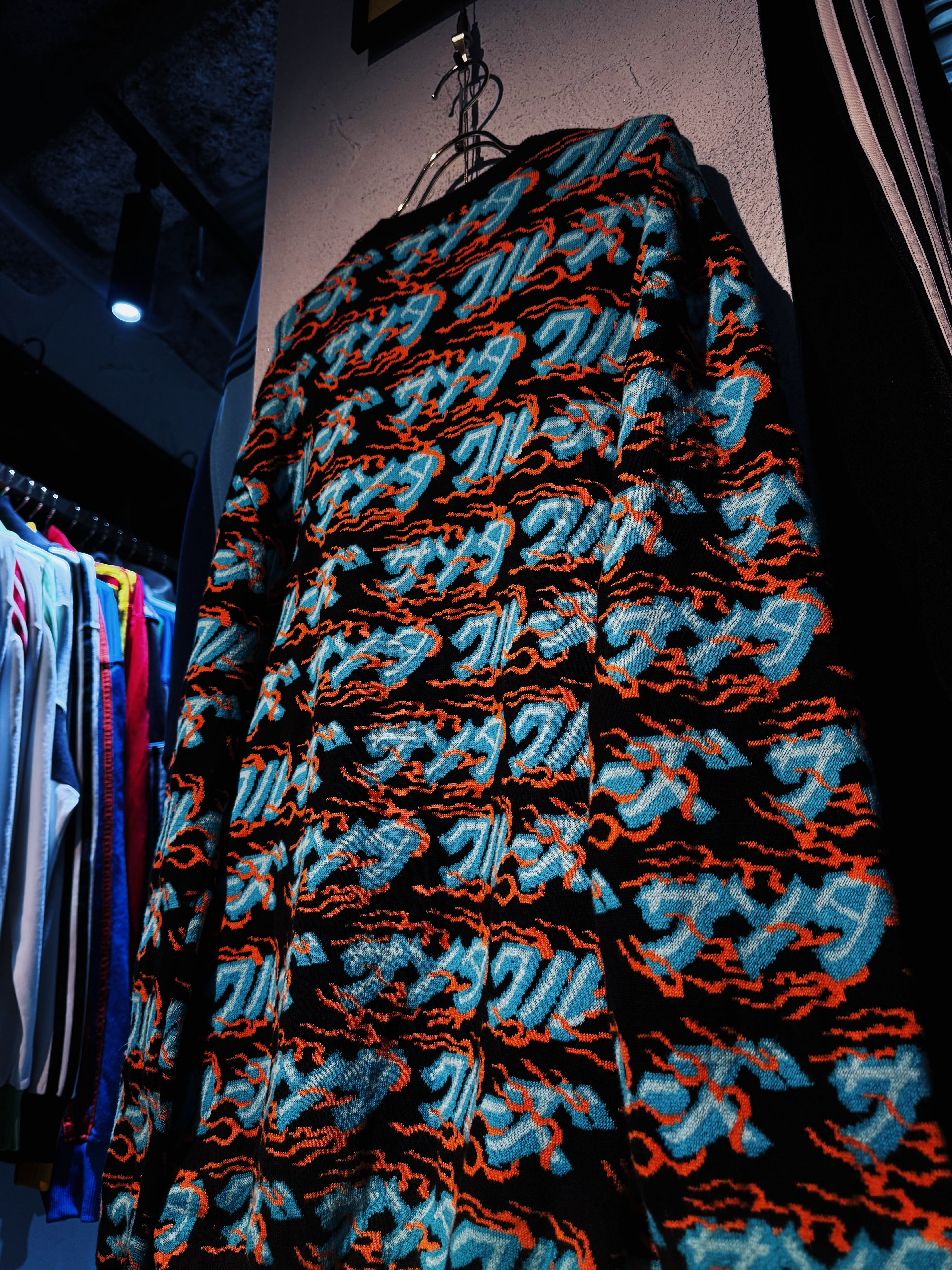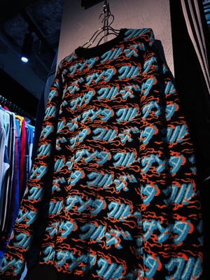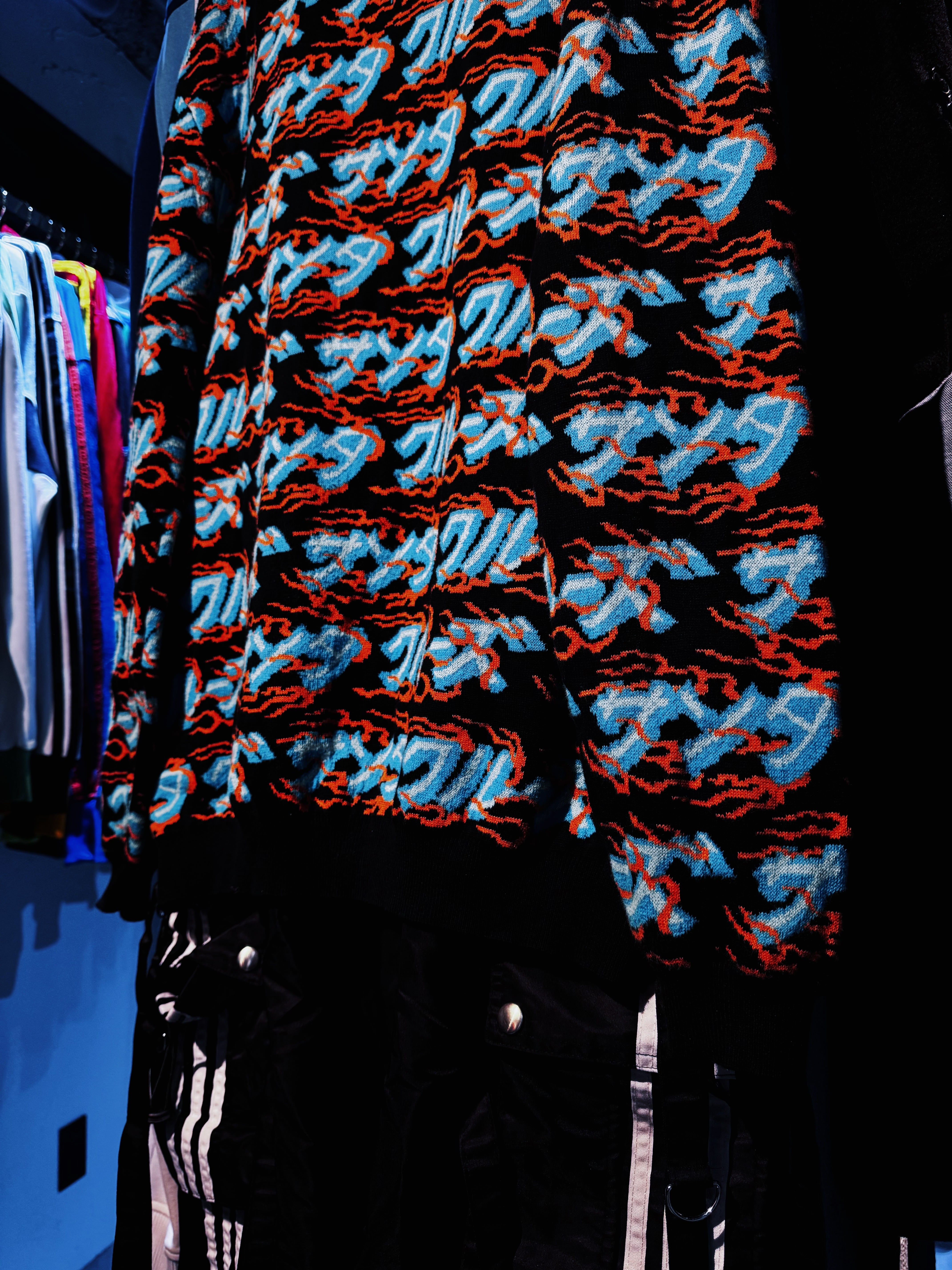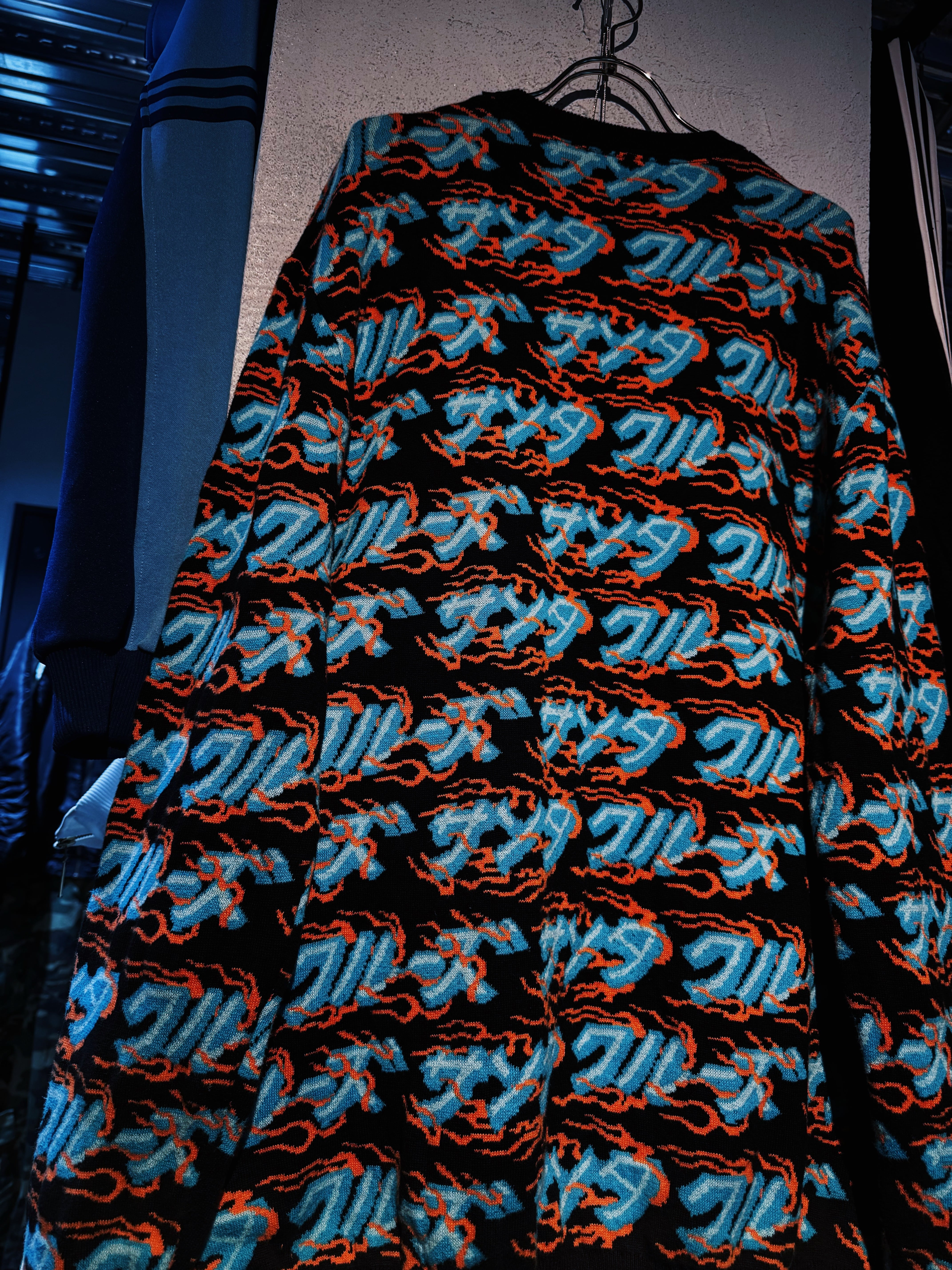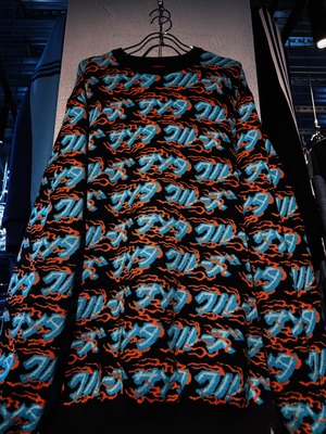 こちらはカタカナでブランド名をあしらった総柄ニット。ファイヤーパターンのような柄もいいですね。