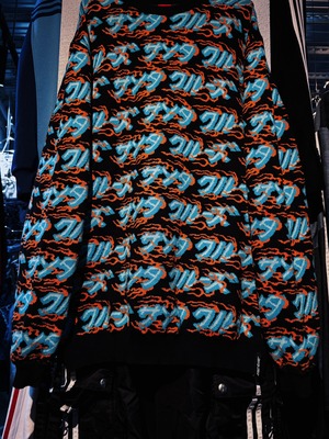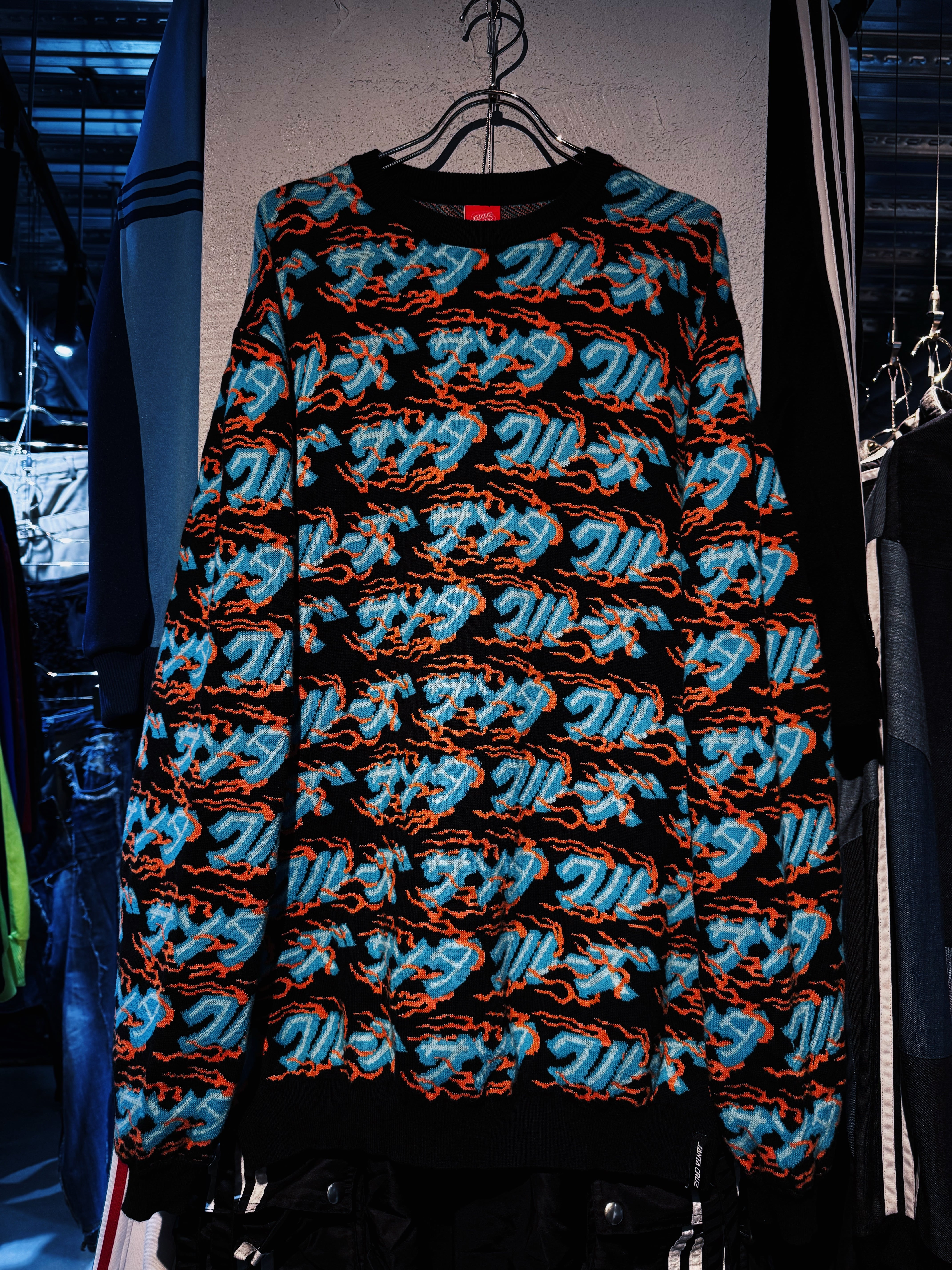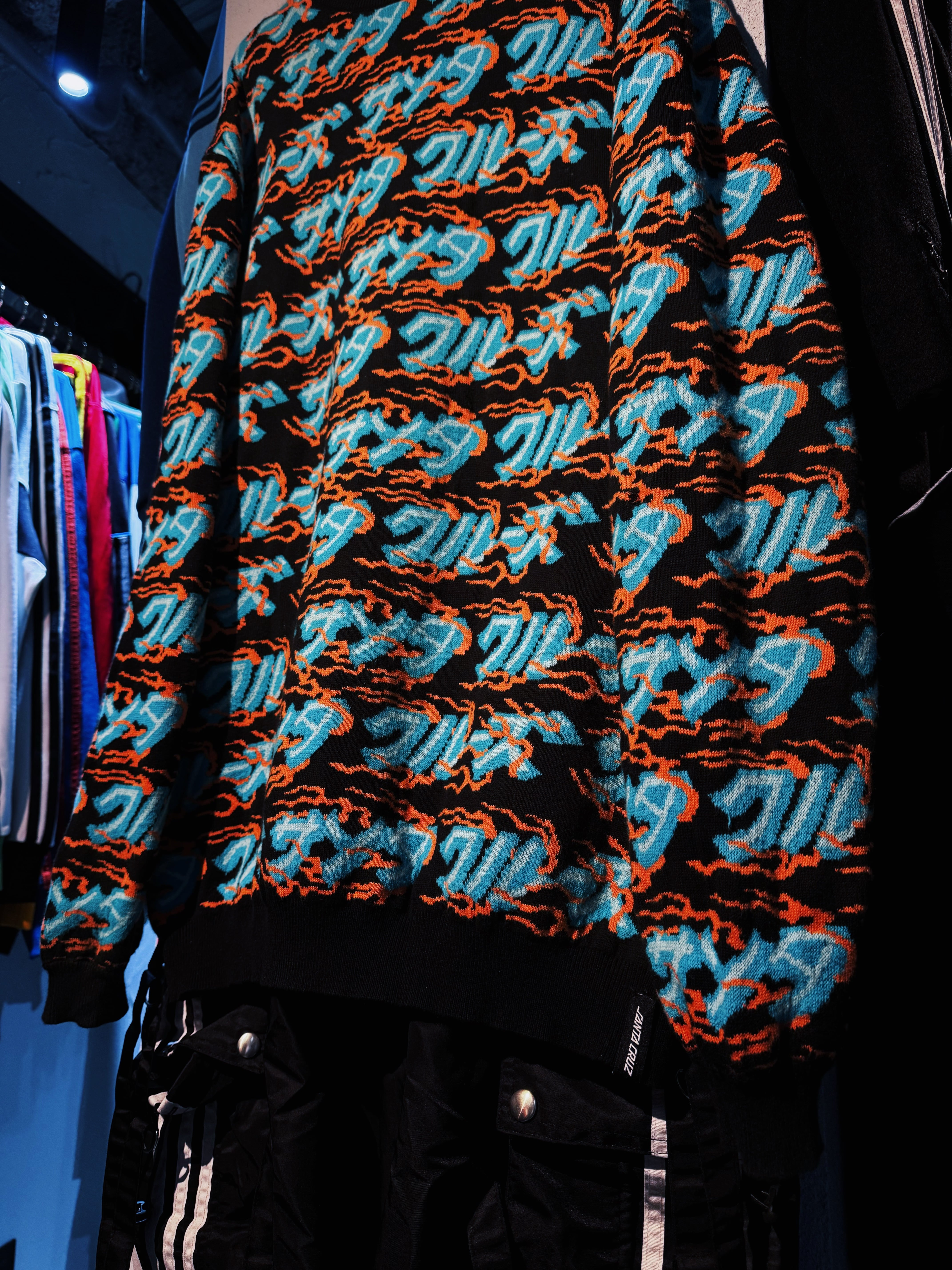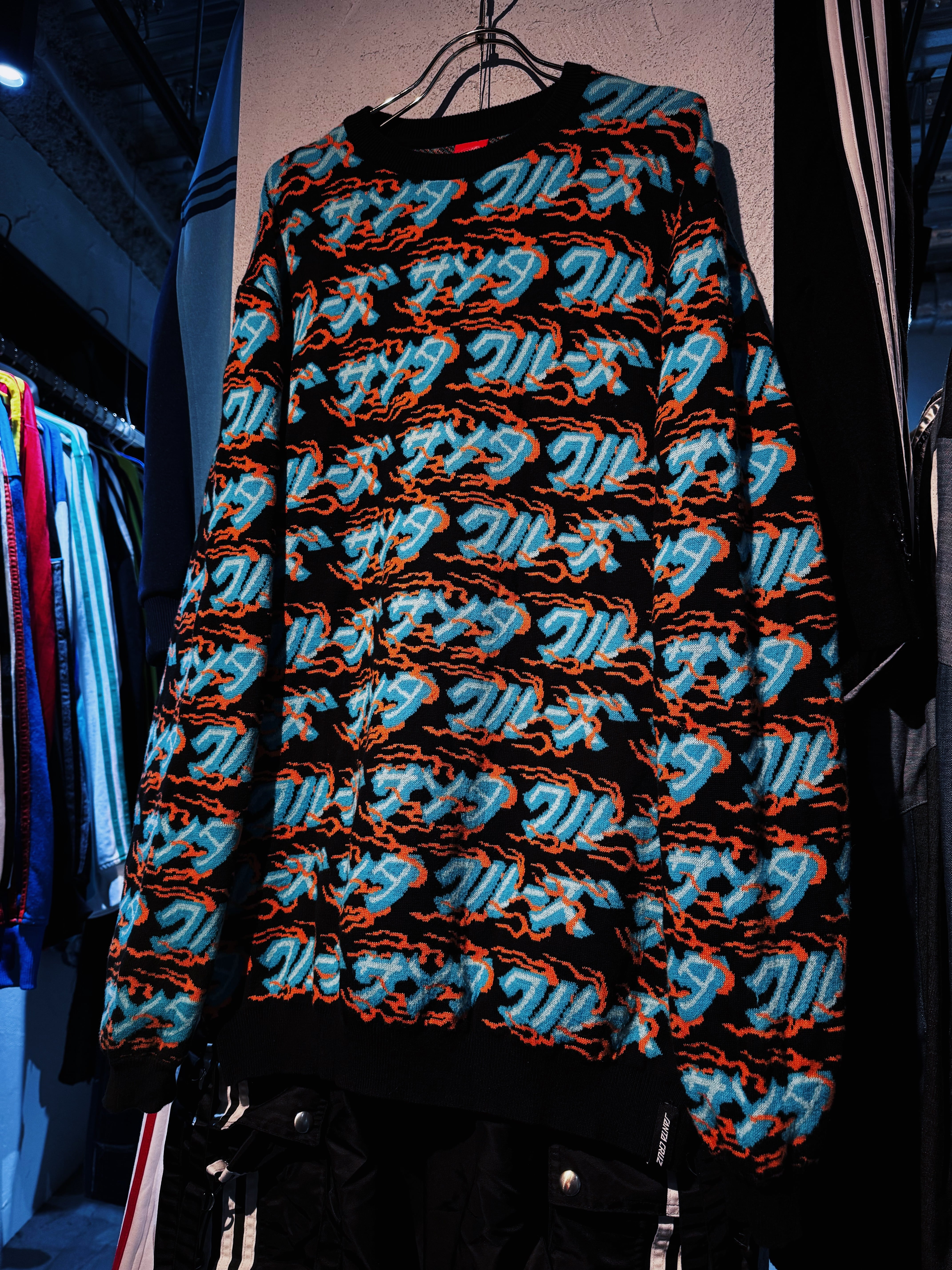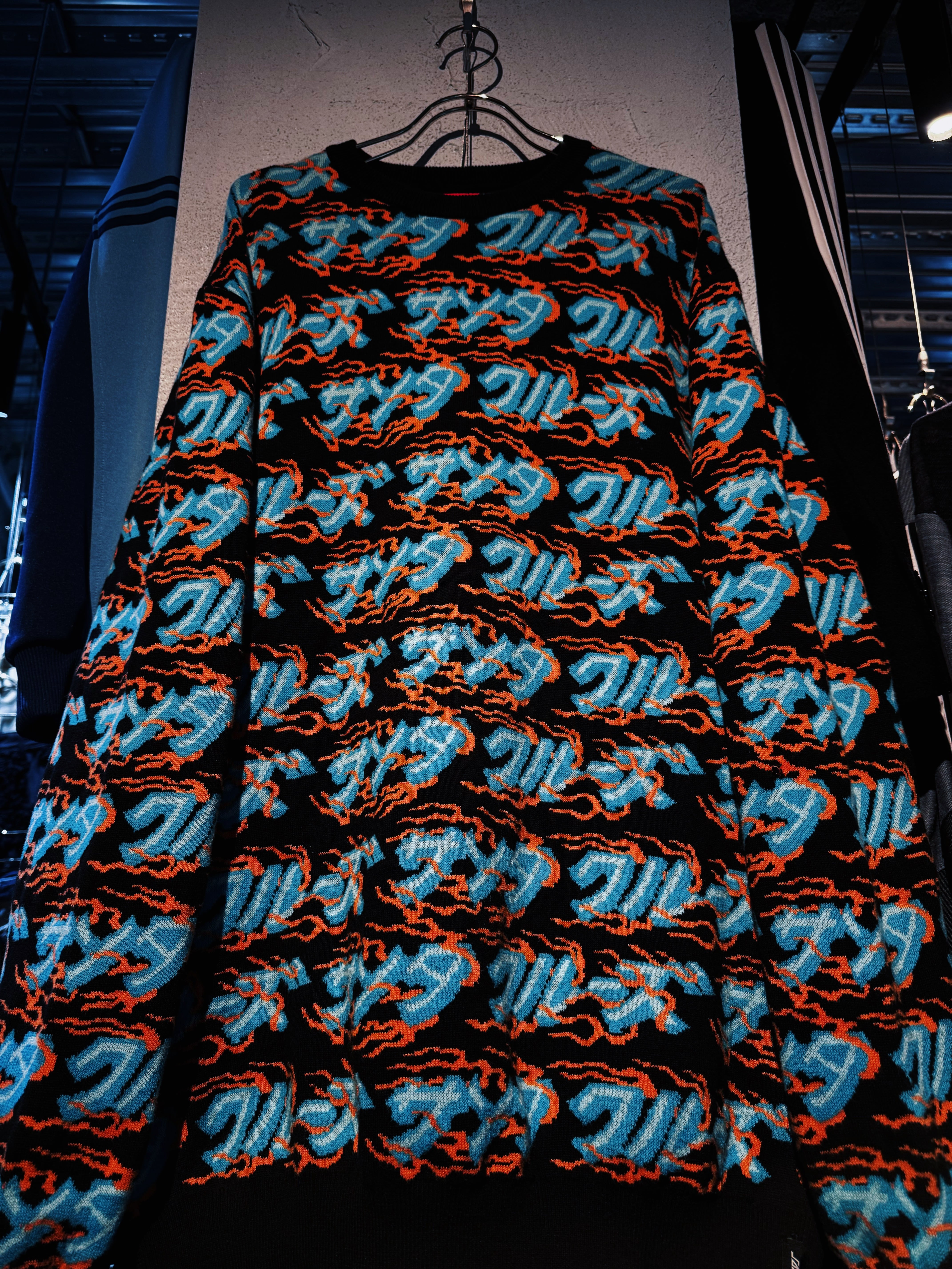こちらはカタカナでブランド名をあしらった総柄ニット。ファイヤーパターンのような柄もいいですね。
