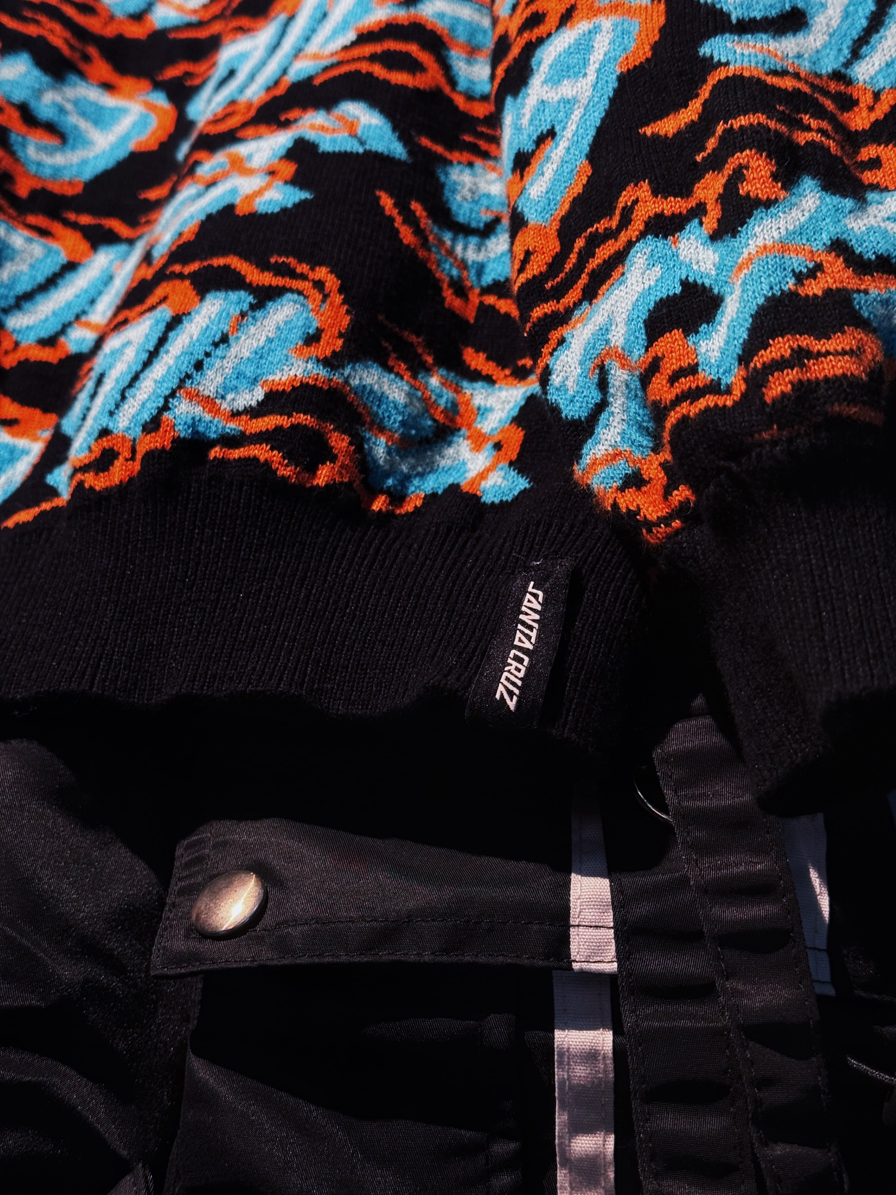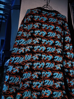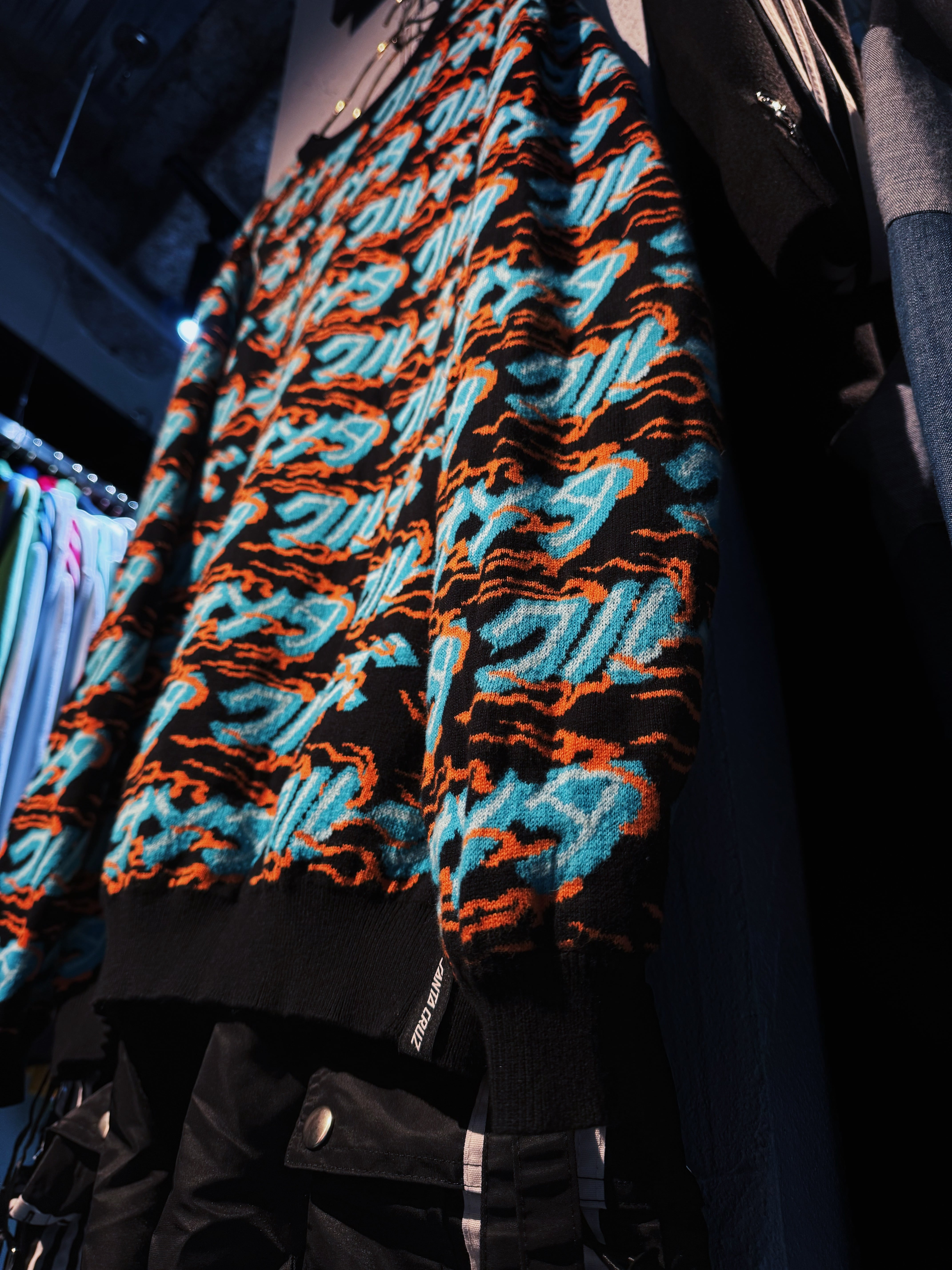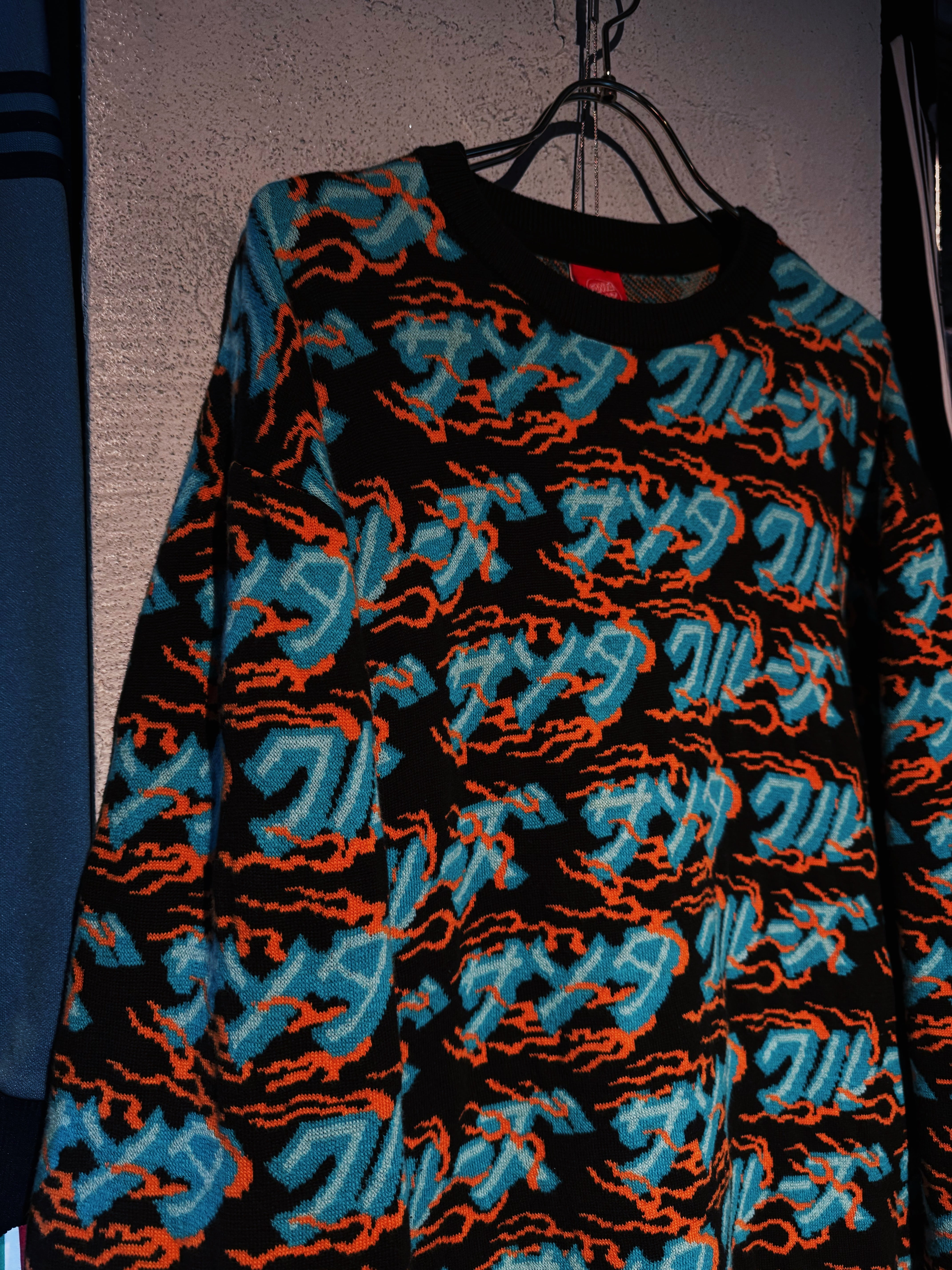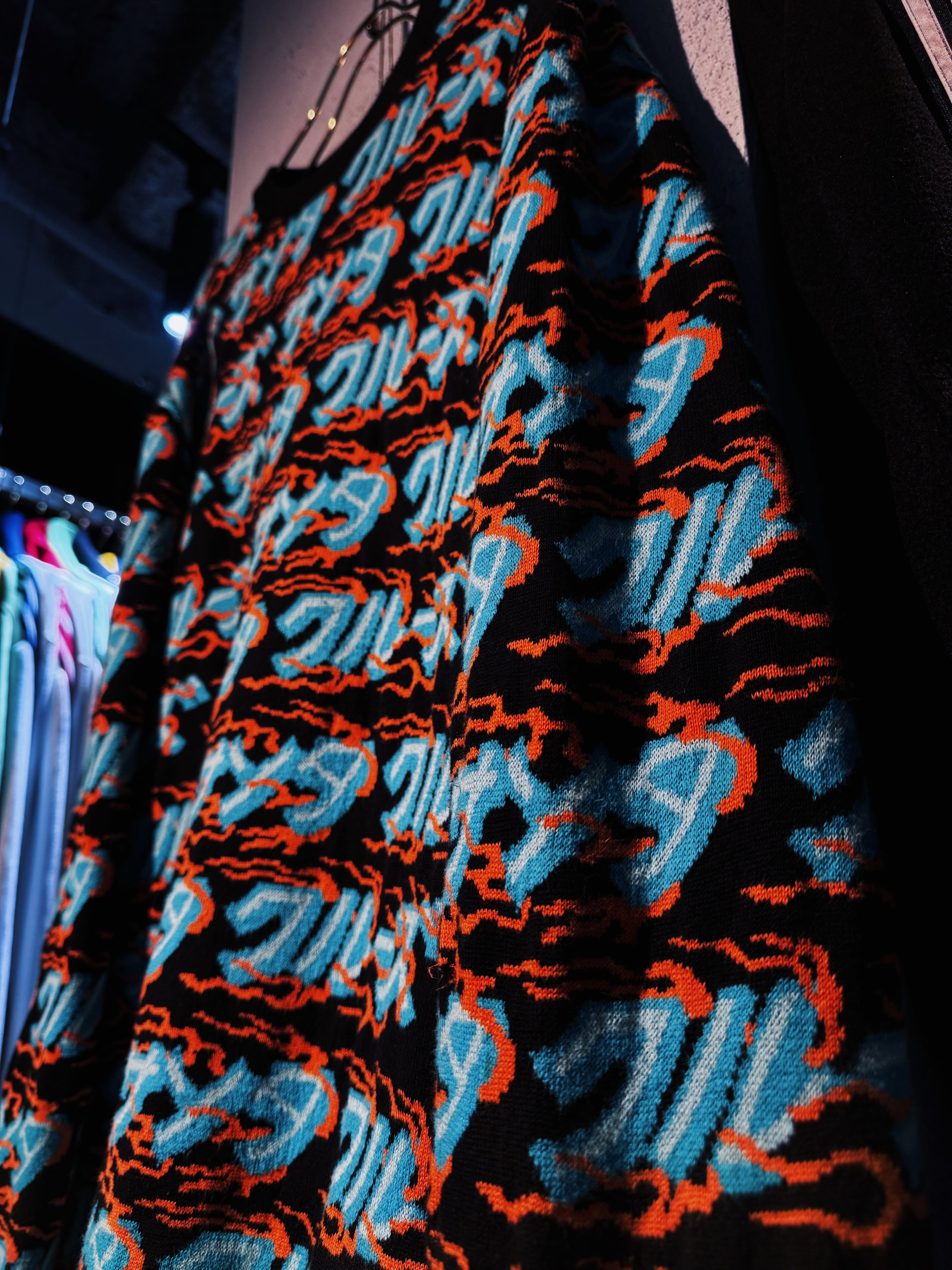 こちらはカタカナでブランド名をあしらった総柄ニット。ファイヤーパターンのような柄もいいですね。