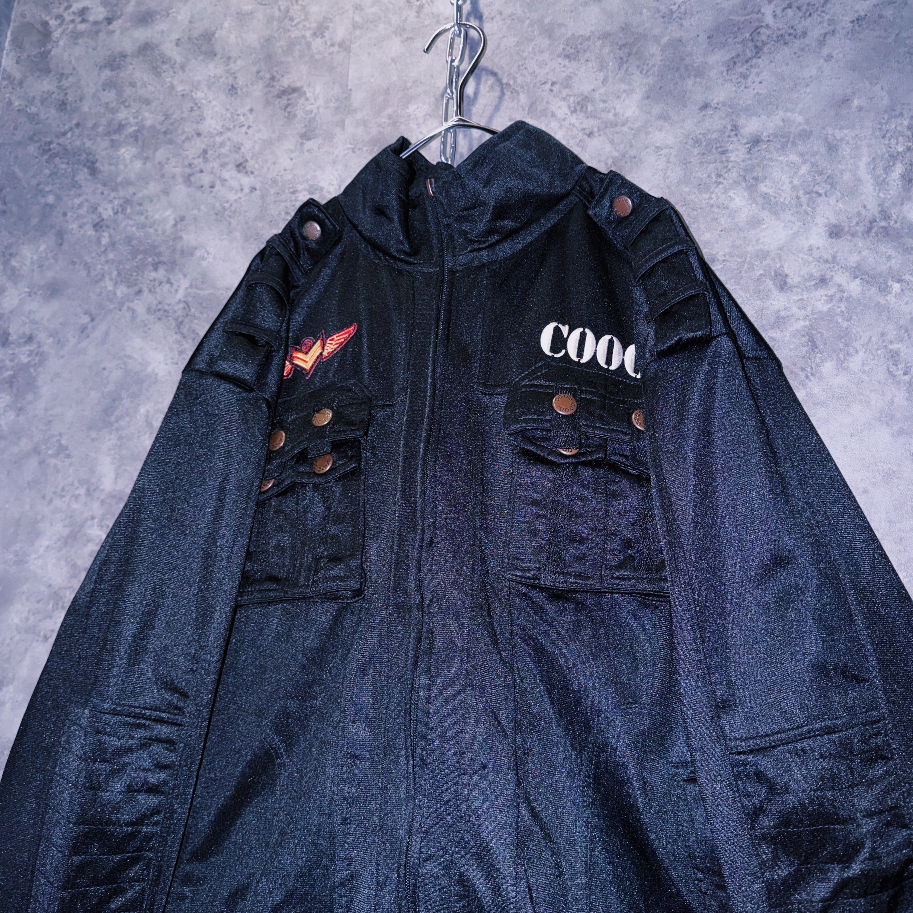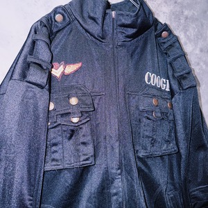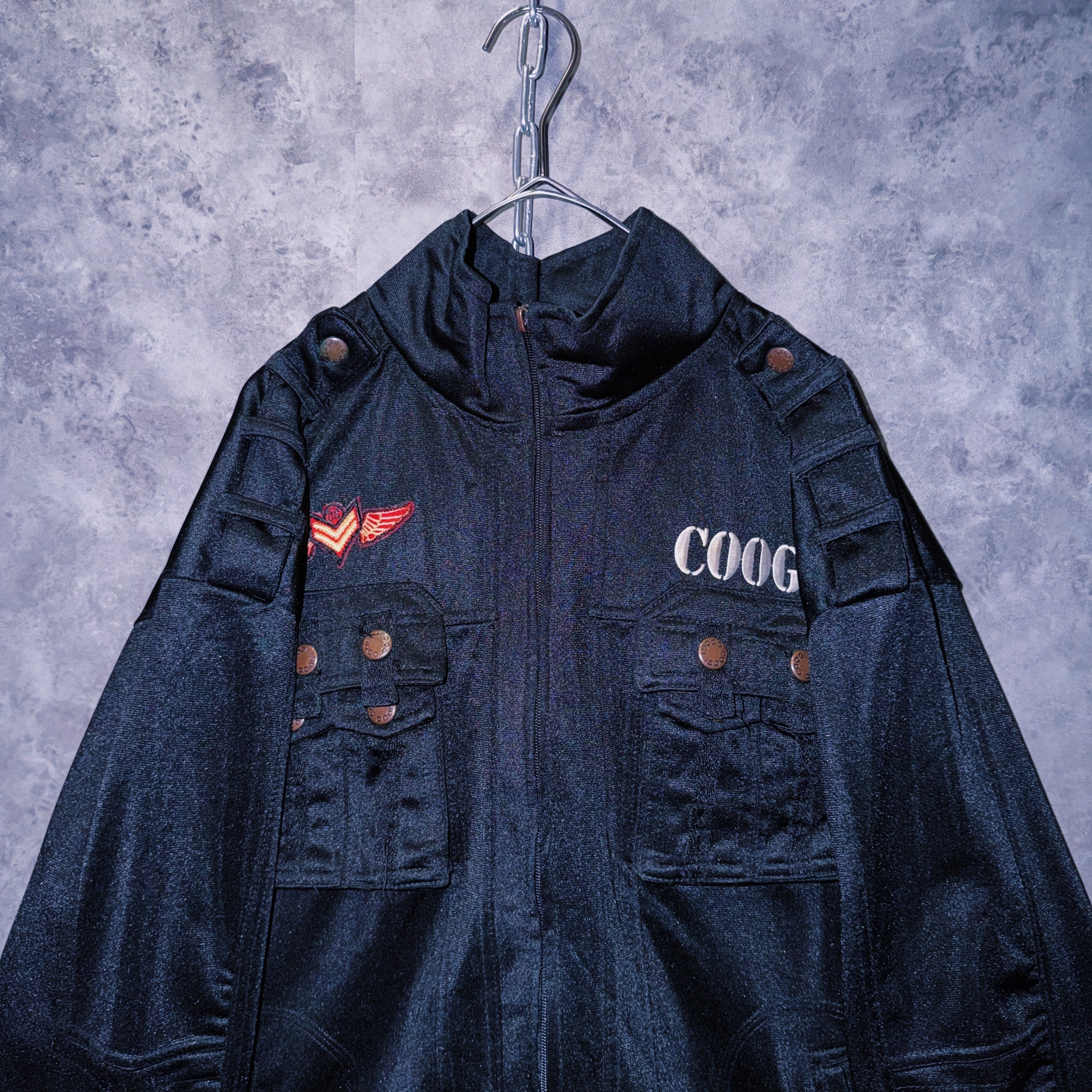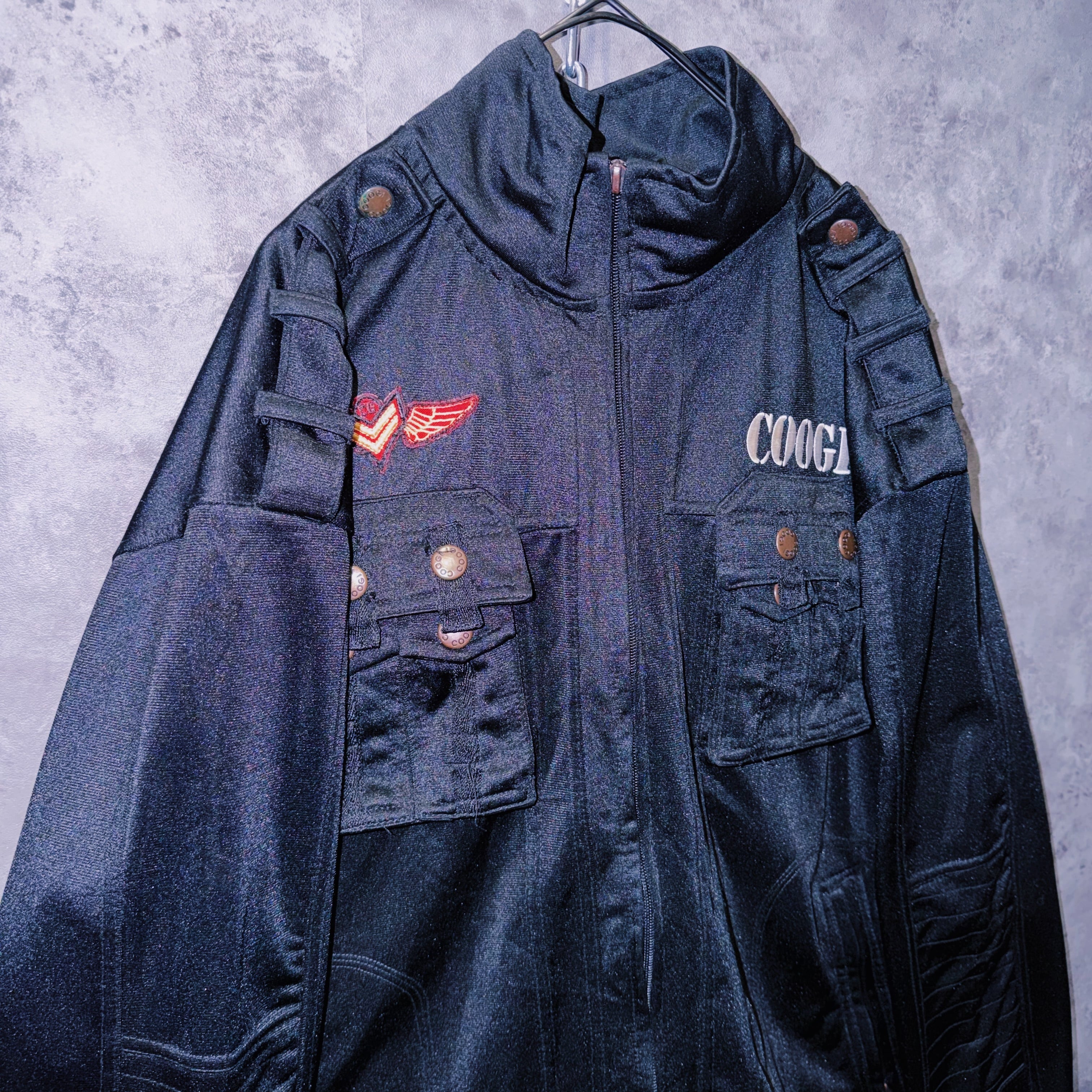 光沢のあるブラックカラーをベースに胸元には堂々と“COOGI”のロゴデザインが刺繍で施されています。肩のディテールやカーゴのようなポケットが施されたことでどこかポリス感の漂う強い印象。