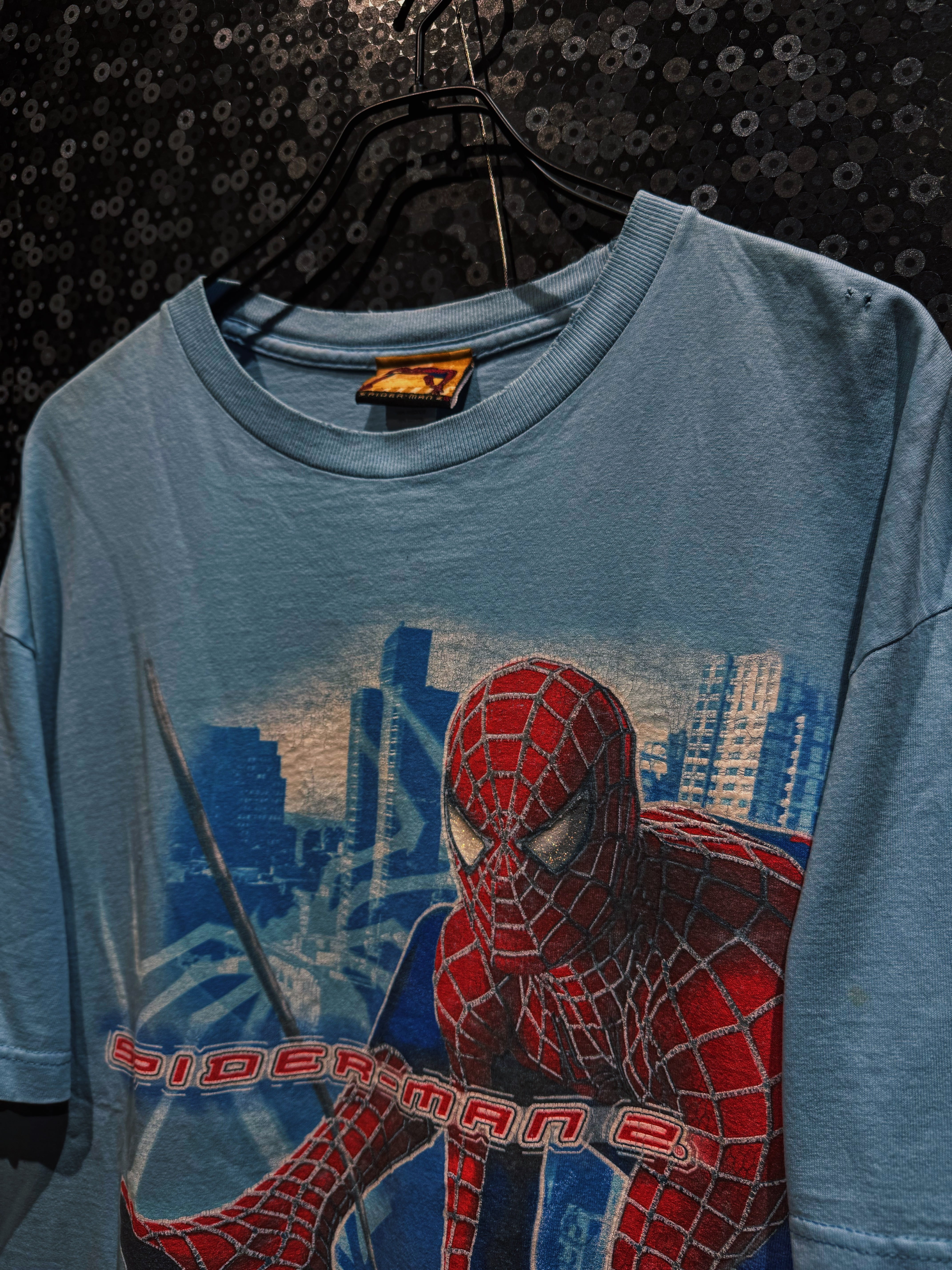 映画スパイダーマン2のプロモ系グラフィック。街を背景にスパイディが飛び出してくるこの構図、当時の空気そのまま詰まってるやつ。