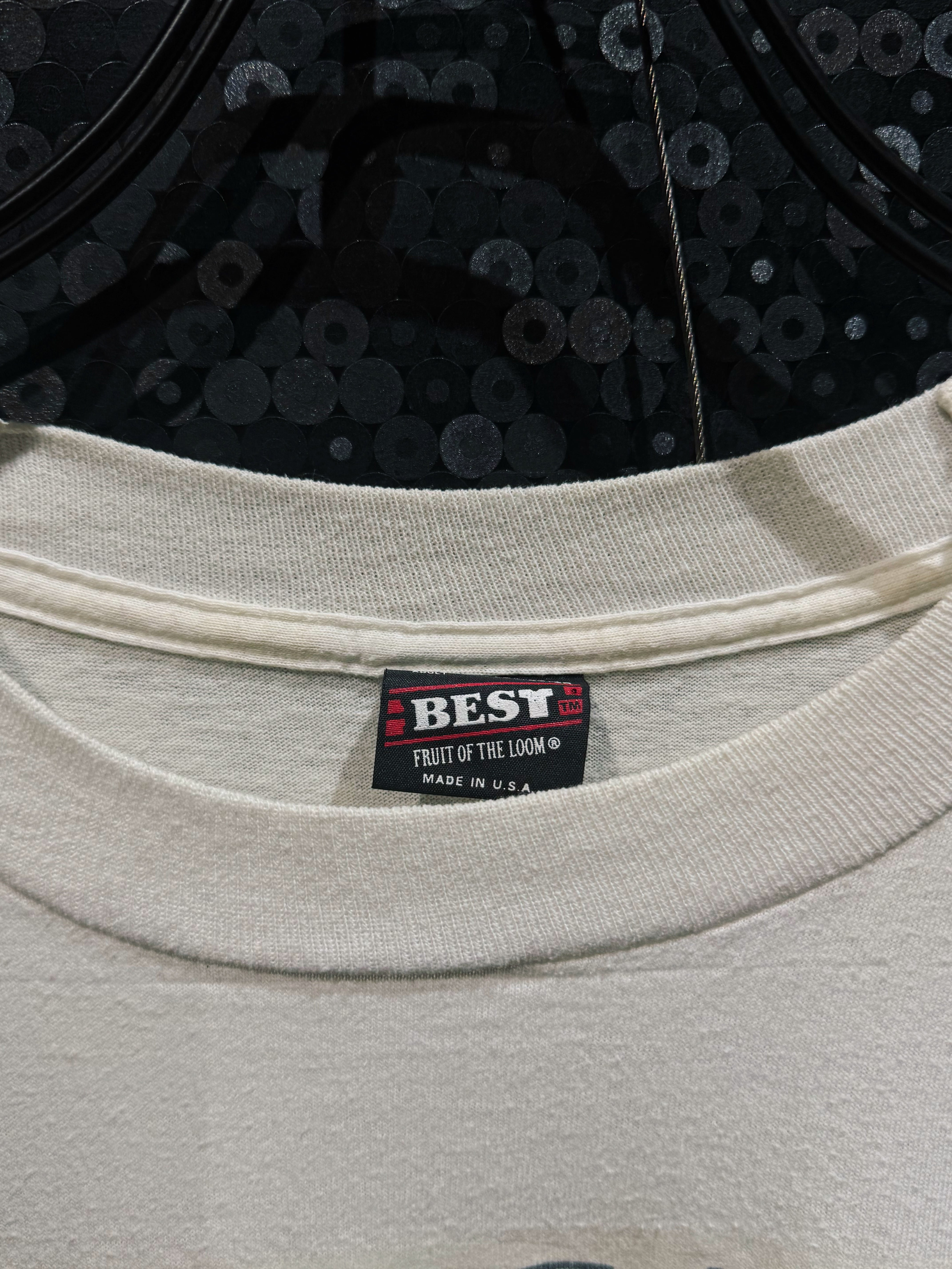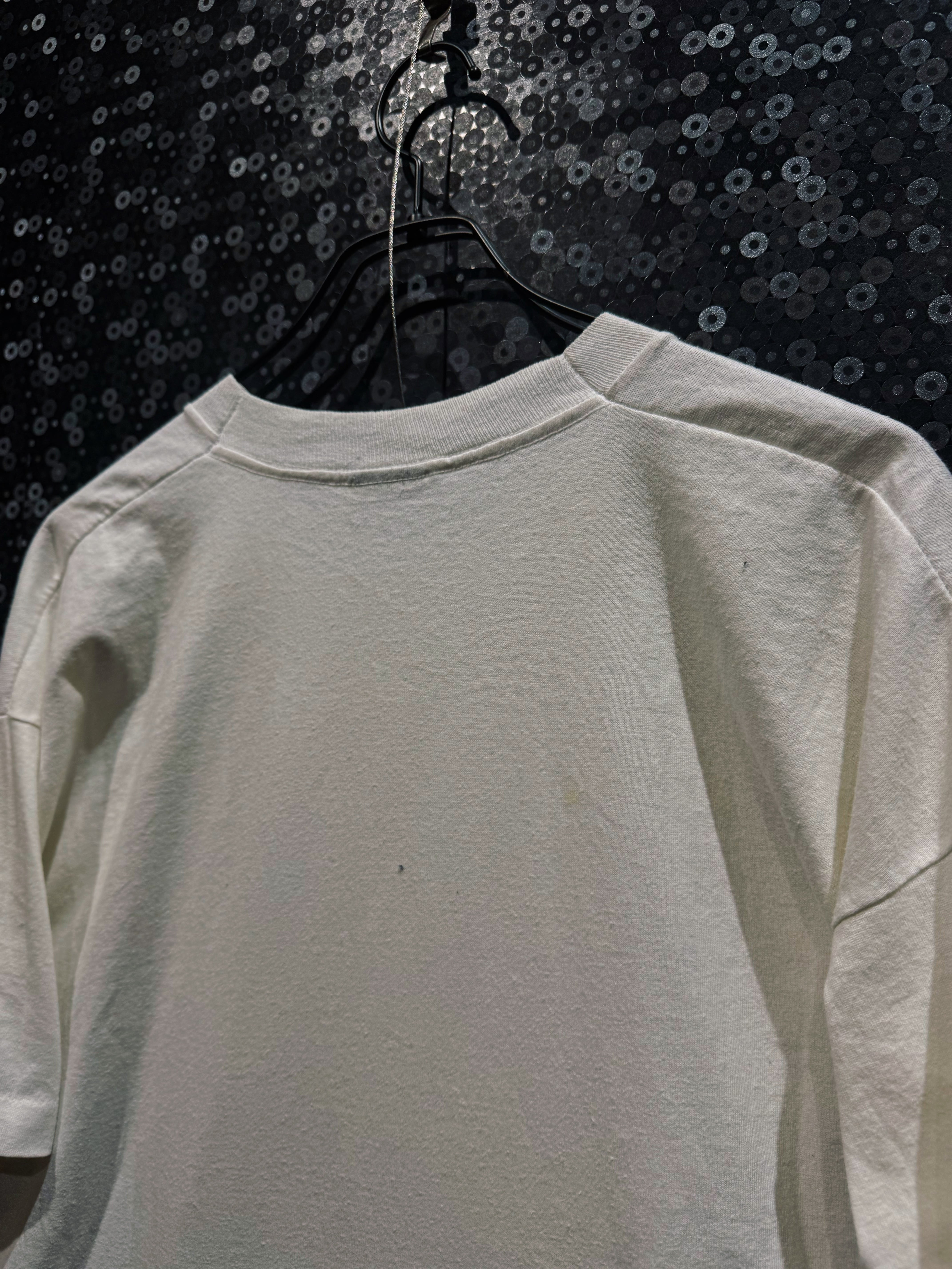 ボディはFRUIT OF THE LOOMのUSA製。少しフェードしたホワイトに、プリントの擦れた風合いが乗っていて、リアルなヴィンテージ感がしっかり出てる。