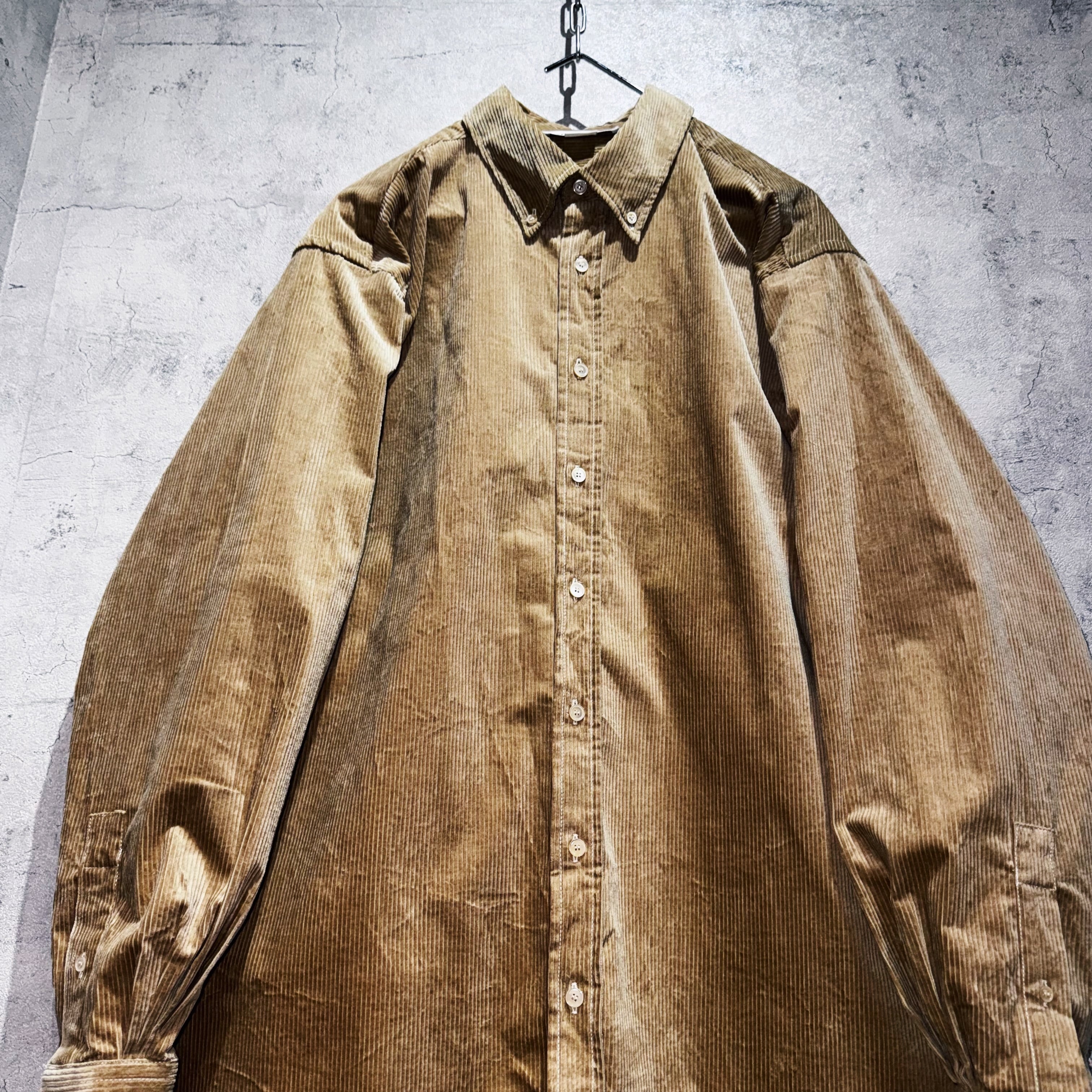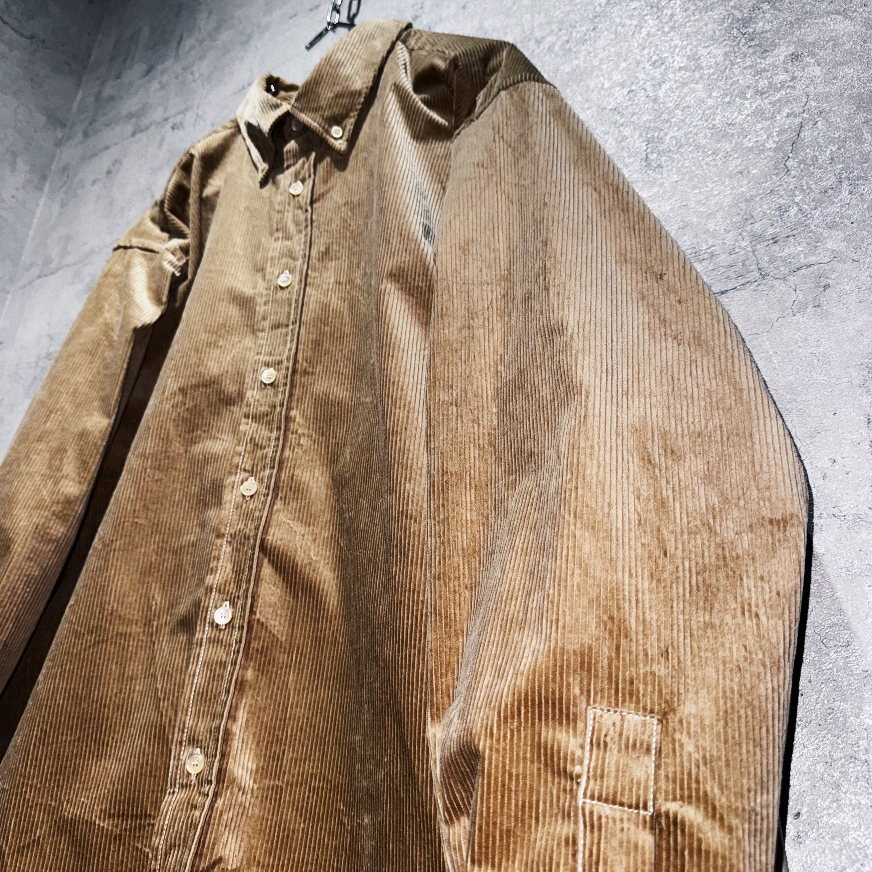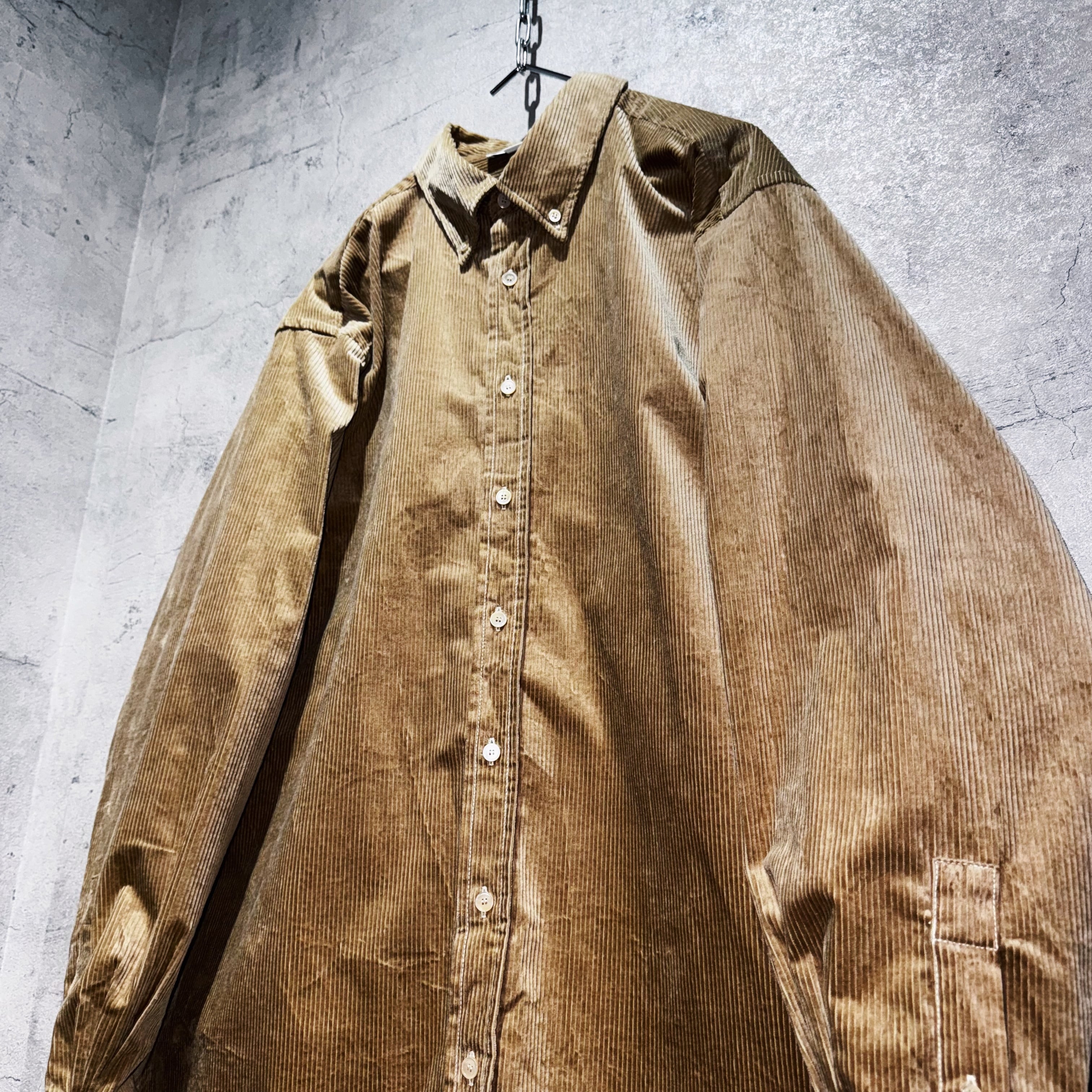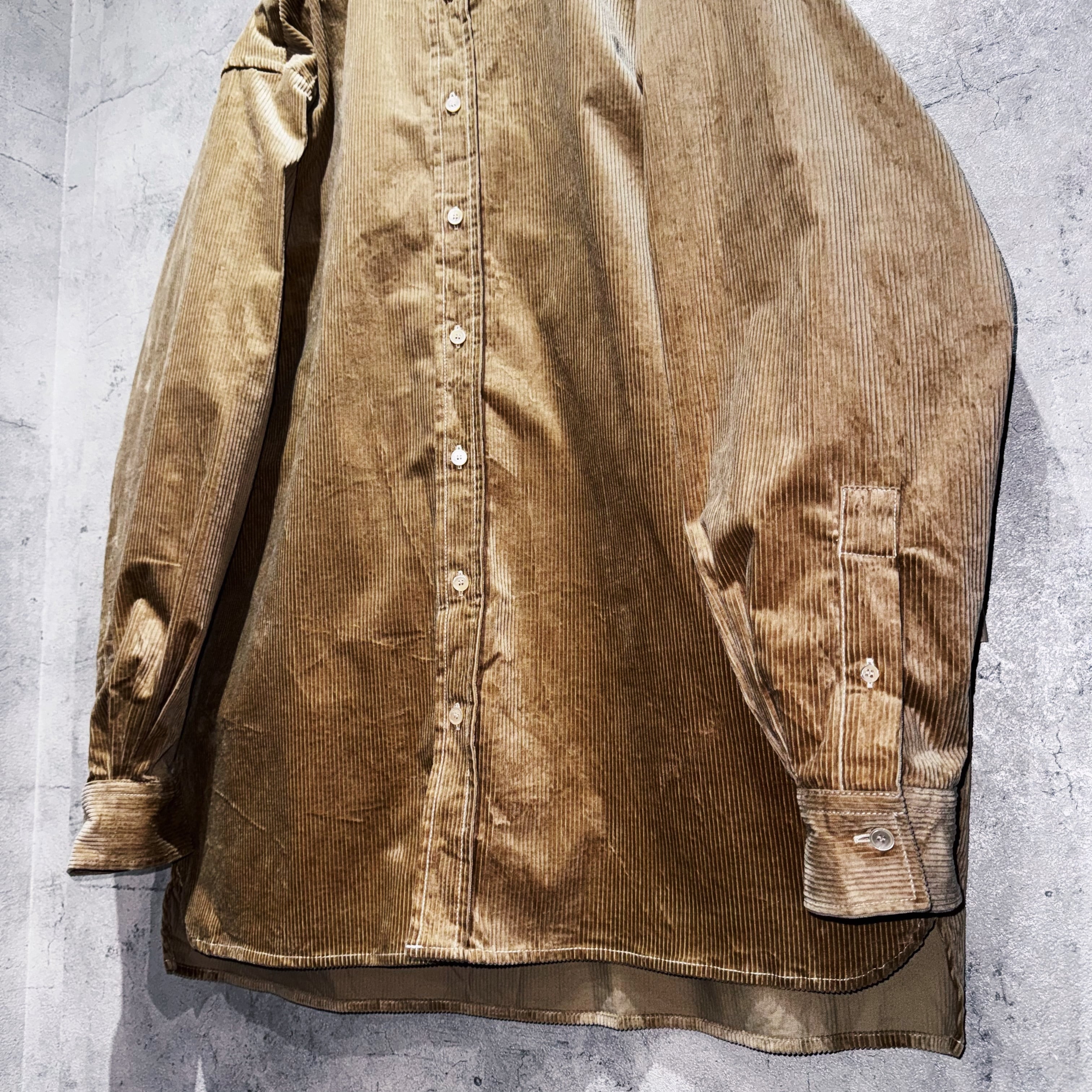 品格のあるベージュカラーを身に纏ったコーデュロイ素材のシャツ。一見普遍的ですがコーデュロイの立体感や光沢で存在感を演出した素晴らしい一枚。