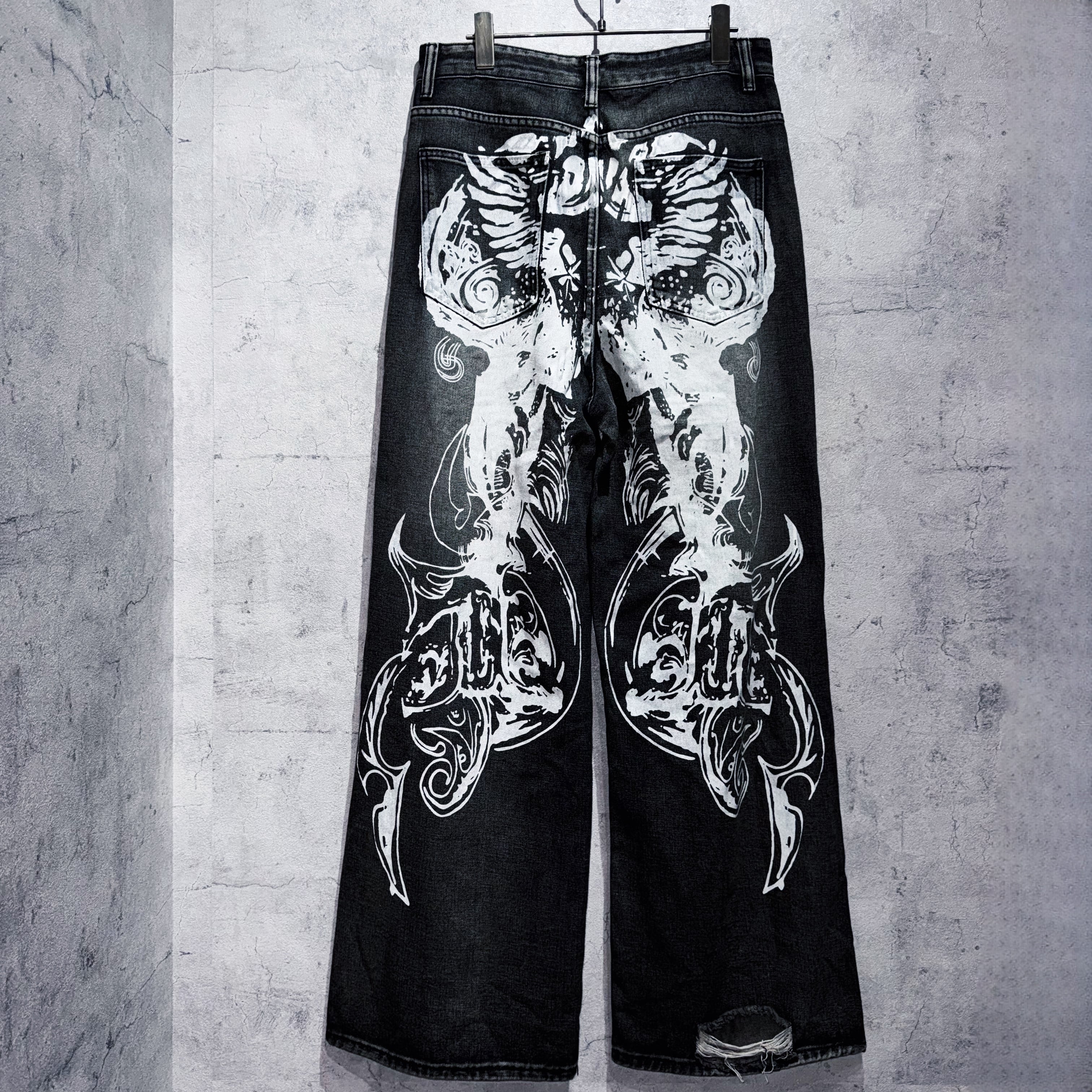トライバルグラフィッククラッシュデザインフェードブラックデニムパンツ