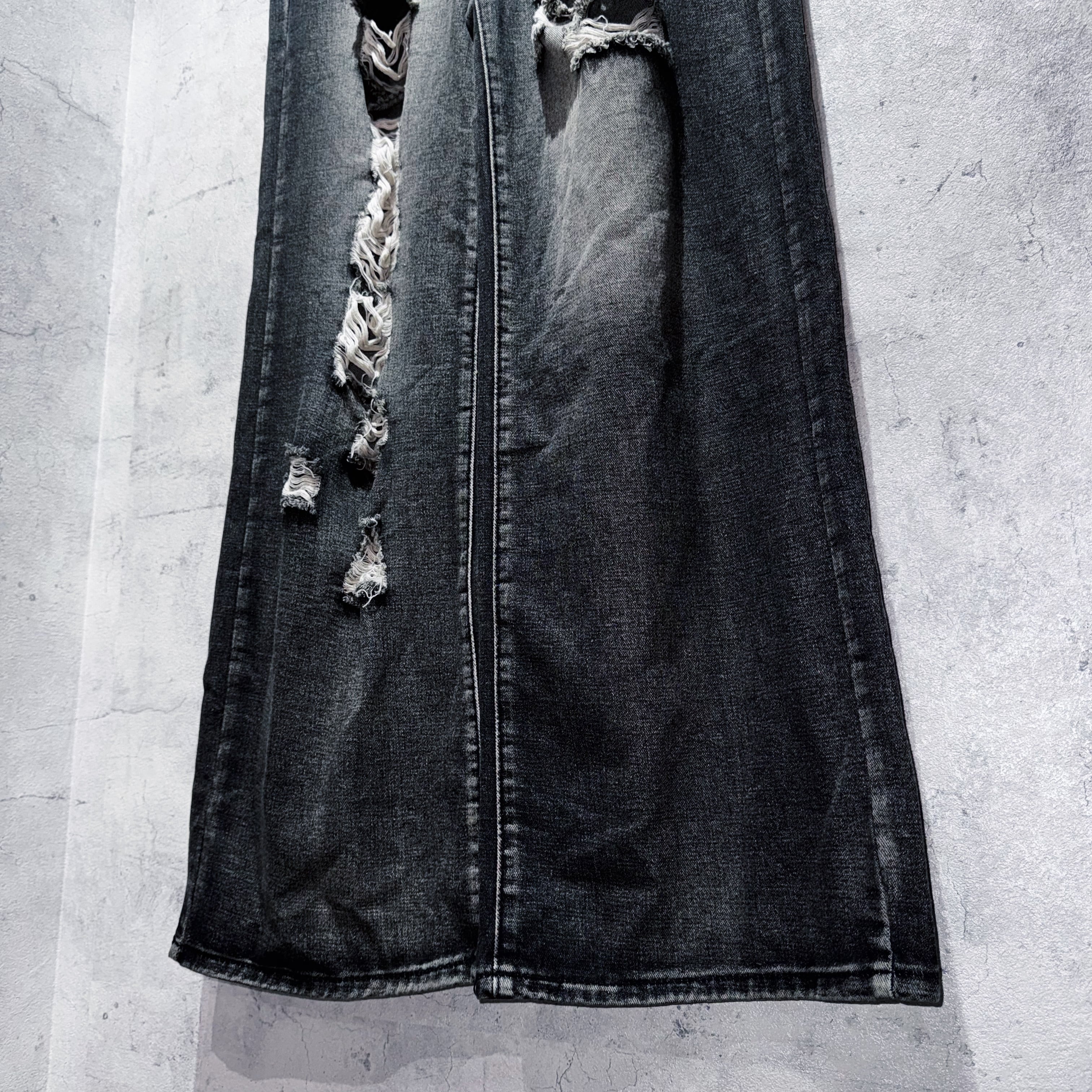 フロントはフェードの効いたブラックデニムに、計算されたクラッシュ加工。