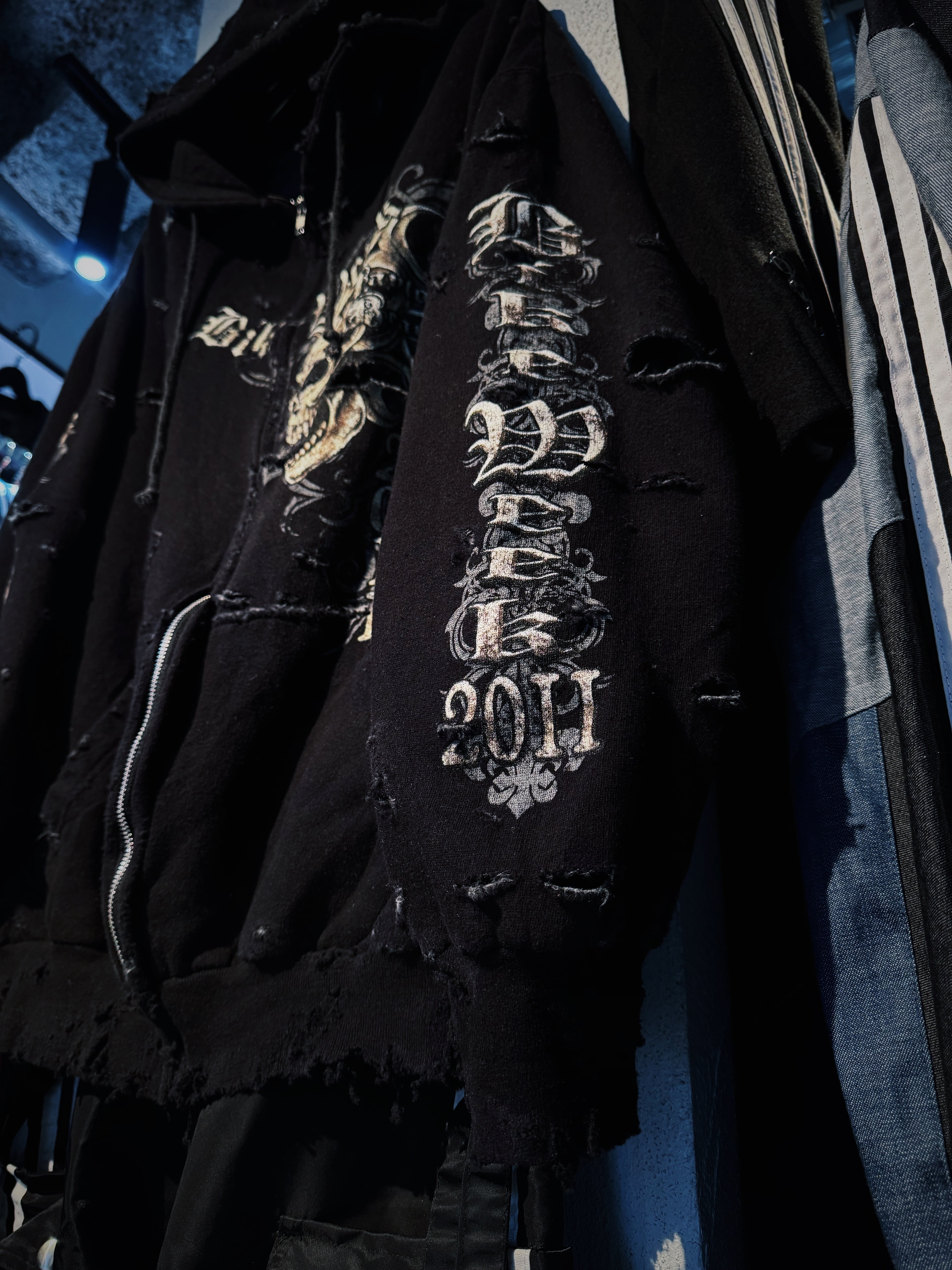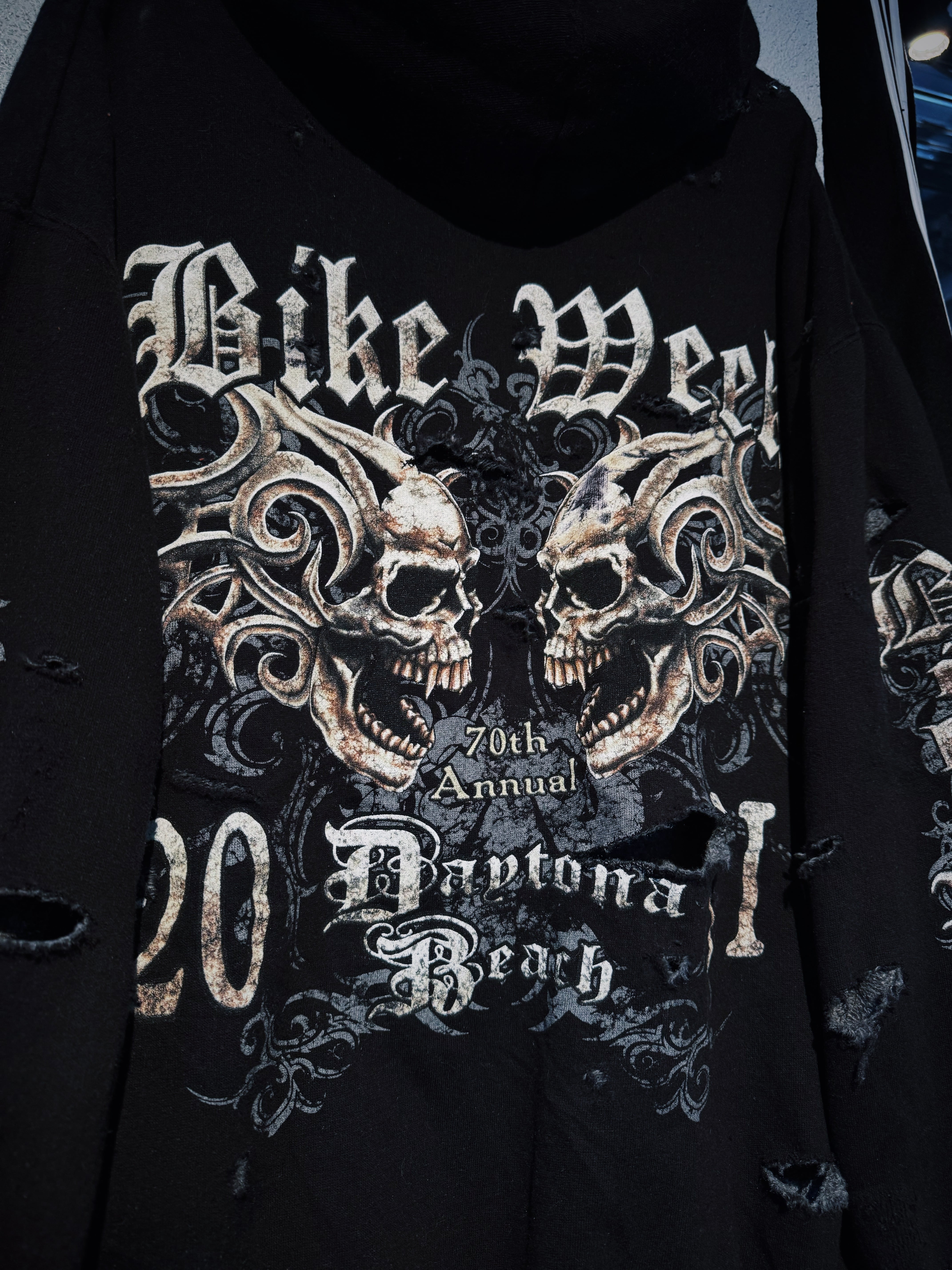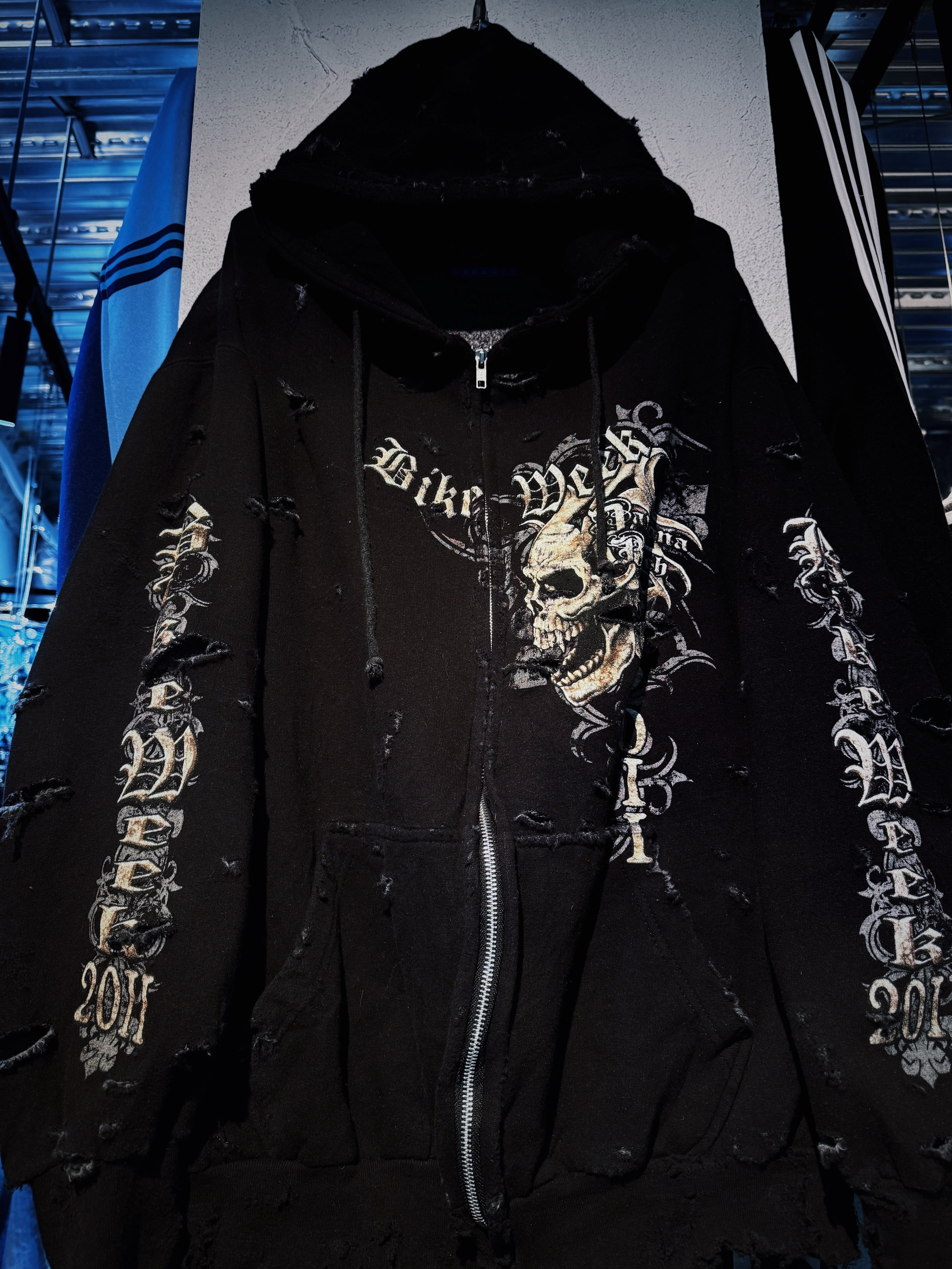 オリジナルリメイクスカルグラフィックデザインボロカスタムジップフーディー
