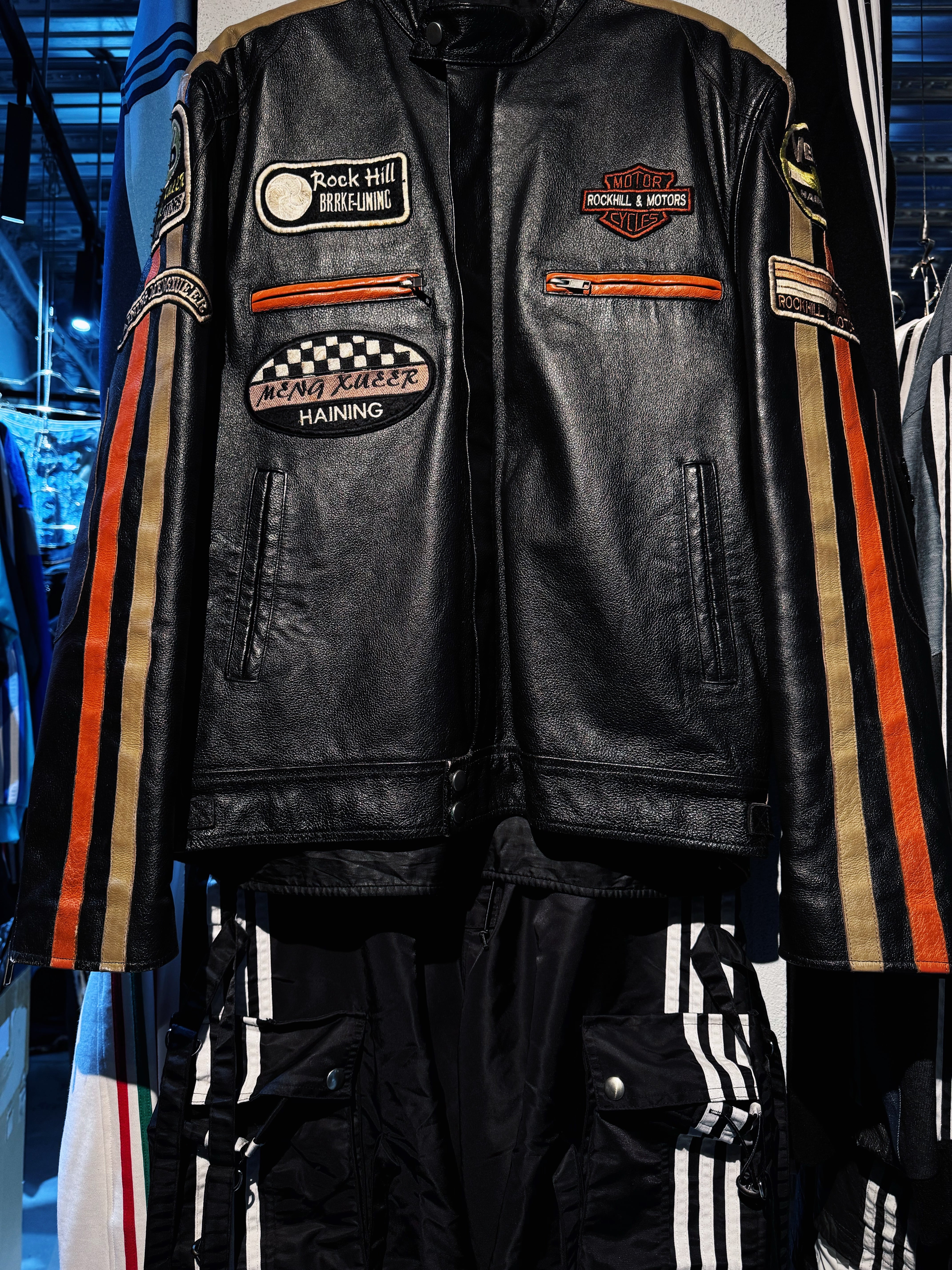 写真からでも伝わってくる高級感と重厚感を兼ね備えたリアルレザーのボディに、レースに因んだワッペンデザインをあしらったレーシングジャケット。