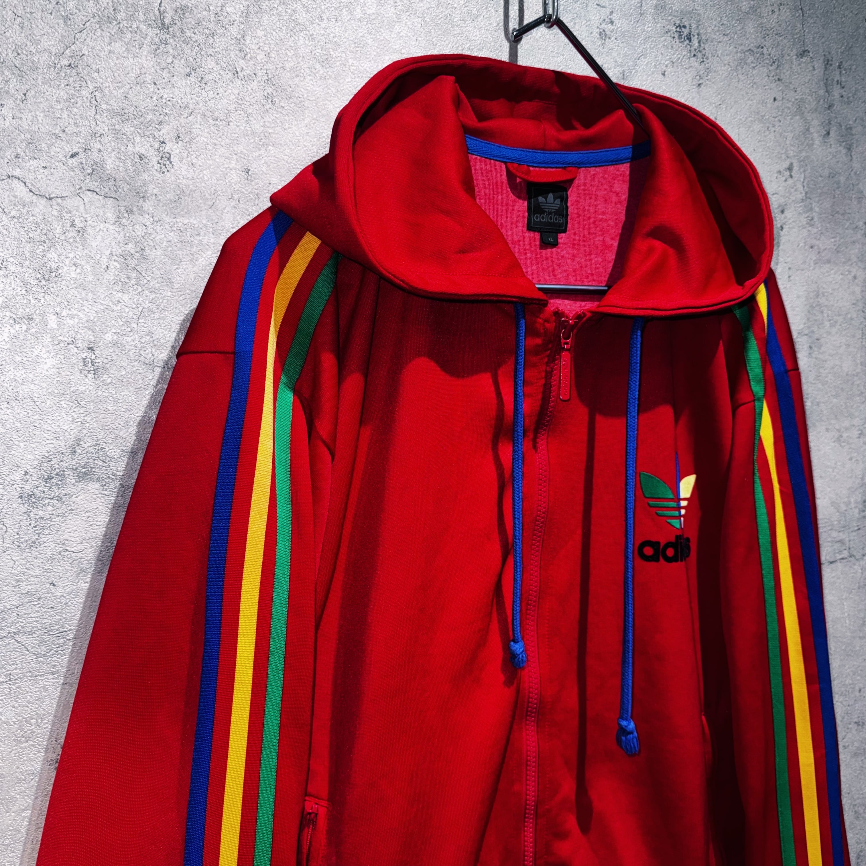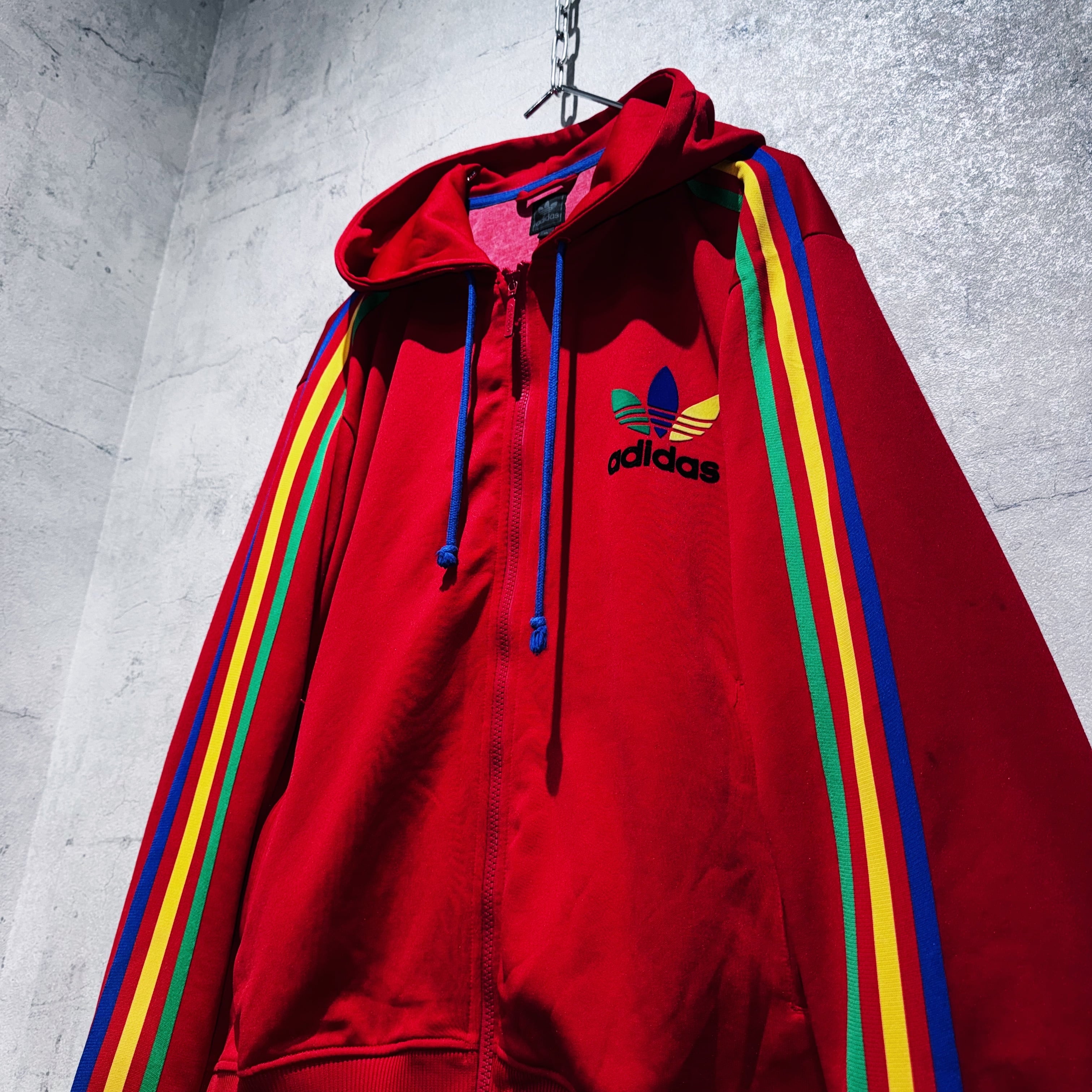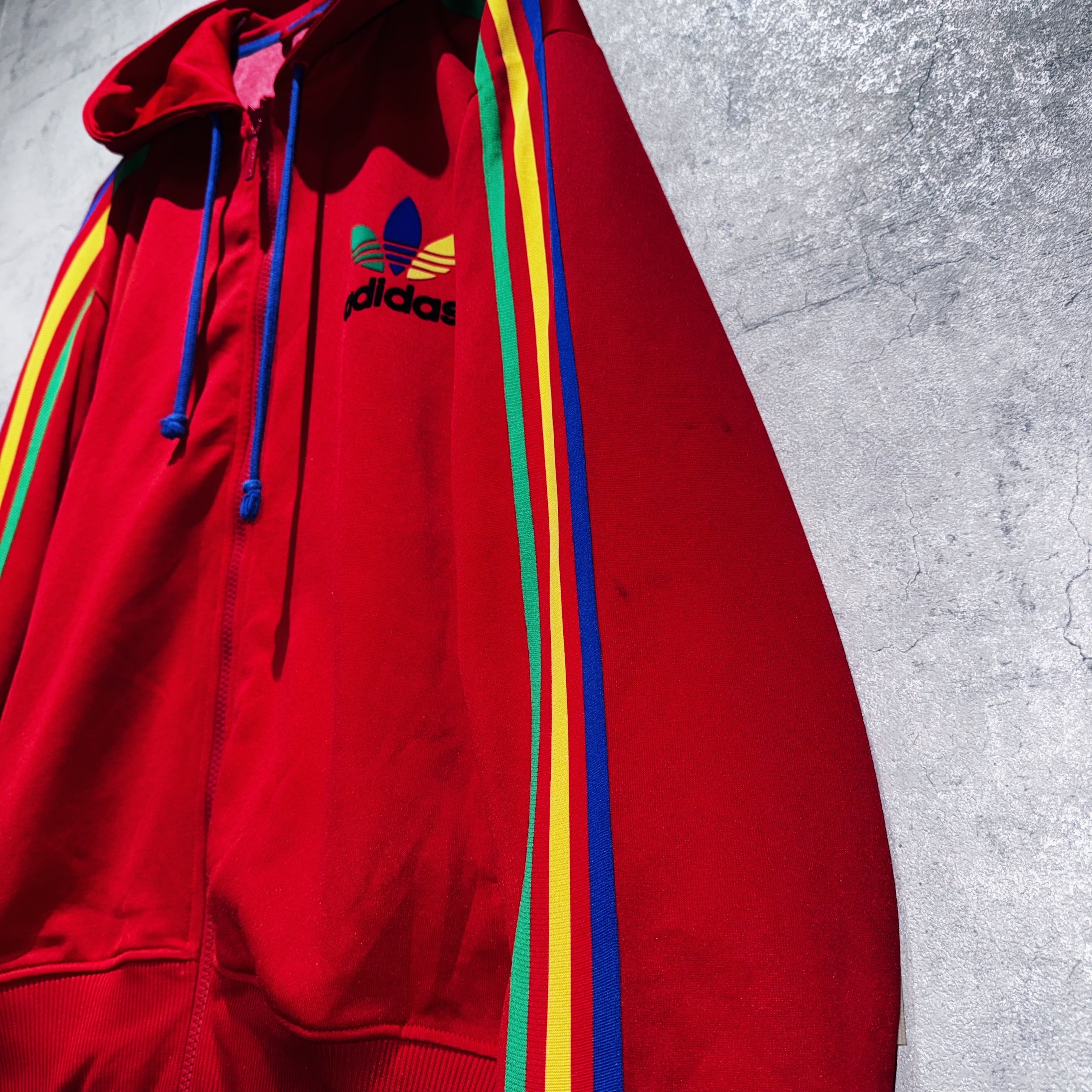 "ADIDAS"のジャージでは珍しいフードタイプのトラックジャケット。真っ赤なボディに3ストライプスとトレフォイルロゴをあしらった無駄のないベーシックデザイン。