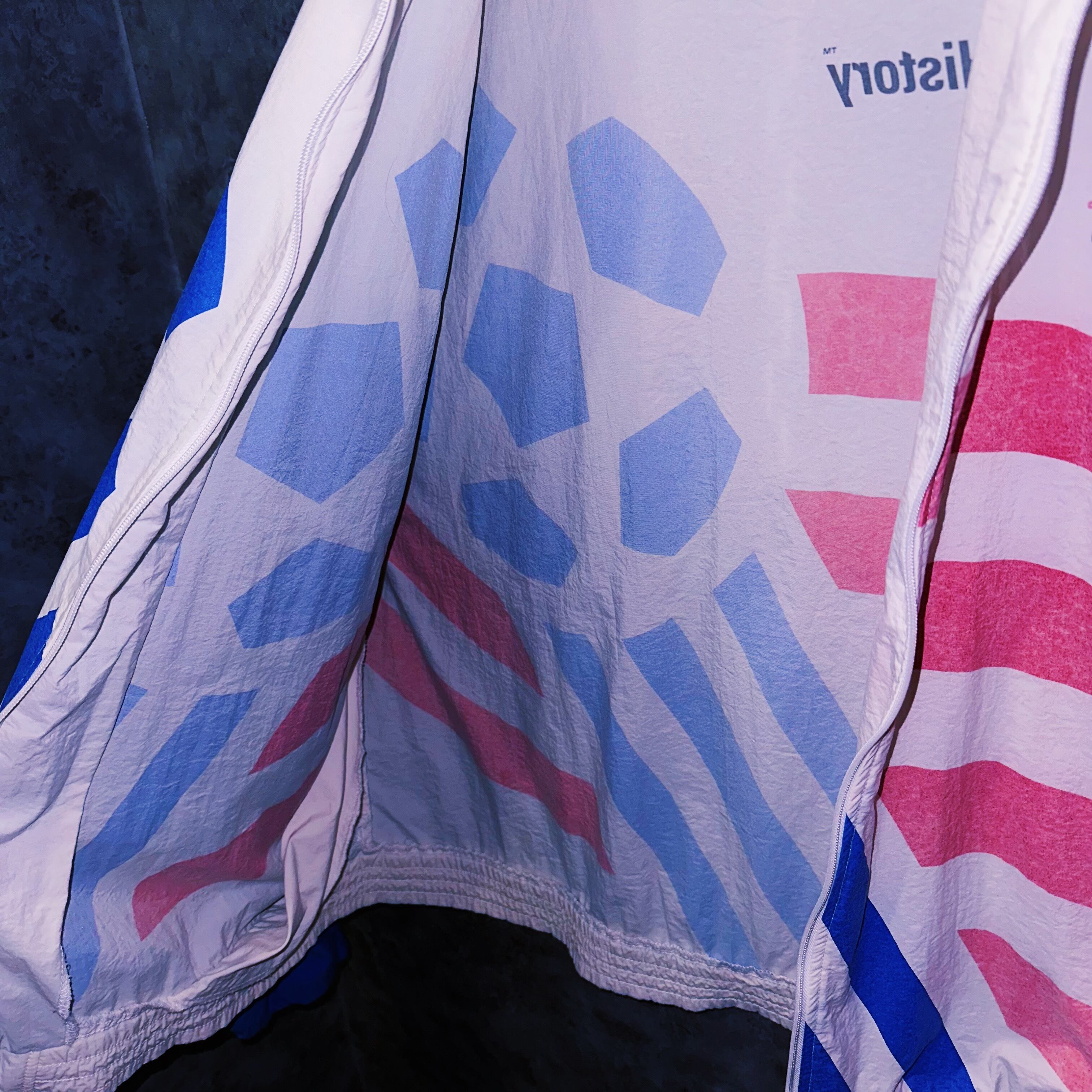 オフホワイトカラーに星条旗のデザインが落とし込まれたナイロントラックジャケット。