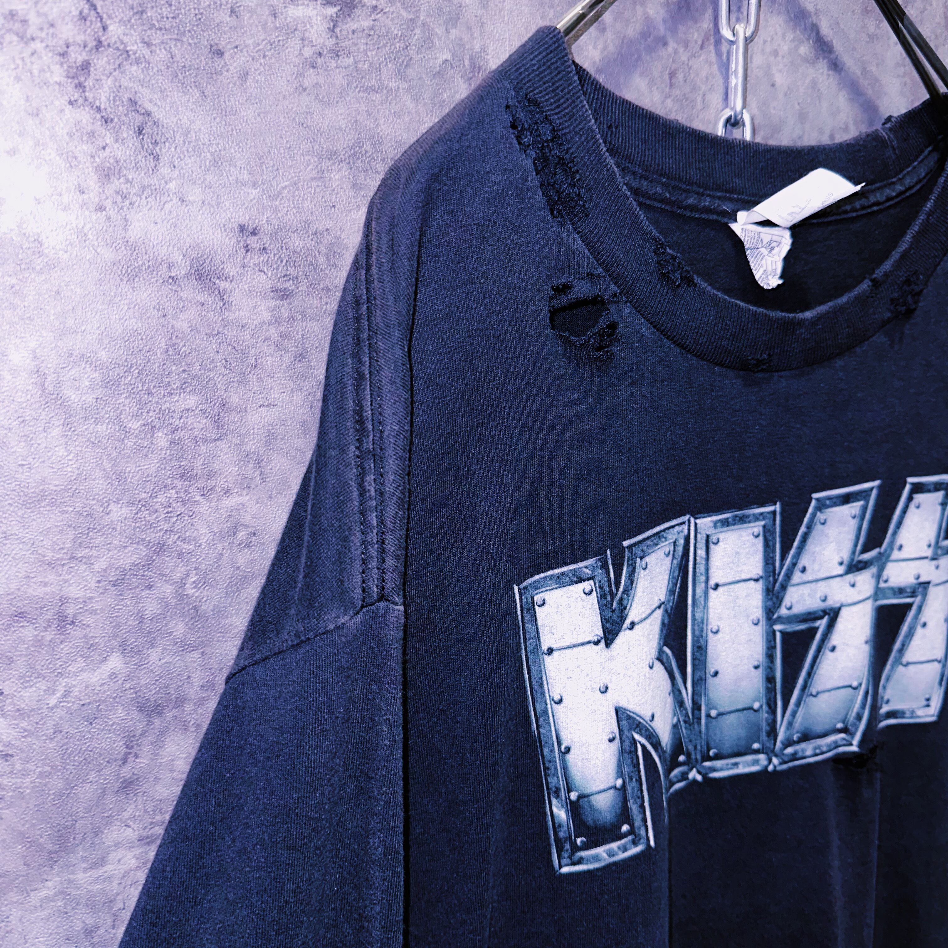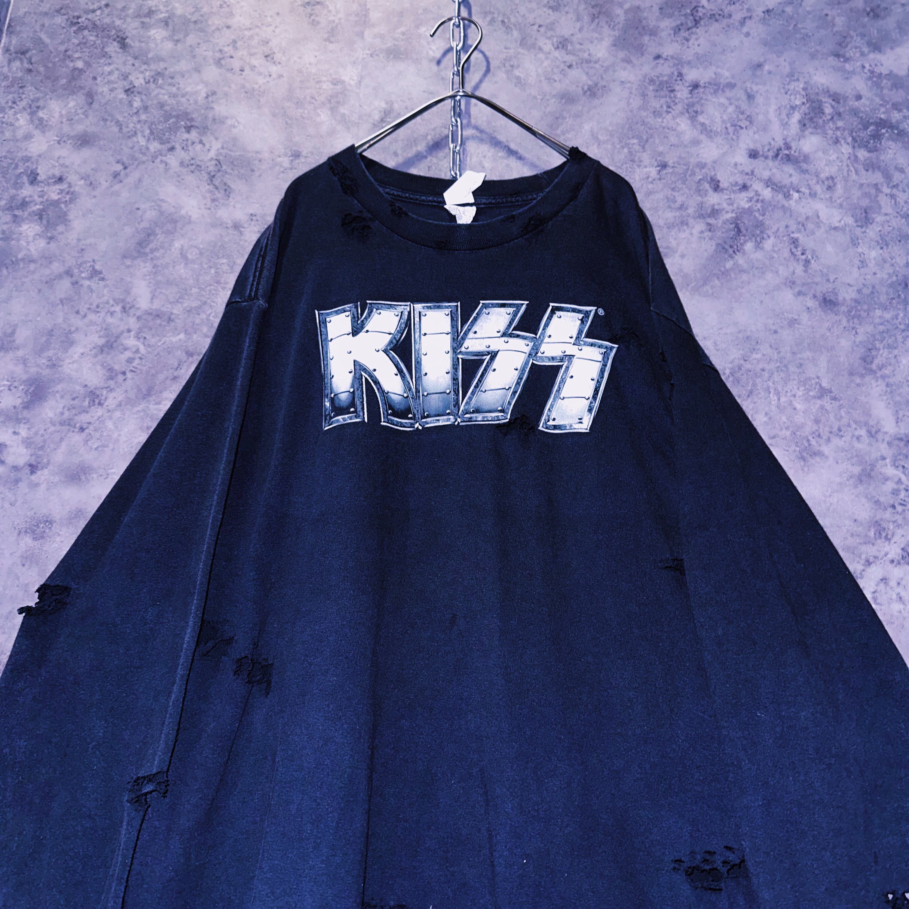 ヴィンテージ"KISS"ロゴプリントデザインボロカスタムロングTシャツ