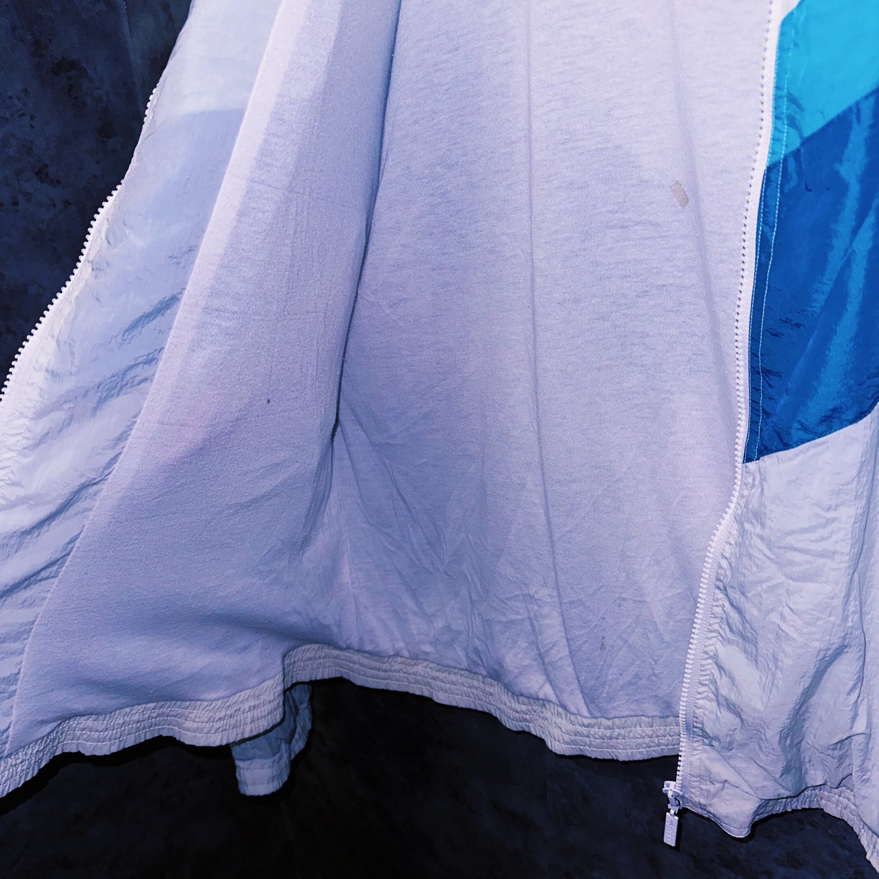 トラックジャケットではあまり少ないホワイトカラーのボディーにアイスブルーとピンクの切り替えがデザインされたポップな1着。