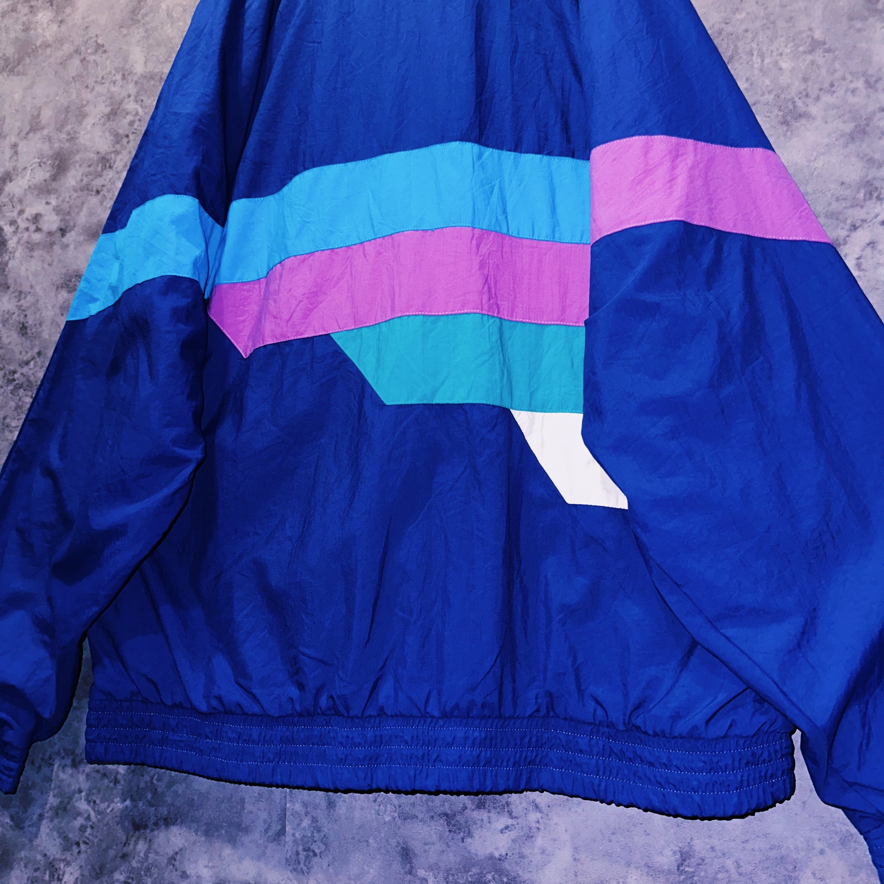 マルチな配色で全く見かけない、ネイビーにパープルやターコイズなどのビビットなカラーリングが特徴的でどこか近未来感もある1着。
