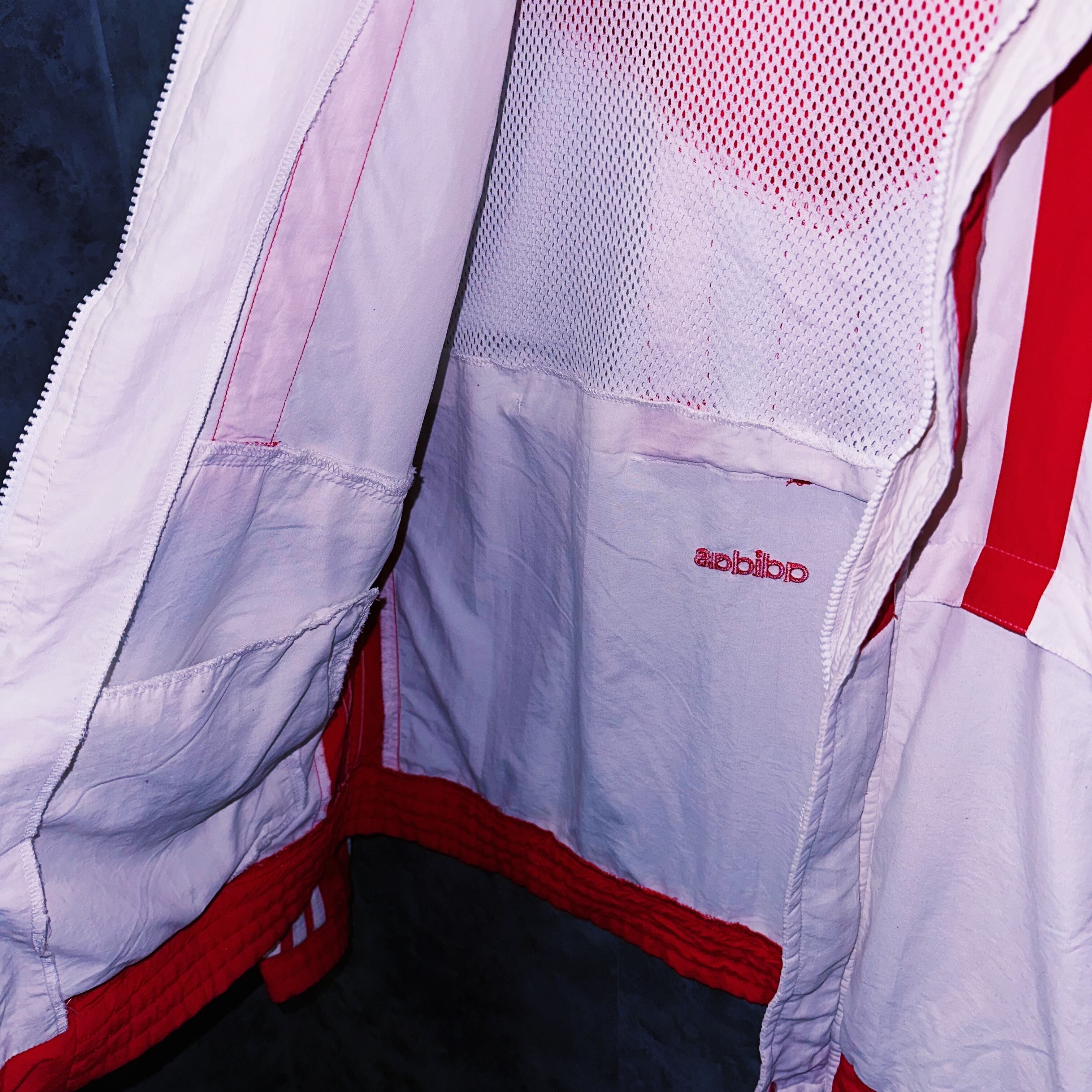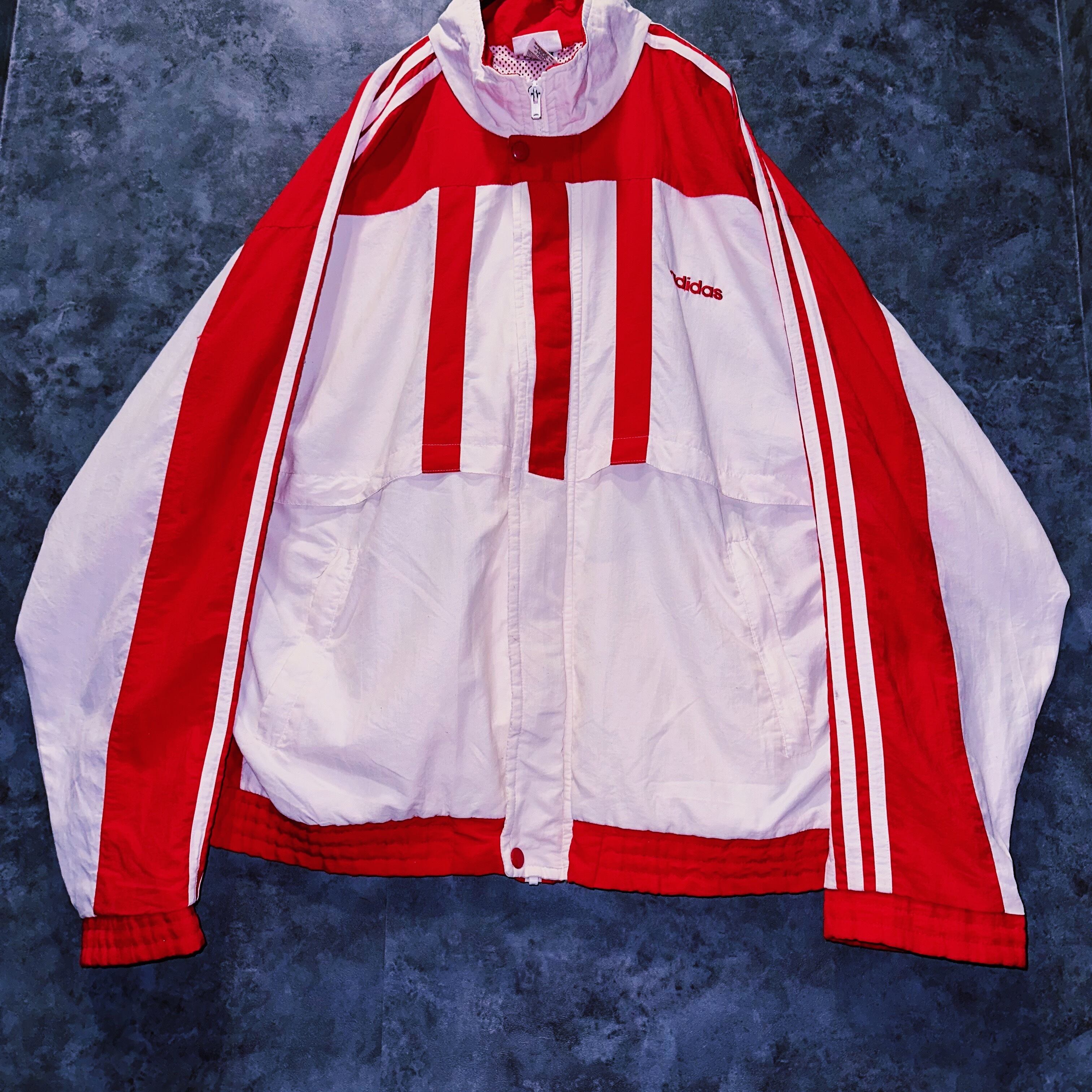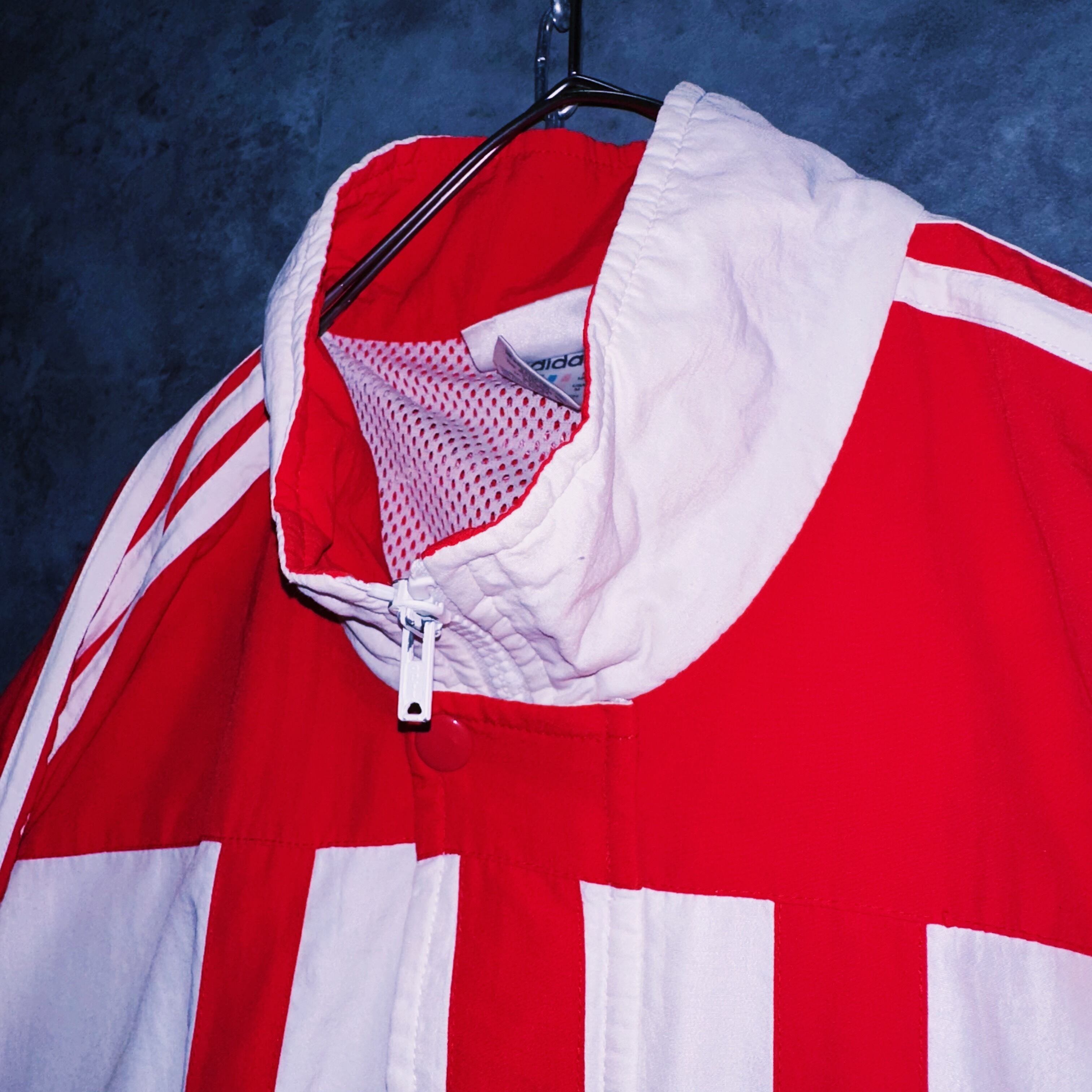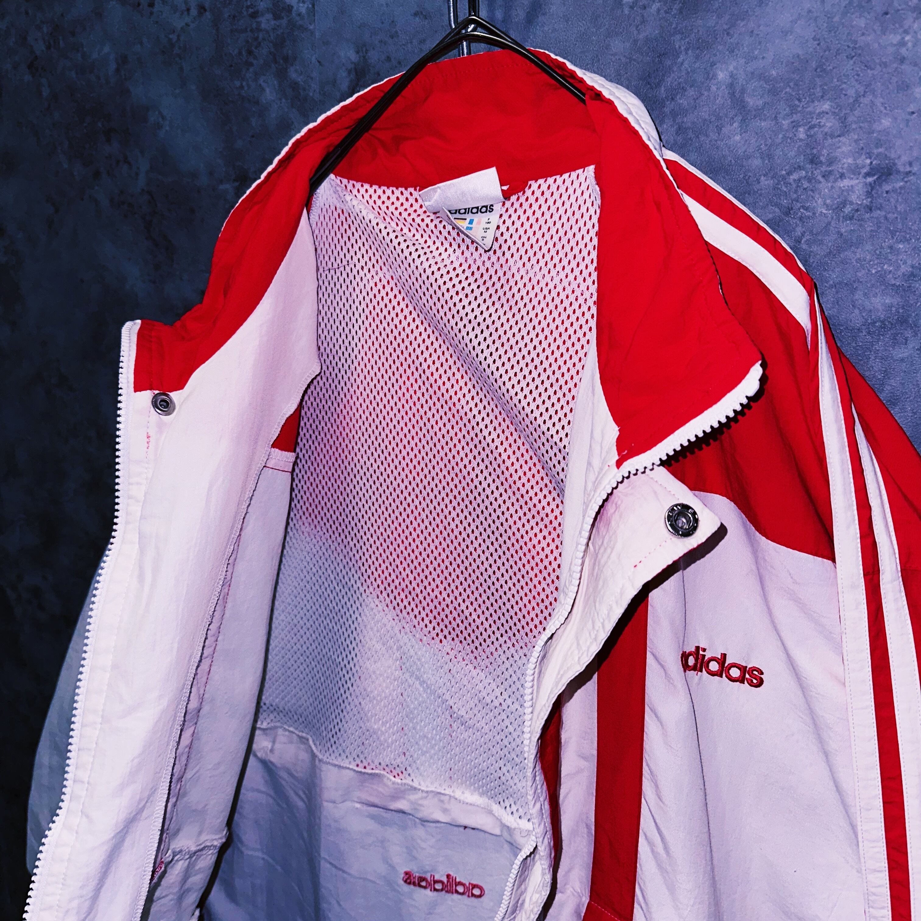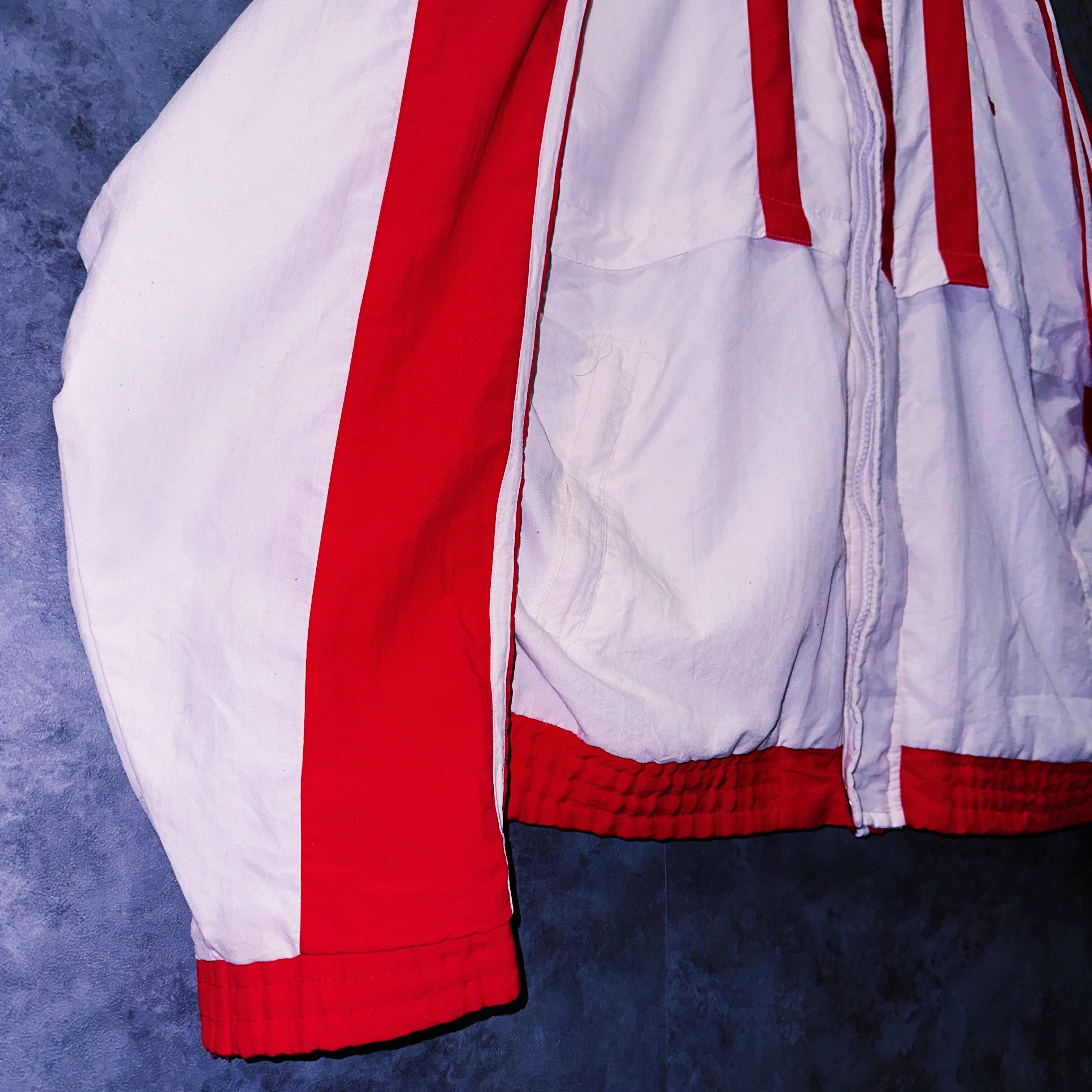 圧巻の光沢感を感じるホワイトとレッドベースのトラックジャケット。近年ではなかなか無いレアカラーでさらには程よいスリーストライプやスウィッチングが目に行く鮮やかなディテールの1着。