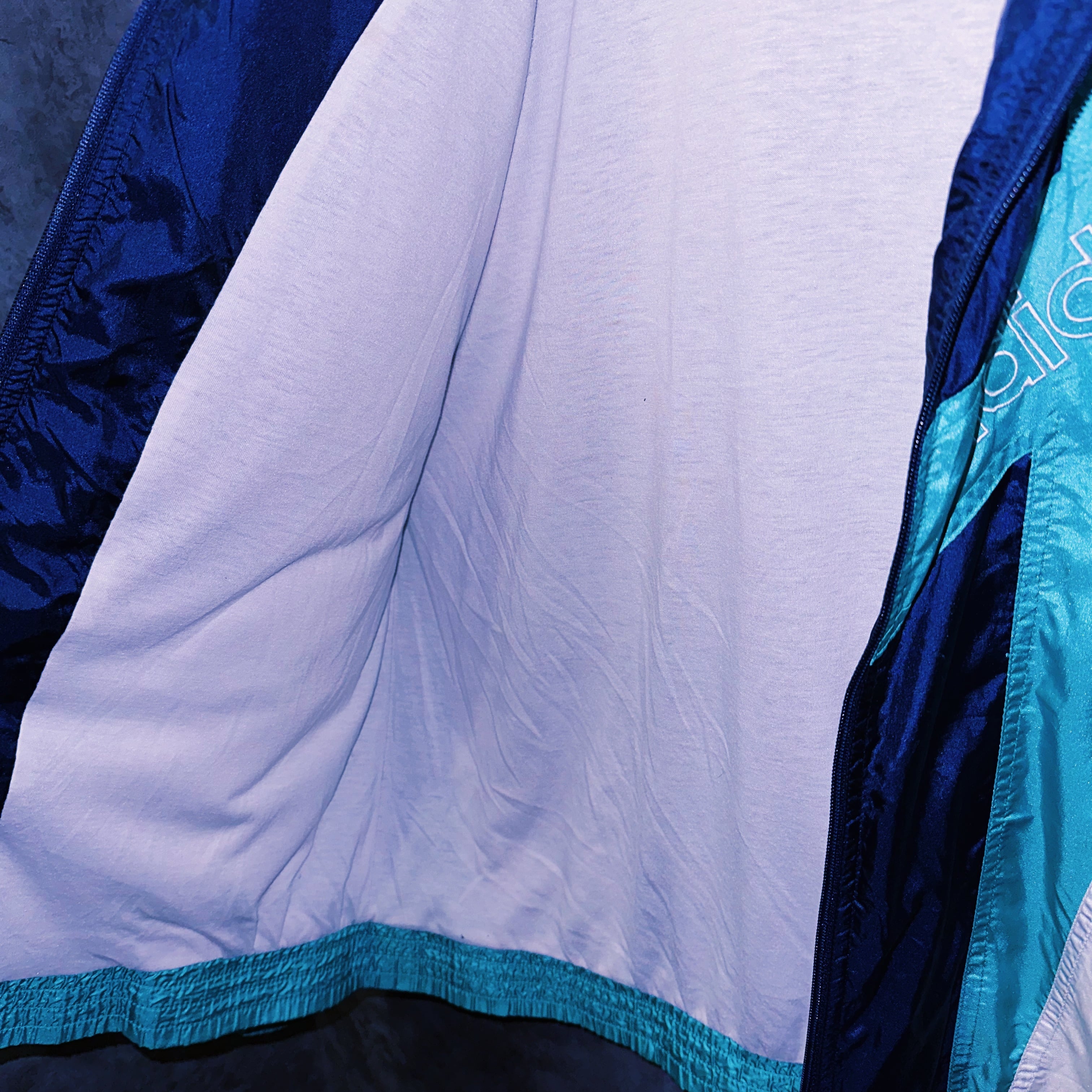マルチな配色で全く見かけない、ホワイトにターコイズのカラーリングにエメラルドとブルーのスウィッチングでカラーリングが特徴的でどこか近未来感もある1着。