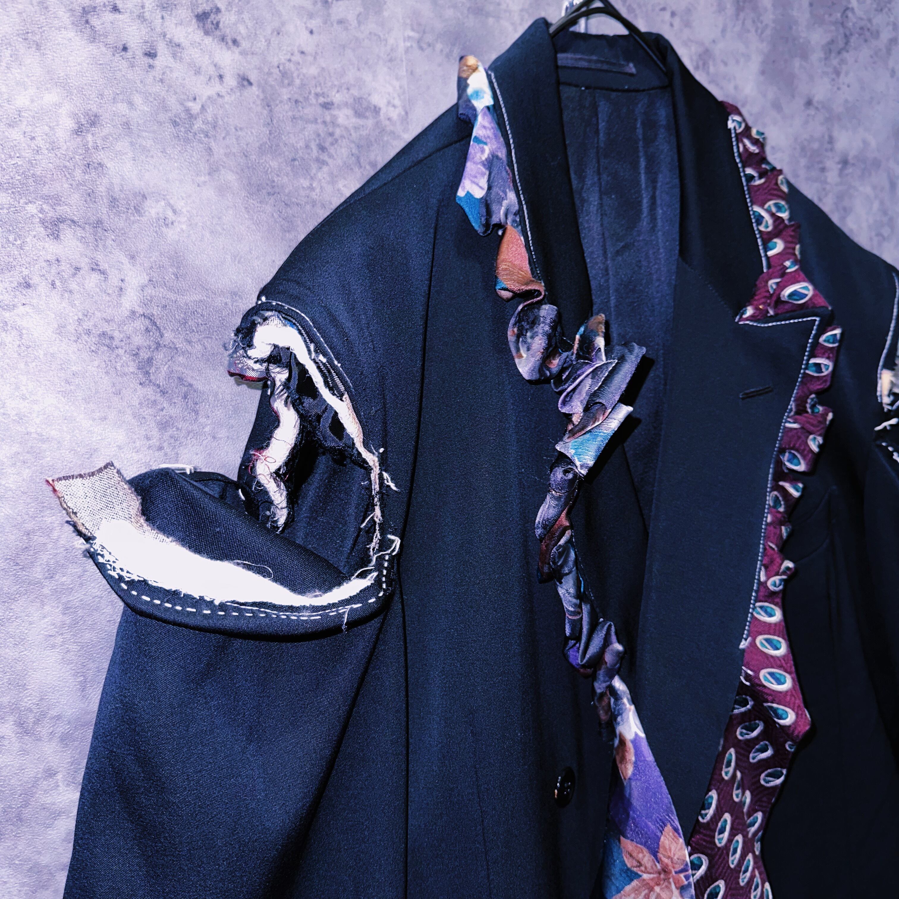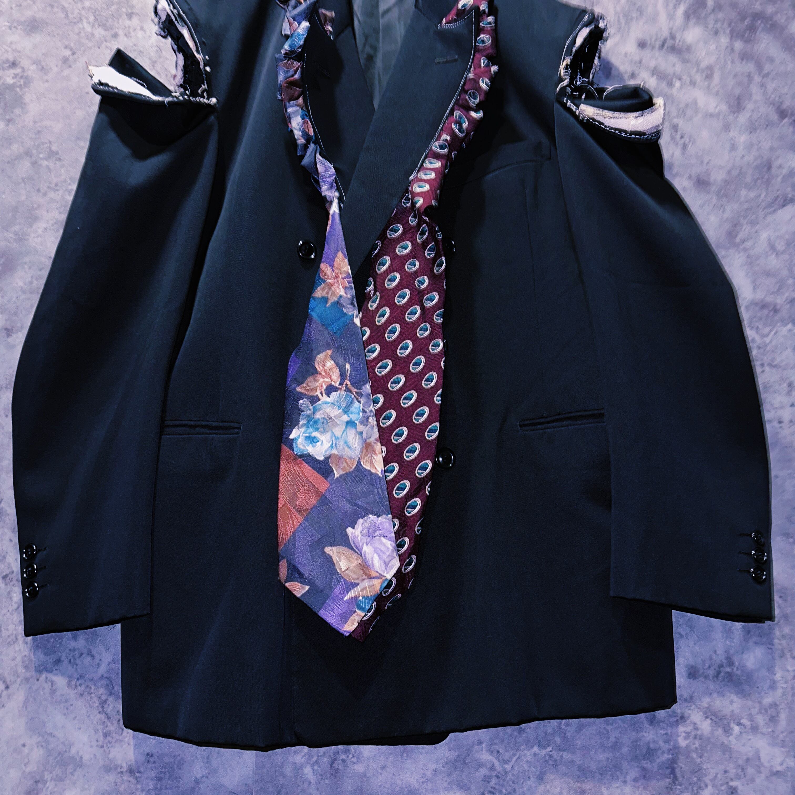 ネクタイをフリル状にラペルにドッキングされたテーラードジャケット。ショルダーをカットされており肌見せができるジェンダーレスな逸品。
